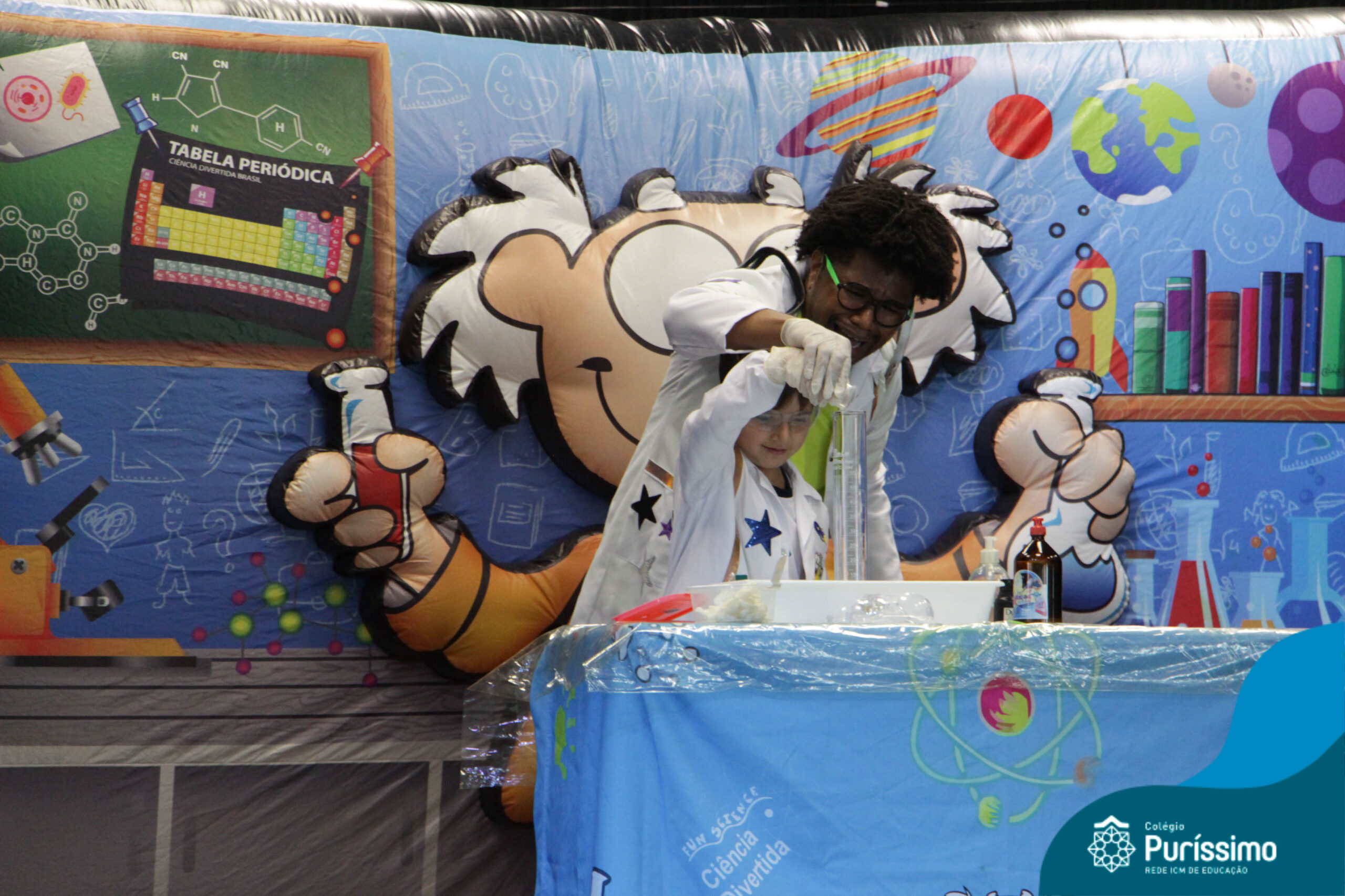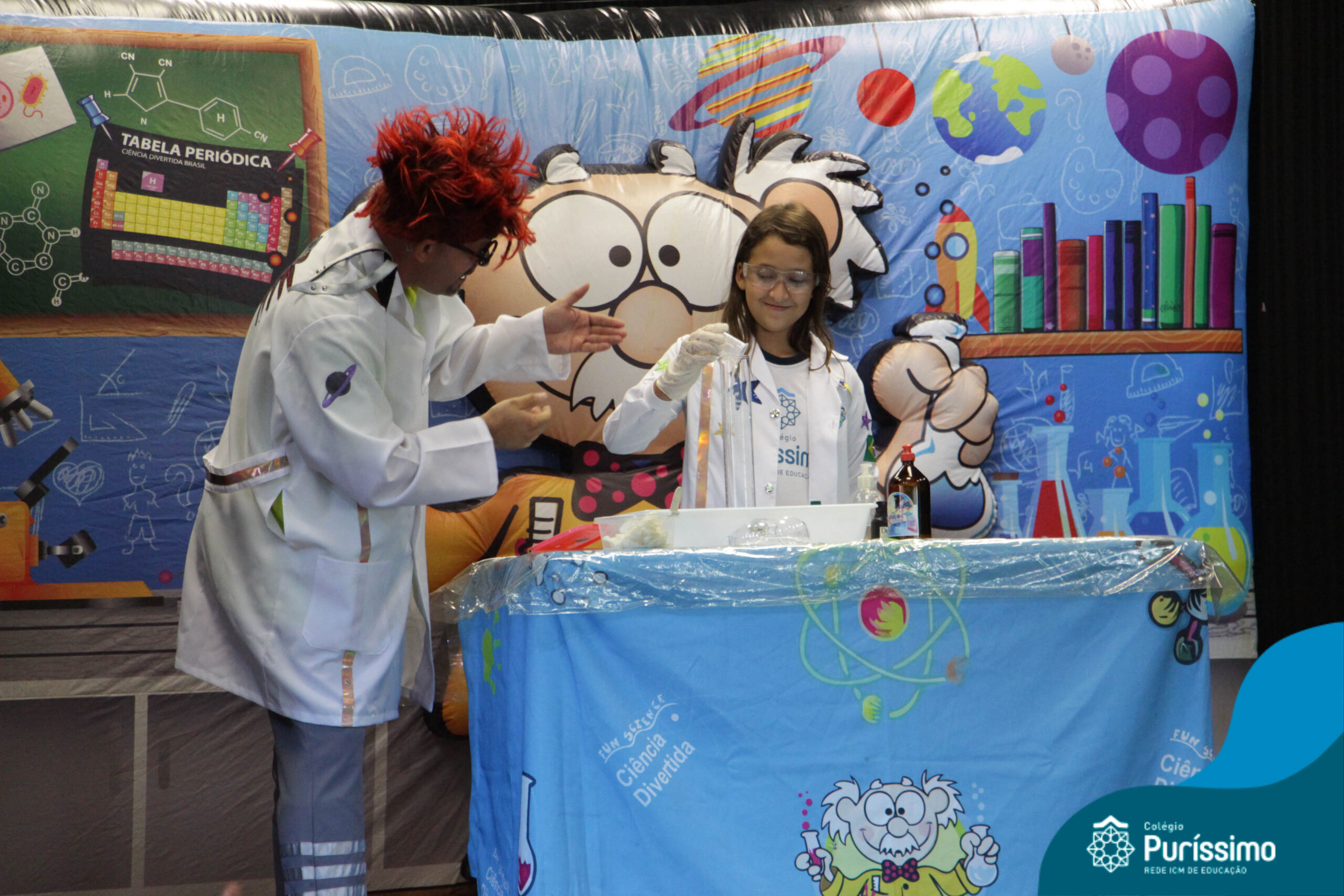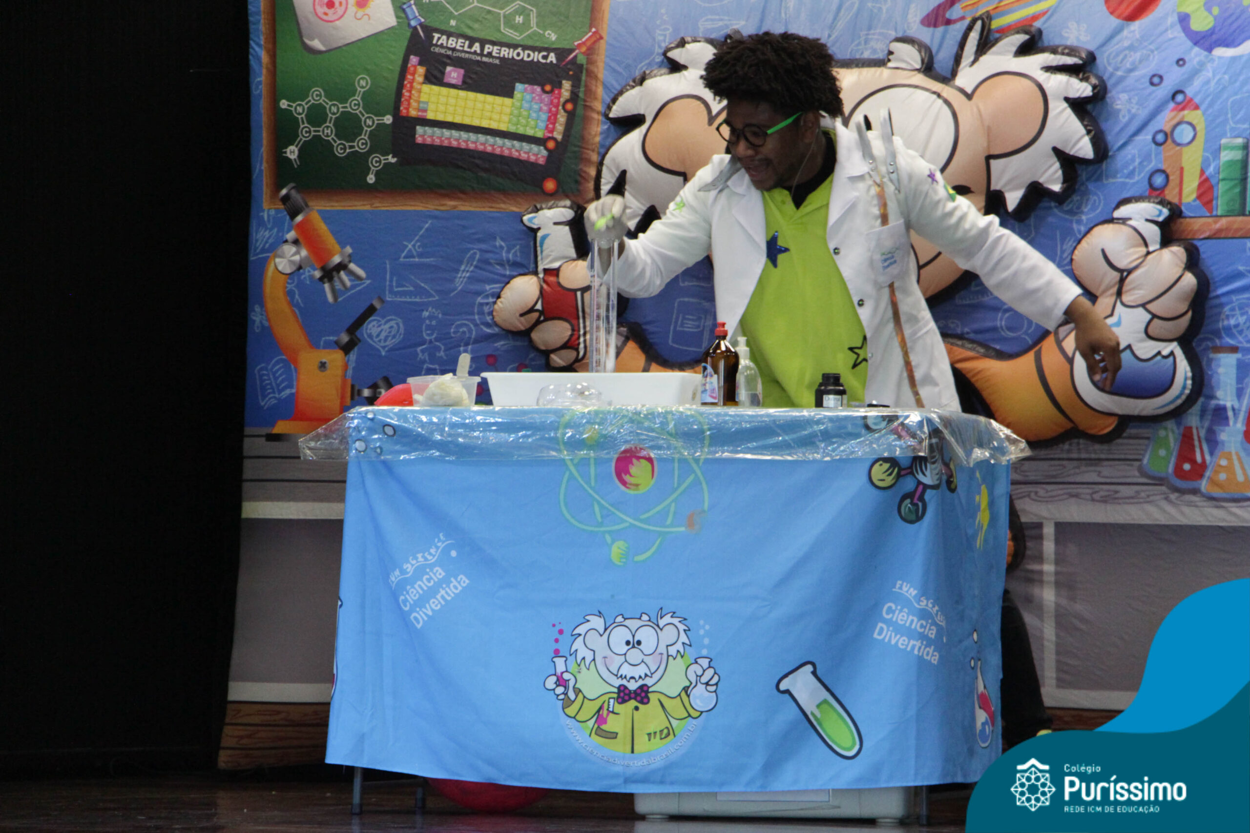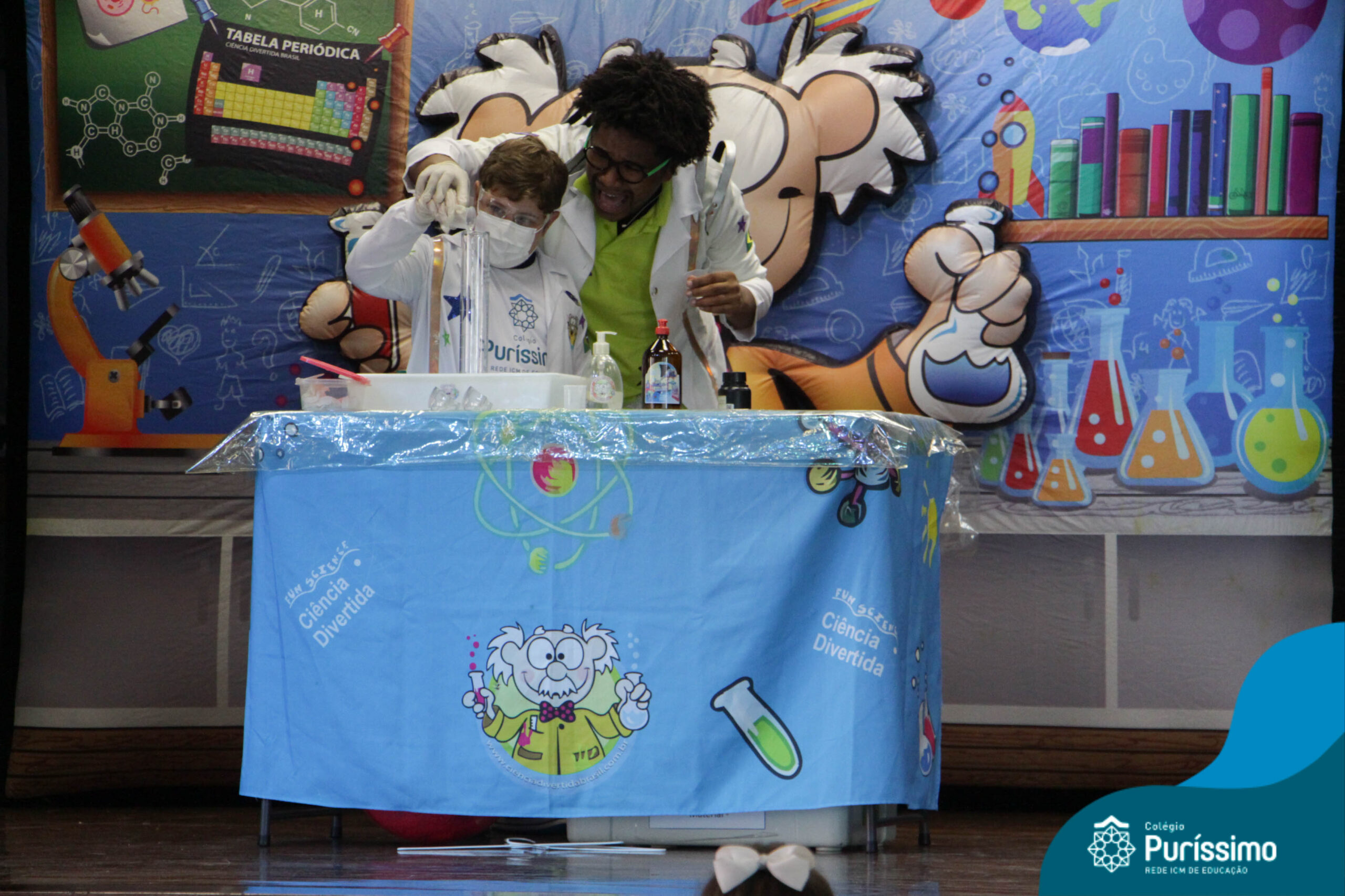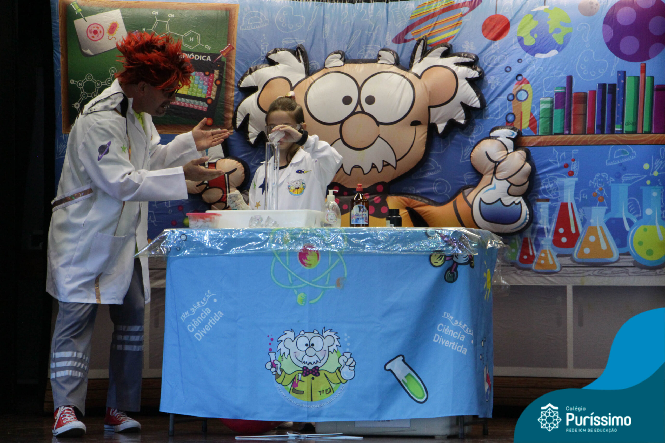 A performance possui caráter interativo e contou com a participação dos estudantes, que auxiliaram os atores nas experiências realizadas.