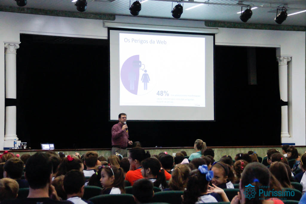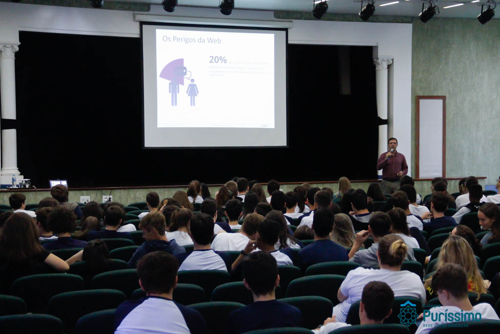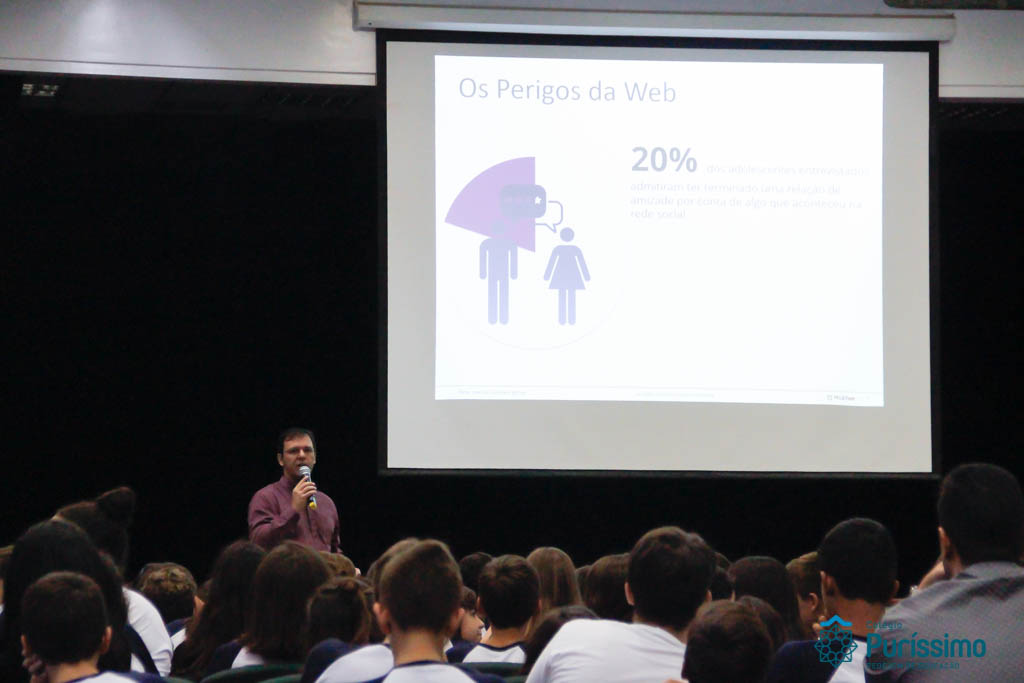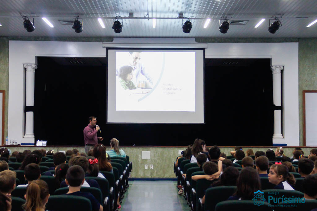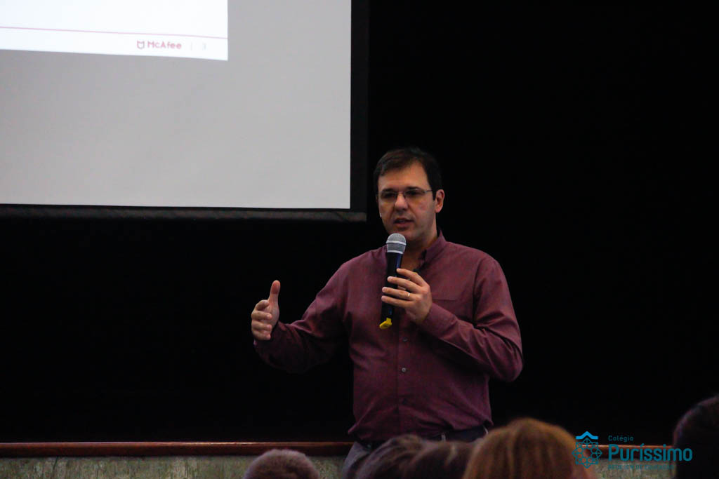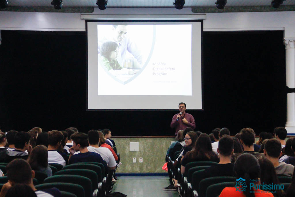 Os alunos do Jardim II ao 3º ano do Ensino Médio, assistiram ao longo do dia de hoje a palestra do Diretor de Suporte da McAfee, José Matias Neto. Com o mesmo tema da noite anterior, a conversa dessa vez foi voltada aos alunos e o que eles devem fazer para se prevenir na internet, quais os cuidados, ameaças, proteção, bullying e cibercrime.