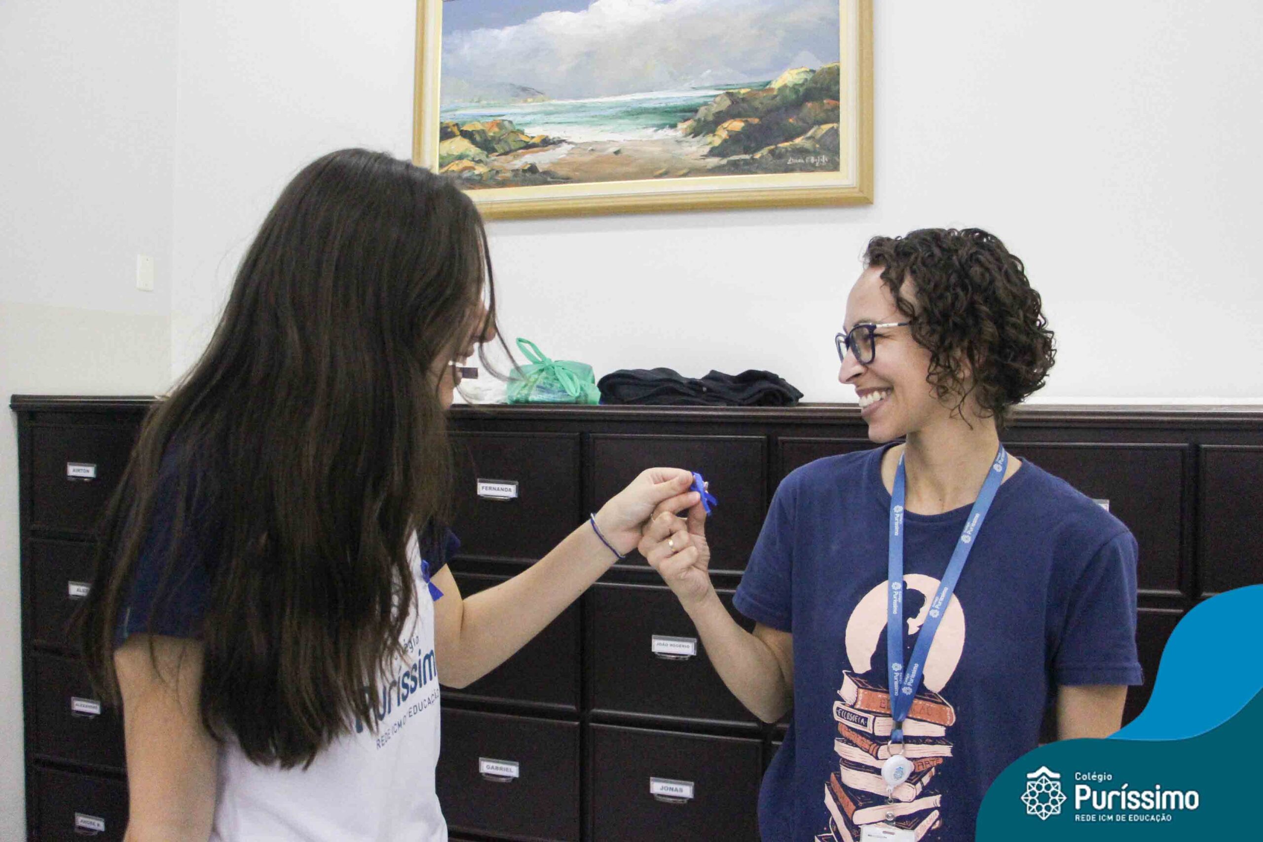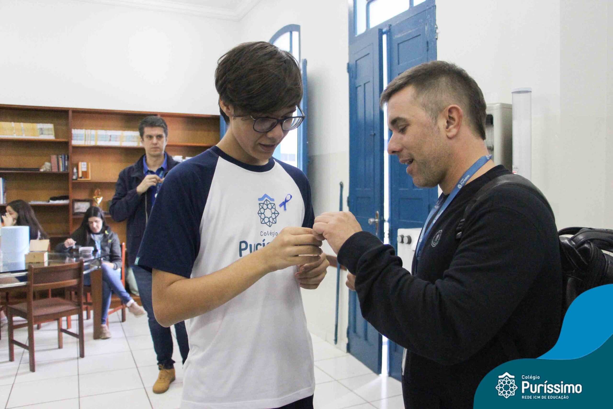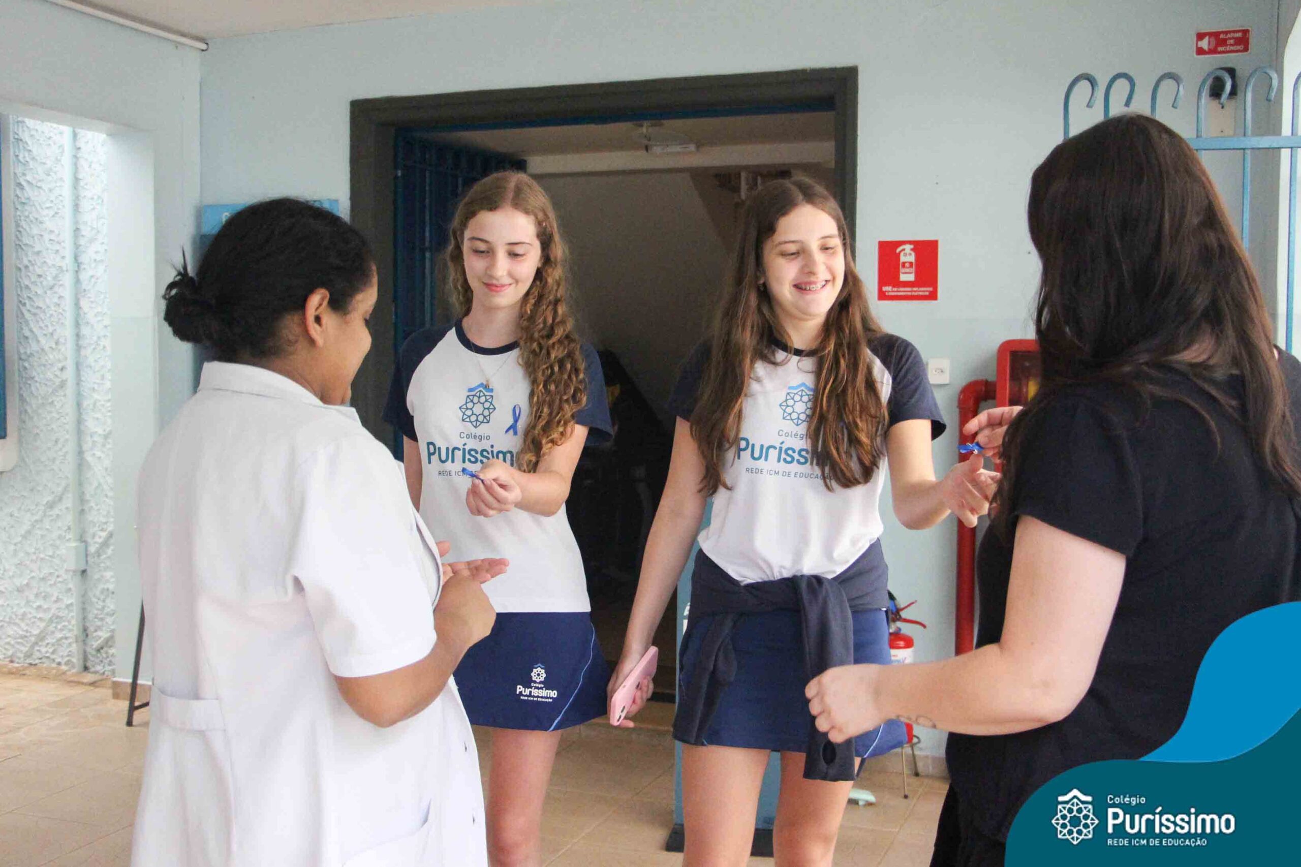 Para iniciar esse mês de novembro, os alunos da Pastoral Escolar entregaram uma fita azul para todos os professores e funcionários do Puri buscando conscientizá-los sobre a importância do diagnóstico prévio e da prevenção do Câncer de Próstata.