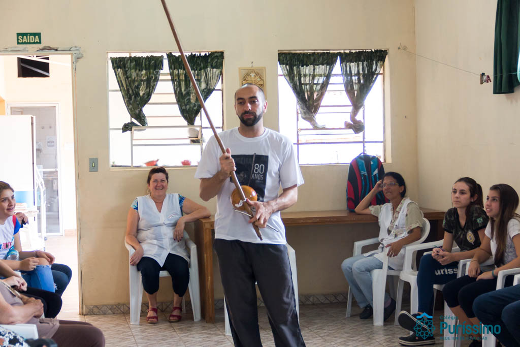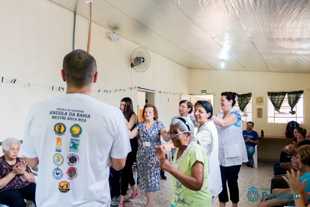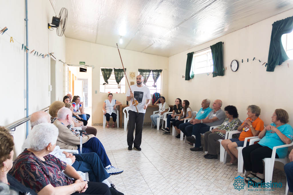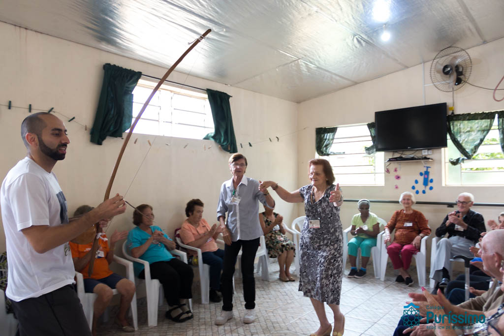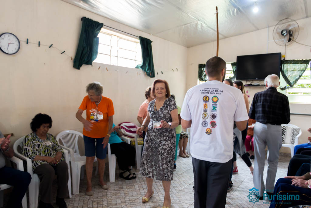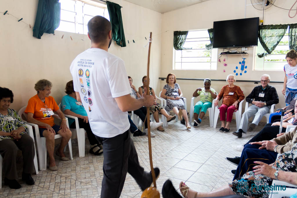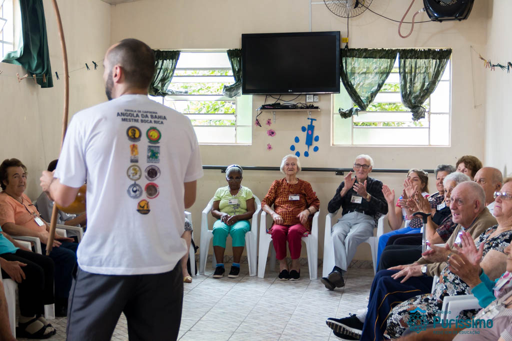 Inicialmente, os idosos ouviram um pouco da história da capoeira e da sua importância. Na sequência, tivemos uma atividade, onde os idosos participaram com palmas, danças e música, aliás a música sempre remonta à memória afetiva desses nossos queridos e simpáticos membros do CCI.