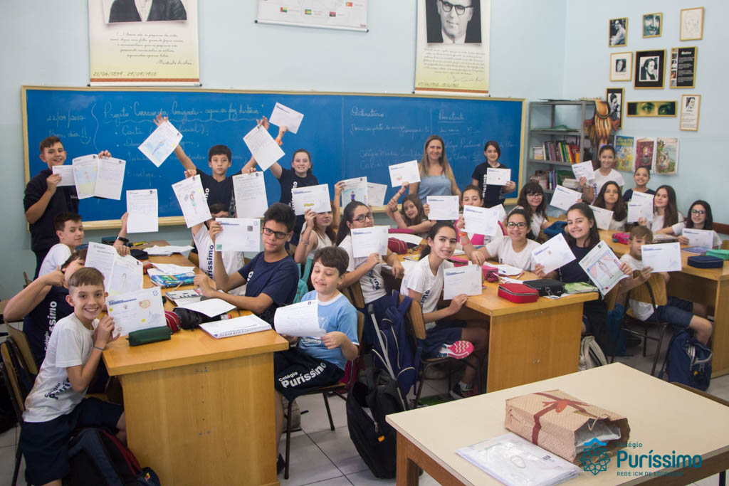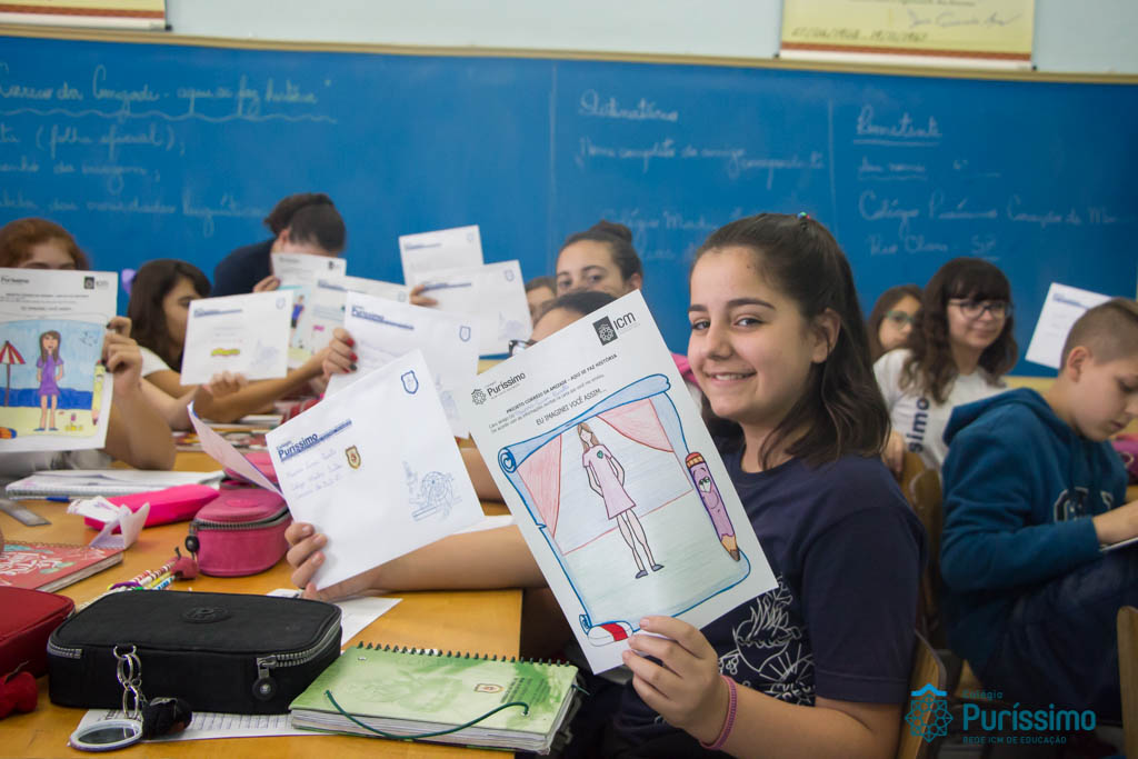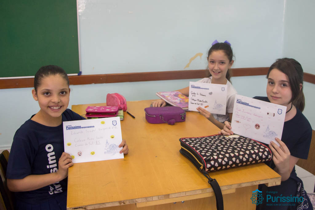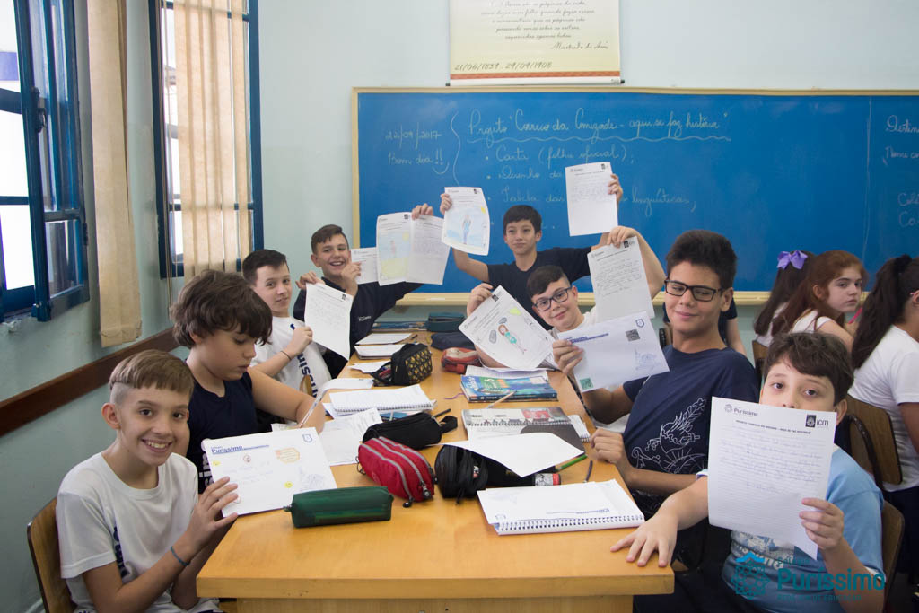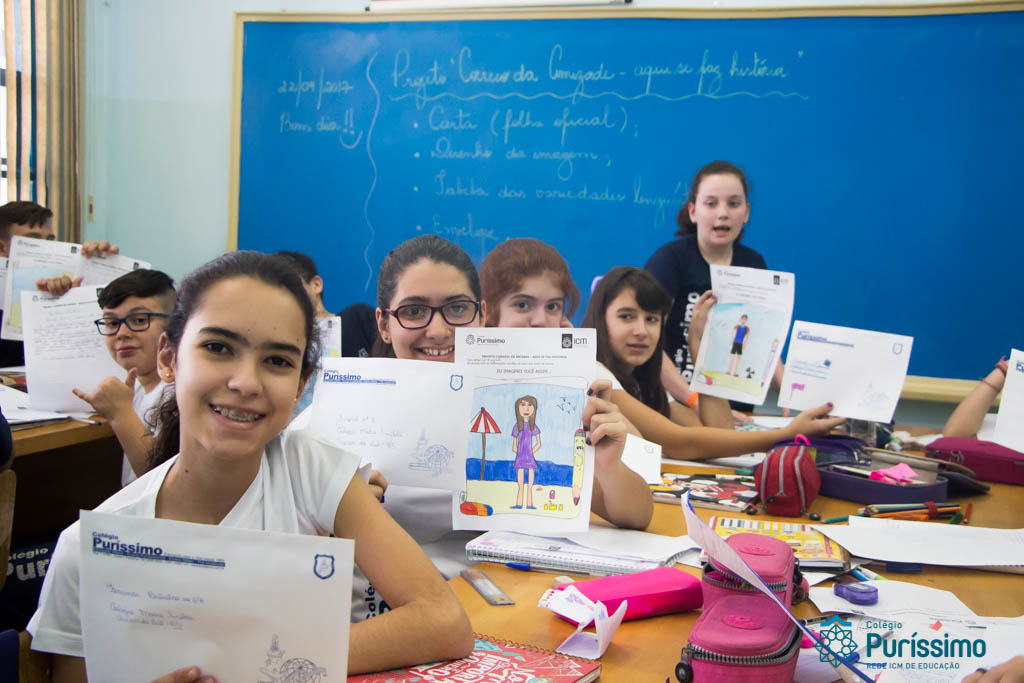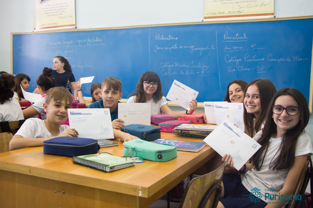 Na segunda fase do projeto de intercâmbio cultural, realizado nas aulas de Português, os alunos dos 6º anos enviaram a segunda carta ao Colégio Madre Imilda, em Caxias do Sul – RS. Além da carta, os alunos mandaram o desenho da imagem do amigo correspondente que fizeram de acordo com as características recebidas na primeira carta, e uma tabela com a variedade linguística da região sudeste.