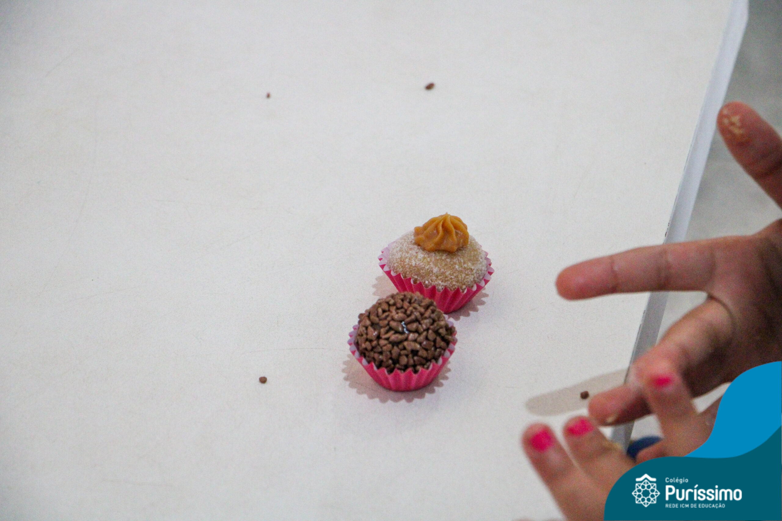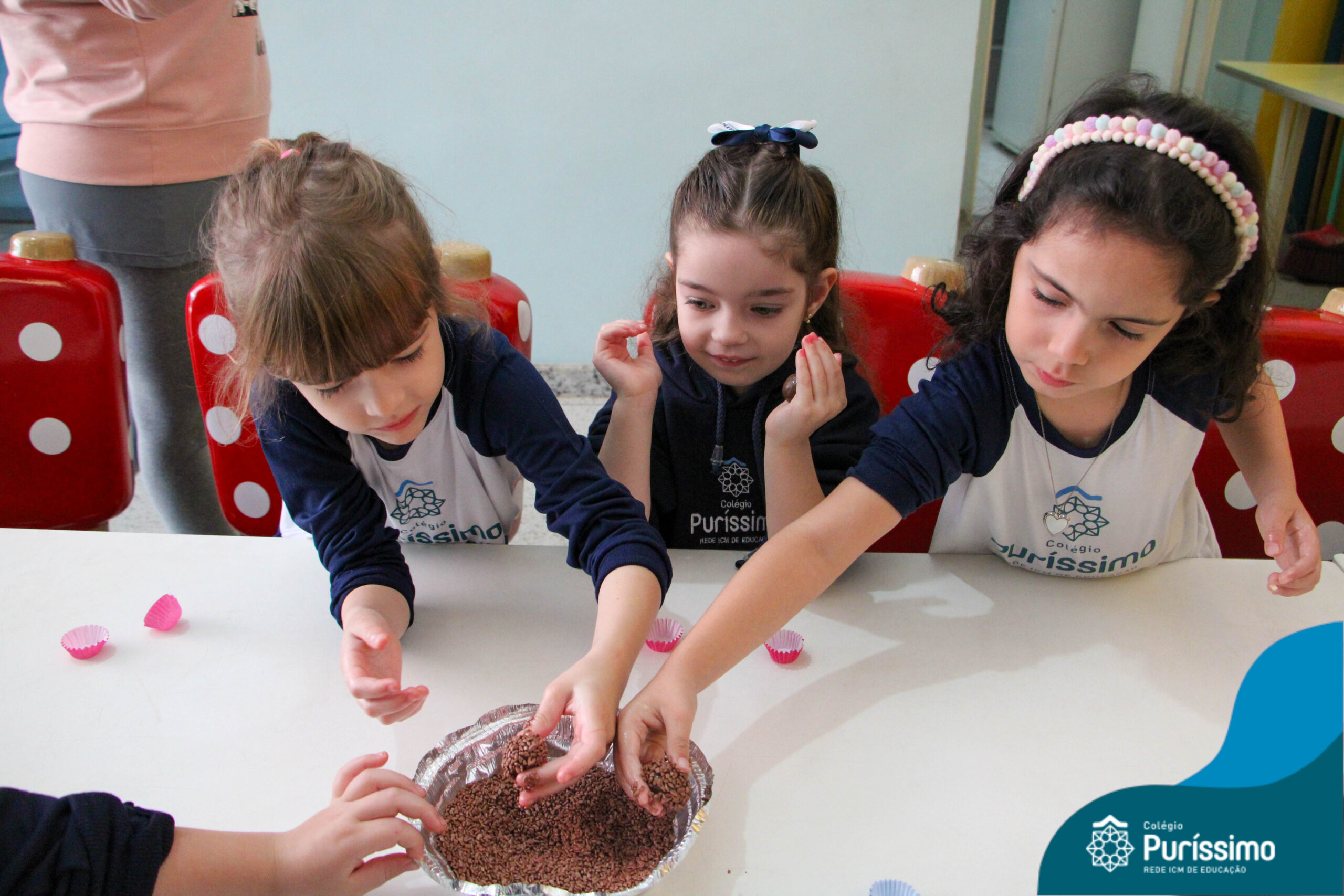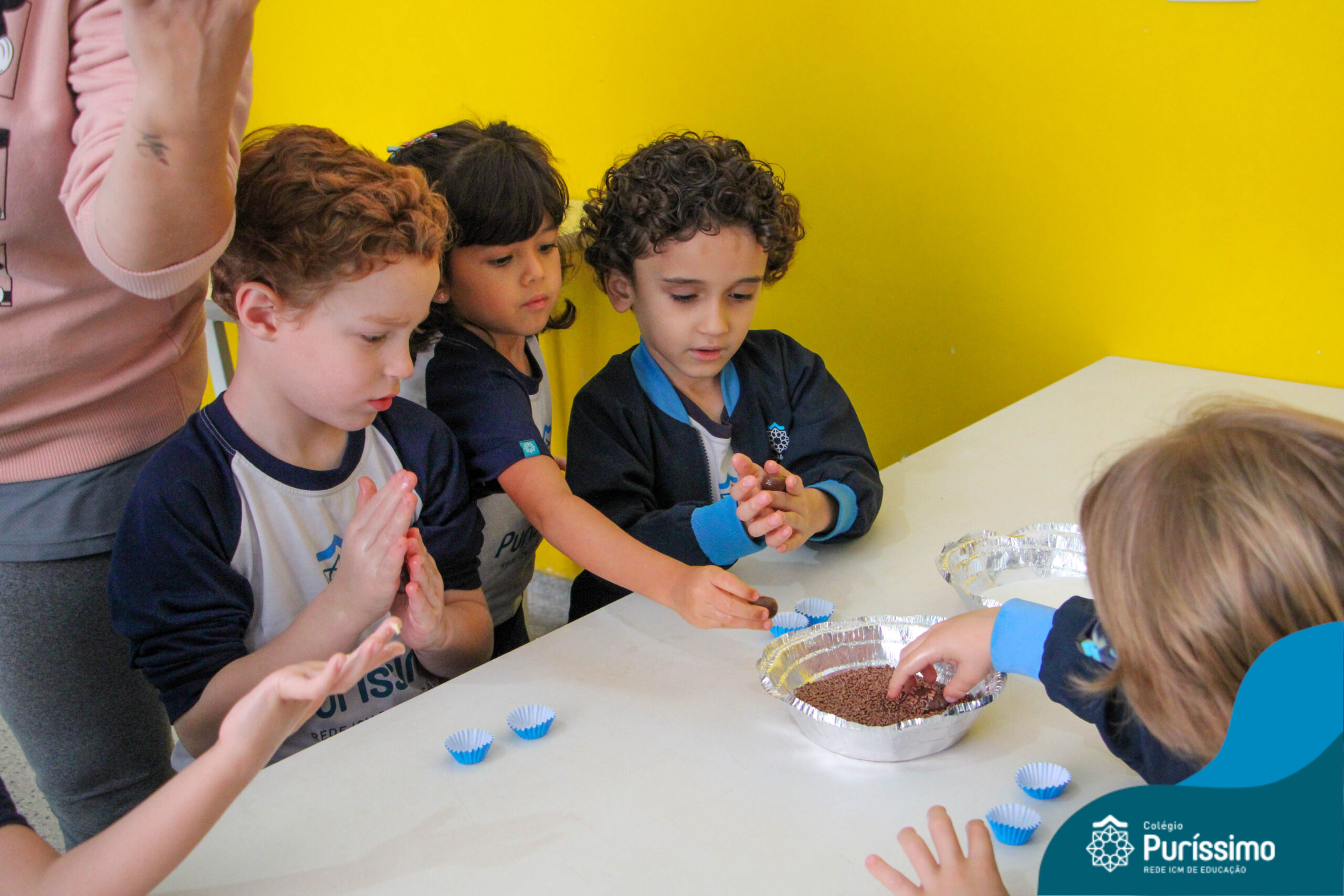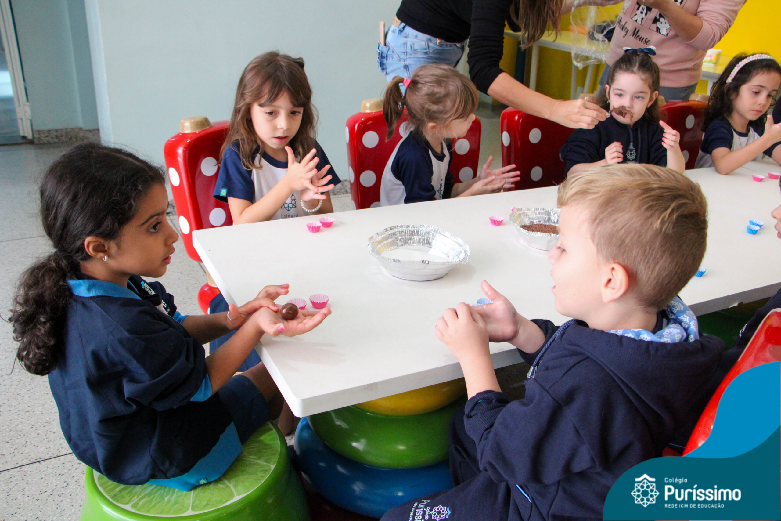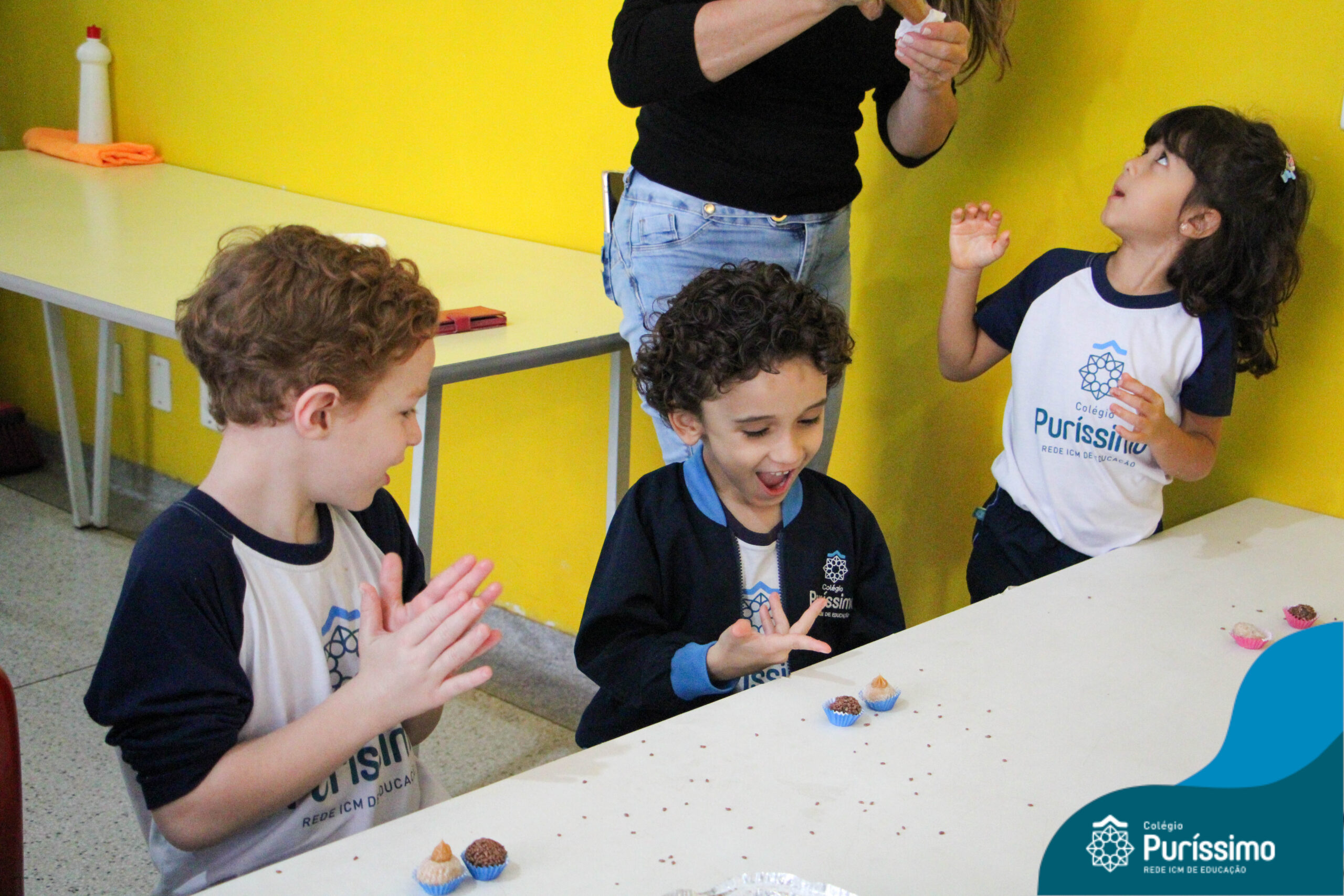 Nessas últimas atividades, os estudantes se divertiram com uma brincadeira utilizando seus próprios sapatos, enrolaram brigadeiros e fizeram uma massinha caseira de amido de milho.