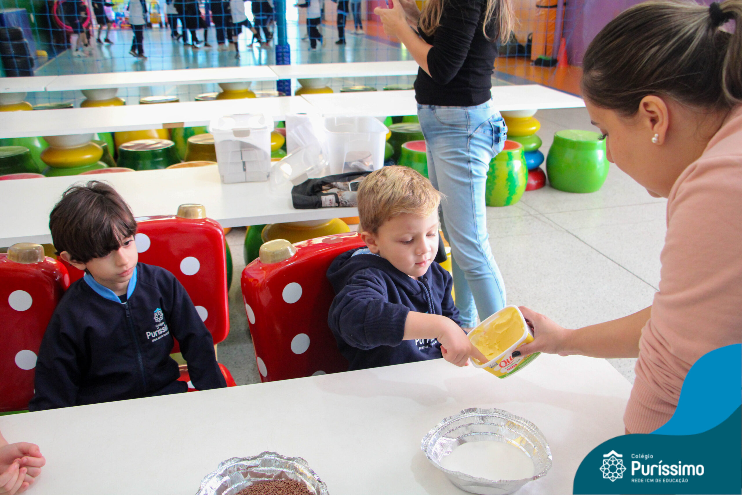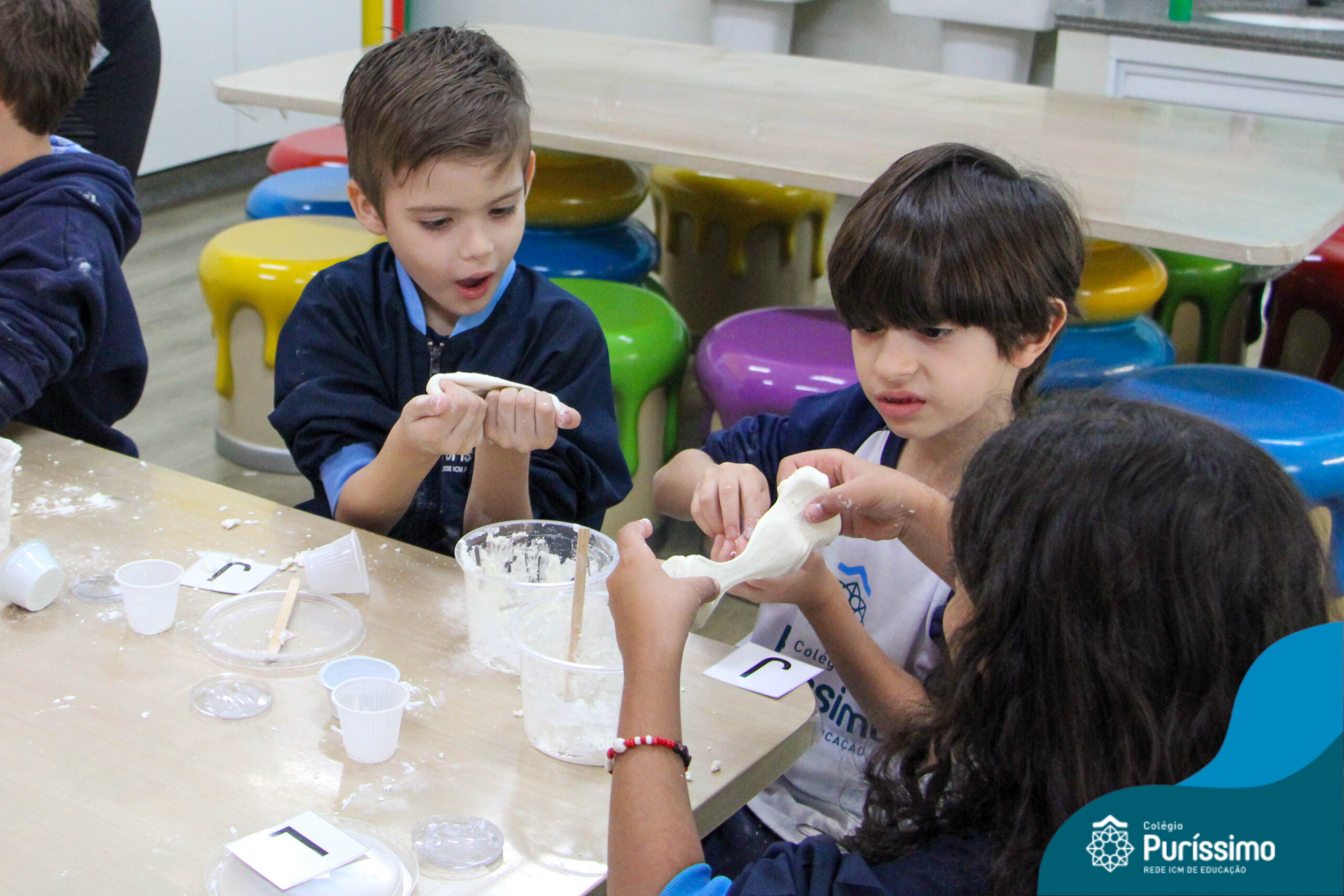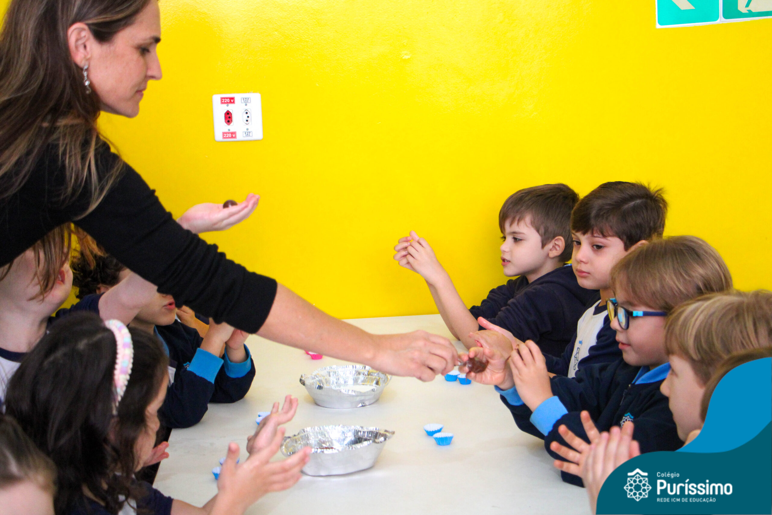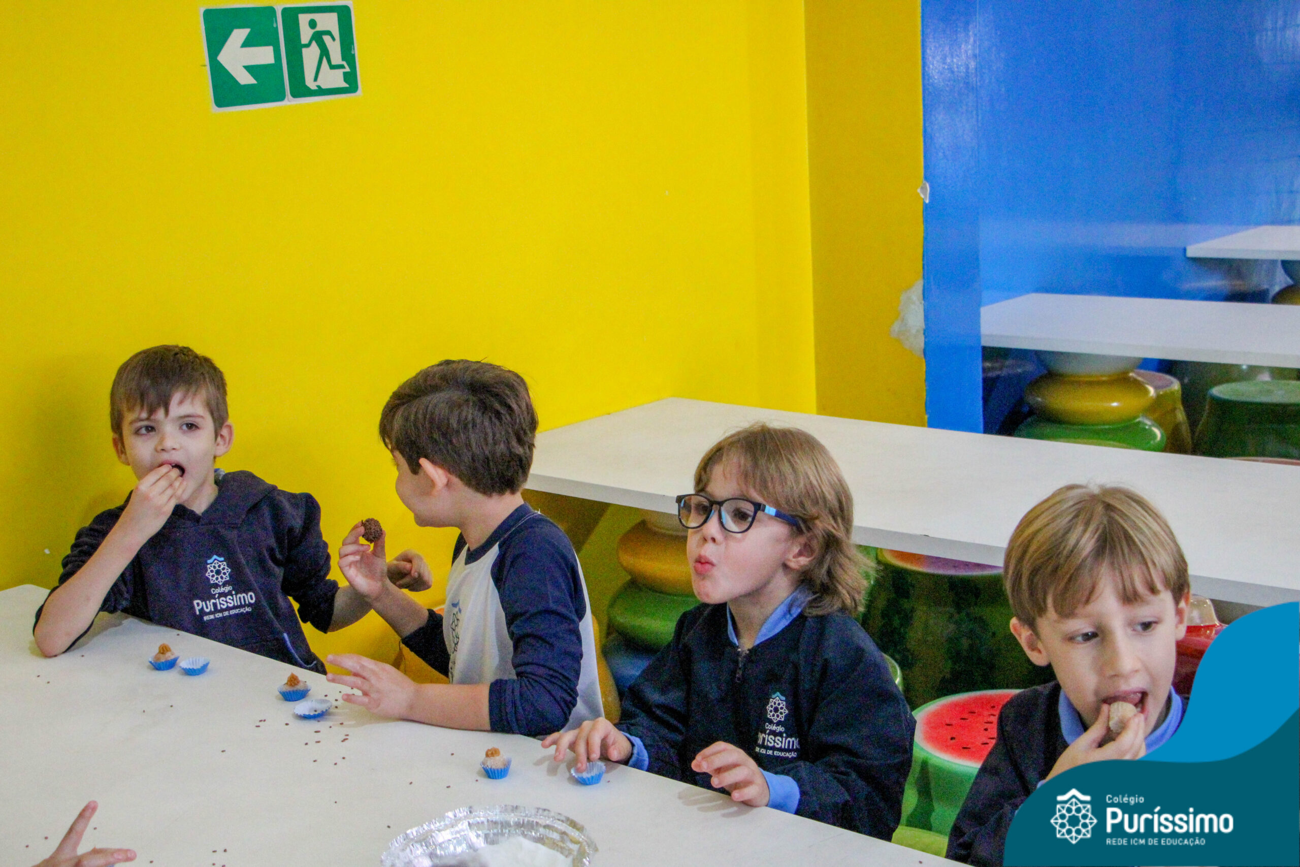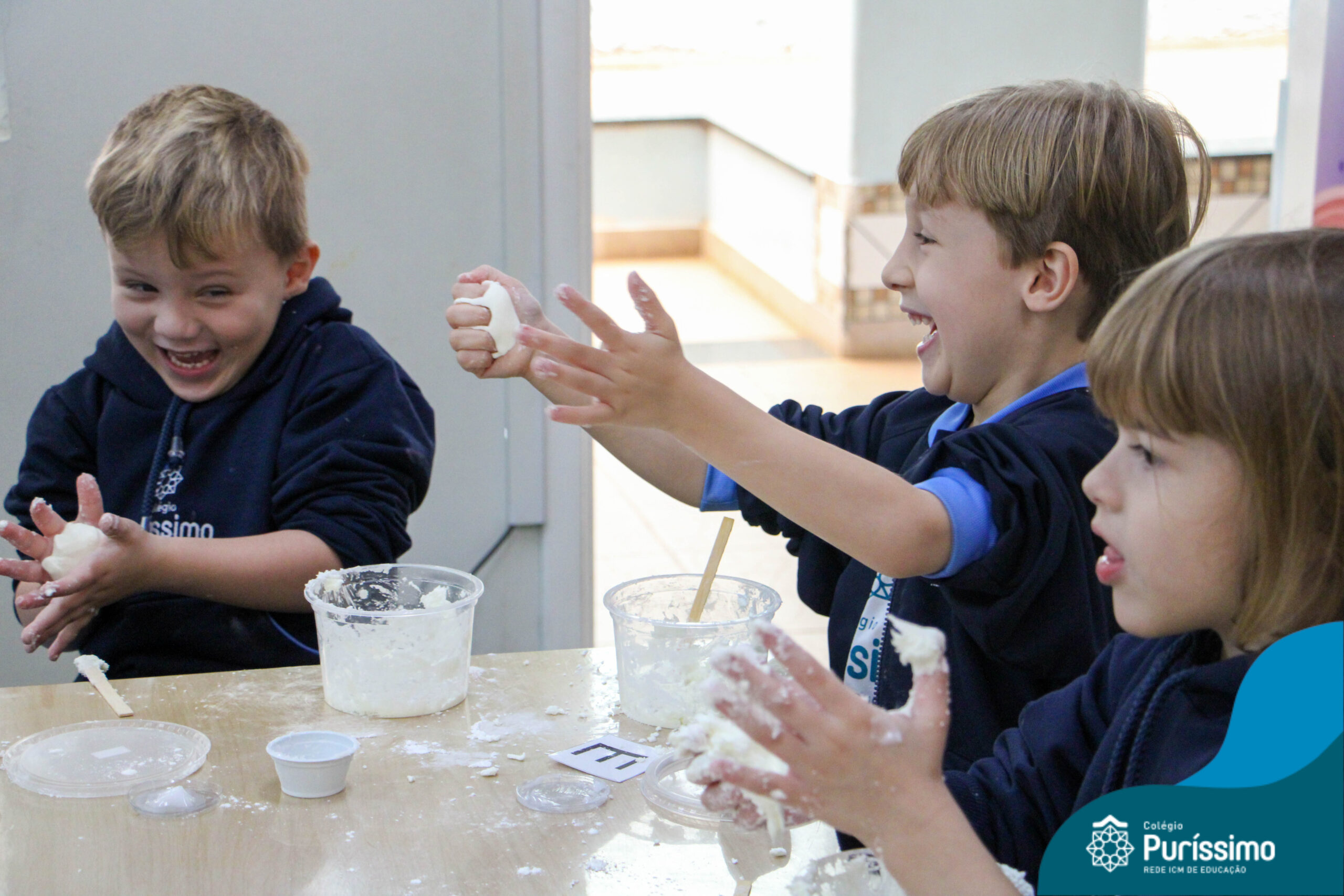 Nessas últimas atividades, os estudantes se divertiram com uma brincadeira utilizando seus próprios sapatos, enrolaram brigadeiros e fizeram uma massinha caseira de amido de milho.