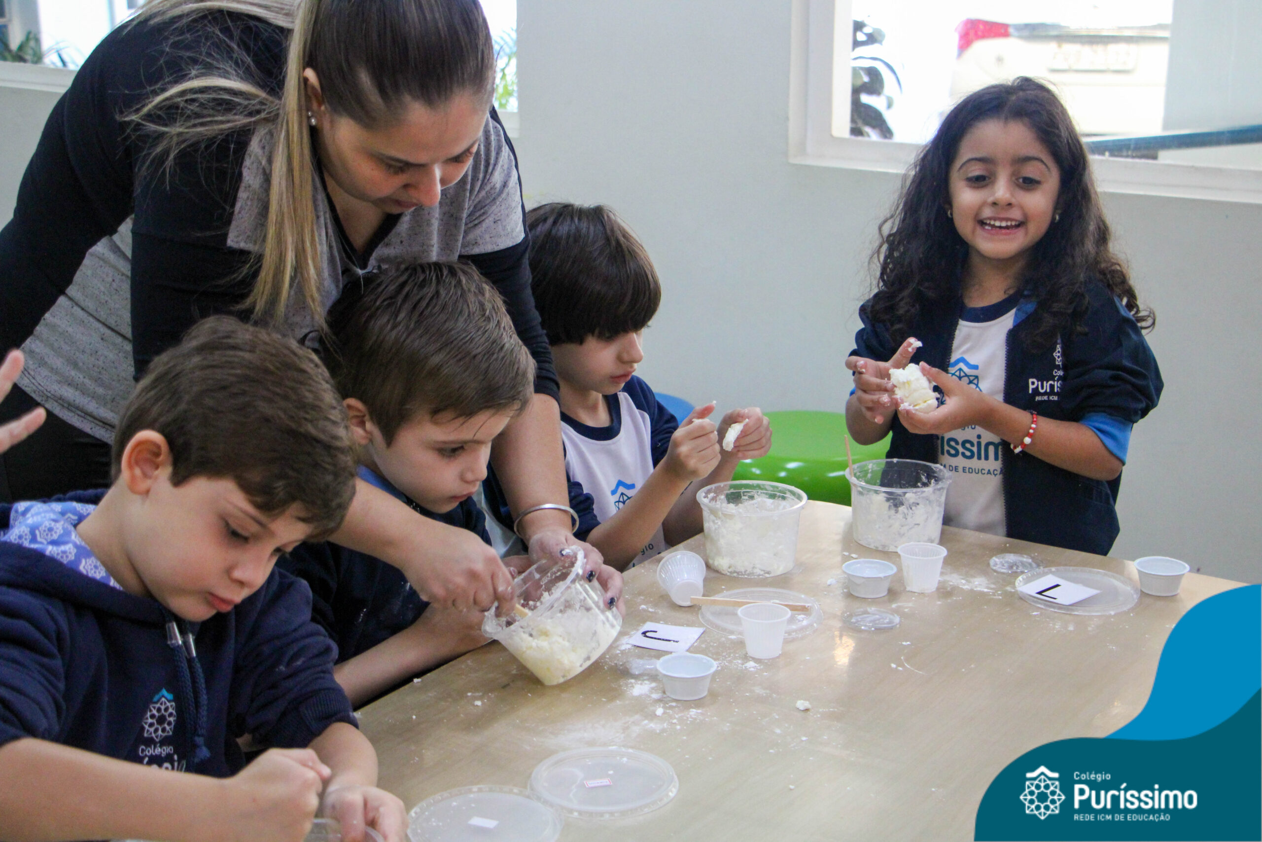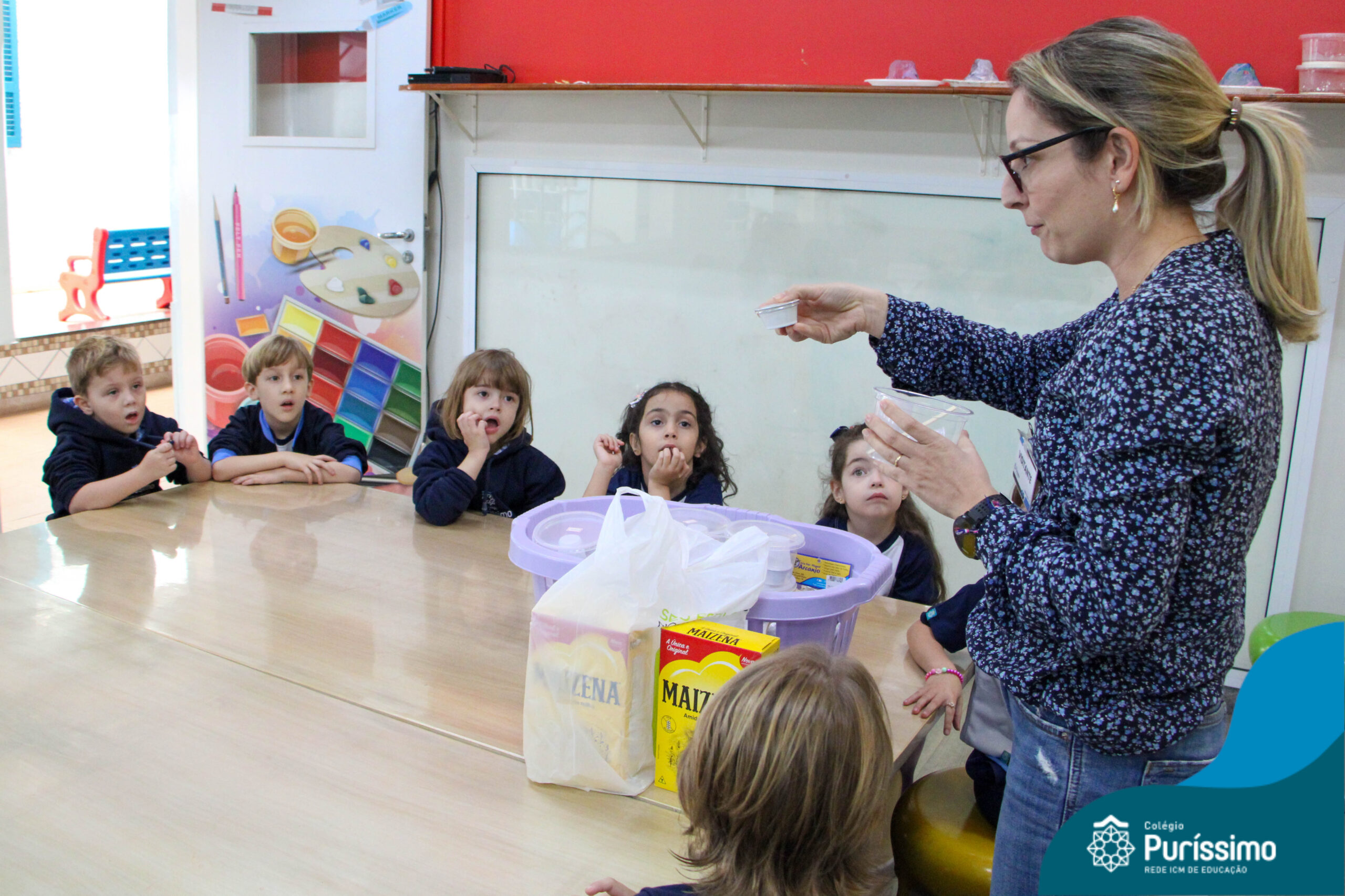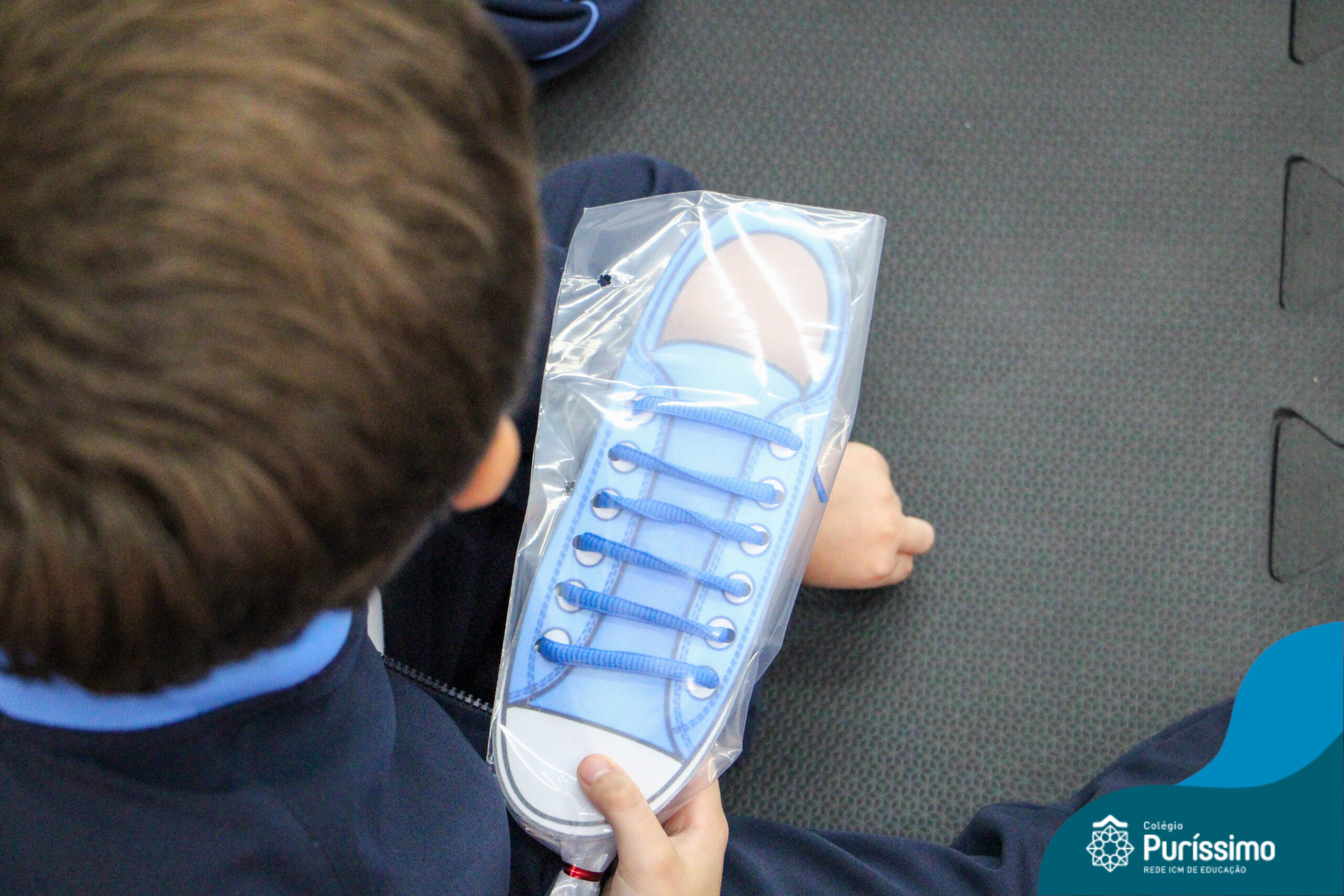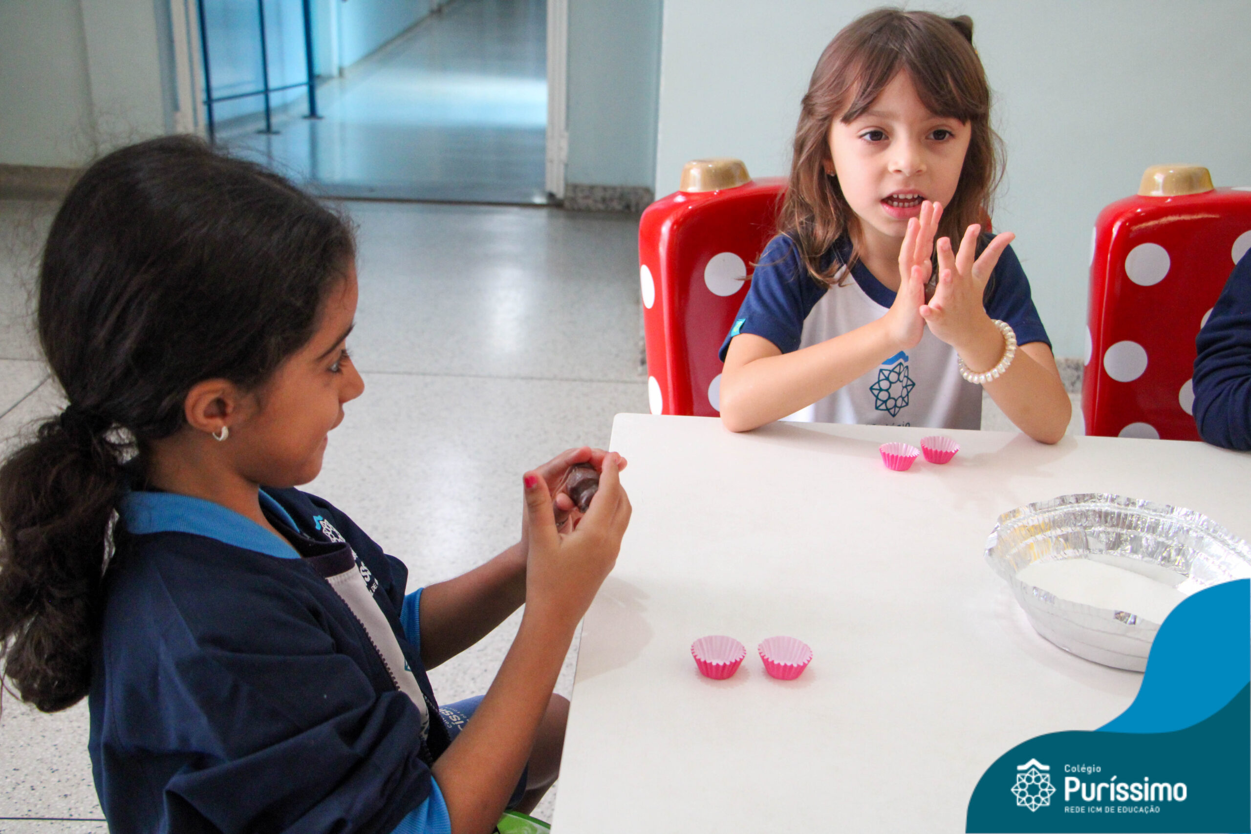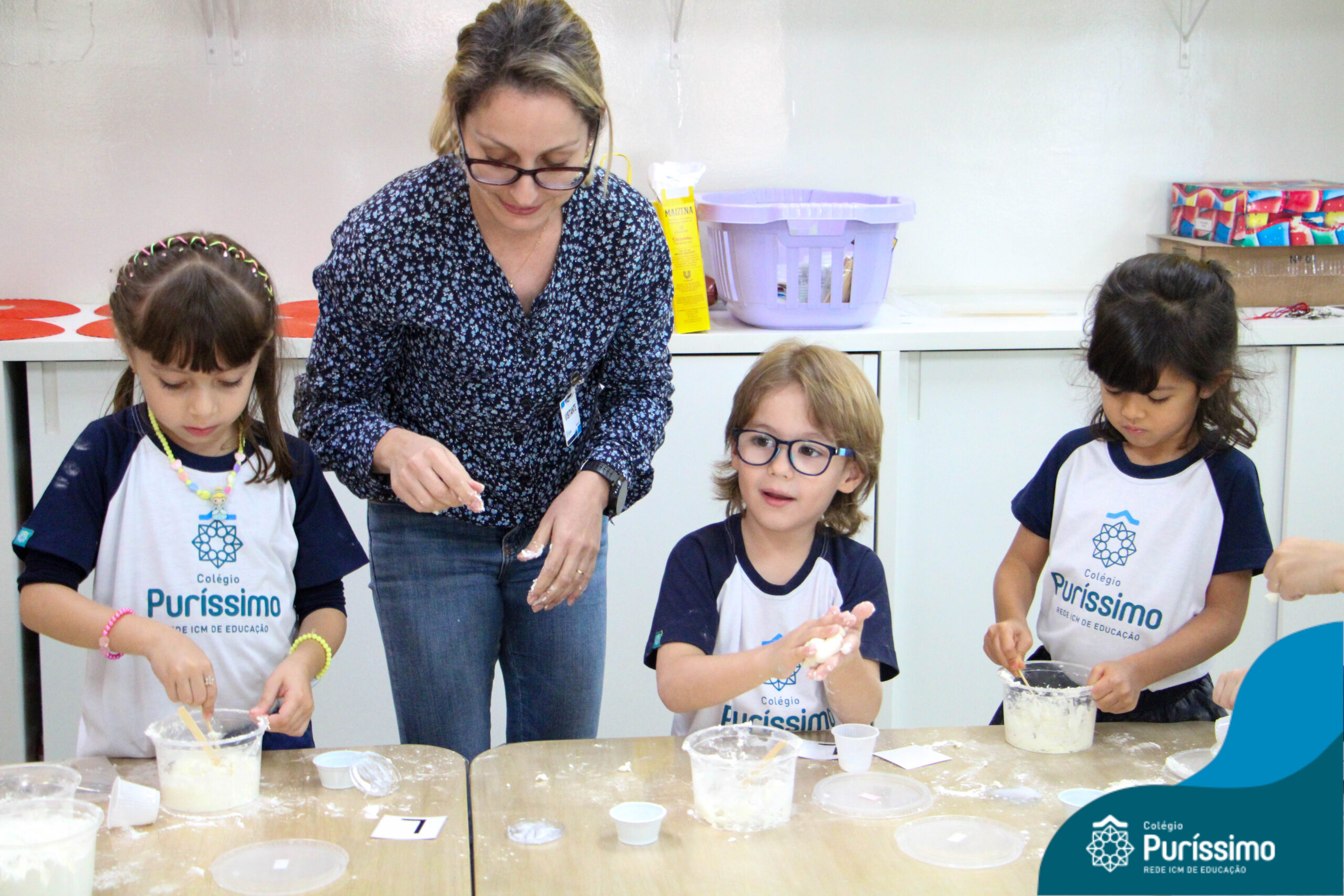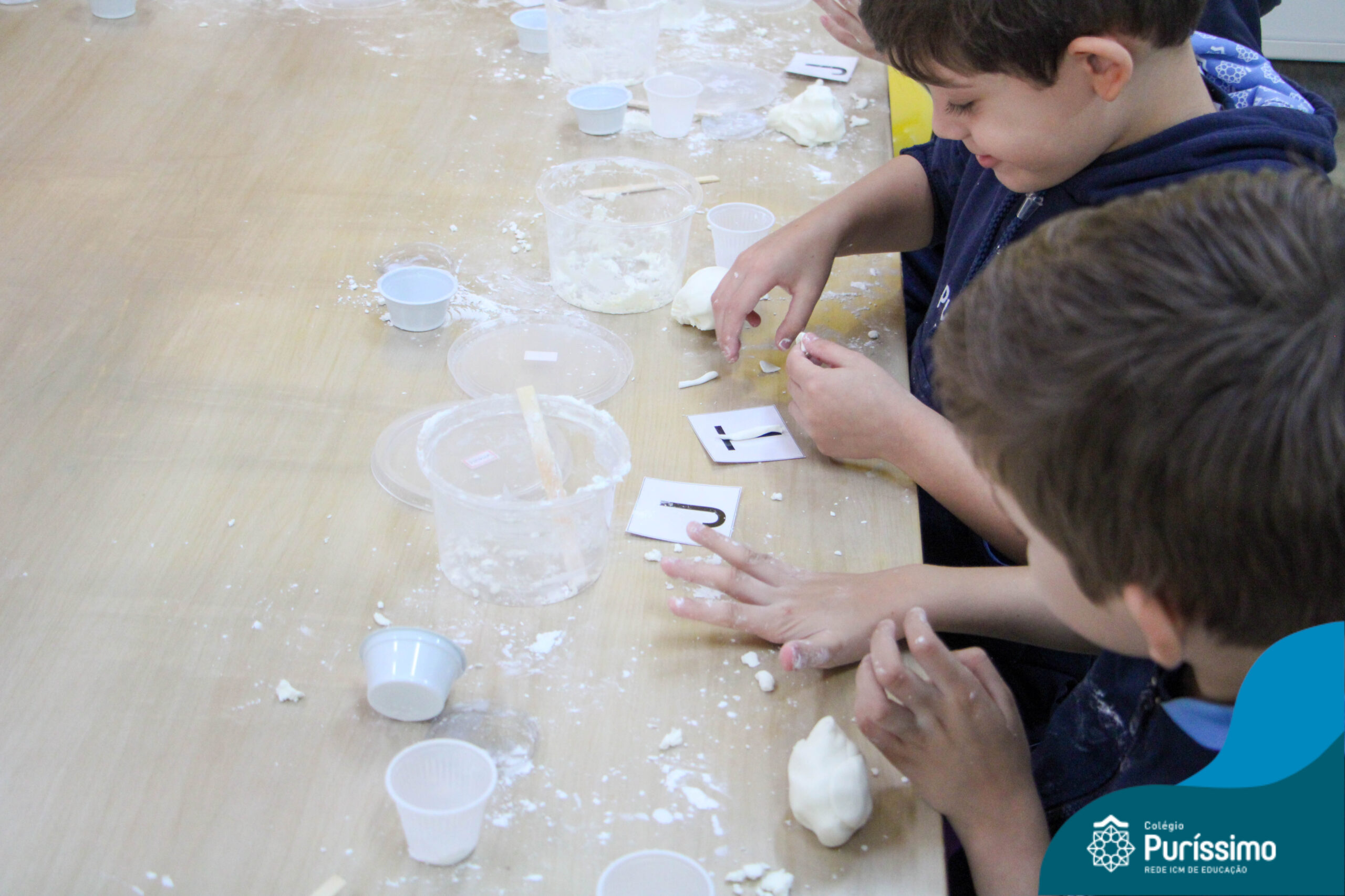 Nessas últimas atividades, os estudantes se divertiram com uma brincadeira utilizando seus próprios sapatos, enrolaram brigadeiros e fizeram uma massinha caseira de amido de milho.