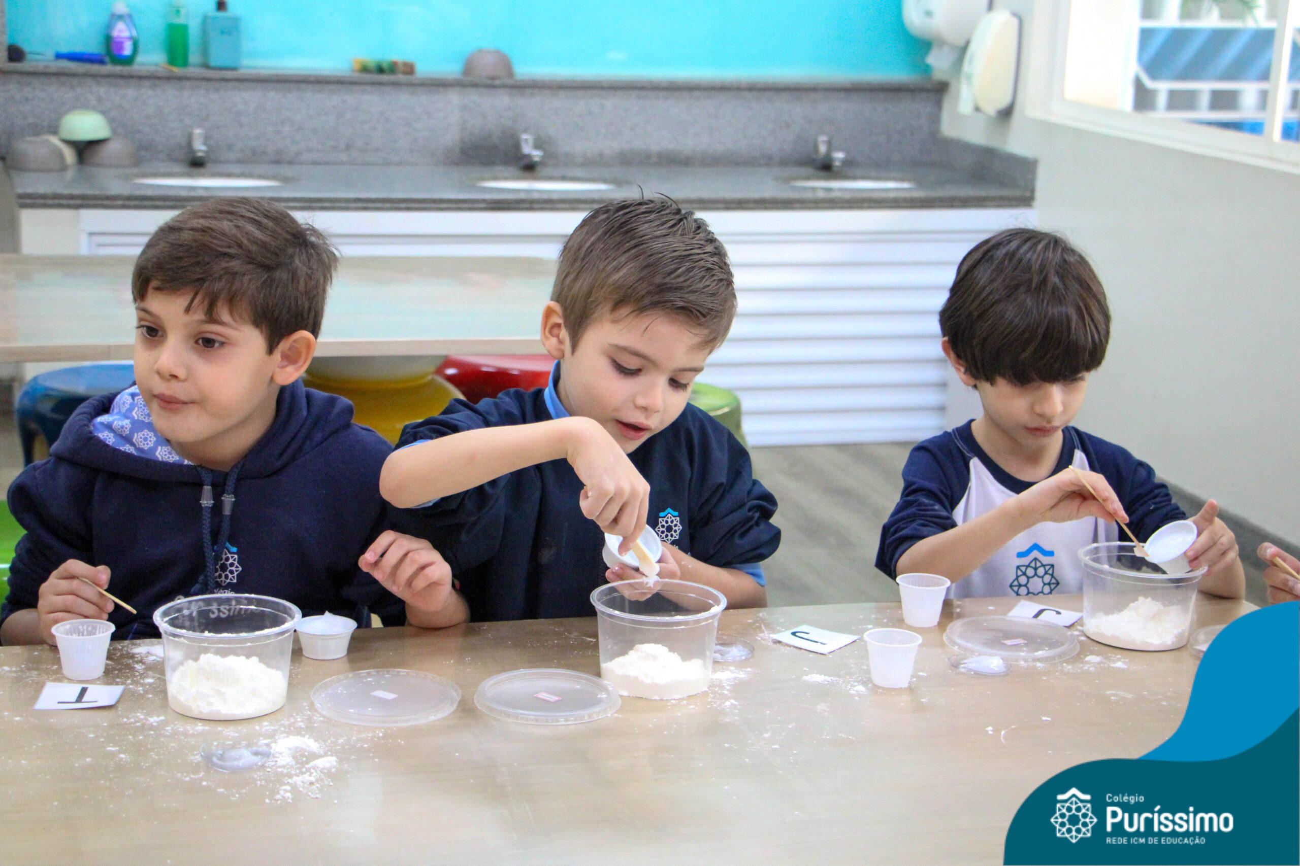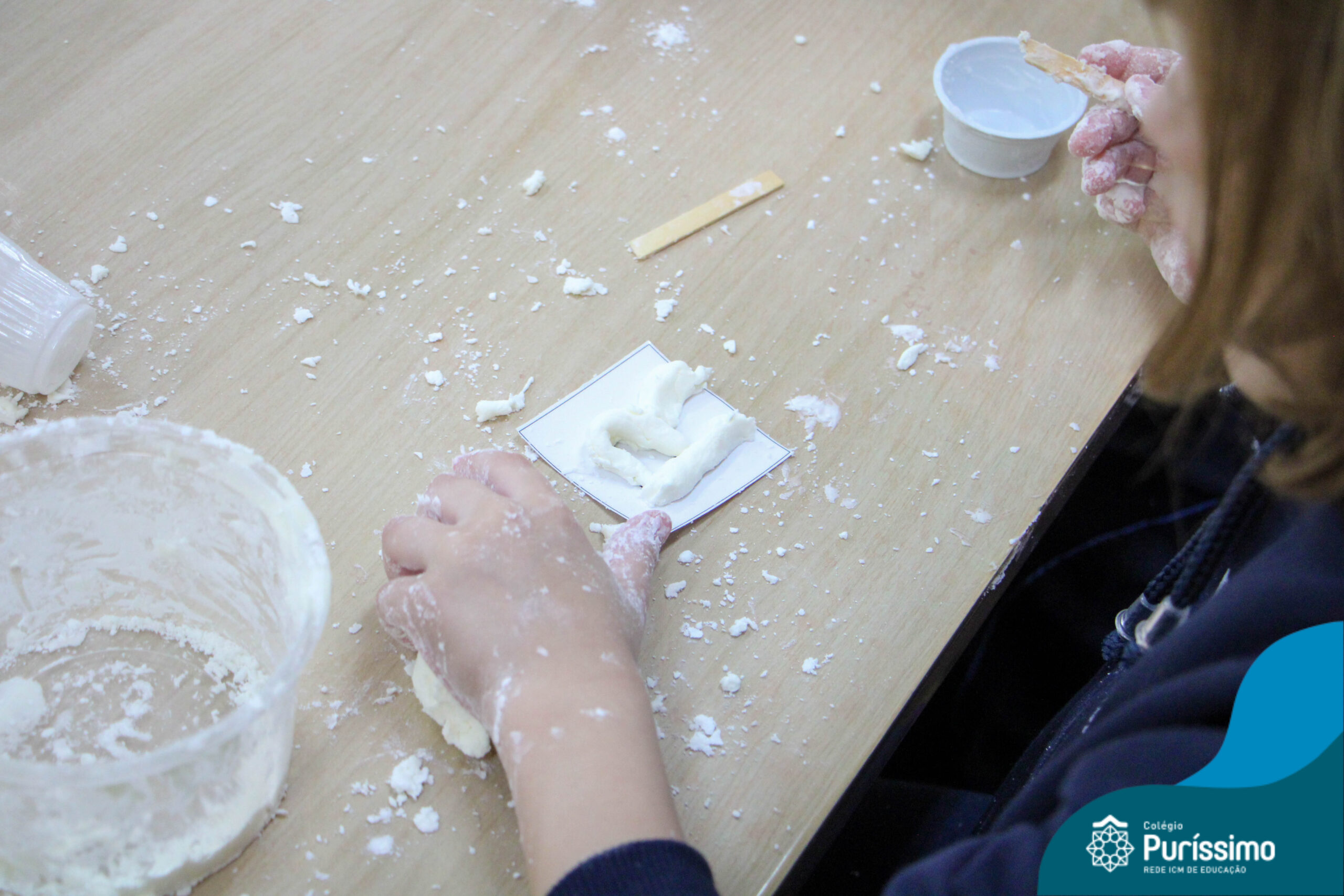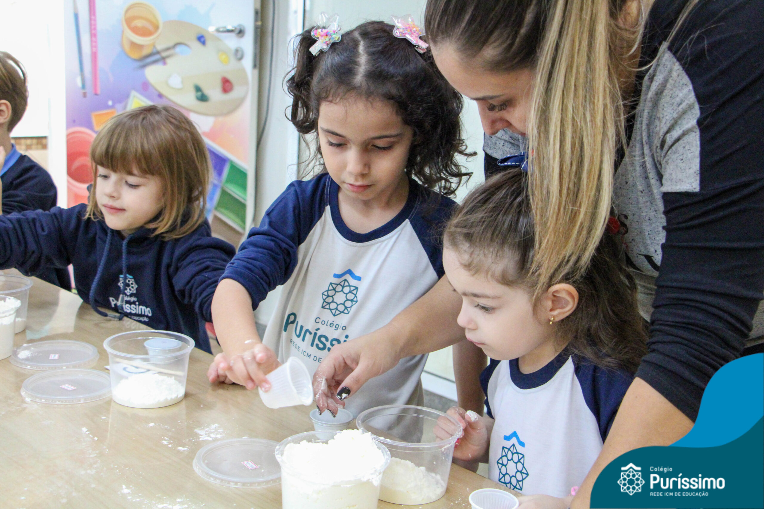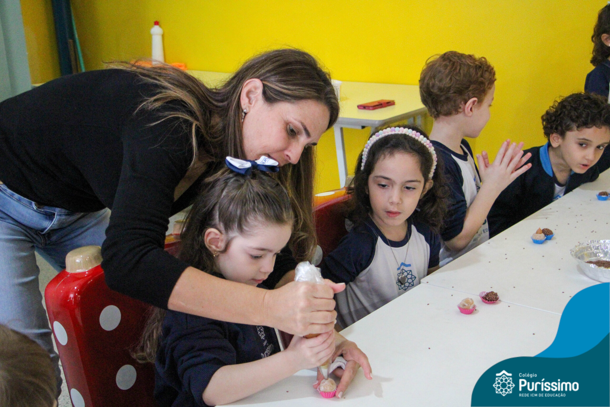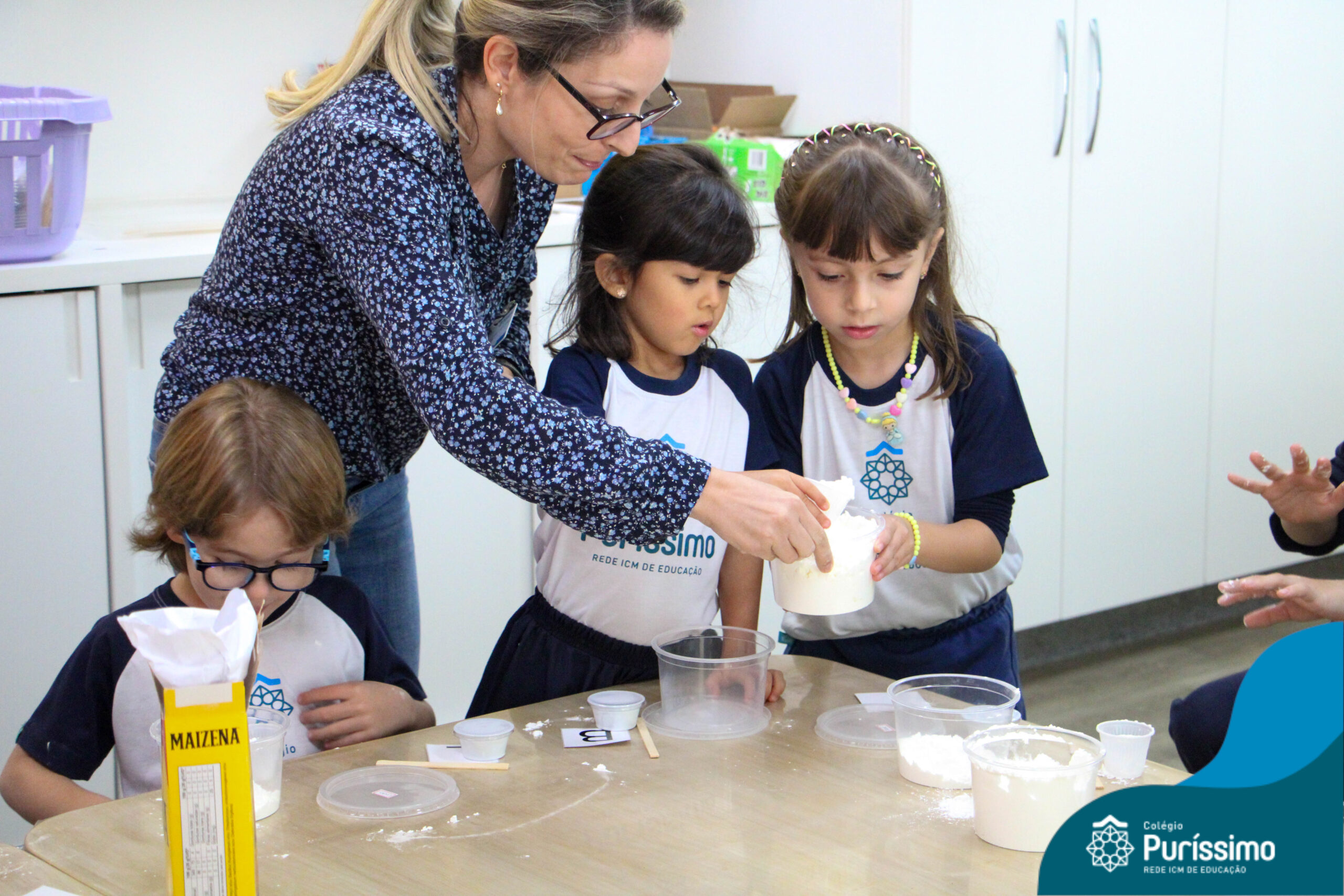 Nessas últimas atividades, os estudantes se divertiram com uma brincadeira utilizando seus próprios sapatos, enrolaram brigadeiros e fizeram uma massinha caseira de amido de milho.