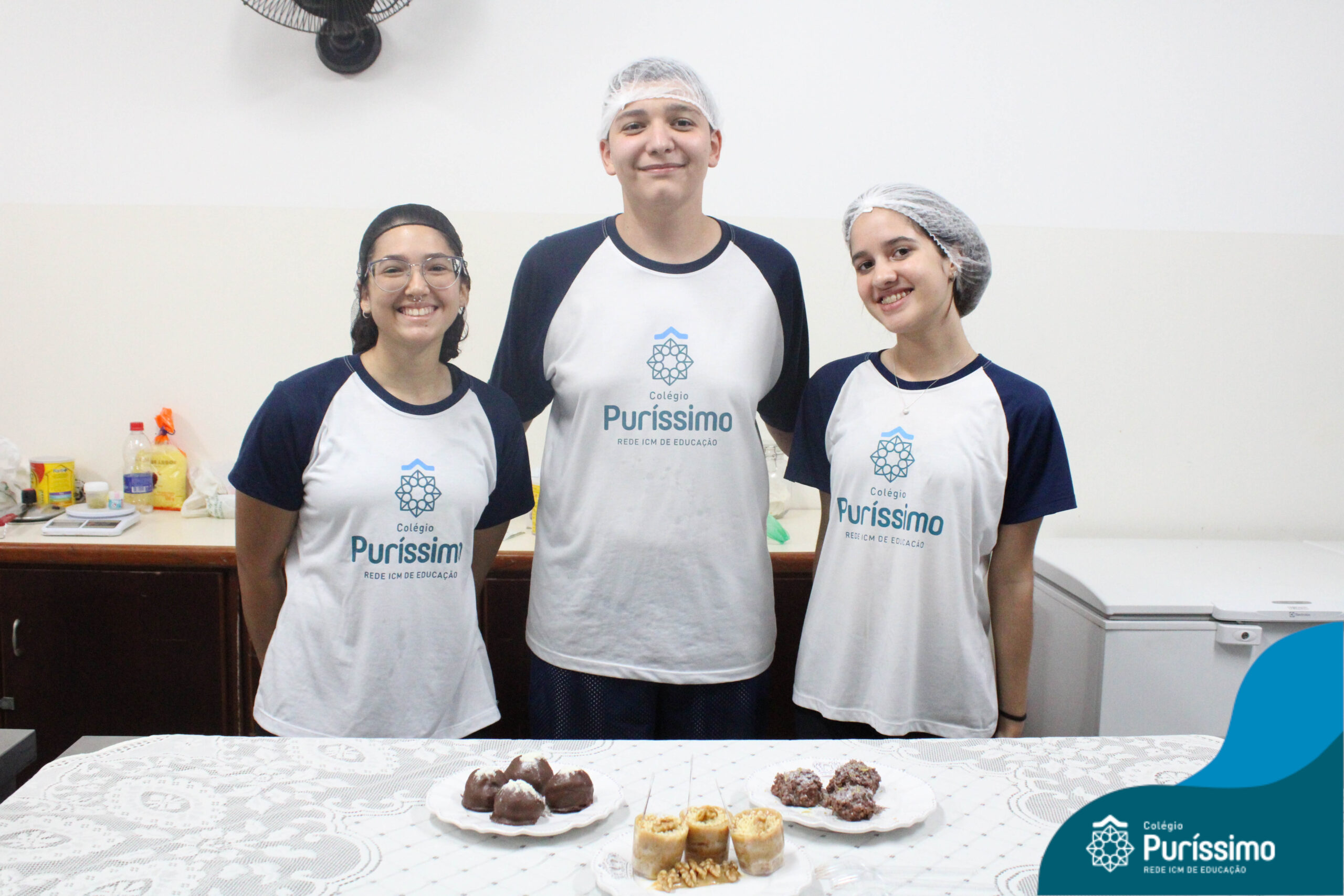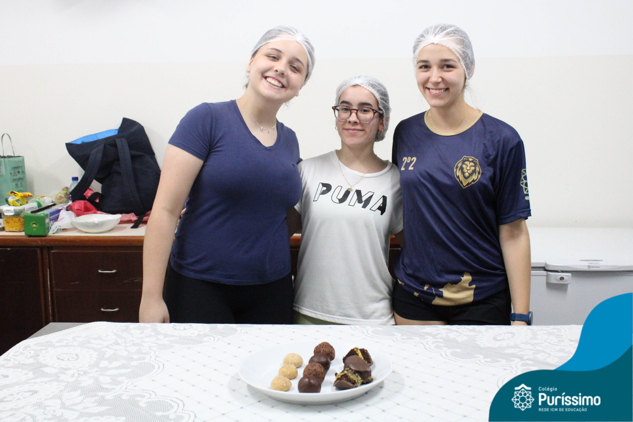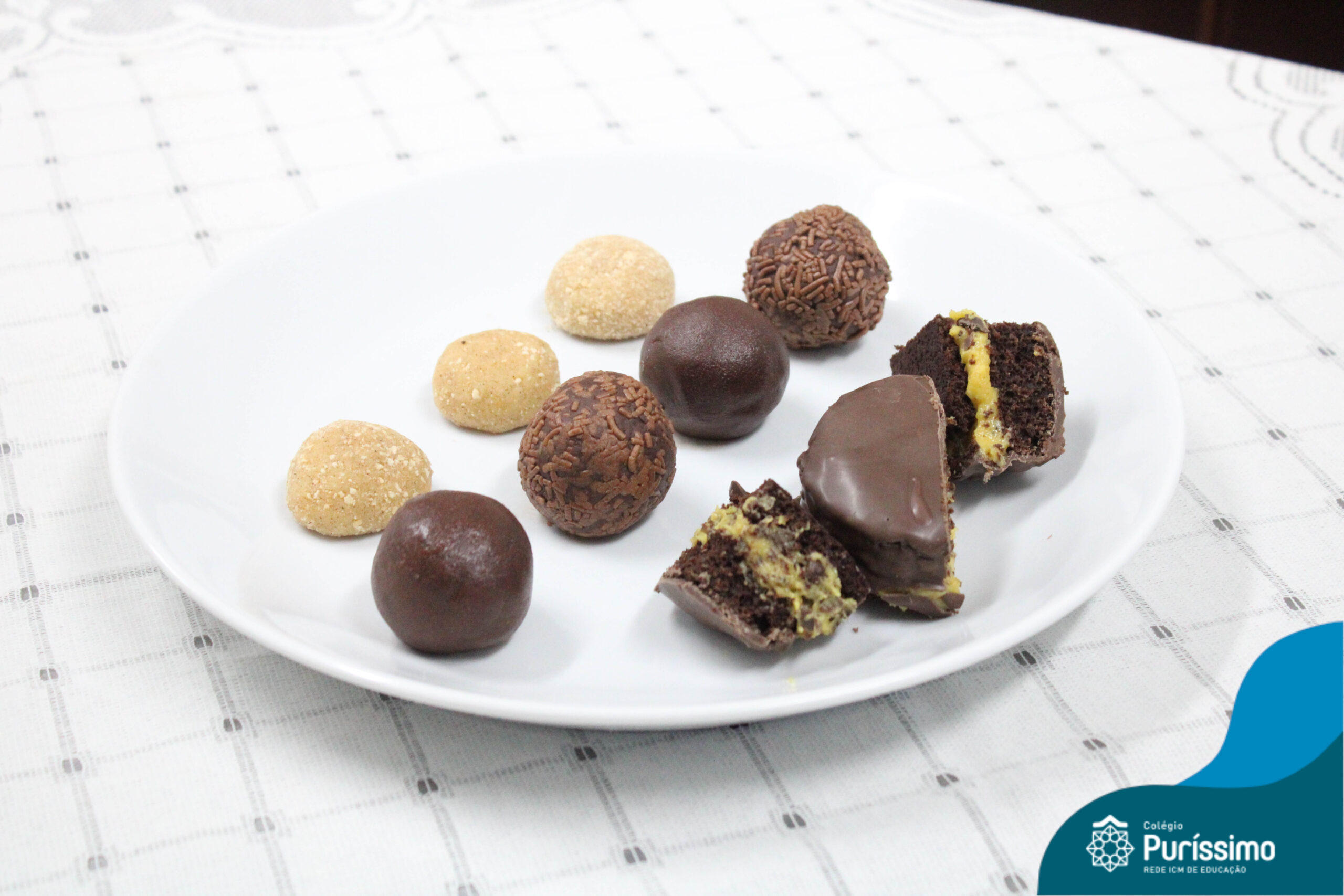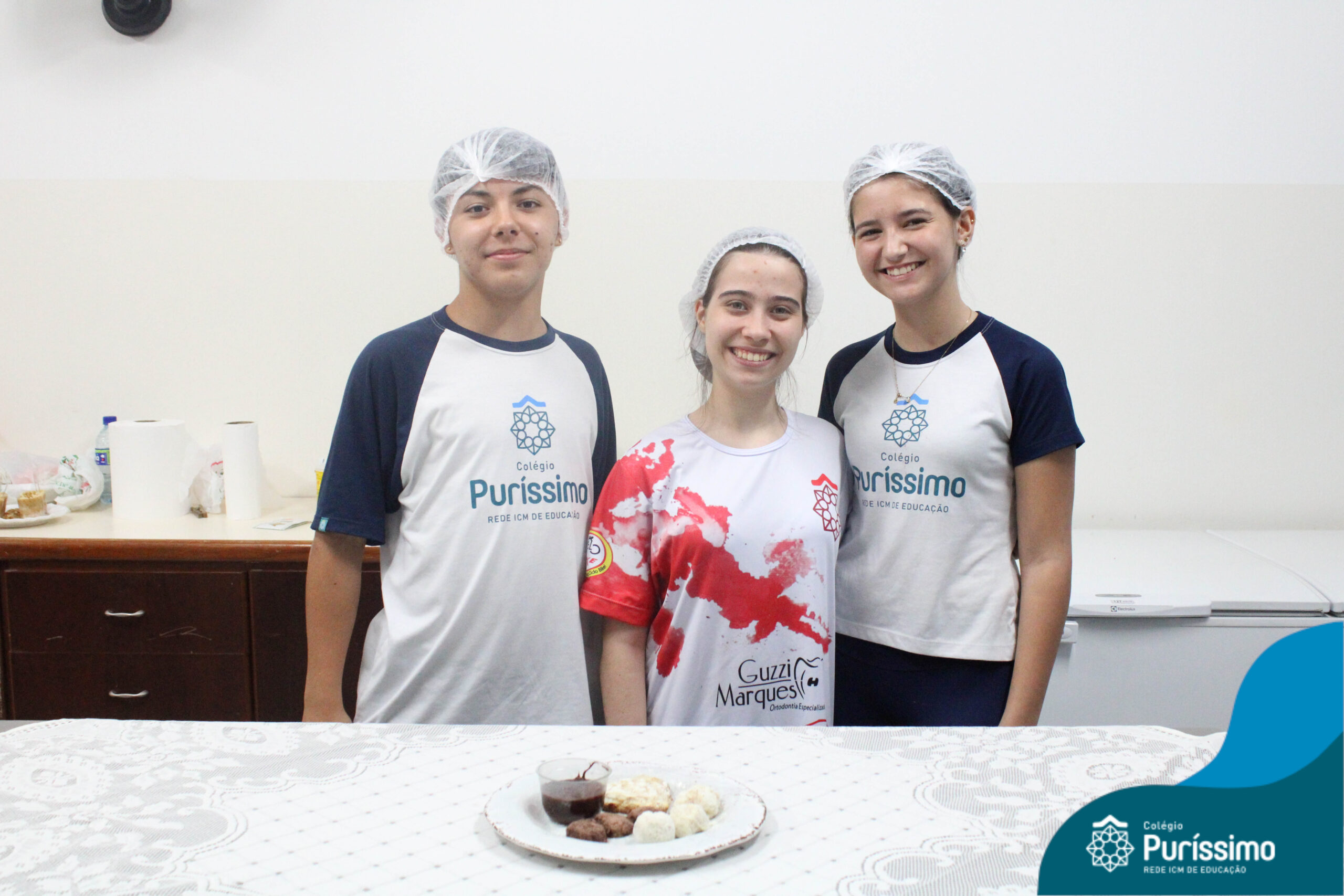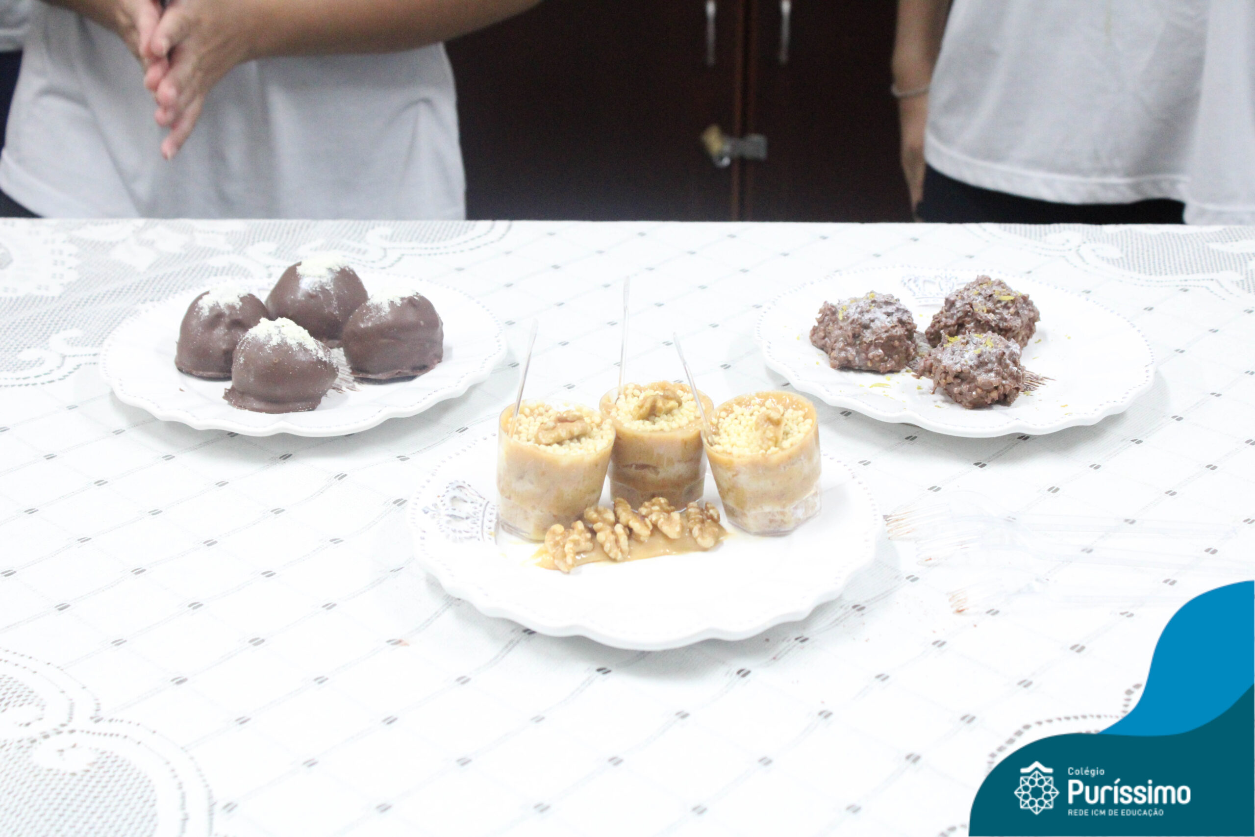Os estudantes tinham como tema “docinhos de festa” e cada equipe entregou três tipos diferentes de doces para que fossem avaliados pelo chef João e pelo professor Rodrigo, de inglês.
