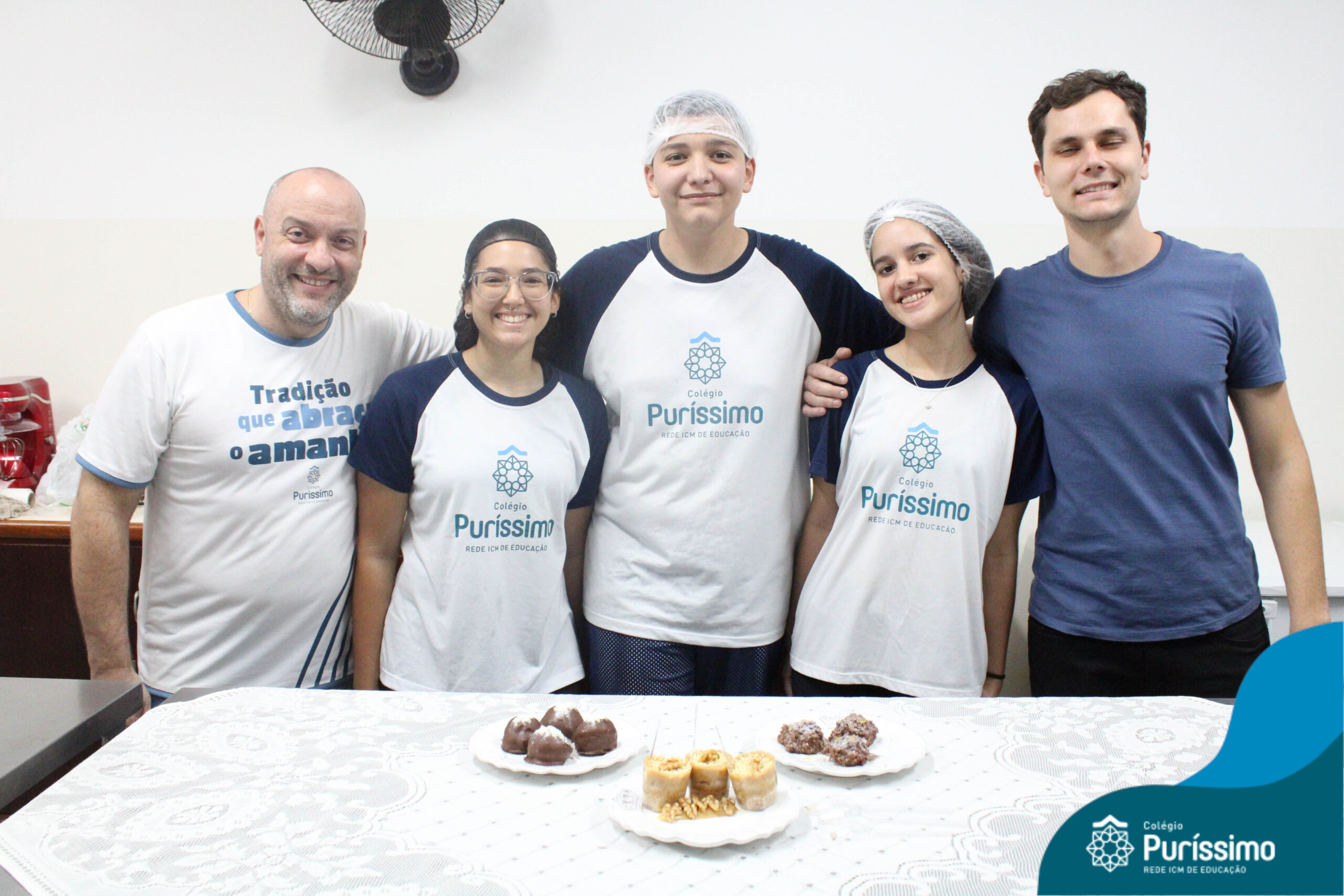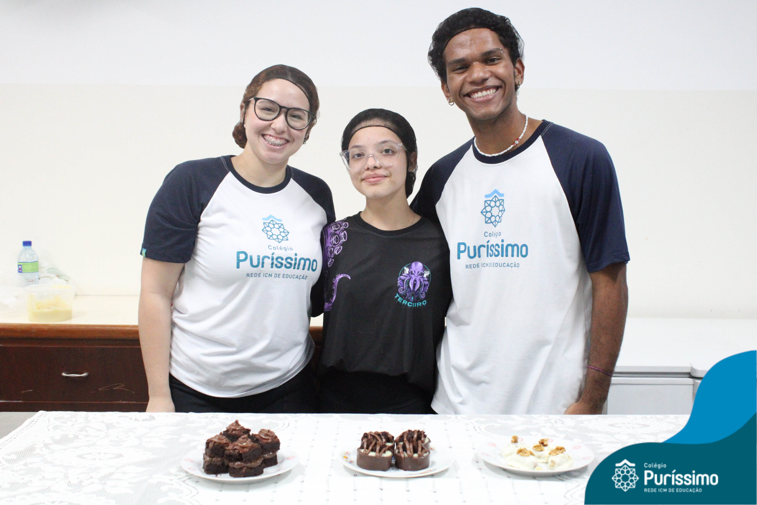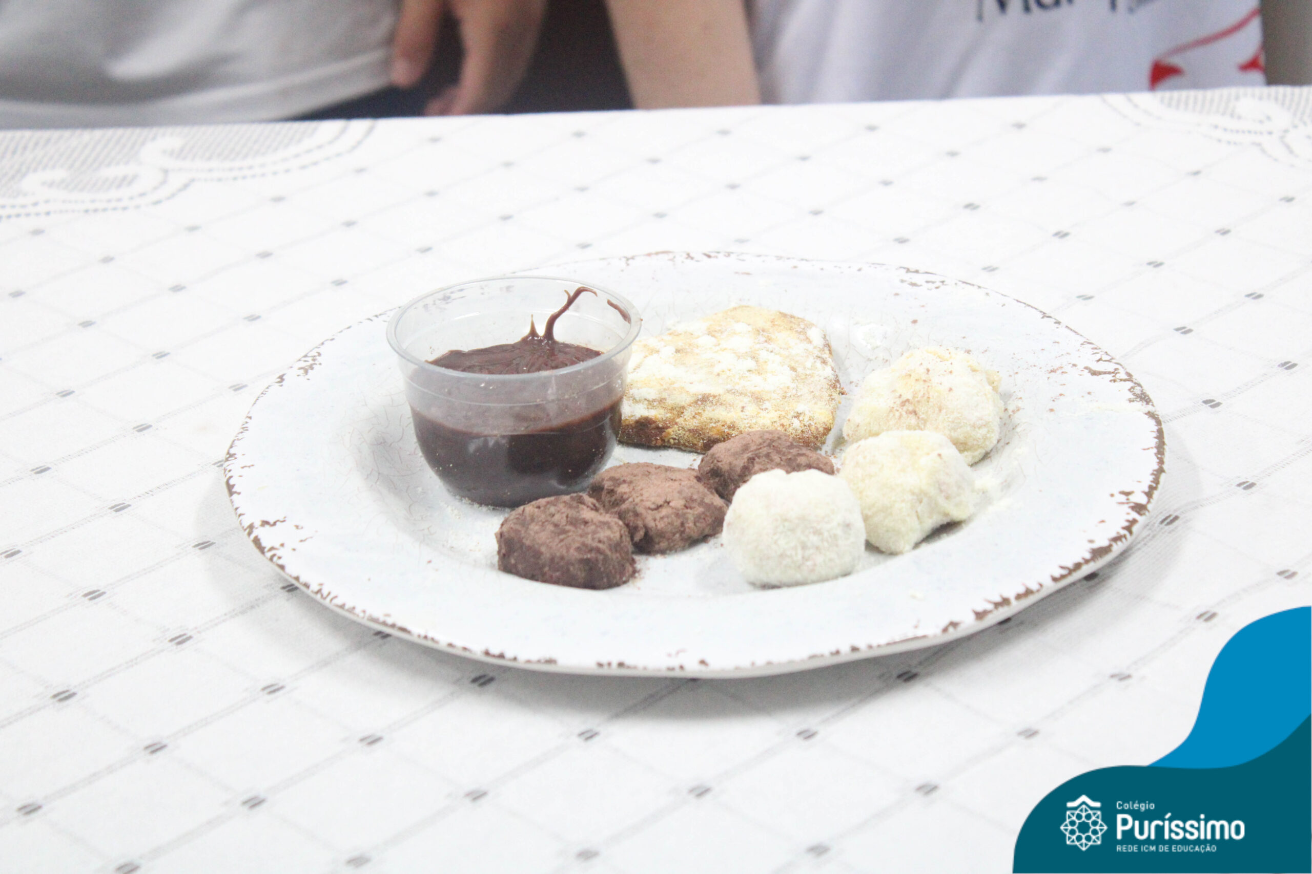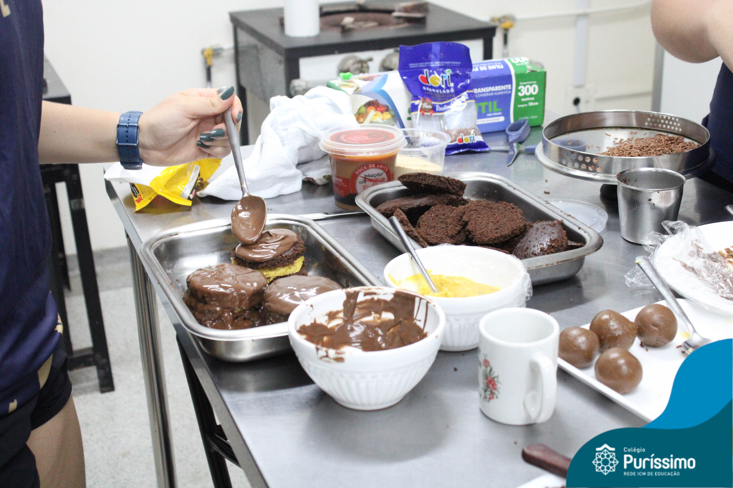 Os estudantes tinham como tema “docinhos de festa” e cada equipe entregou três tipos diferentes de doces para que fossem avaliados pelo chef João e pelo professor Rodrigo, de inglês.
