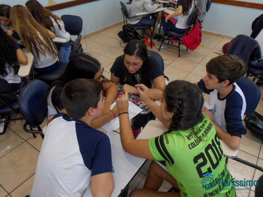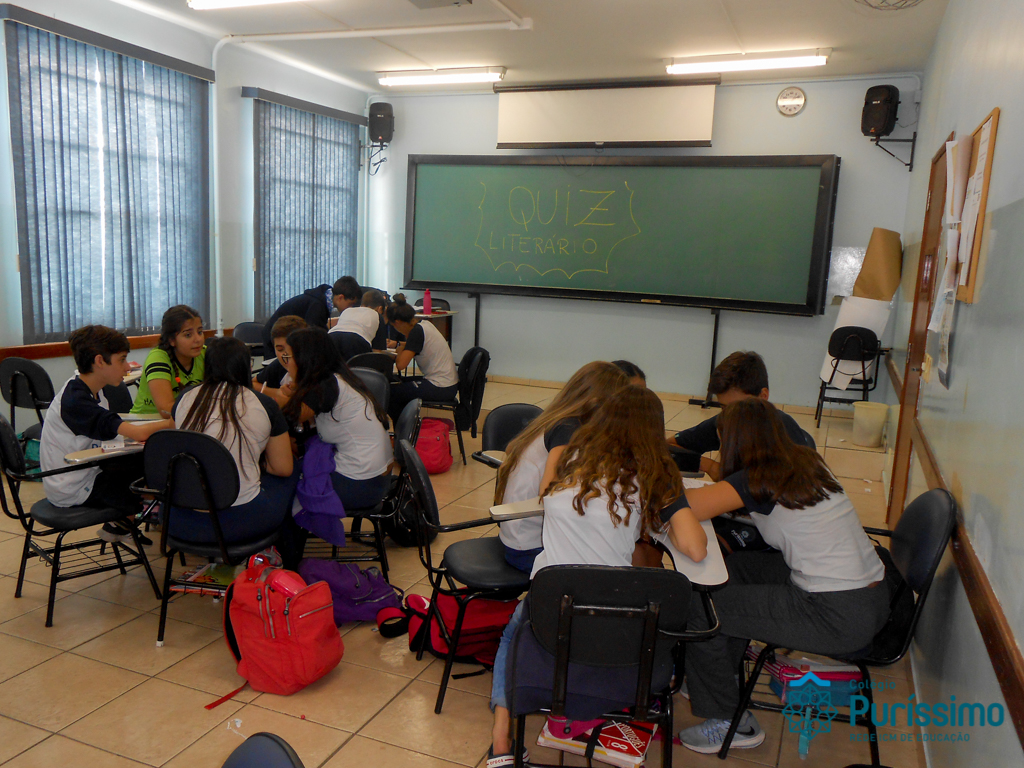 No mês de abril, os alunos dos 8ºs e 9ºs anos realizaram uma atividade relacionada à leitura dos livros paradidáticos propostos como leitura adicional. A atividade foi realizada pela professora Mariana Camolese, que desenvolveu um Quiz literário, no qual os alunos participaram em grupos, respondendo questões sobre o livro como se fosse uma competição, um jogo. As perguntas foram feitas pela professora, a qual determinava um tempo para a resposta, que era escrita pelo grupo. No final, os grupos vencedores foram aqueles que elaboraram respostas mais completas aos desafios propostos, fato que também proporcionou o estímulo à escrita de forma natural.
