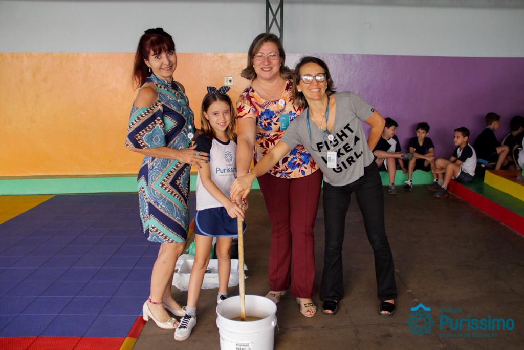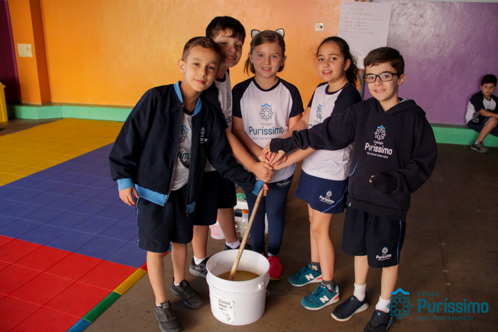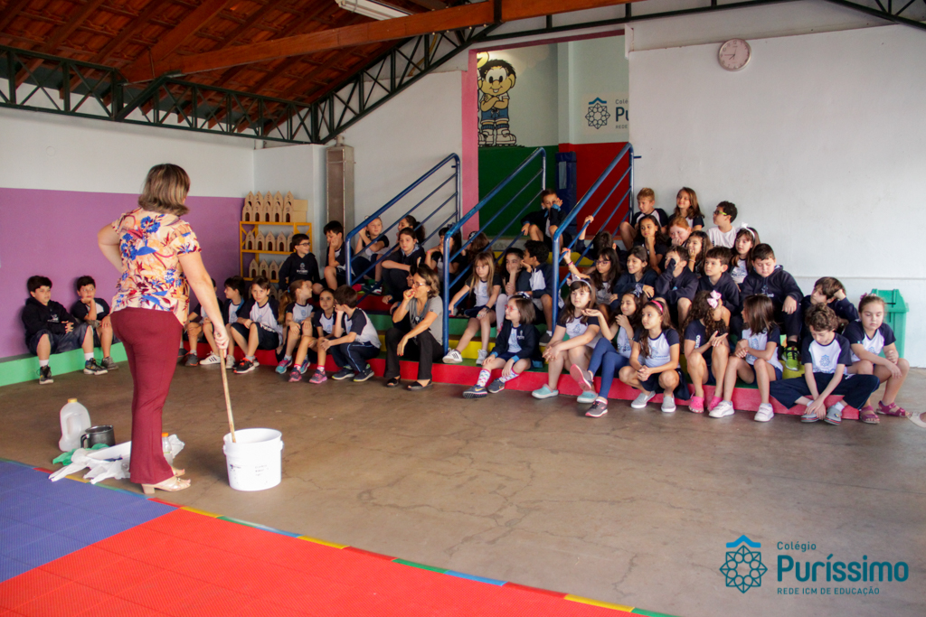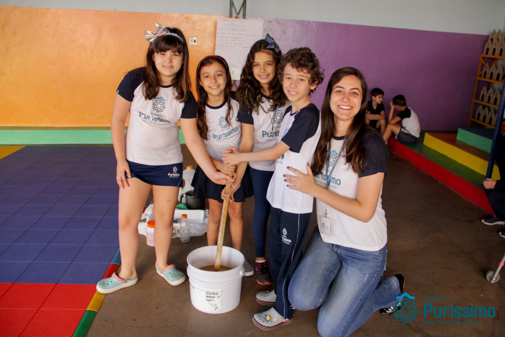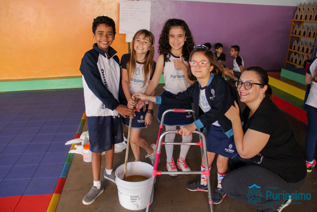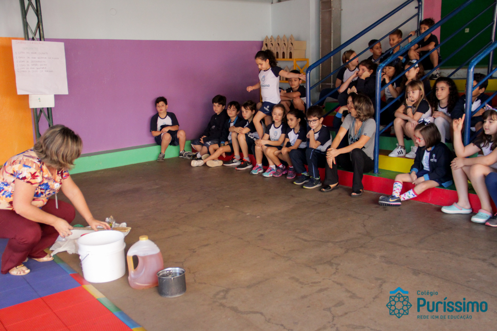 Como parte do trabalho com o livro “o jogo de não jogar”, no qual as crianças estudaram sobre o lixo, reciclagem, reaproveitamento e sustentabilidade, os alunos do 3° ano 3 T, receberam a avó do aluno Matheus, Maria de Lourdes, que ensinou as crianças a transformar óleo de cozinha usado em sabão. Com os 3°s anos 1 e 2 M, a coordenadora Valéria fez o mesmo processo.