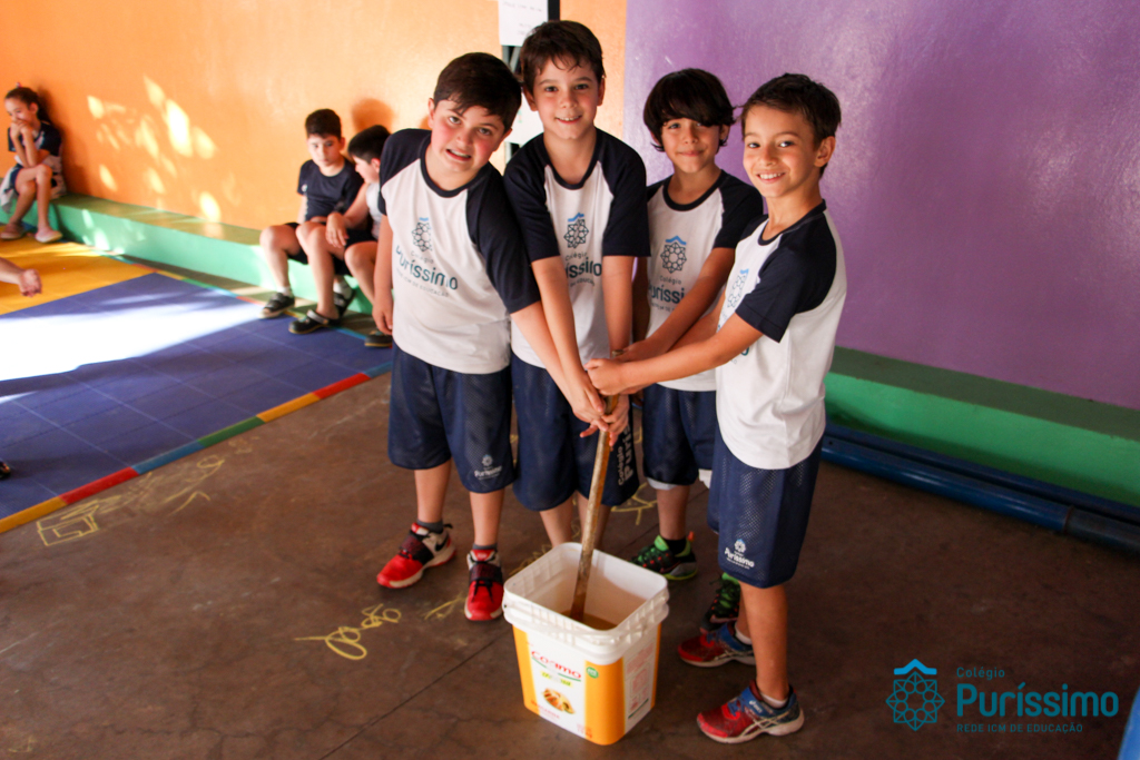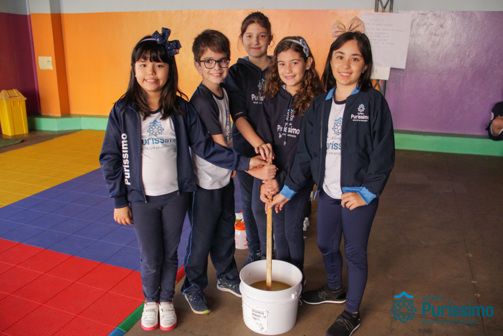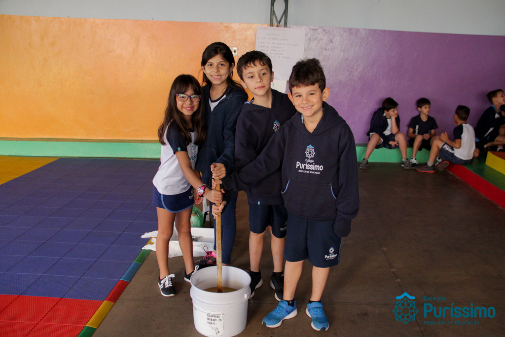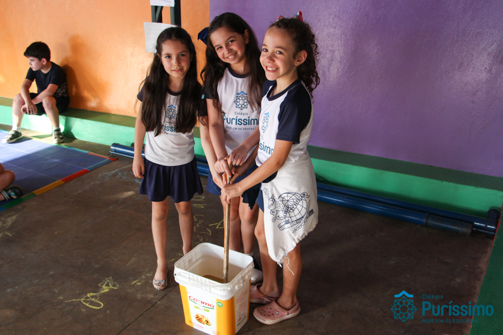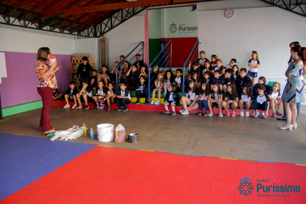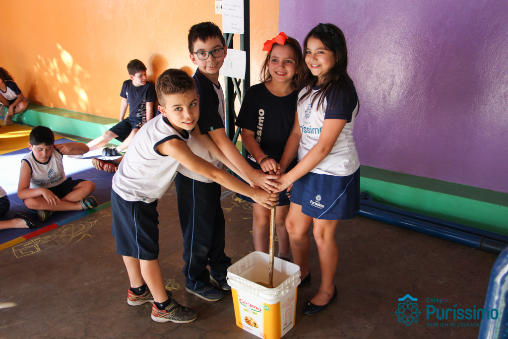 Como parte do trabalho com o livro “o jogo de não jogar”, no qual as crianças estudaram sobre o lixo, reciclagem, reaproveitamento e sustentabilidade, os alunos do 3° ano 3 T, receberam a avó do aluno Matheus, Maria de Lourdes, que ensinou as crianças a transformar óleo de cozinha usado em sabão. Com os 3°s anos 1 e 2 M, a coordenadora Valéria fez o mesmo processo.
