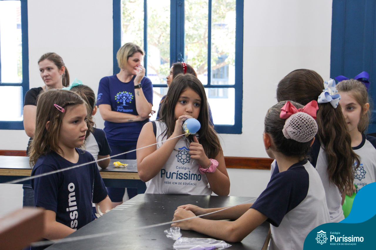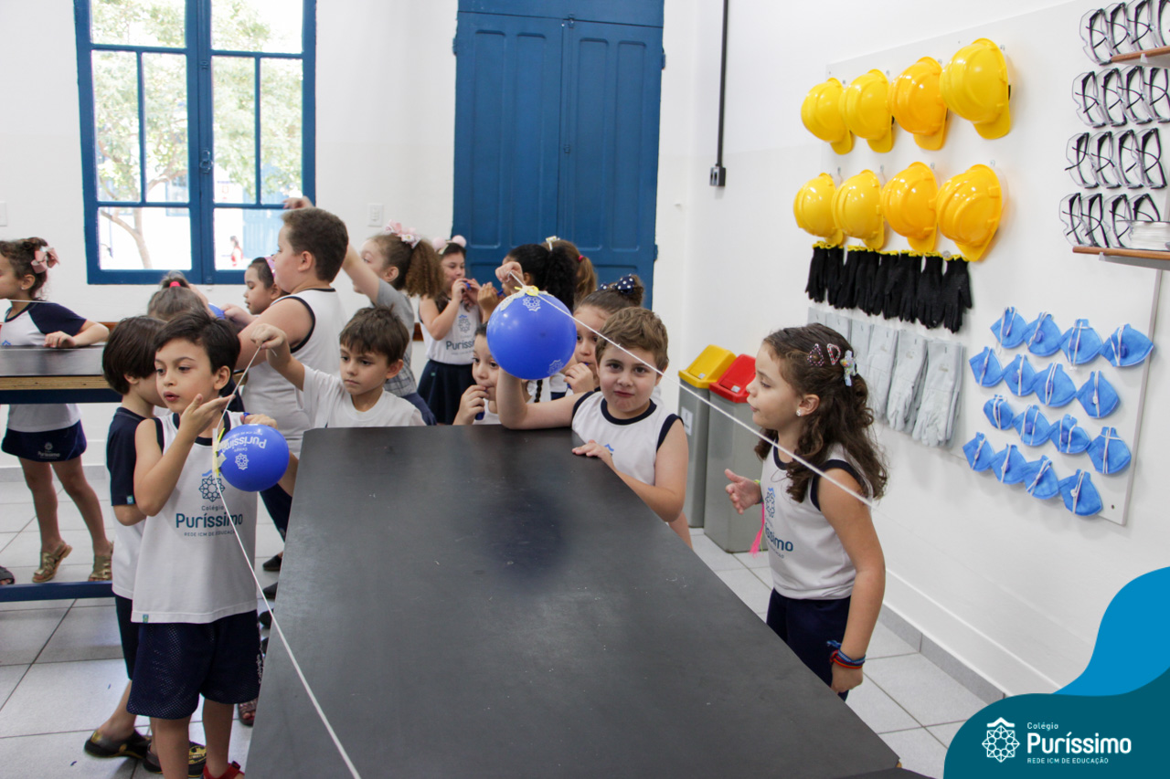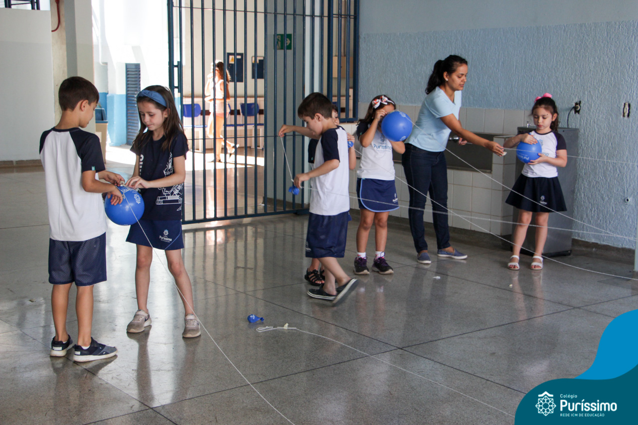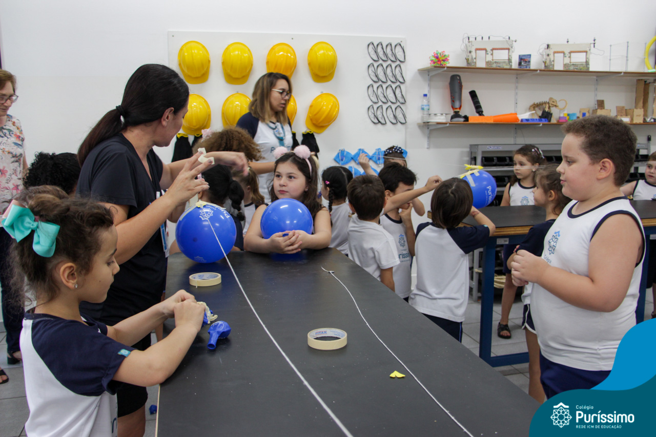 Utilizando bexiga, barbante, fita adesiva, foguete de e.v.a. e canudo, as crianças precisaram pensar em como fazer um lançamento de foguetes e, a partir daí, apostar corrida com suas criações.
