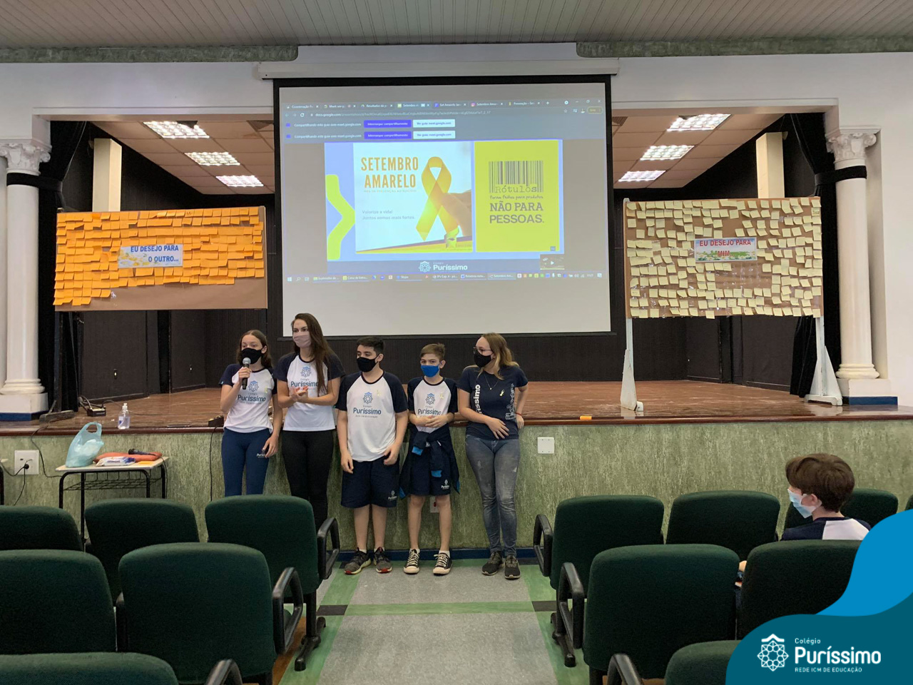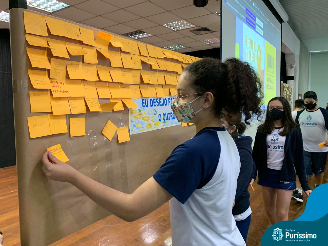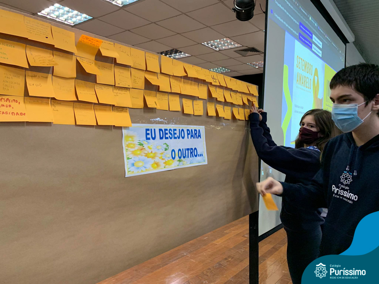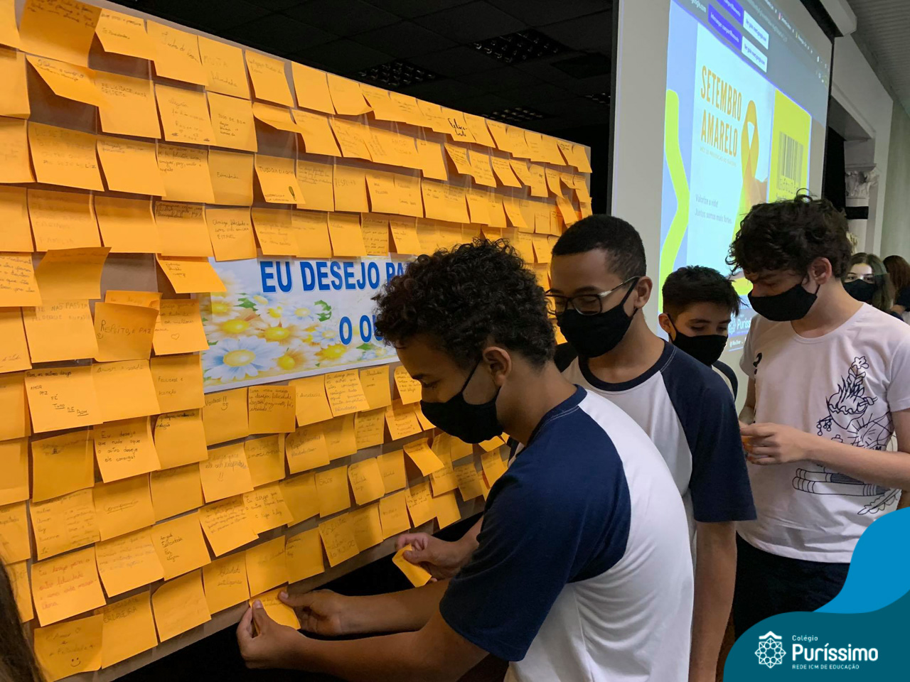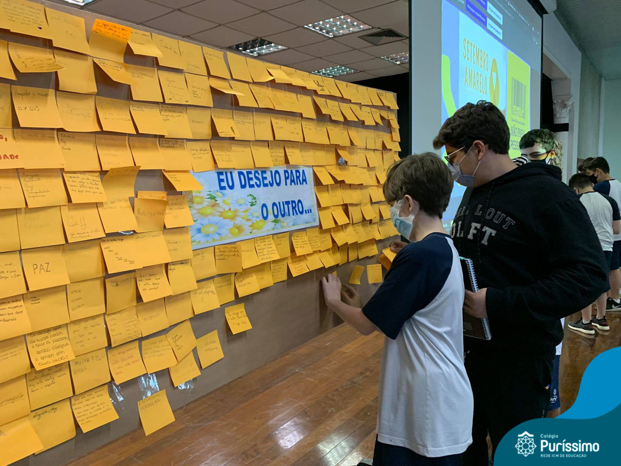 Além da explicação sobre a campanha de prevenção ao suicídio, os alunos entregaram uma fitinha amarela para os colaboradores, simbolizando a importância de estar sempre presente para o próximo. Já para os alunos do Ensino Fundamental – Anos Finais, a conversa foi junto com a coordenadora Janaina, que reiterou sobre a importância do combate ao bullying e também da depressão e, juntos, construíram dois murais: um com os desejos para si e o outro com os desejos para o próximo.