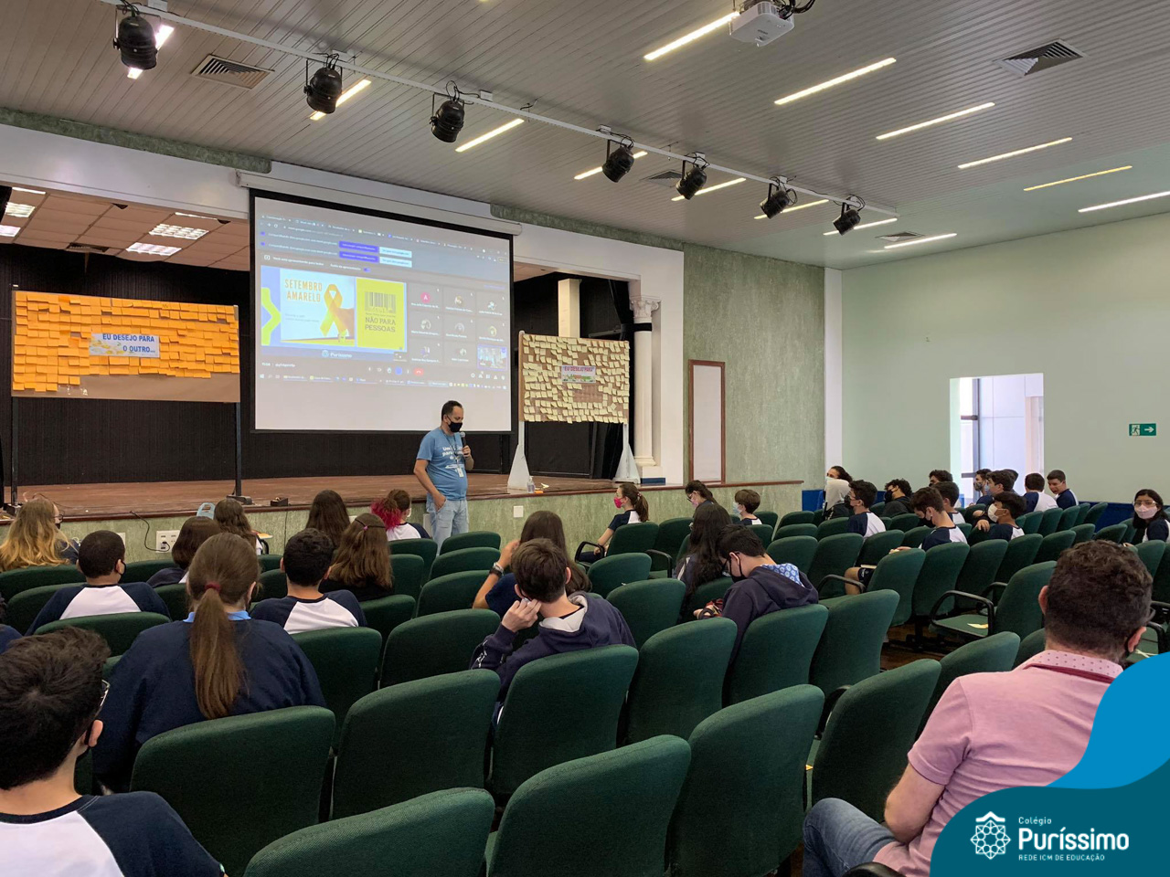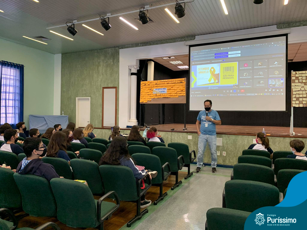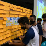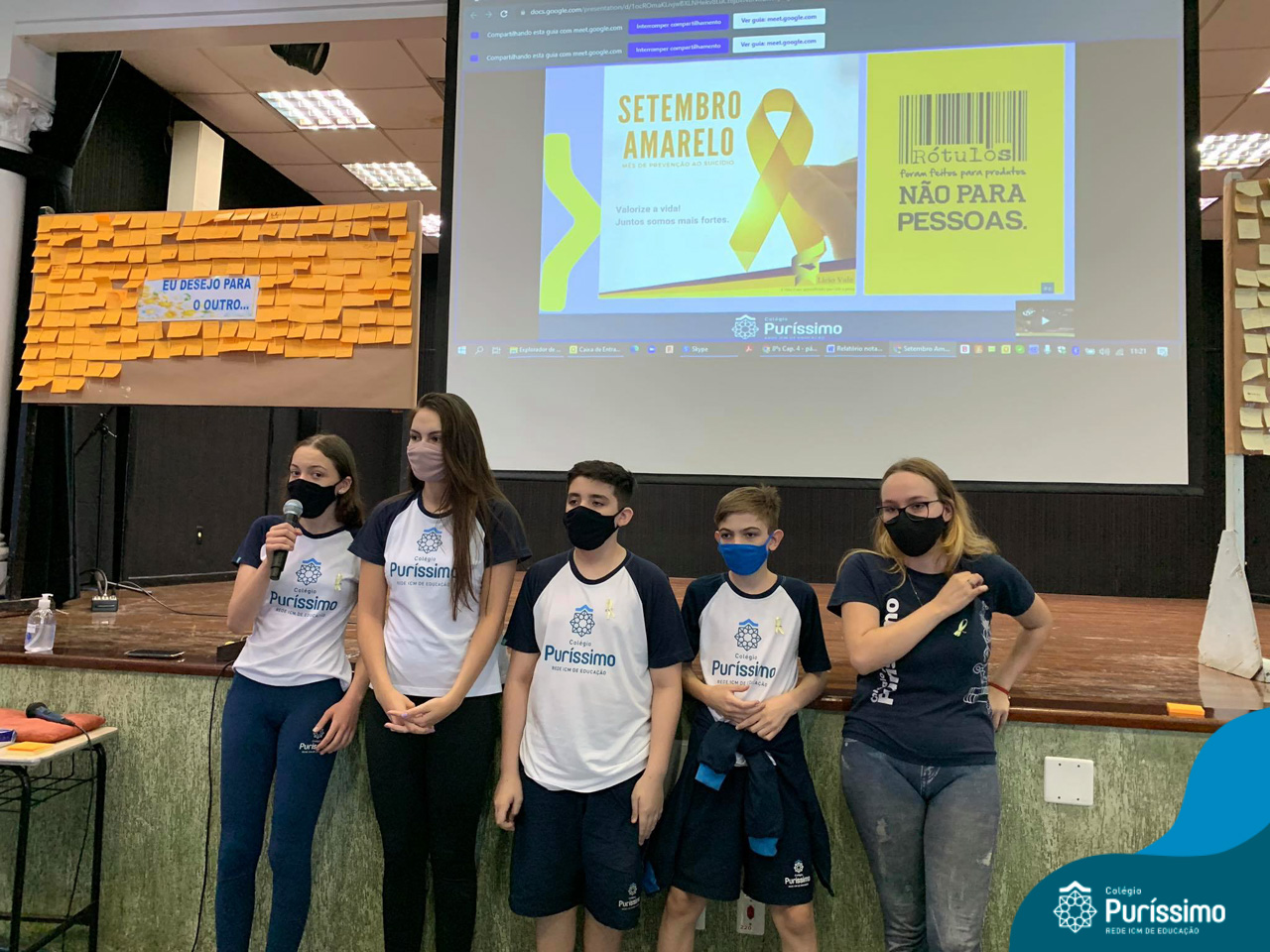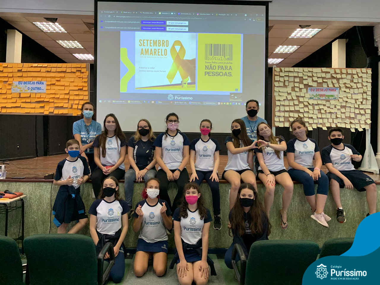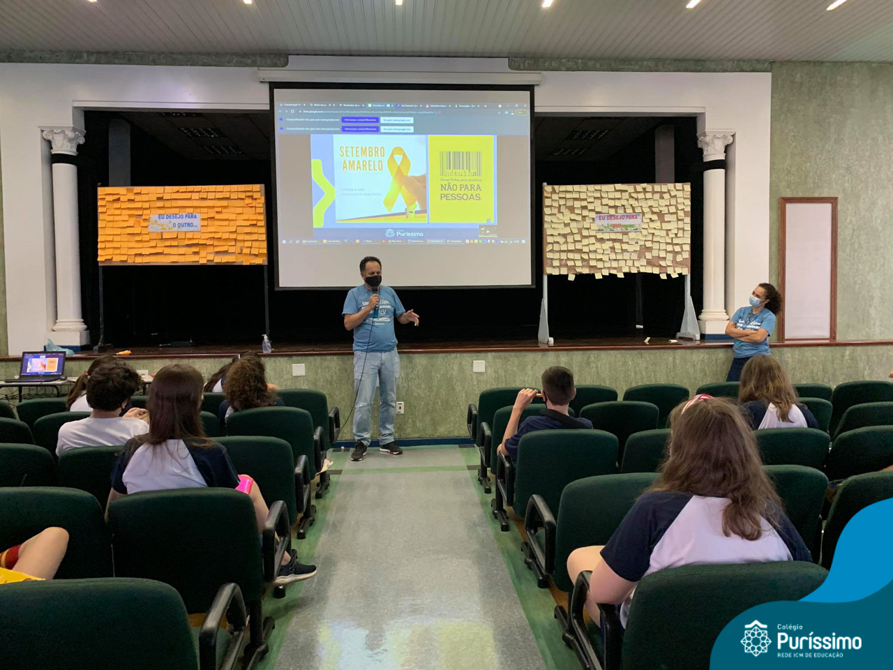 Além da explicação sobre a campanha de prevenção ao suicídio, os alunos entregaram uma fitinha amarela para os colaboradores, simbolizando a importância de estar sempre presente para o próximo. Já para os alunos do Ensino Fundamental – Anos Finais, a conversa foi junto com a coordenadora Janaina, que reiterou sobre a importância do combate ao bullying e também da depressão e, juntos, construíram dois murais: um com os desejos para si e o outro com os desejos para o próximo.