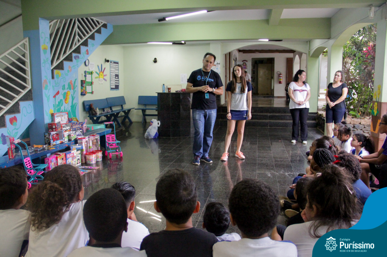 Após conhecerem o espaço Presença Esperança, do Projeto Caic, os alunos compraram brinquedos que foram doados para o mesmo, para que as 78 crianças que são atendidas diariamente, possam além de estudar, ter um momento de descontração com carrinhos, bonecas e jogos.