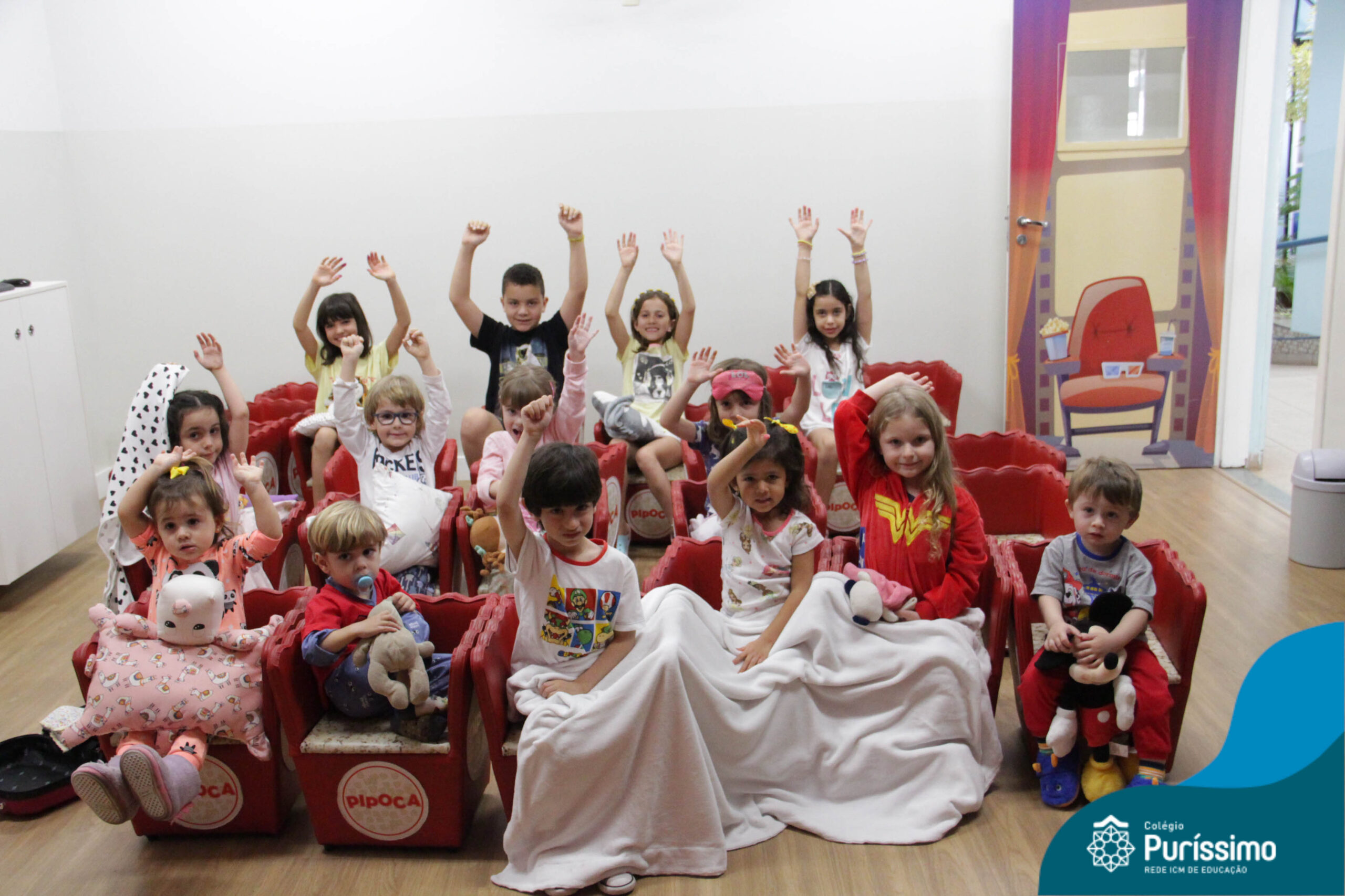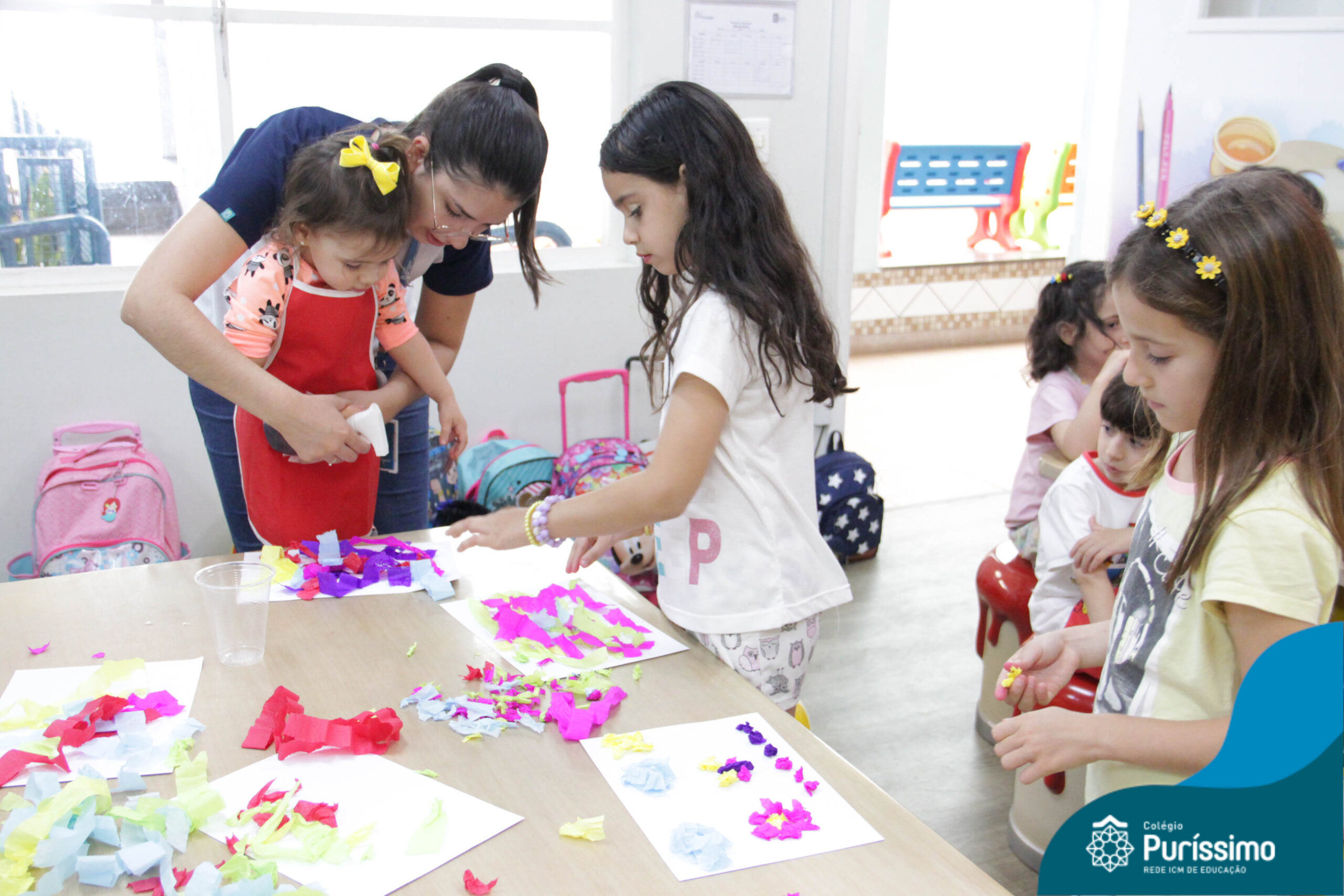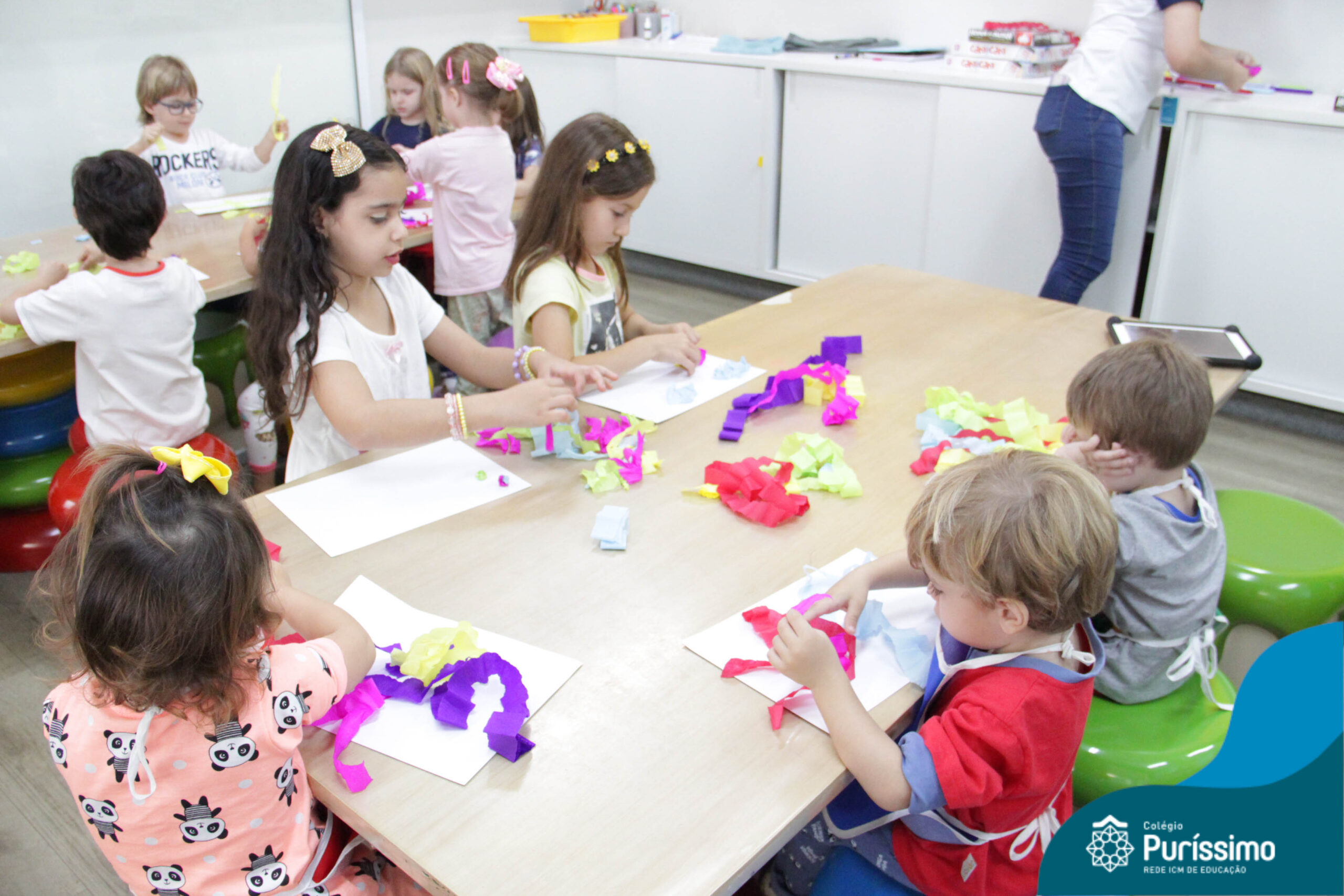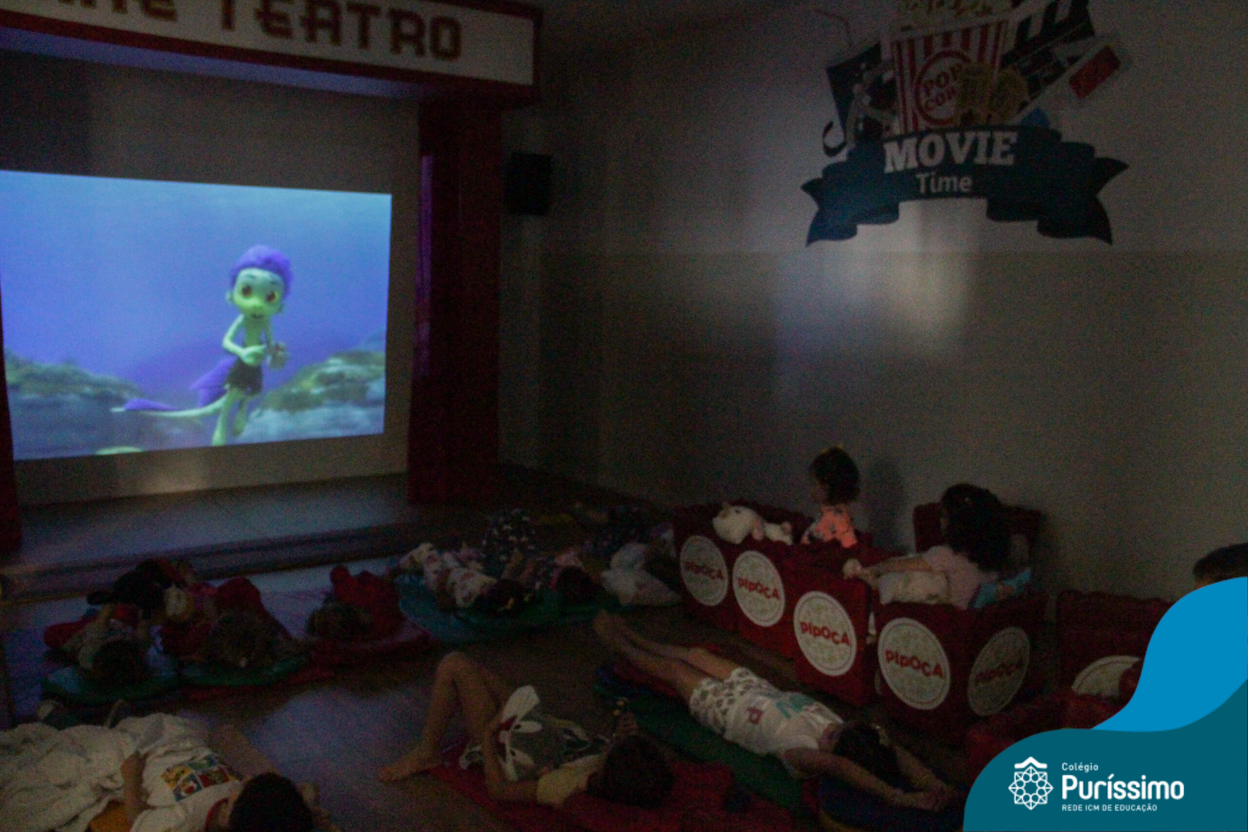Hoje as crianças aprenderam a pintar com papel crepom, brincaram de pega-pega e terminaram o dia com um filme super legal.