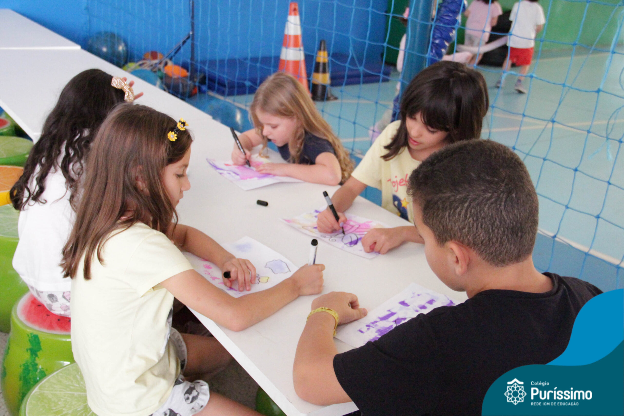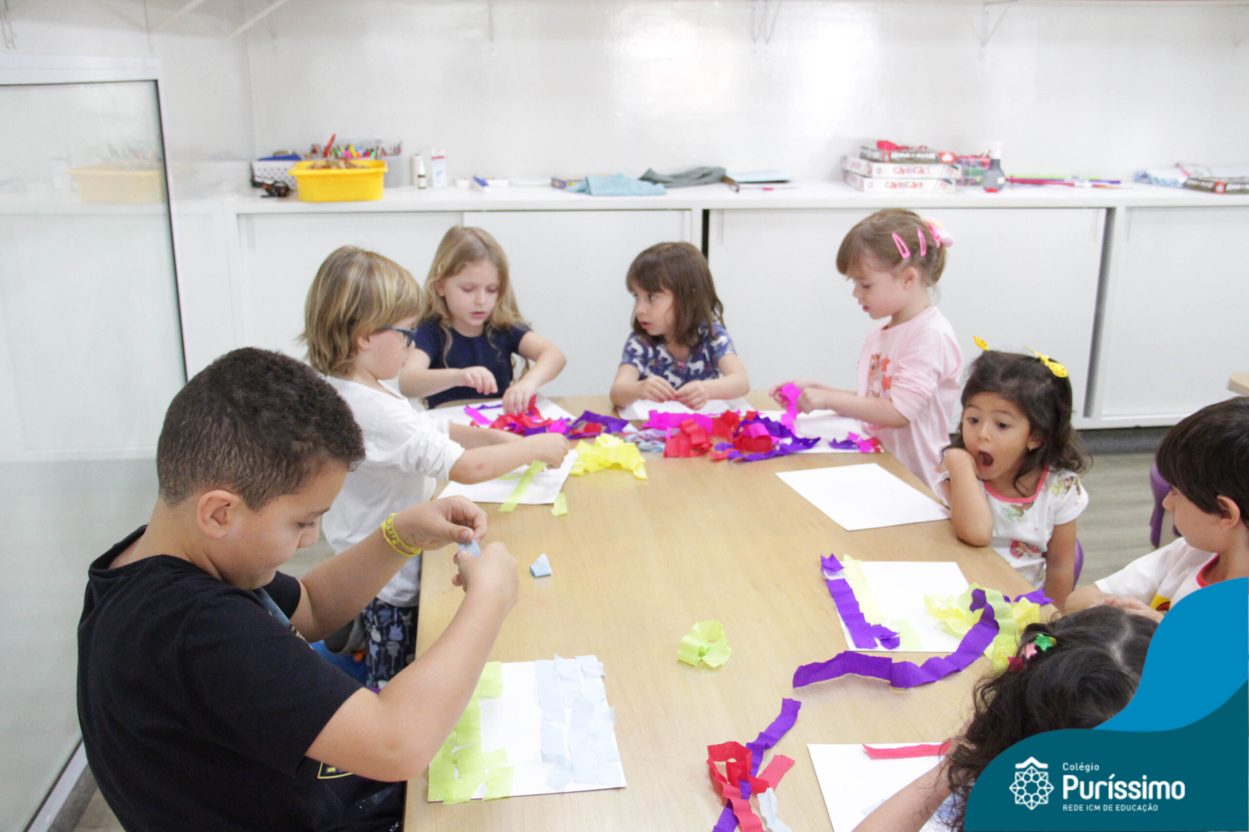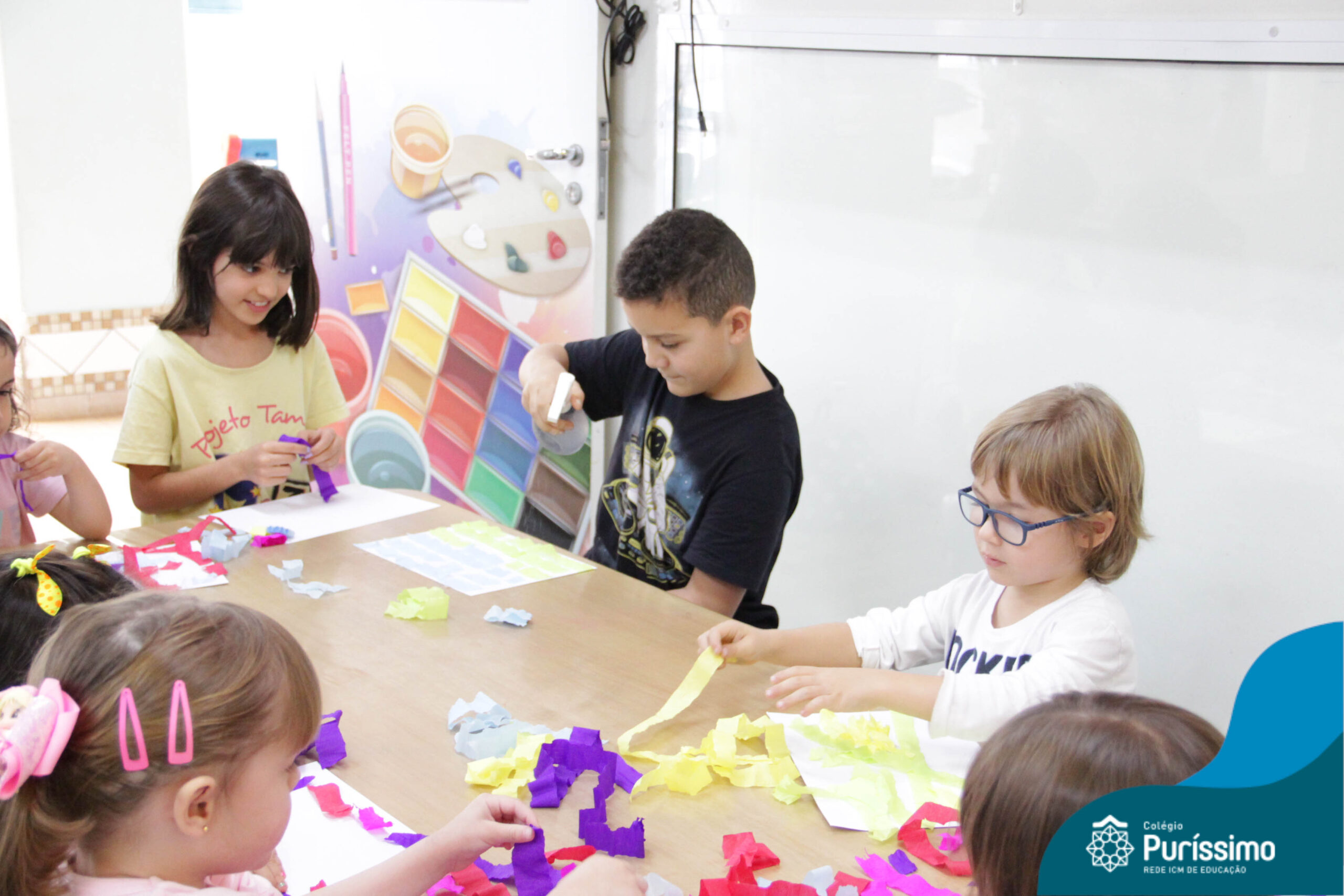Hoje as crianças aprenderam a pintar com papel crepom, brincaram de pega-pega e terminaram o dia com um filme super legal.