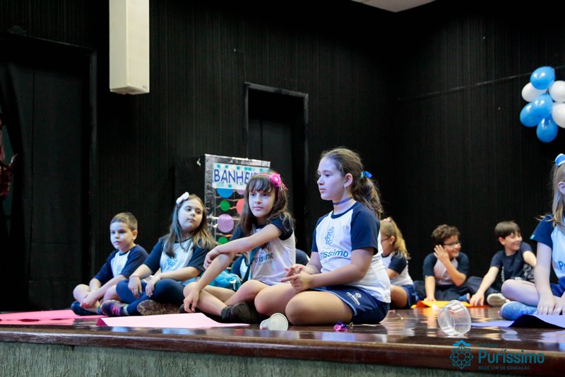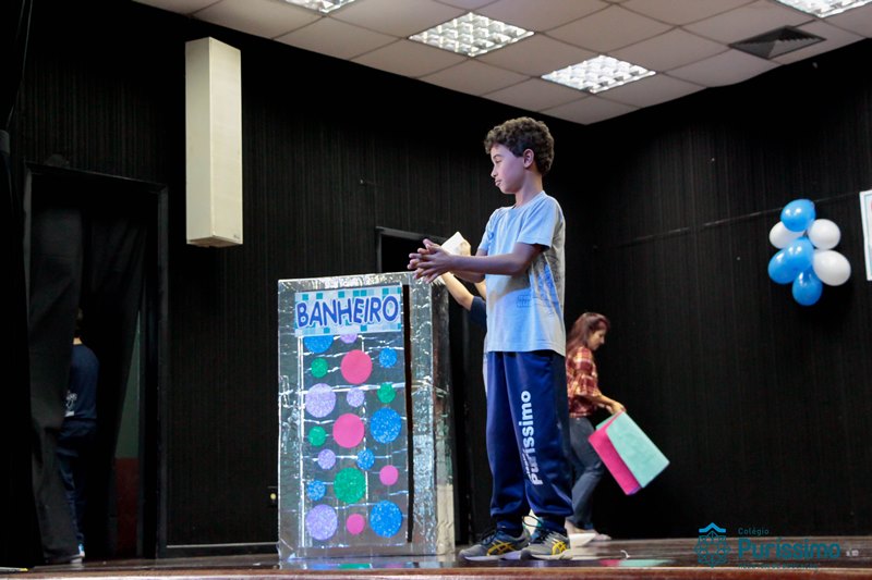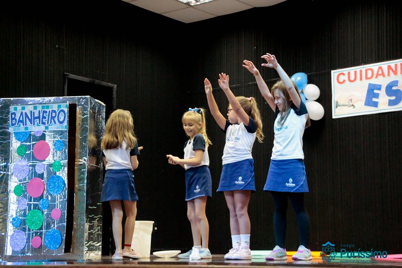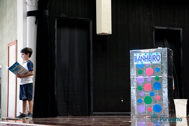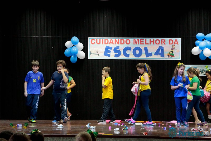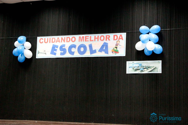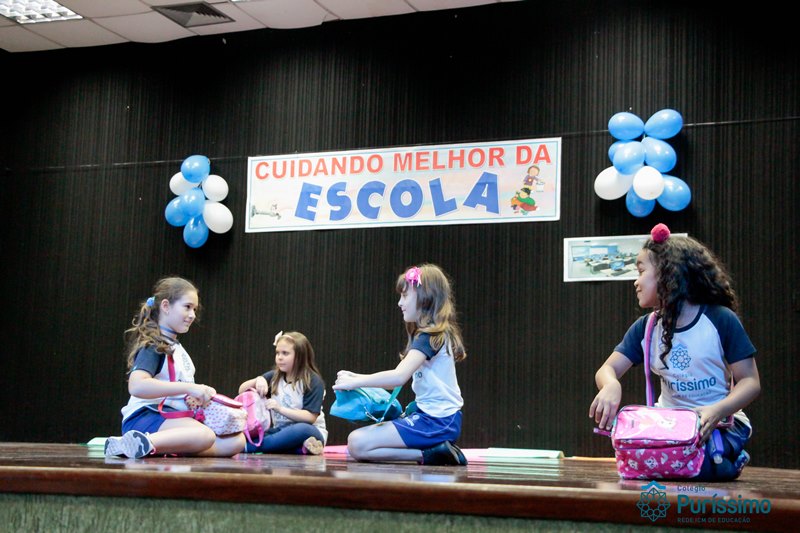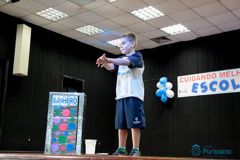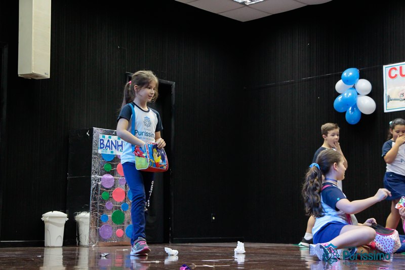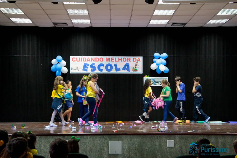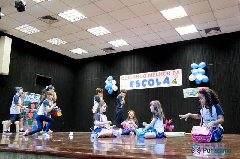 Os alunos do 3º 1 da manhã apresentaram um teatro aos alunos dos Ensino Fundamental I sobre os cuidados com a escola. A peça foi criada por eles para conscientizar os demais alunos sobre como devem cuidar bem do lugar onde estudam, como não jogar lixo no chão, dar a descarga, lavar as mãos e respeitar os amigos.