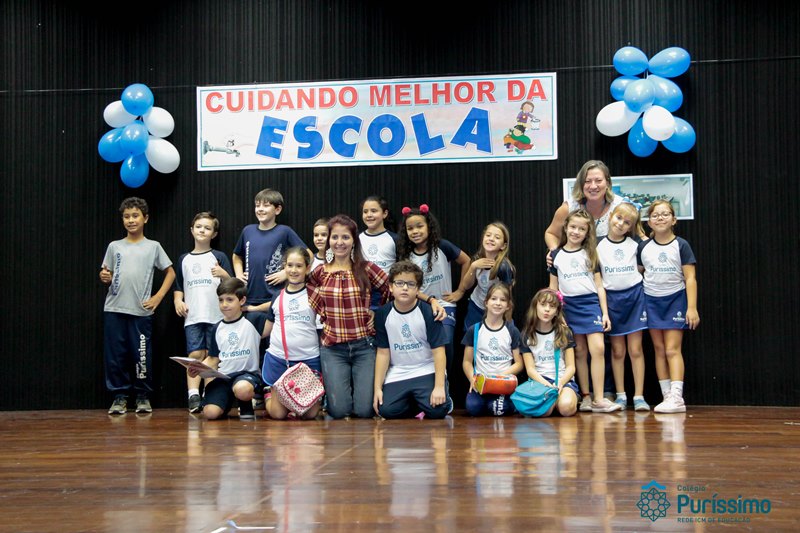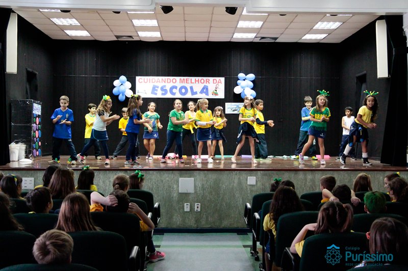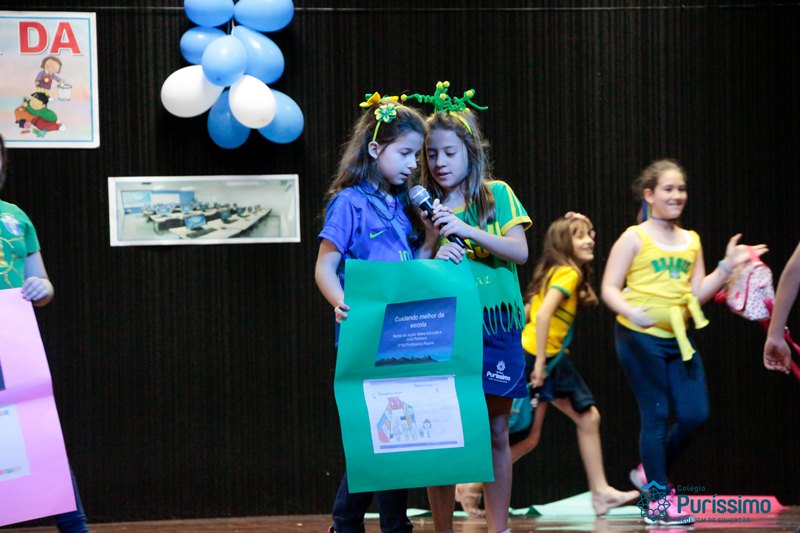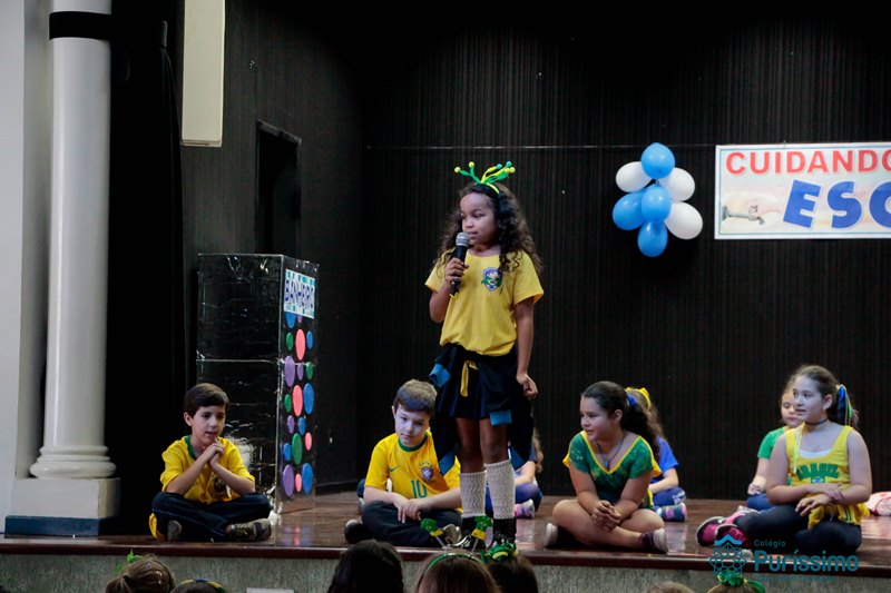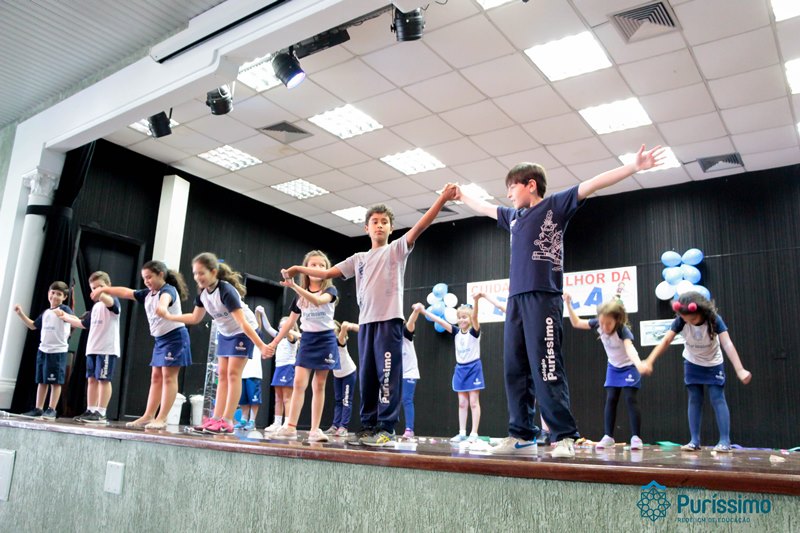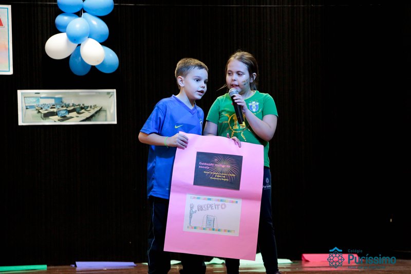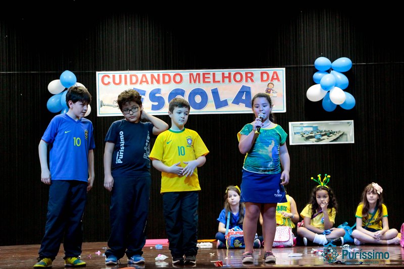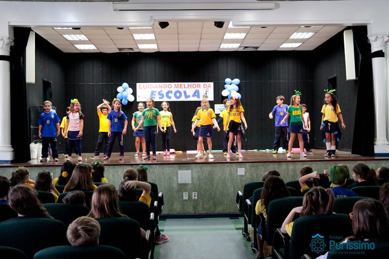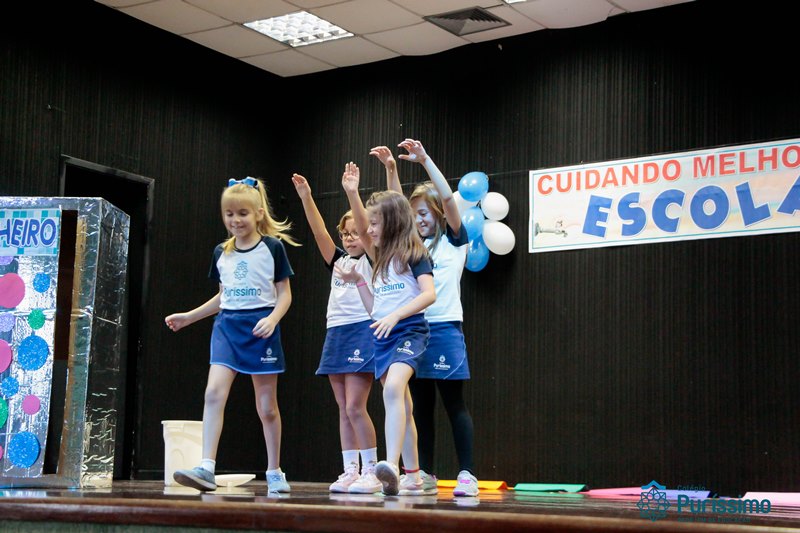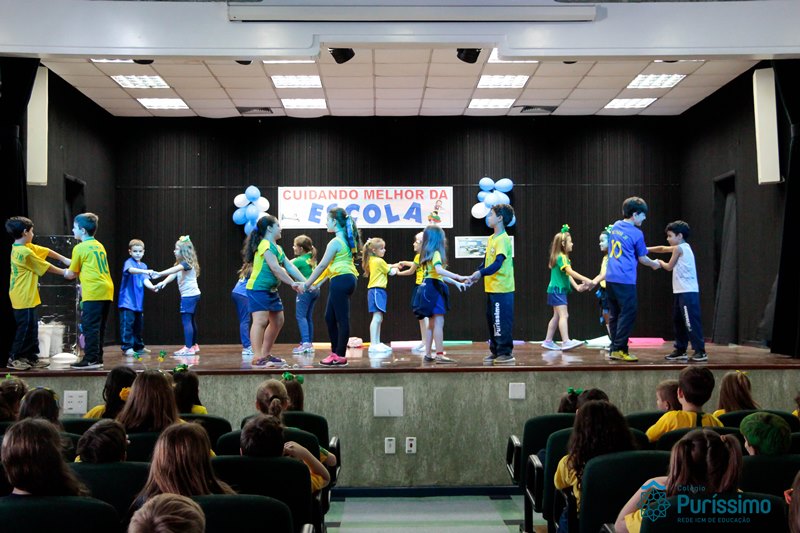 Os alunos do 3º 1 da manhã apresentaram um teatro aos alunos dos Ensino Fundamental I sobre os cuidados com a escola. A peça foi criada por eles para conscientizar os demais alunos sobre como devem cuidar bem do lugar onde estudam, como não jogar lixo no chão, dar a descarga, lavar as mãos e respeitar os amigos.