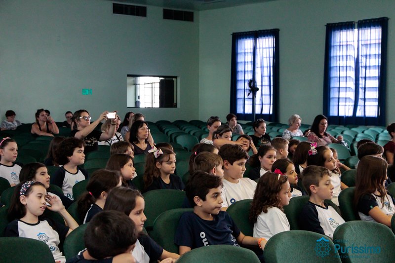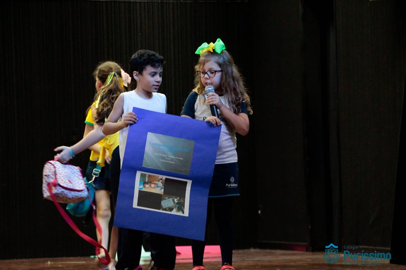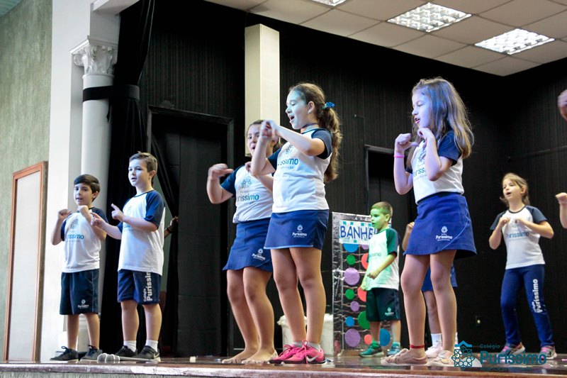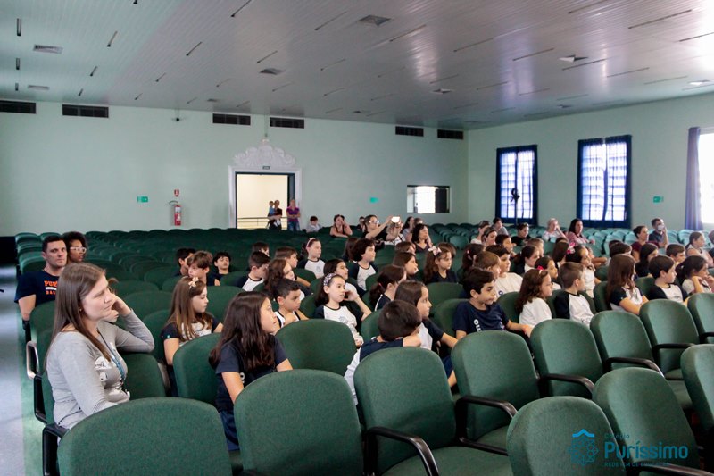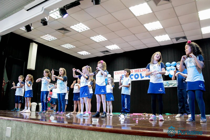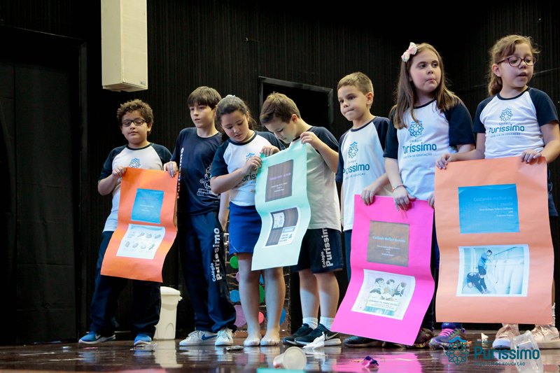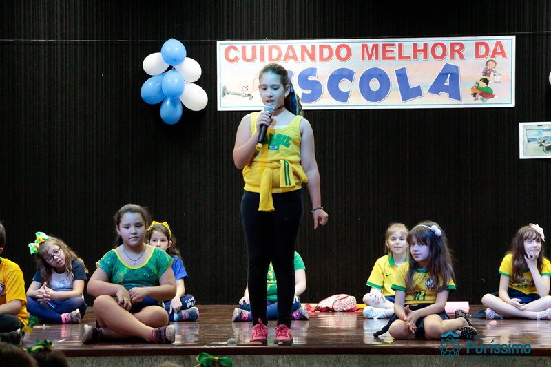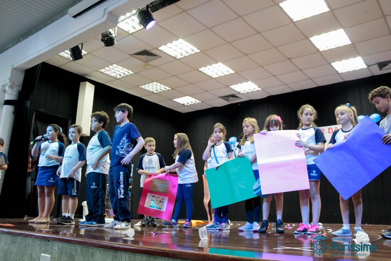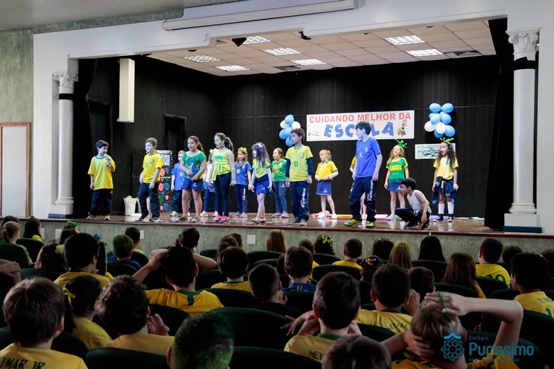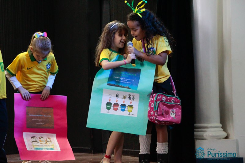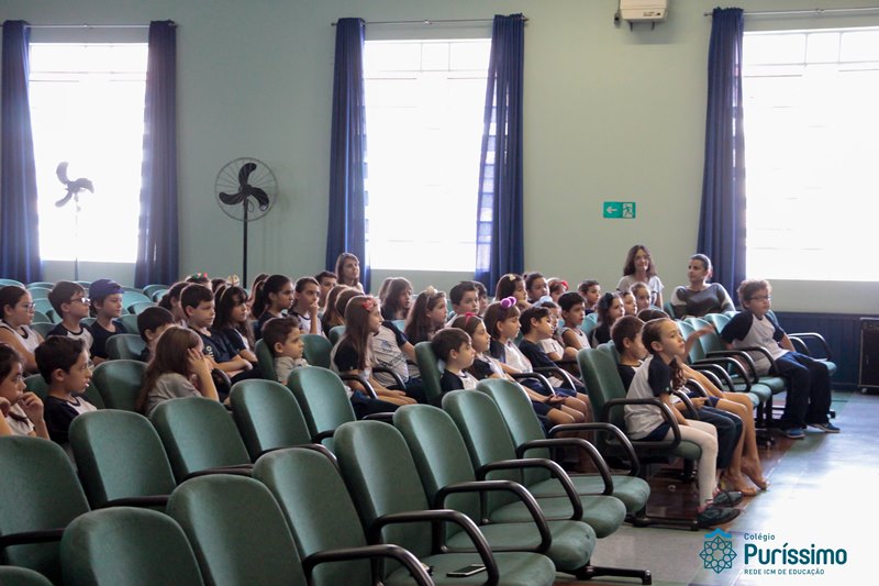 Os alunos do 3º 1 da manhã apresentaram um teatro aos alunos dos Ensino Fundamental I sobre os cuidados com a escola. A peça foi criada por eles para conscientizar os demais alunos sobre como devem cuidar bem do lugar onde estudam, como não jogar lixo no chão, dar a descarga, lavar as mãos e respeitar os amigos.