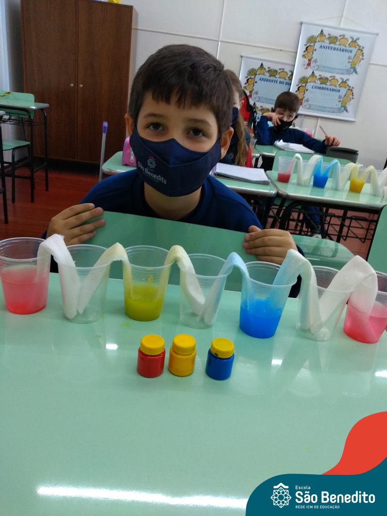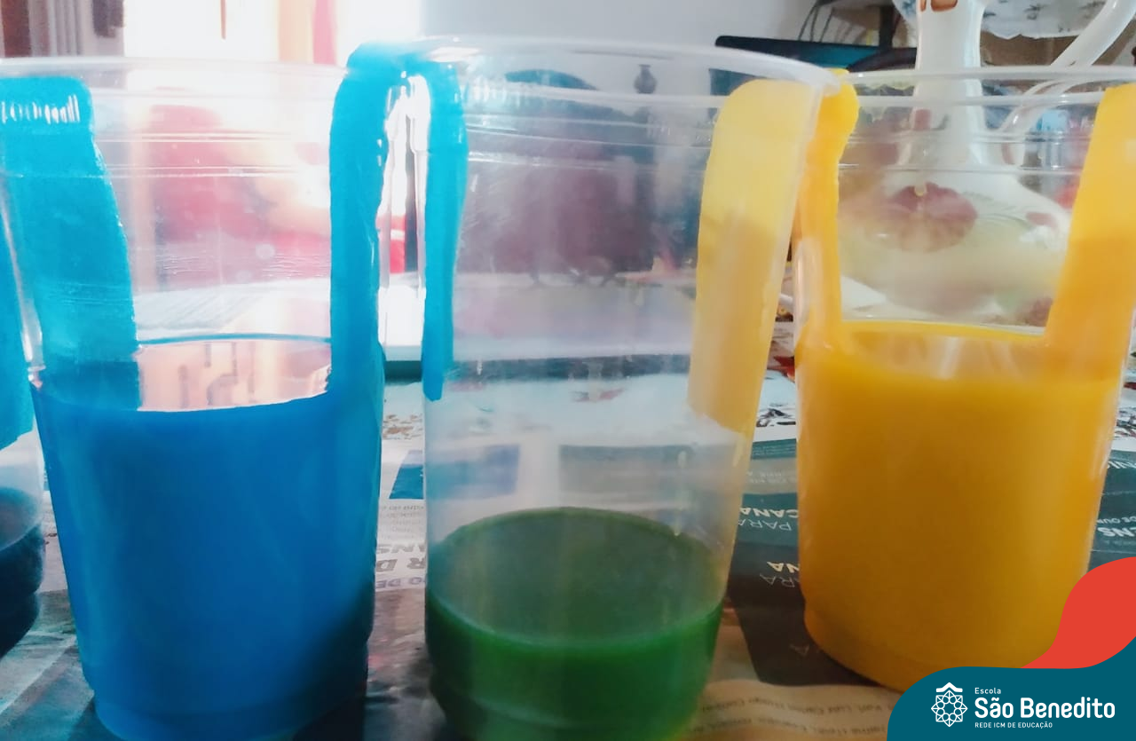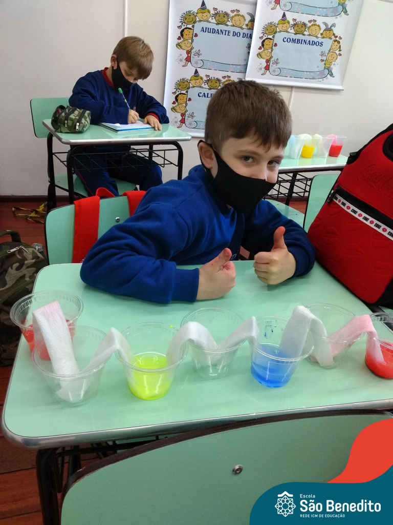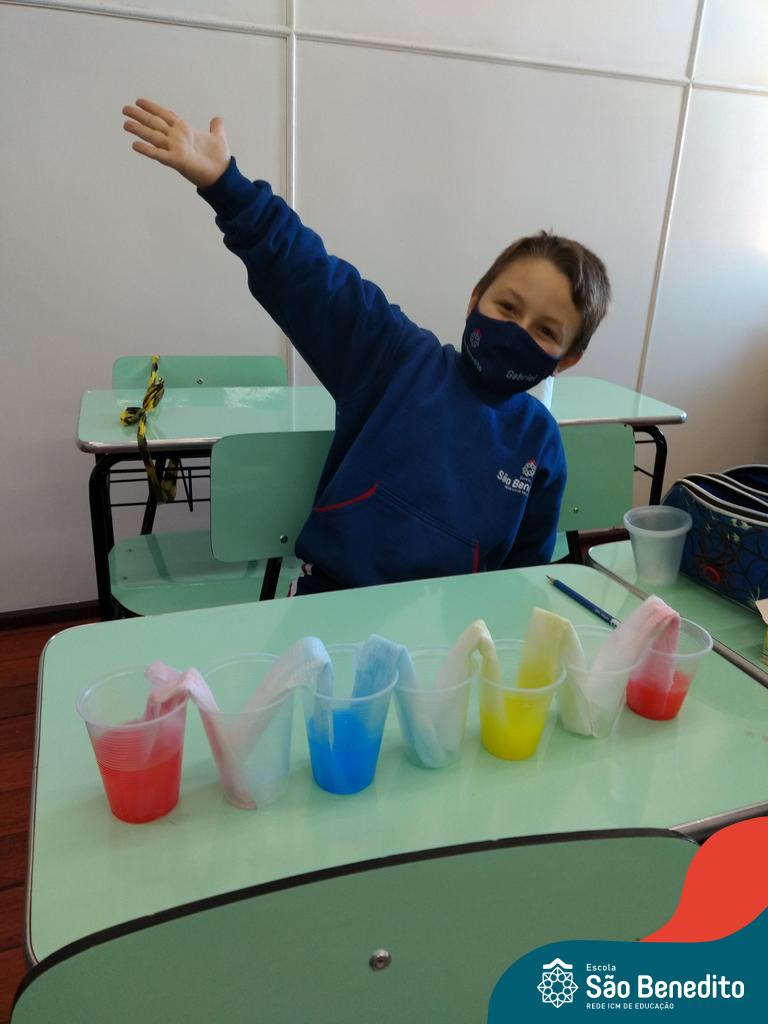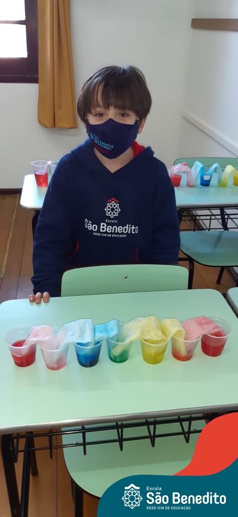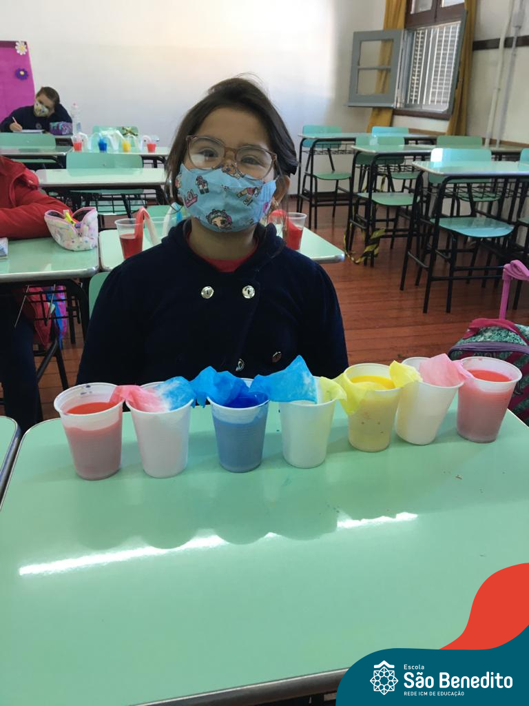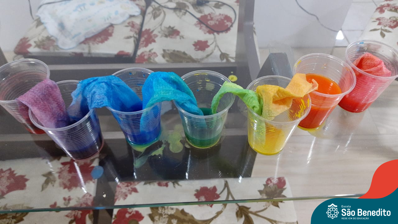 As cores podem ser muito fascinantes, principalmente, quando sabemos o que há por trás delas. Os alunos, em um estudo das cores primárias e secundárias, realizaram uma experiência envolvendo copos plásticos, tintas e guardanapos. Montando o experimento, foi possível identificar que pela junção das cores primárias, surgem as secundárias. Todos ficaram muito impressionados!