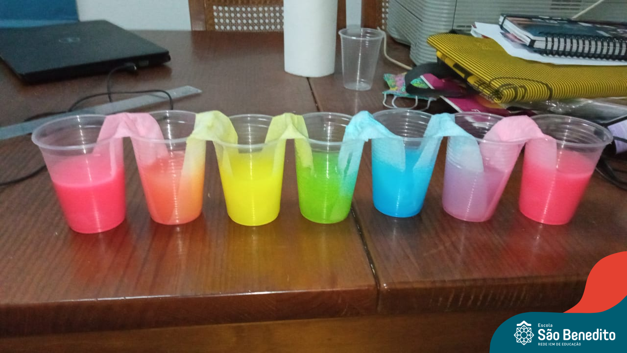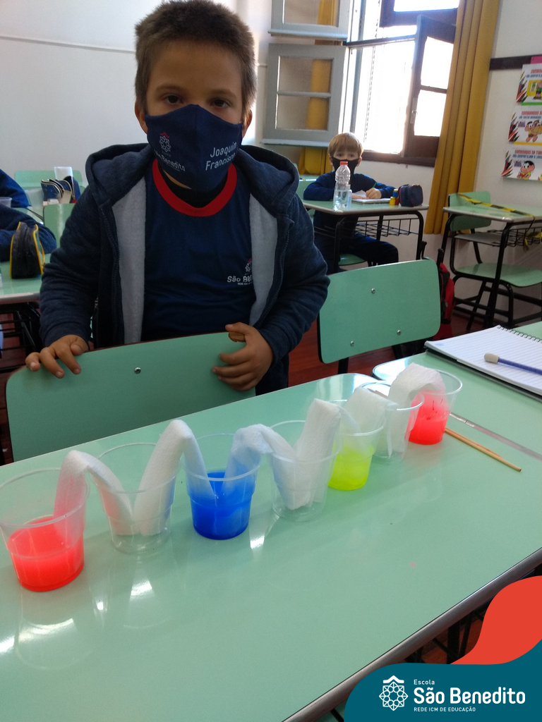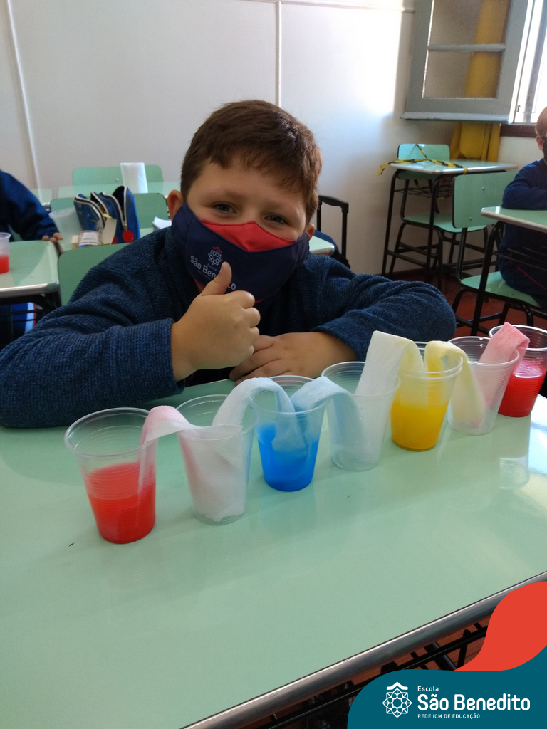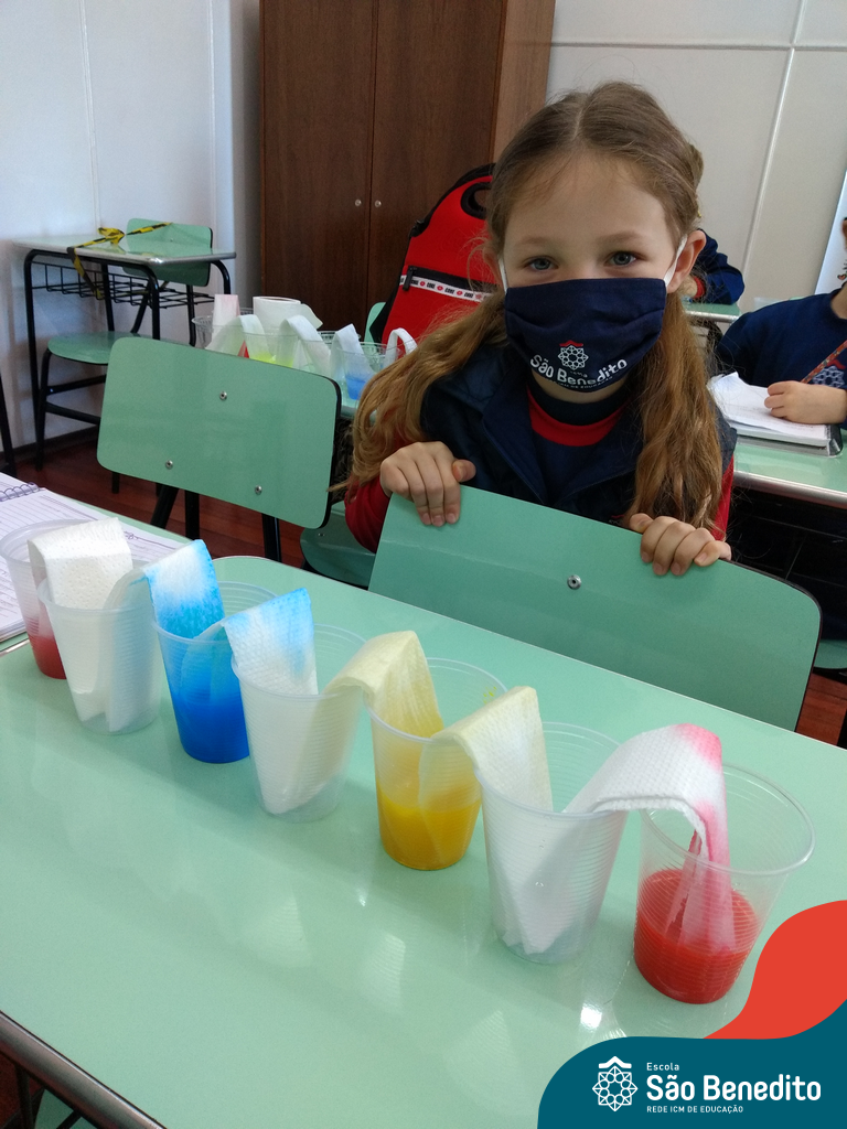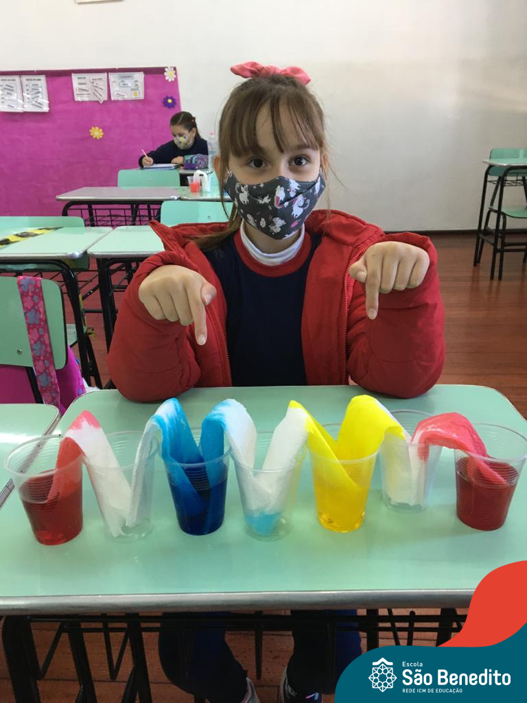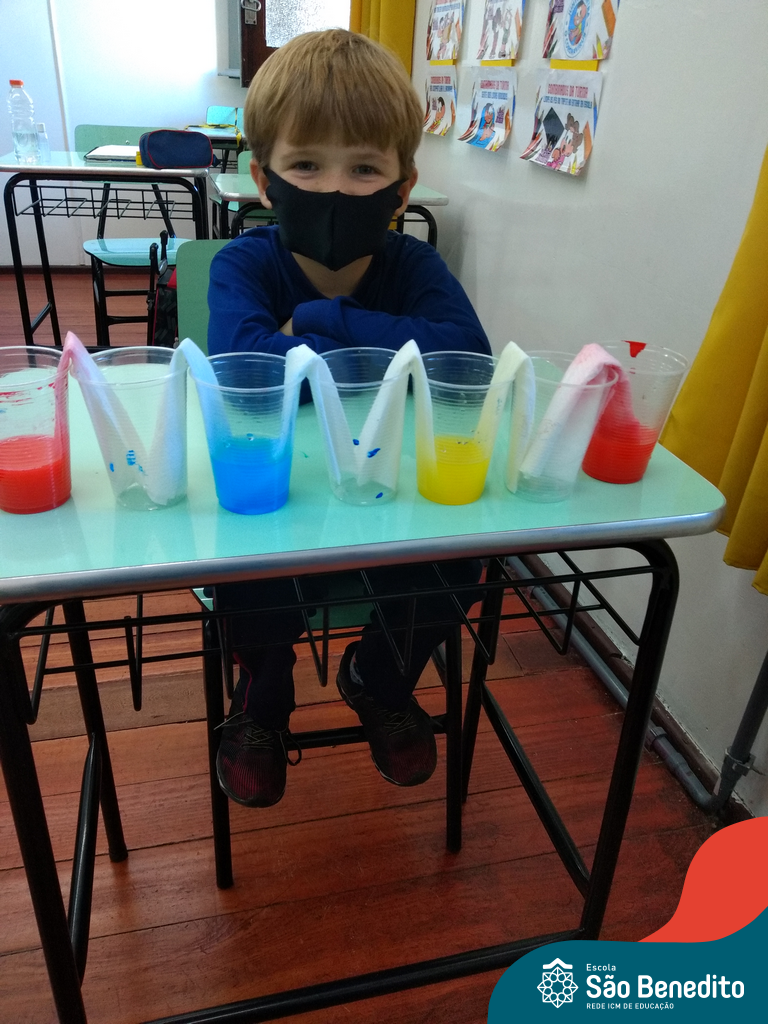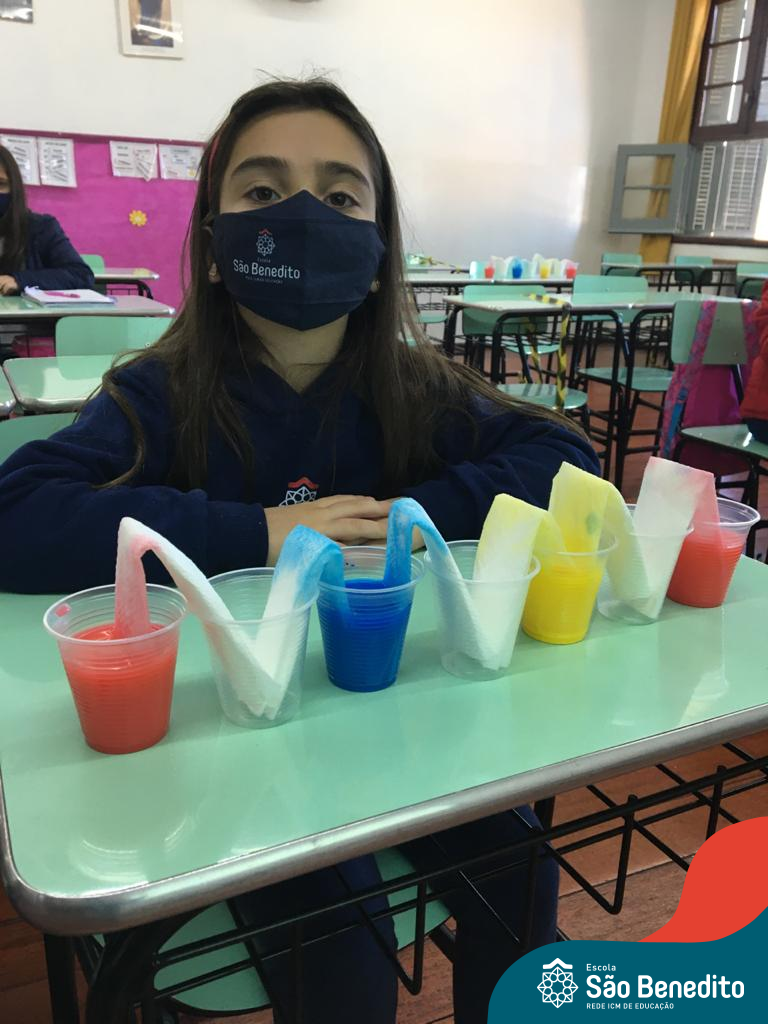 As cores podem ser muito fascinantes, principalmente, quando sabemos o que há por trás delas. Os alunos, em um estudo das cores primárias e secundárias, realizaram uma experiência envolvendo copos plásticos, tintas e guardanapos. Montando o experimento, foi possível identificar que pela junção das cores primárias, surgem as secundárias. Todos ficaram muito impressionados!