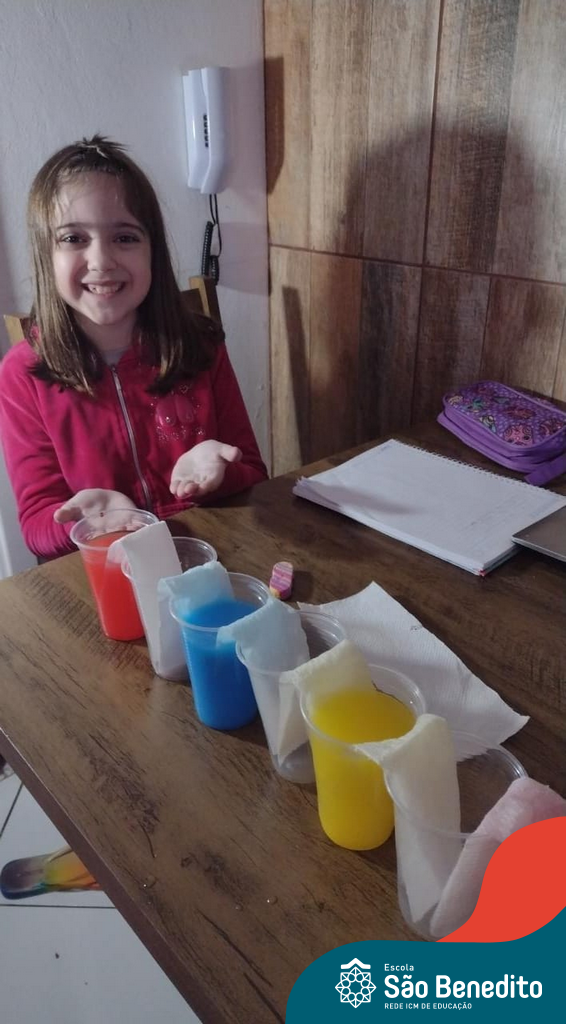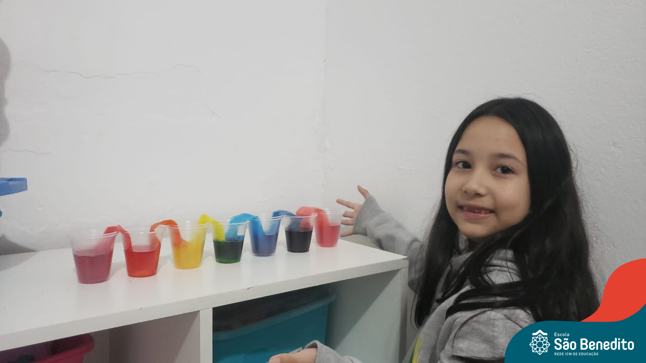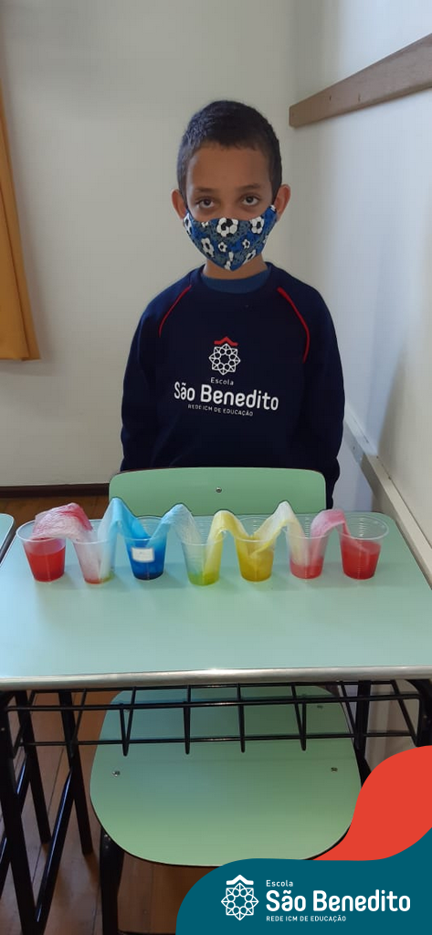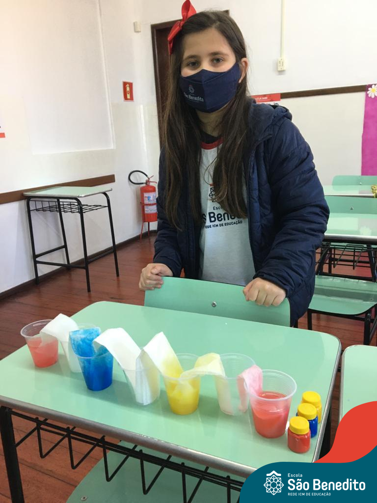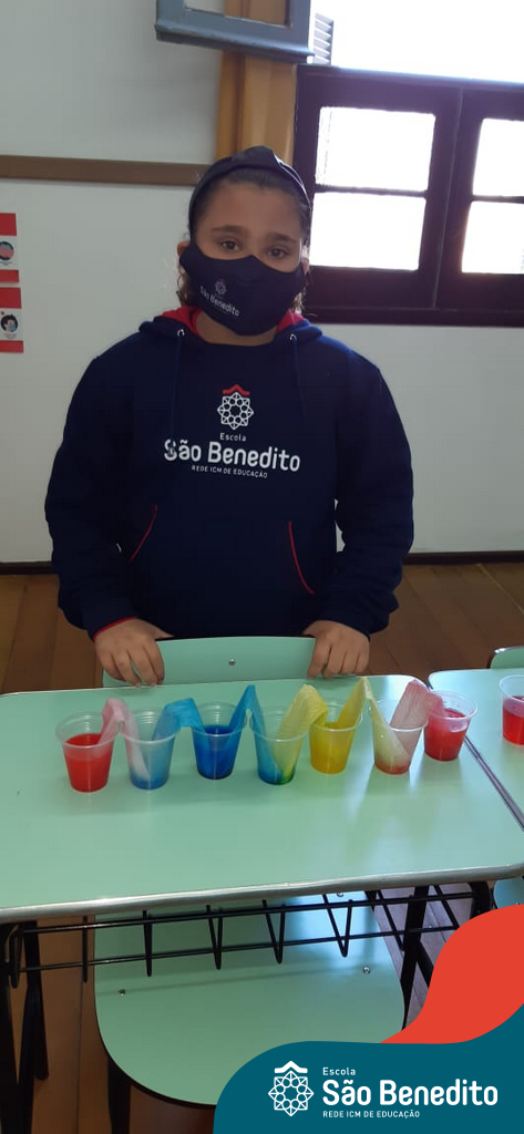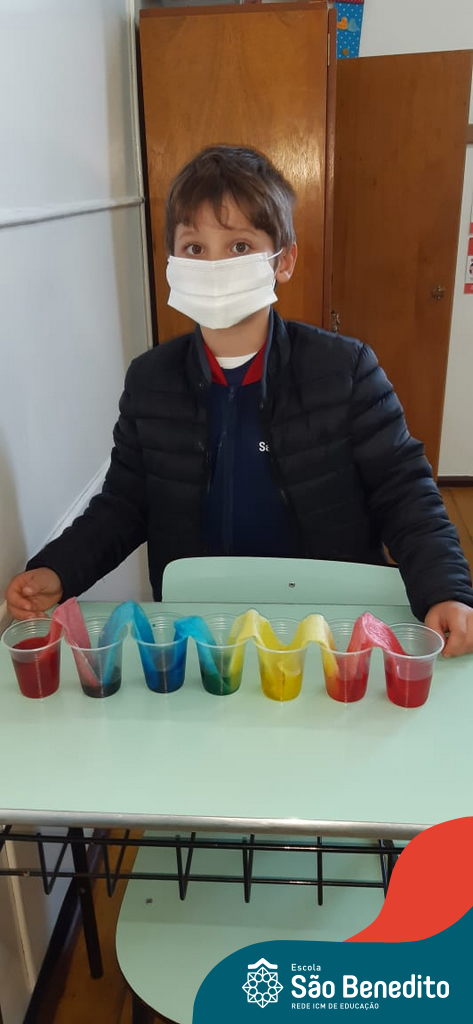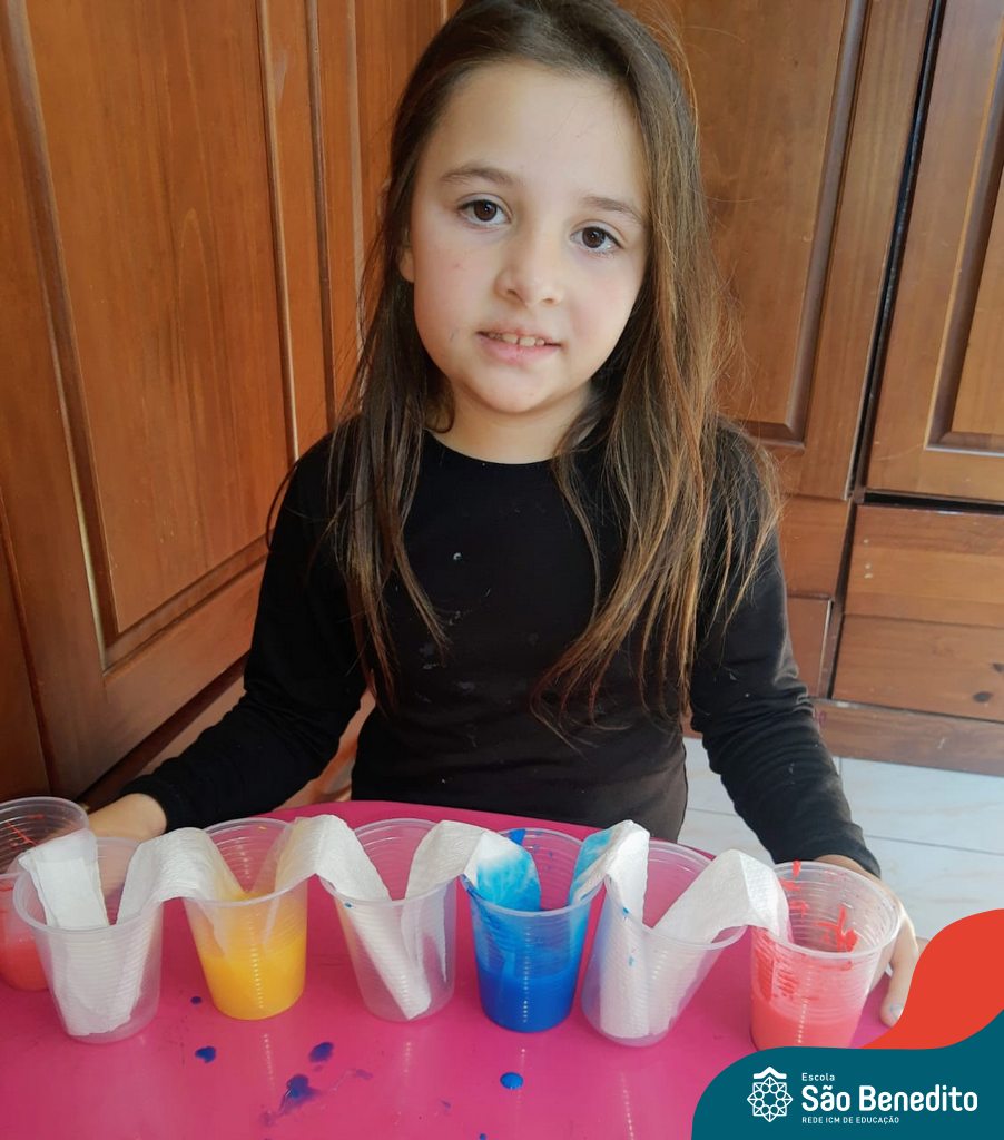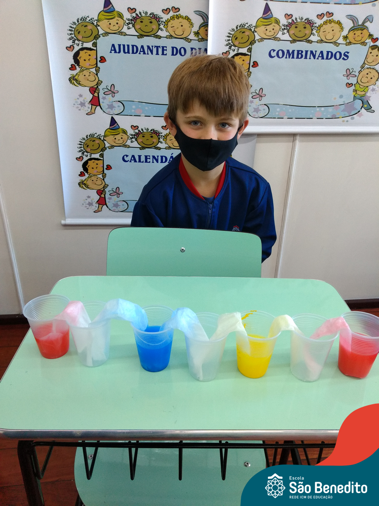 As cores podem ser muito fascinantes, principalmente, quando sabemos o que há por trás delas. Os alunos, em um estudo das cores primárias e secundárias, realizaram uma experiência envolvendo copos plásticos, tintas e guardanapos. Montando o experimento, foi possível identificar que pela junção das cores primárias, surgem as secundárias. Todos ficaram muito impressionados!