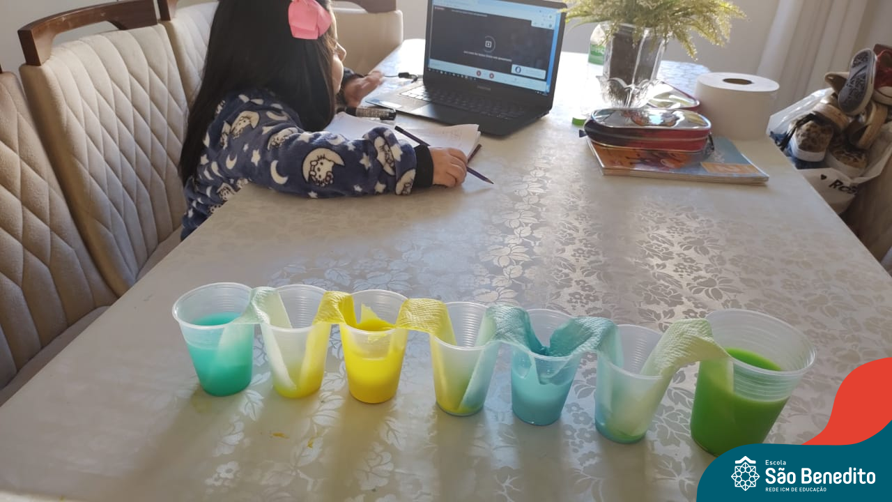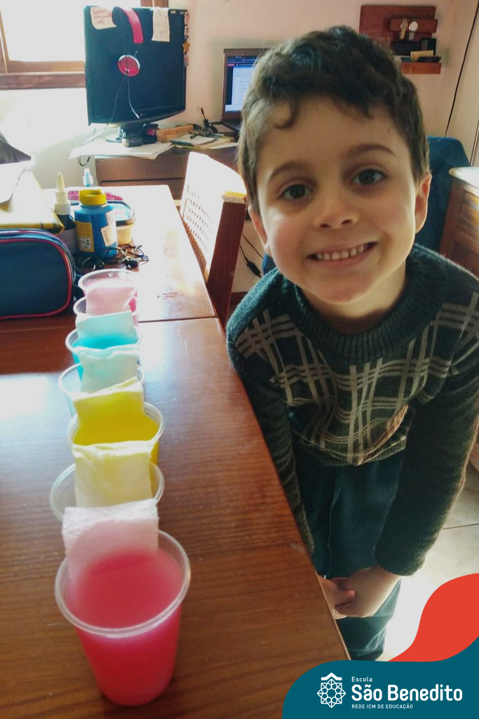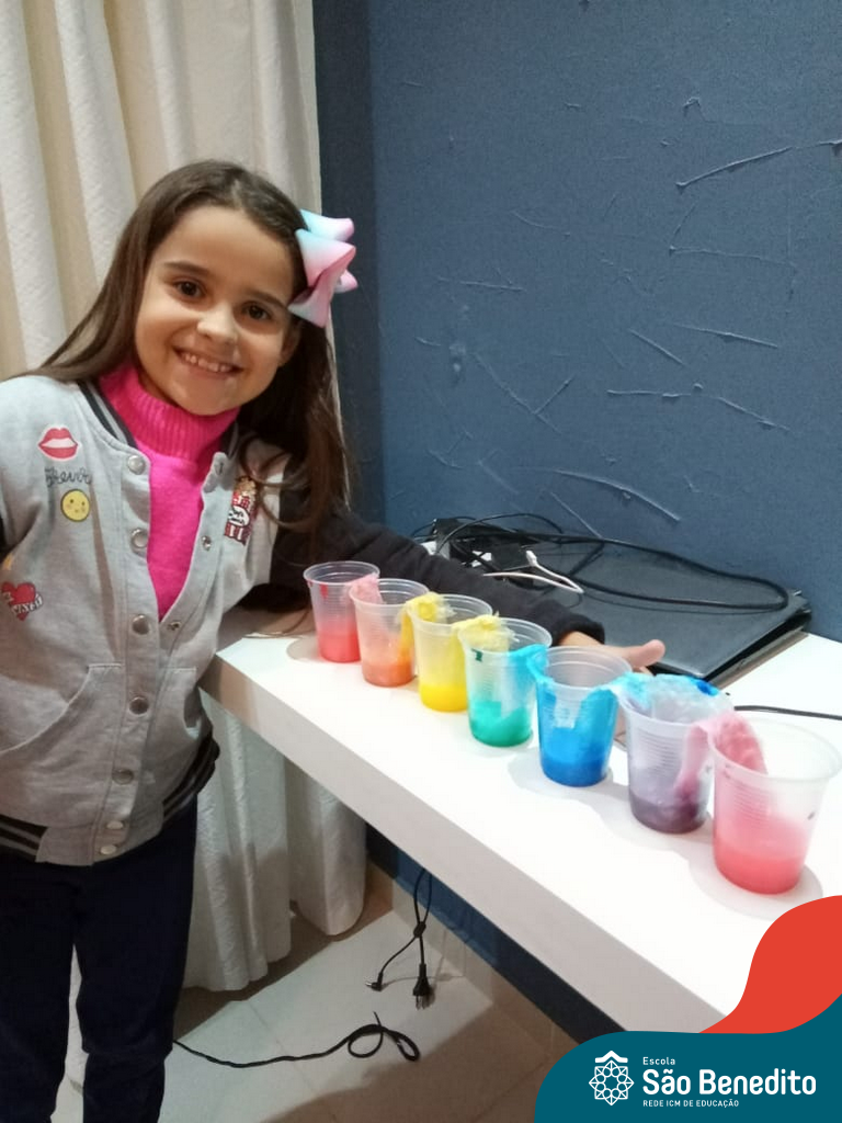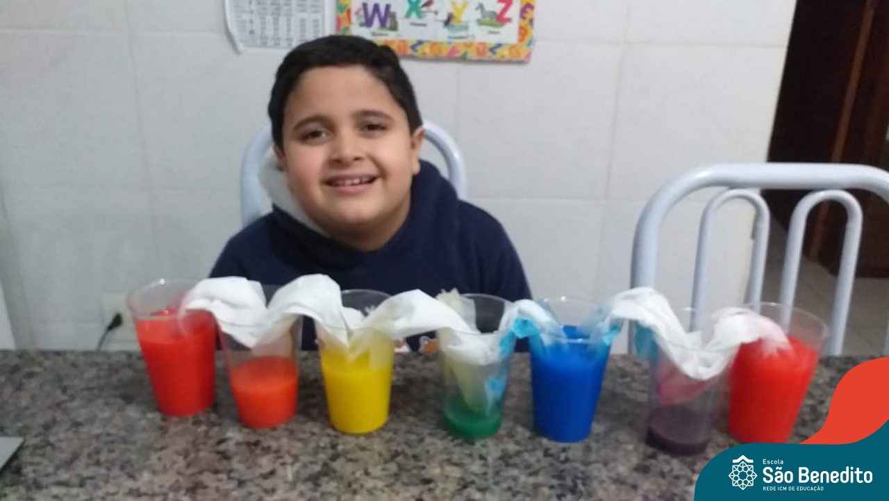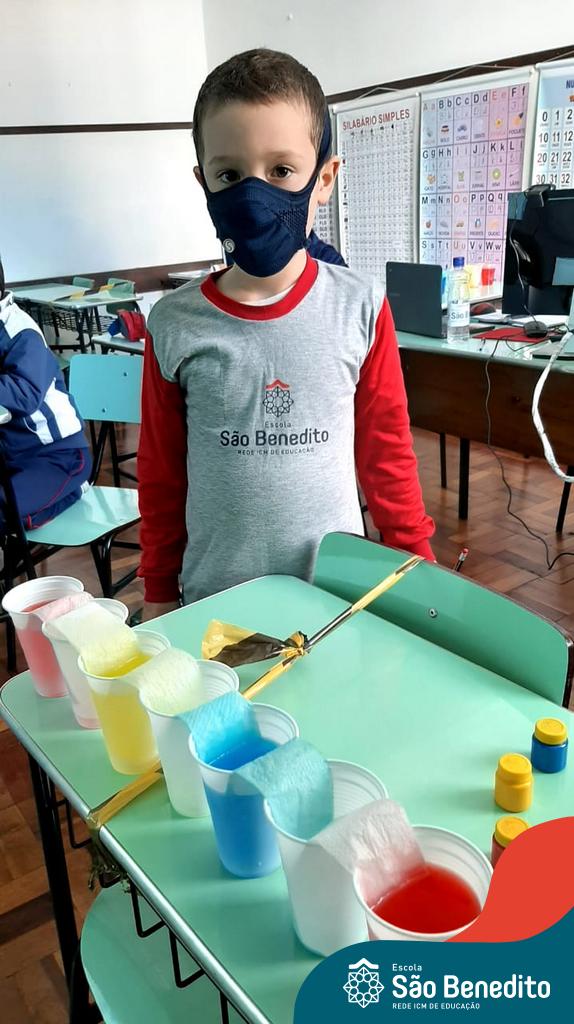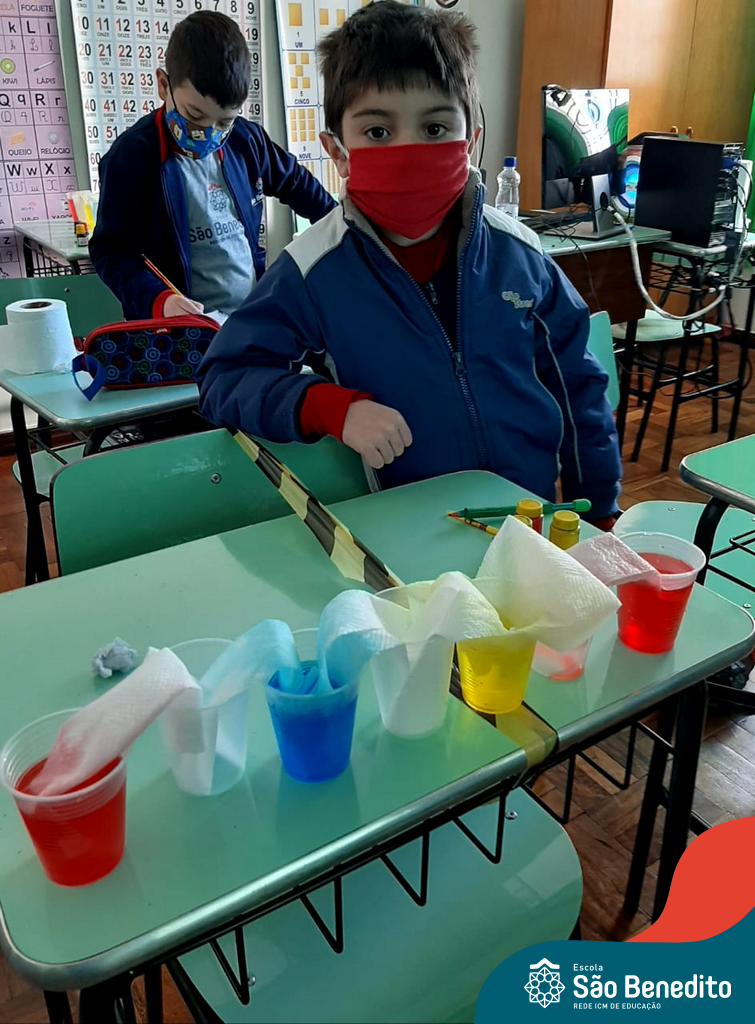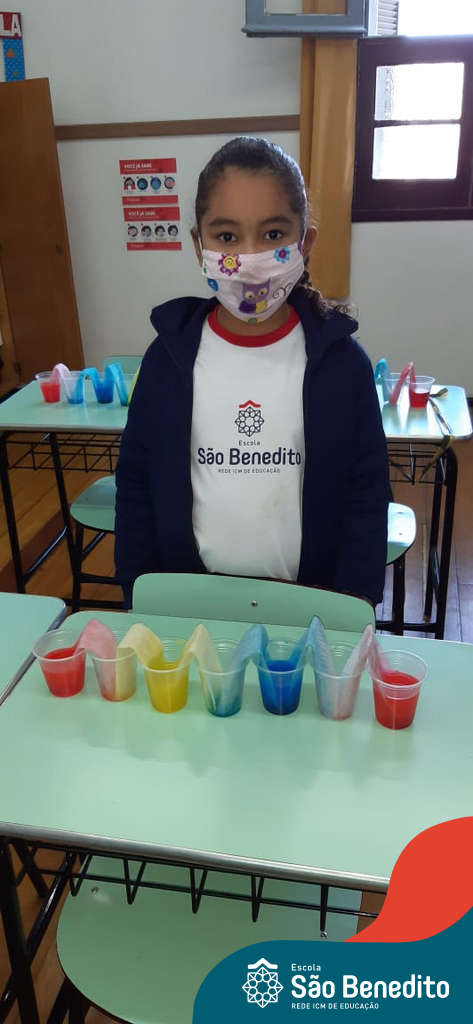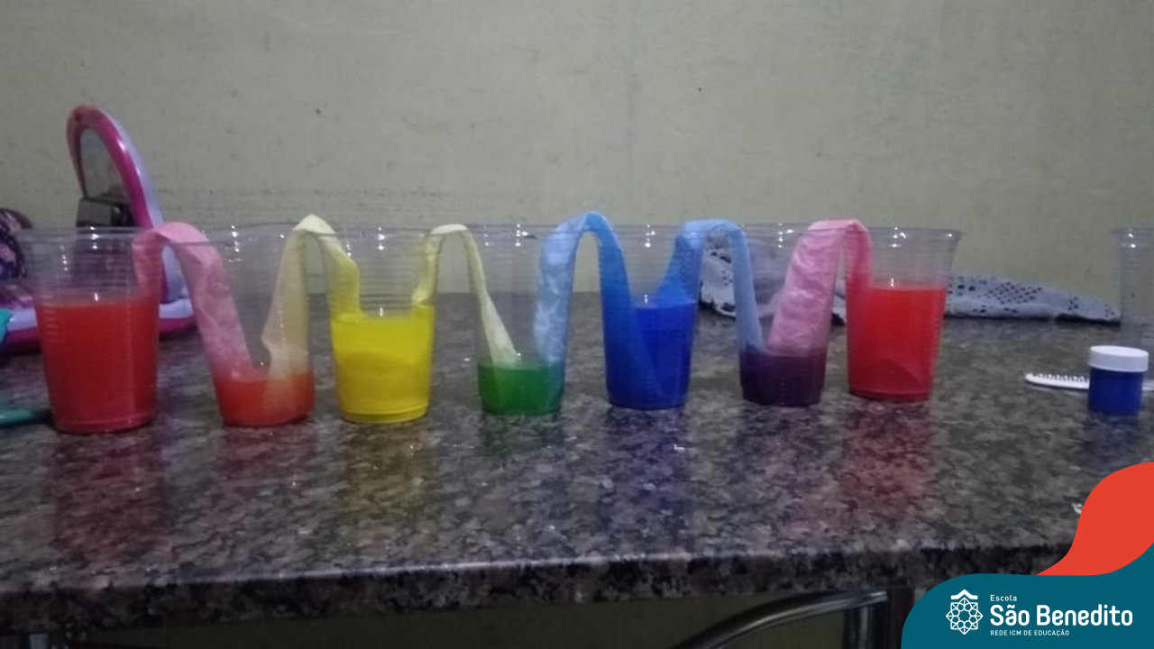 As cores podem ser muito fascinantes, principalmente, quando sabemos o que há por trás delas. Os alunos, em um estudo das cores primárias e secundárias, realizaram uma experiência envolvendo copos plásticos, tintas e guardanapos. Montando o experimento, foi possível identificar que pela junção das cores primárias, surgem as secundárias. Todos ficaram muito impressionados!
