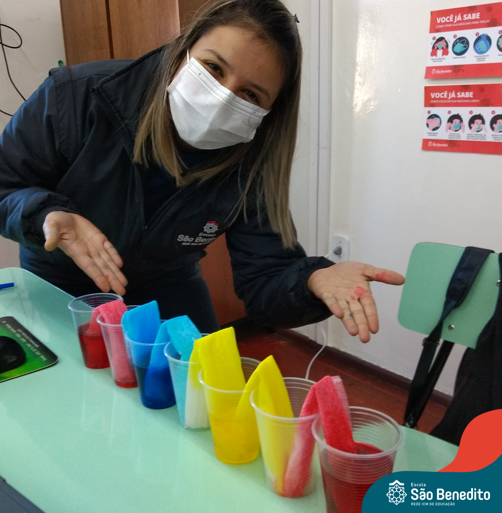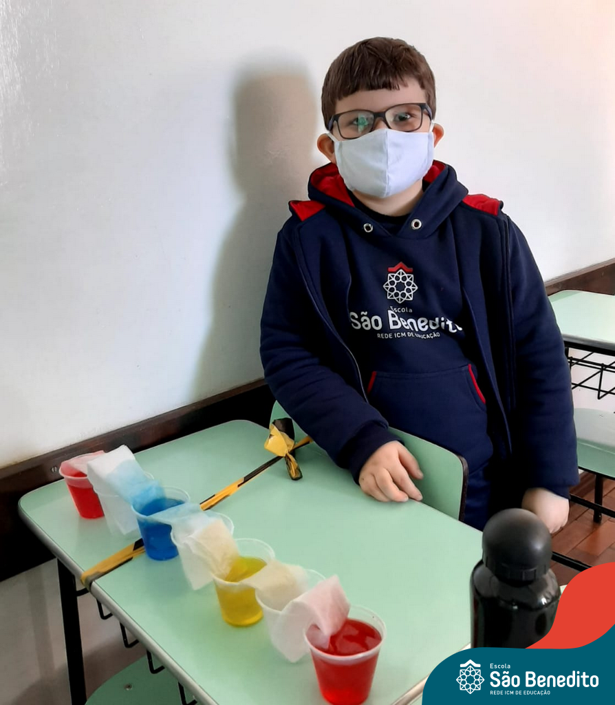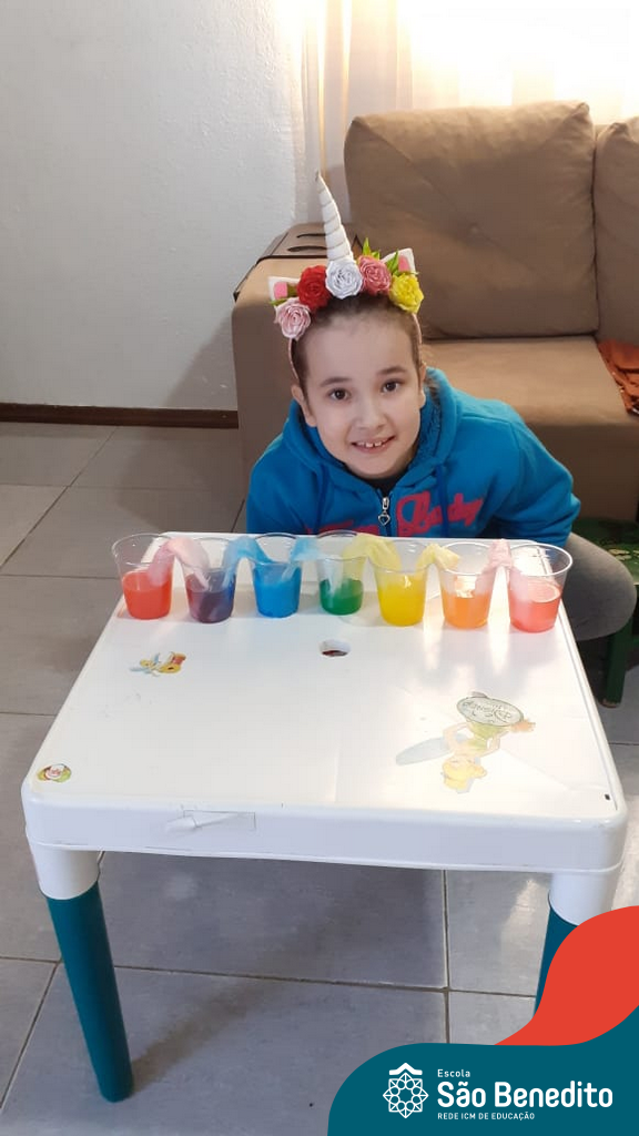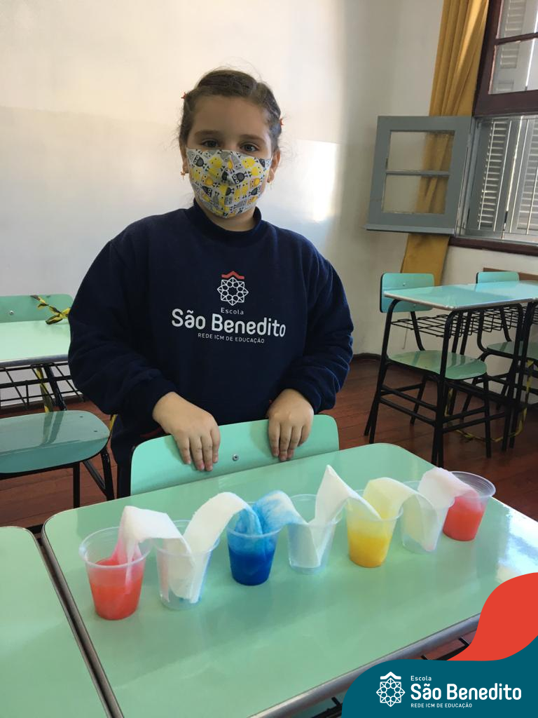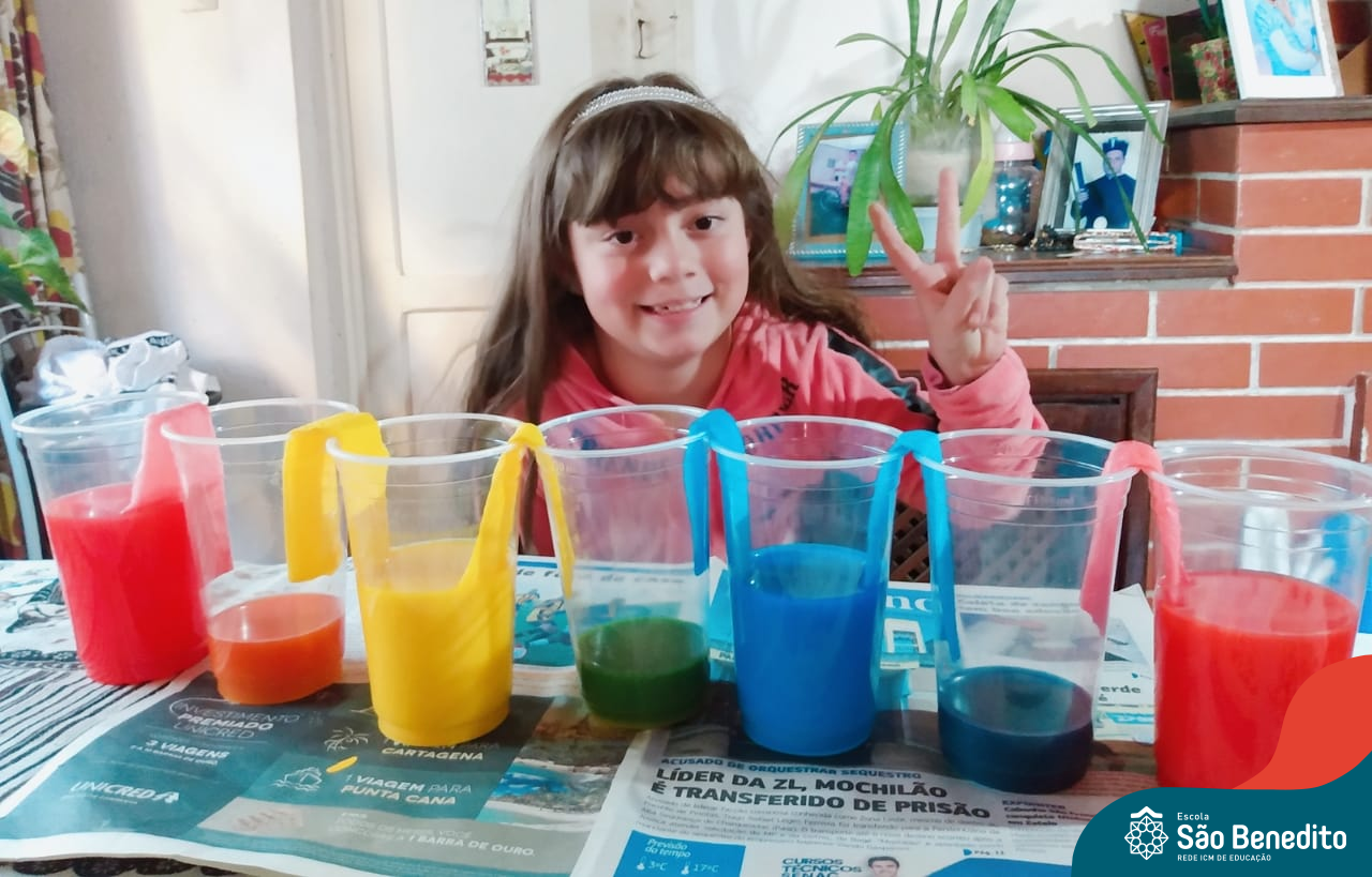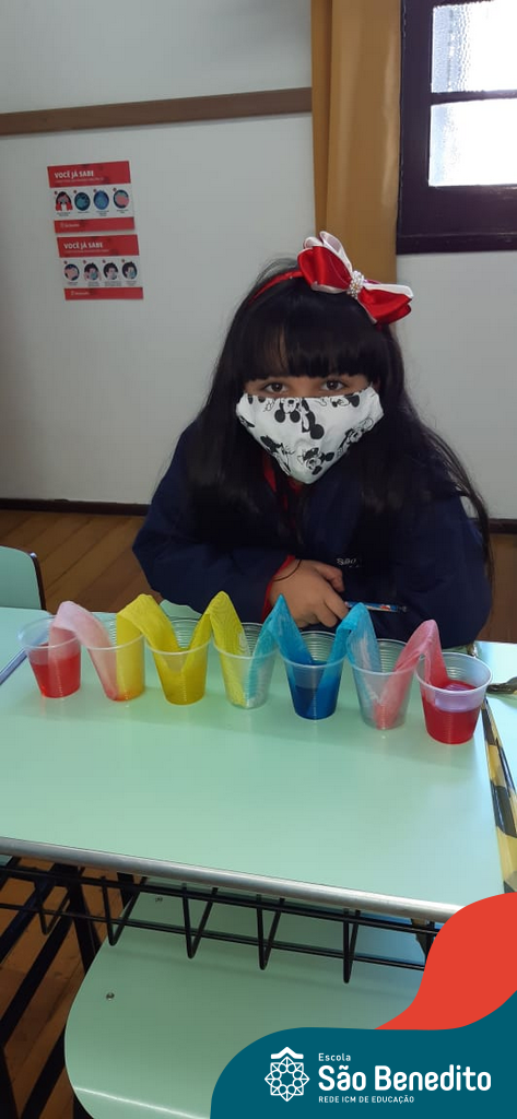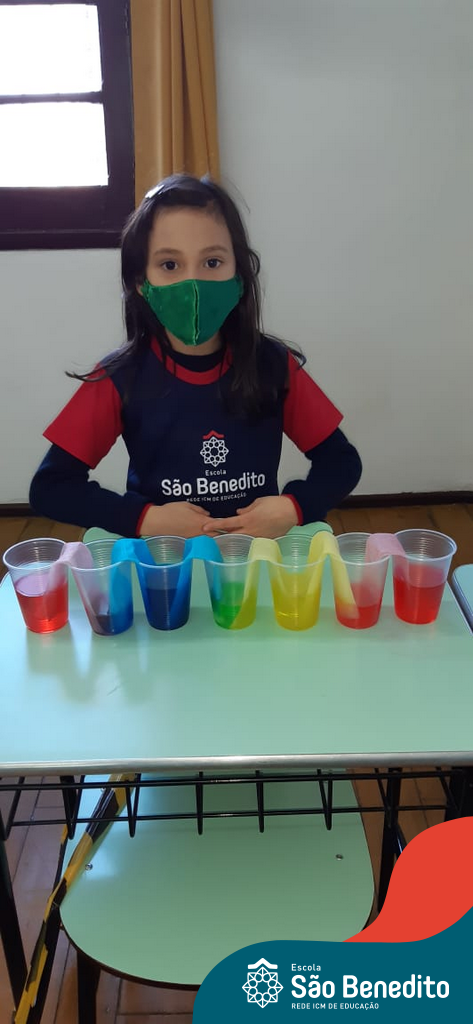As cores podem ser muito fascinantes, principalmente, quando sabemos o que há por trás delas. Os alunos, em um estudo das cores primárias e secundárias, realizaram uma experiência envolvendo copos plásticos, tintas e guardanapos. Montando o experimento, foi possível identificar que pela junção das cores primárias, surgem as secundárias. Todos ficaram muito impressionados!