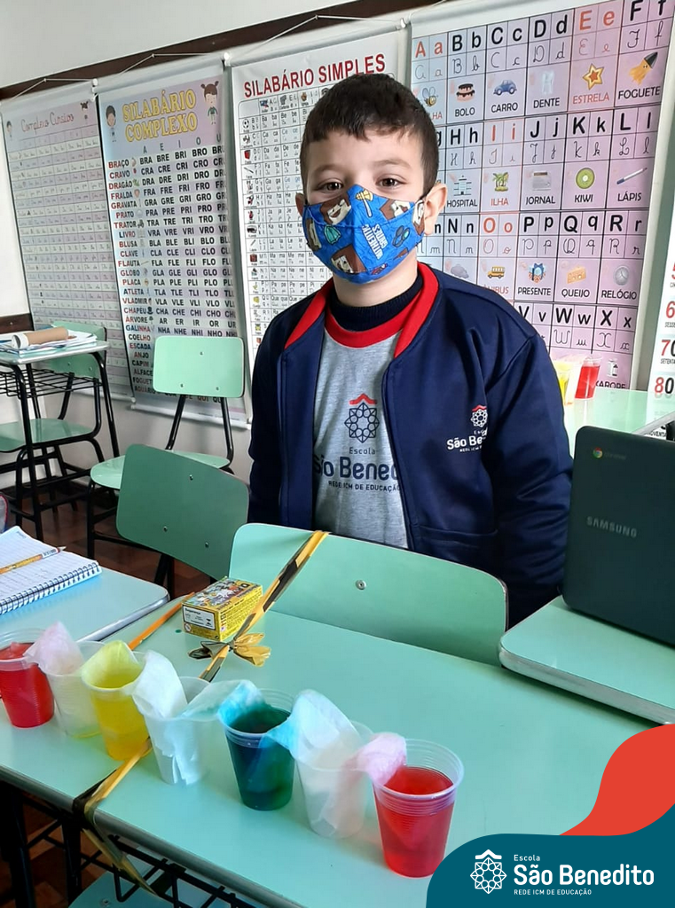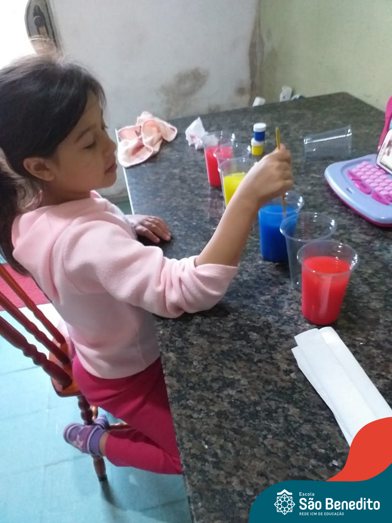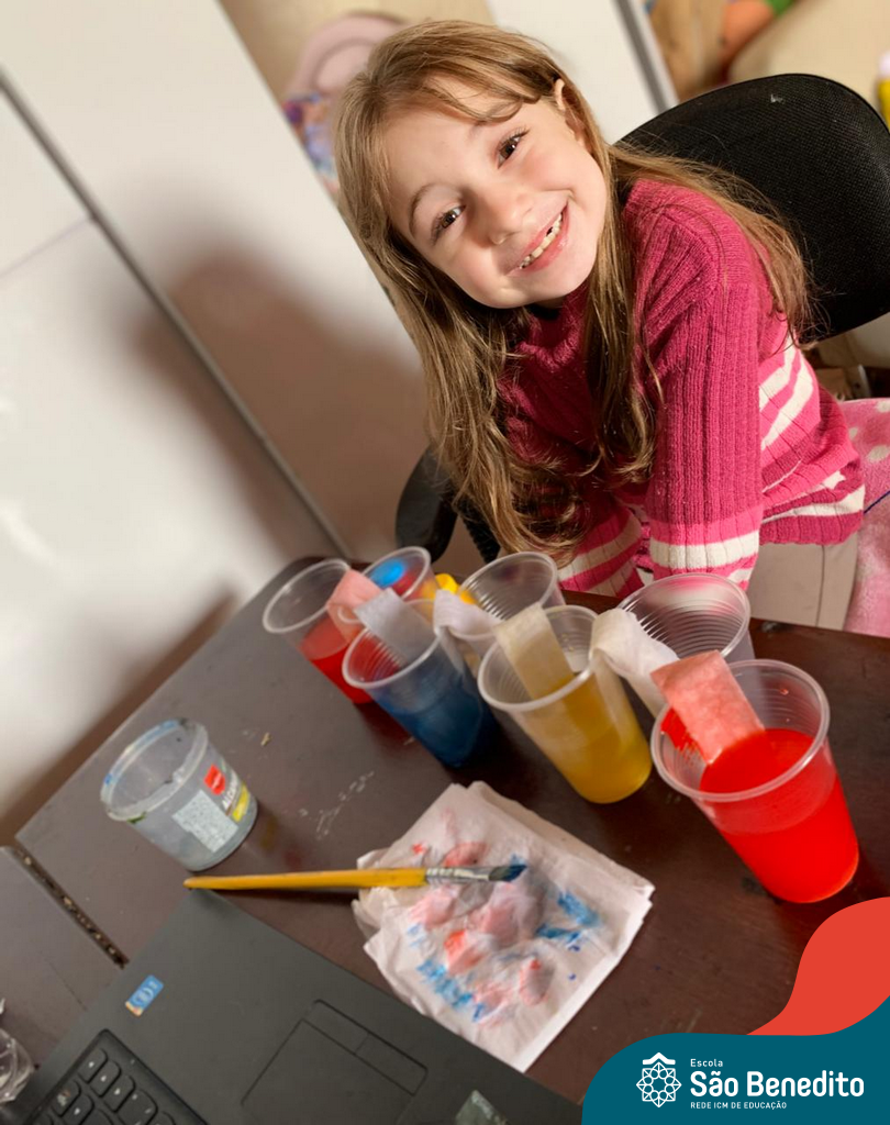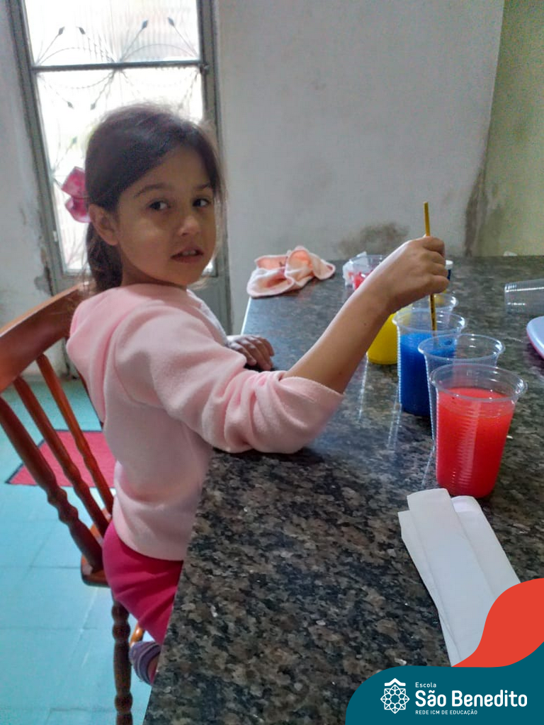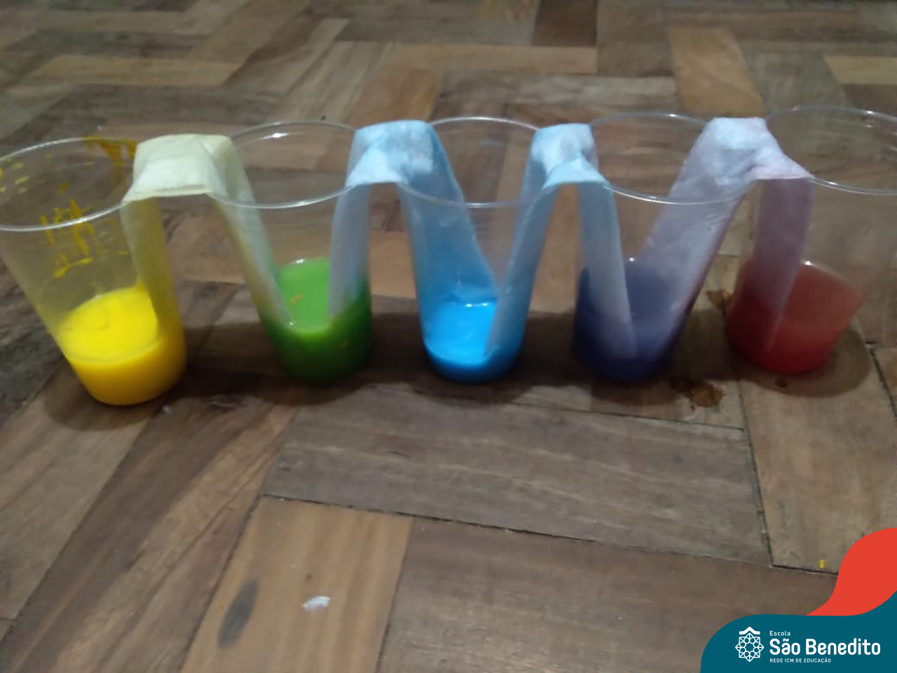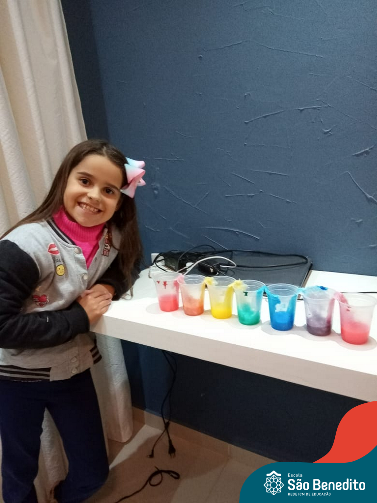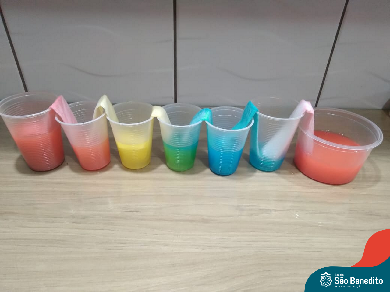 As cores podem ser muito fascinantes, principalmente, quando sabemos o que há por trás delas. Os alunos, em um estudo das cores primárias e secundárias, realizaram uma experiência envolvendo copos plásticos, tintas e guardanapos. Montando o experimento, foi possível identificar que pela junção das cores primárias, surgem as secundárias. Todos ficaram muito impressionados!