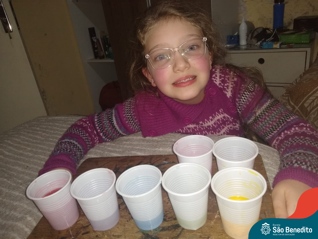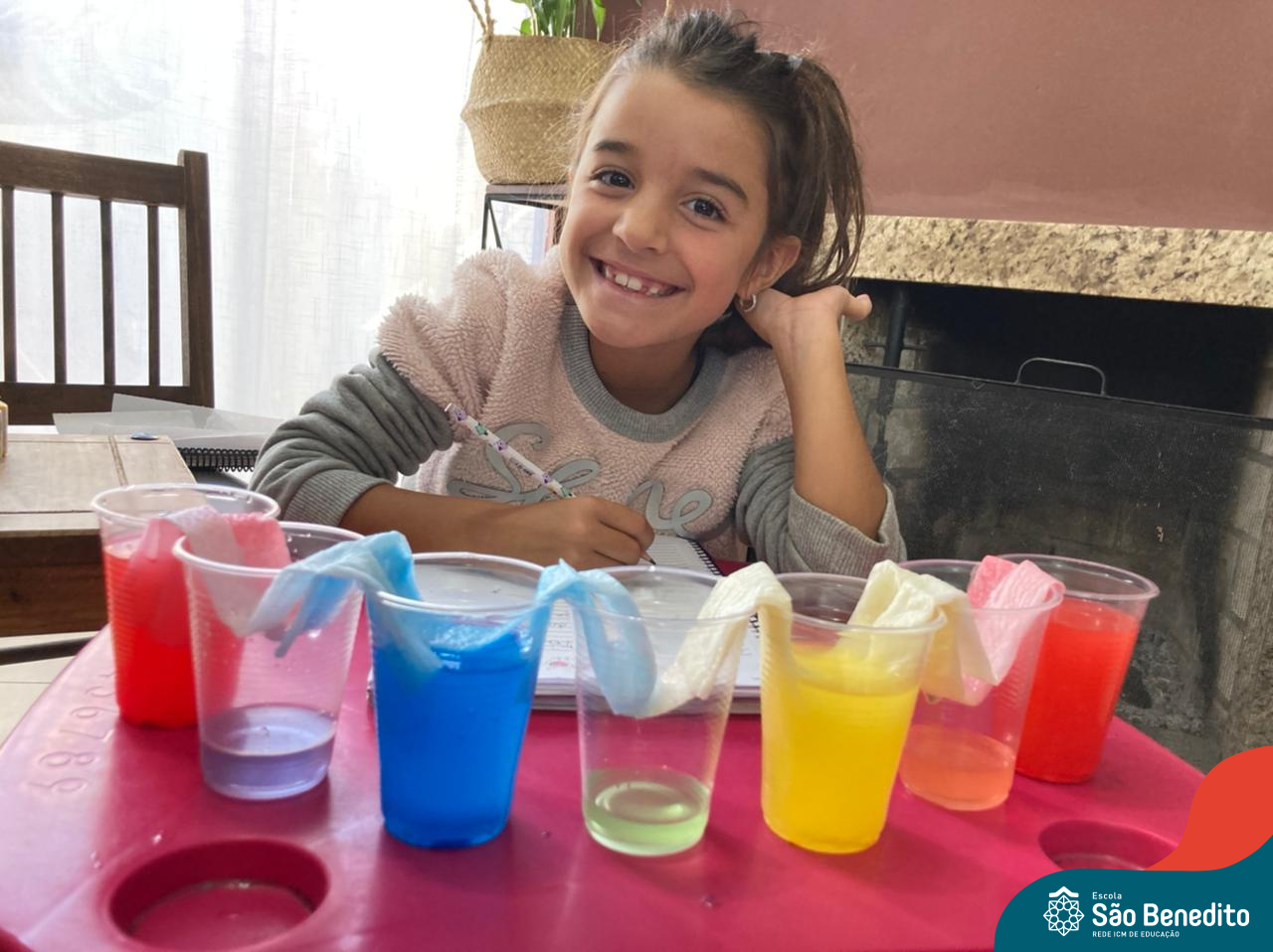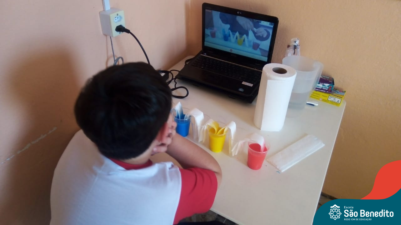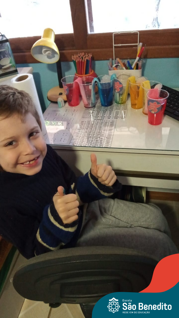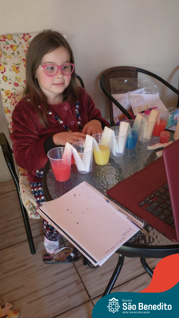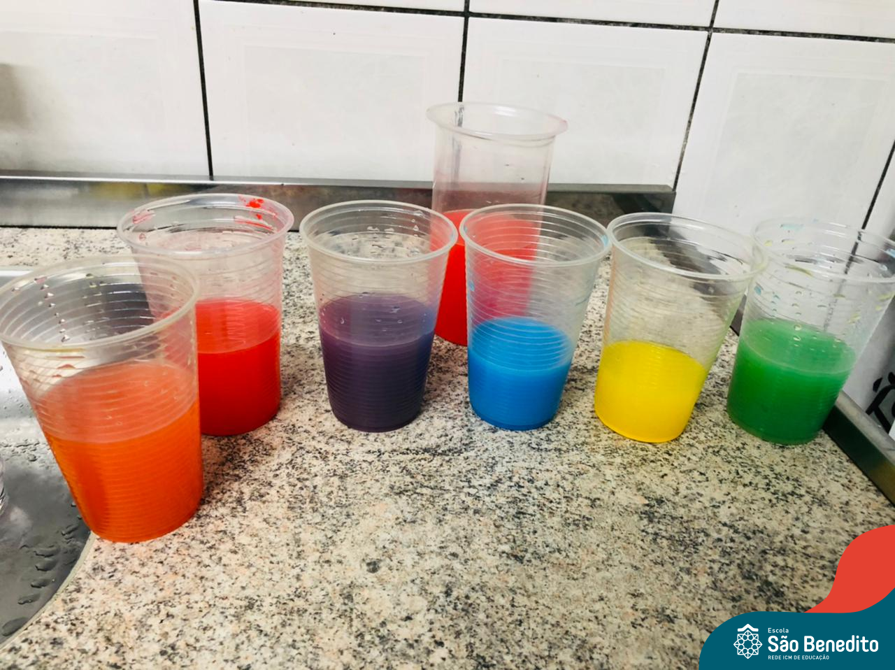 As cores podem ser muito fascinantes, principalmente, quando sabemos o que há por trás delas. Os alunos, em um estudo das cores primárias e secundárias, realizaram uma experiência envolvendo copos plásticos, tintas e guardanapos. Montando o experimento, foi possível identificar que pela junção das cores primárias, surgem as secundárias. Todos ficaram muito impressionados!
