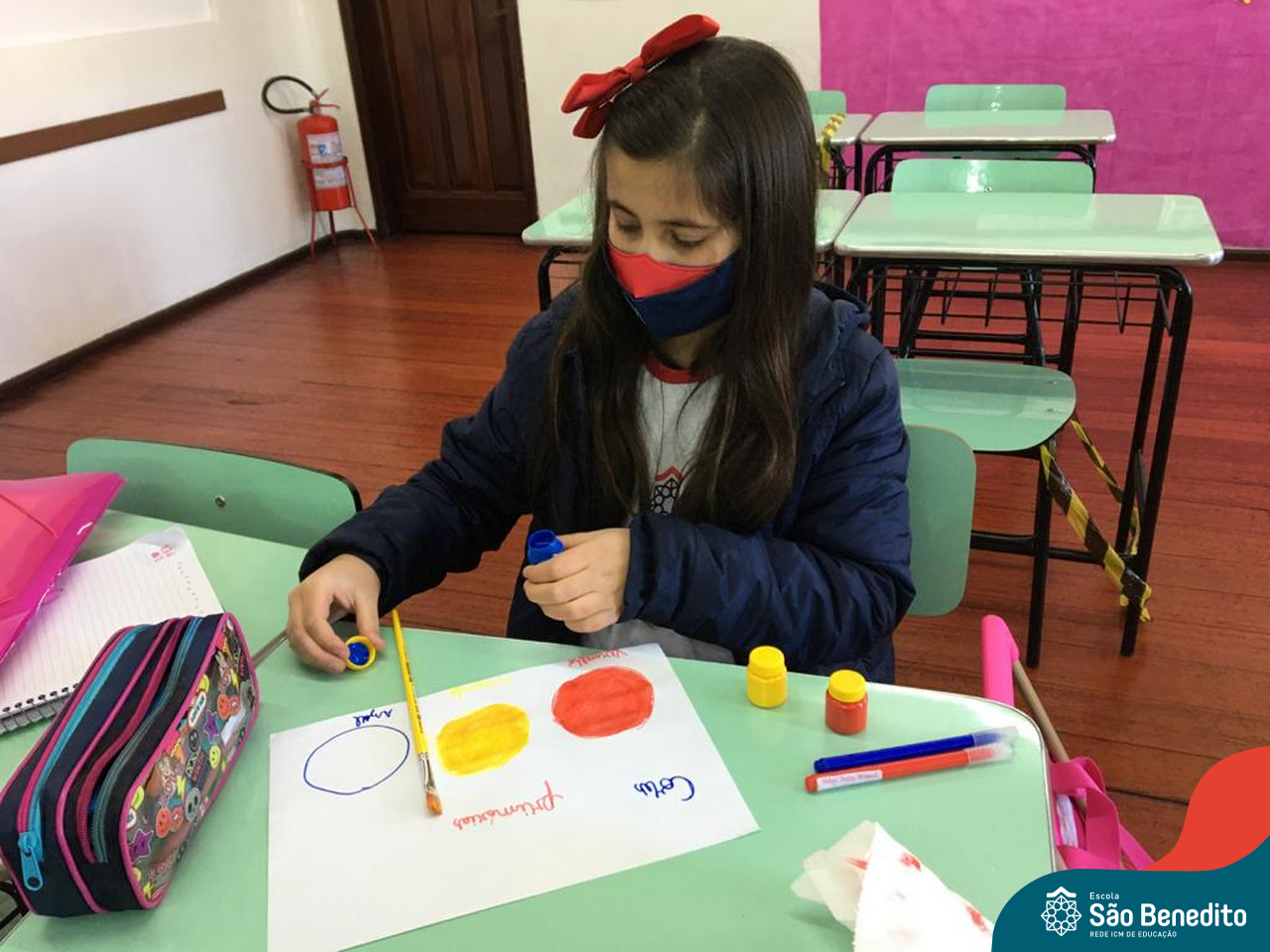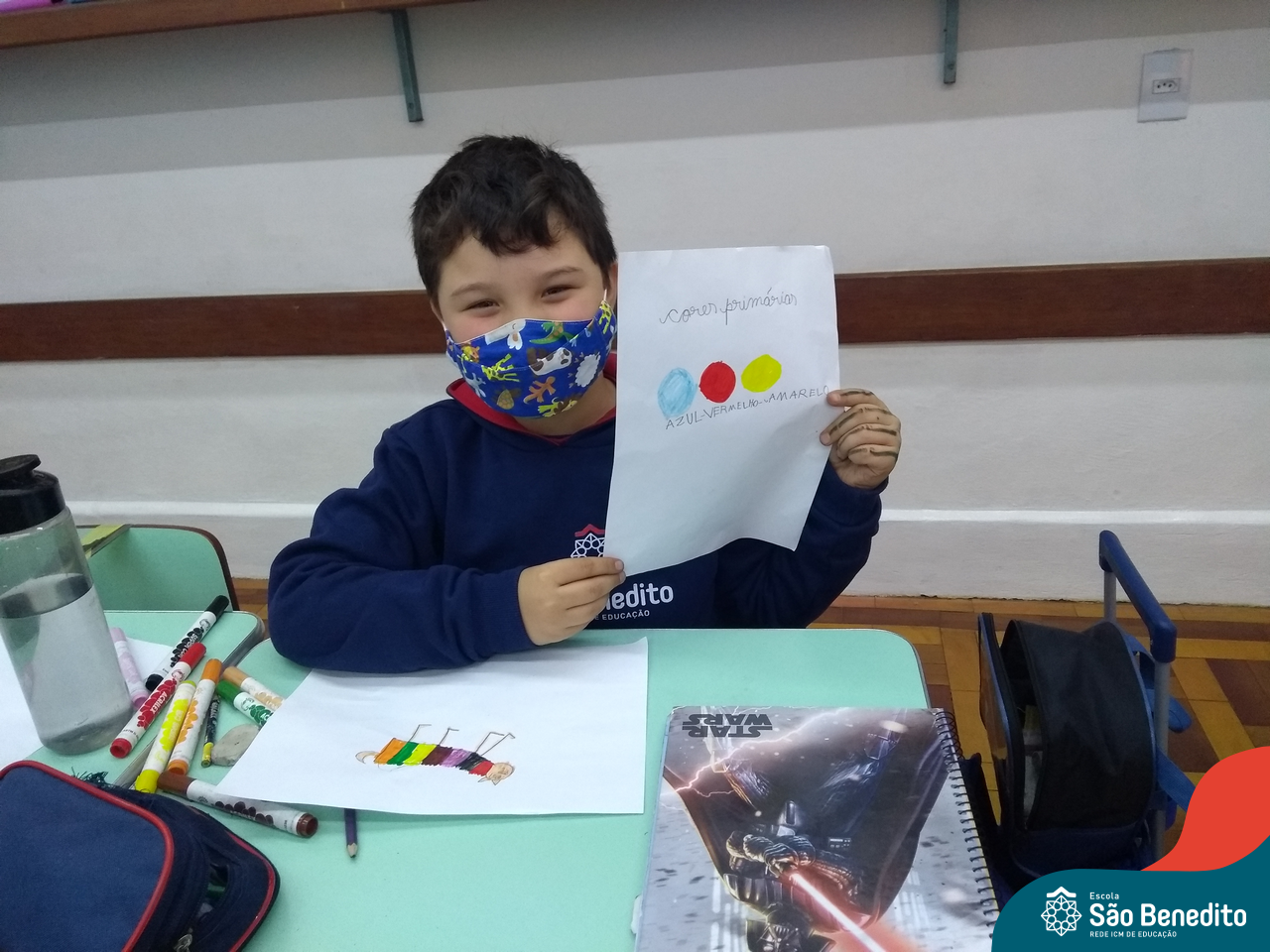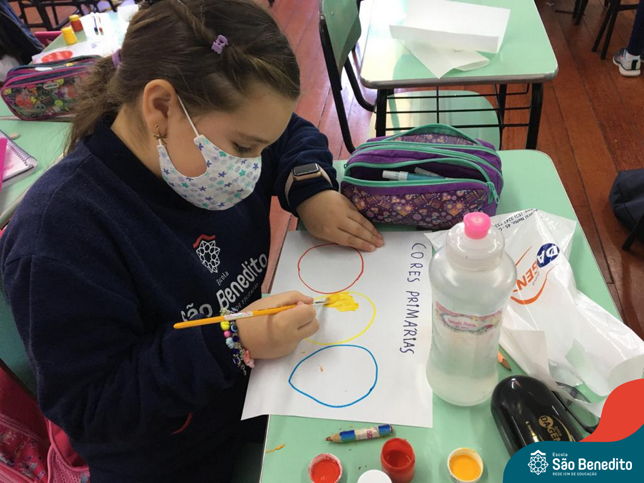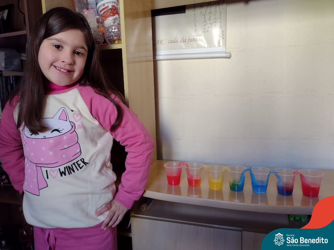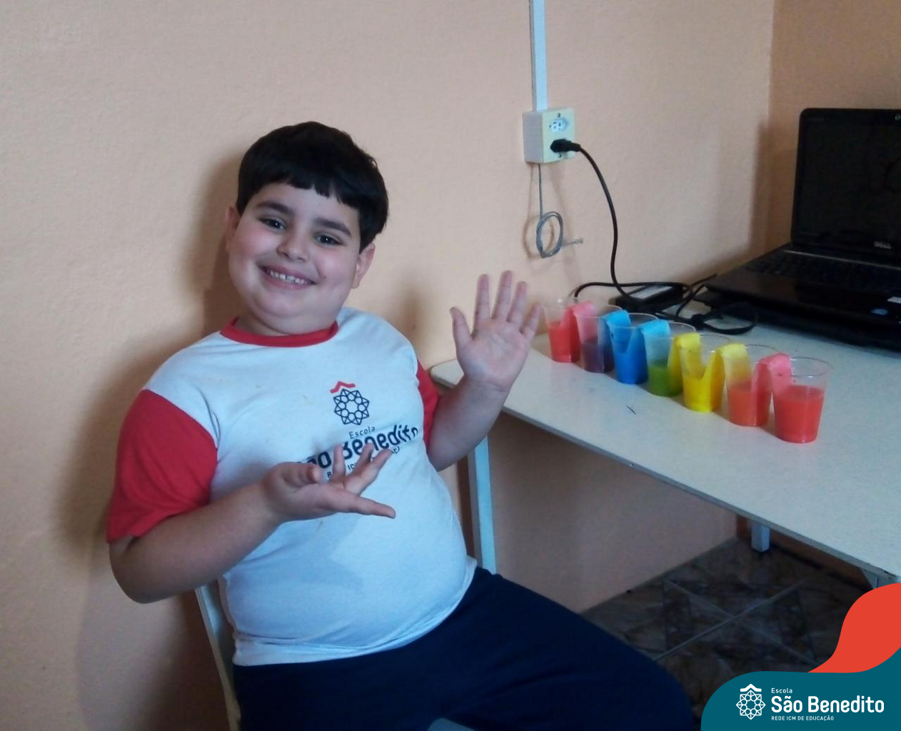 As cores podem ser muito fascinantes, principalmente, quando sabemos o que há por trás delas. Os alunos, em um estudo das cores primárias e secundárias, realizaram uma experiência envolvendo copos plásticos, tintas e guardanapos. Montando o experimento, foi possível identificar que pela junção das cores primárias, surgem as secundárias. Todos ficaram muito impressionados!