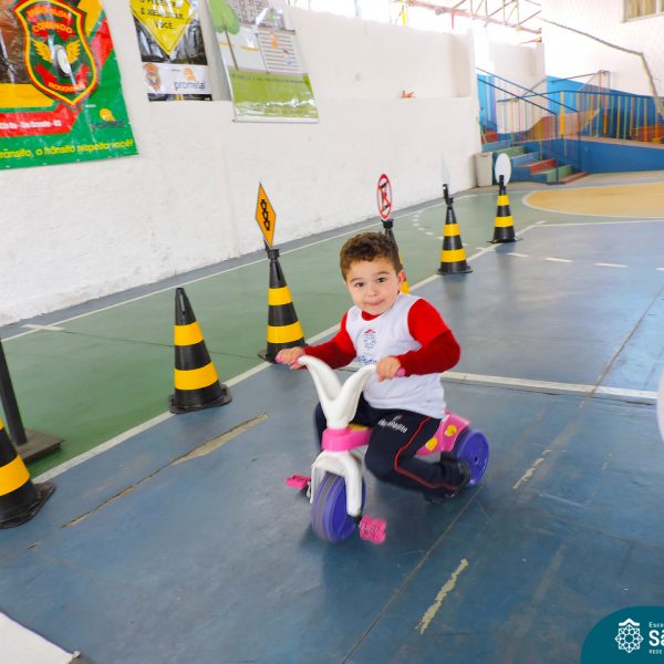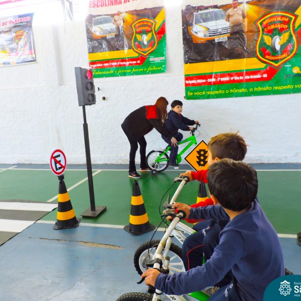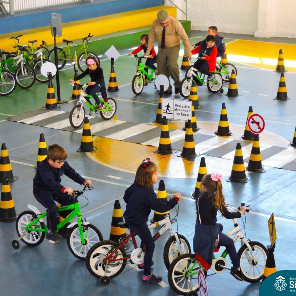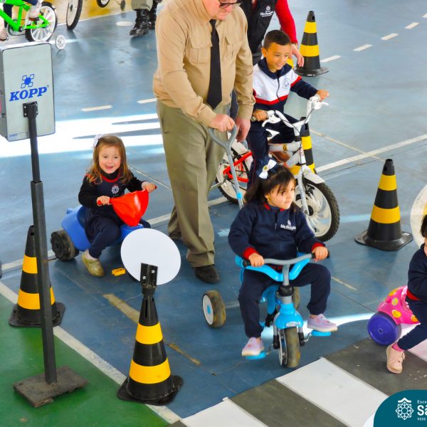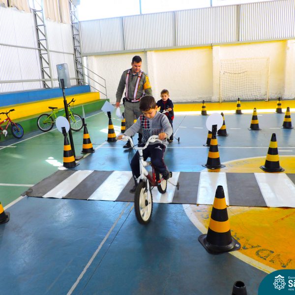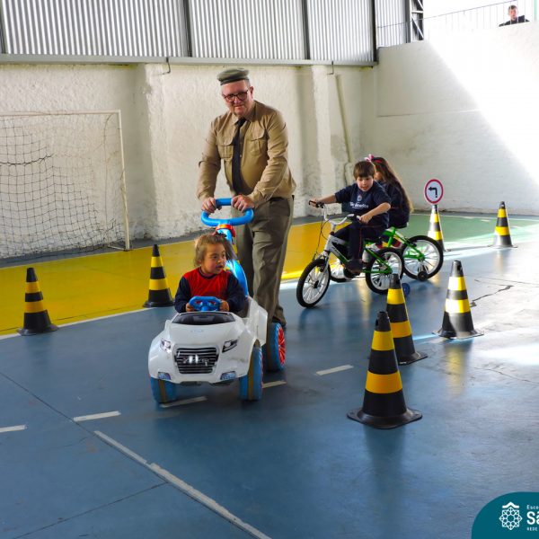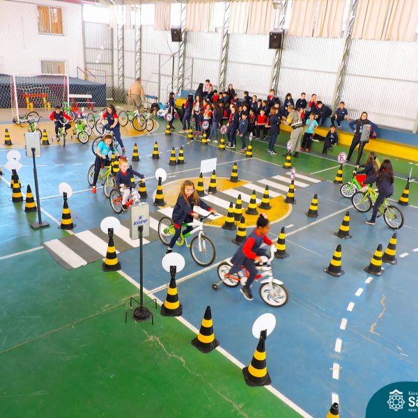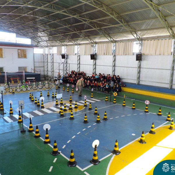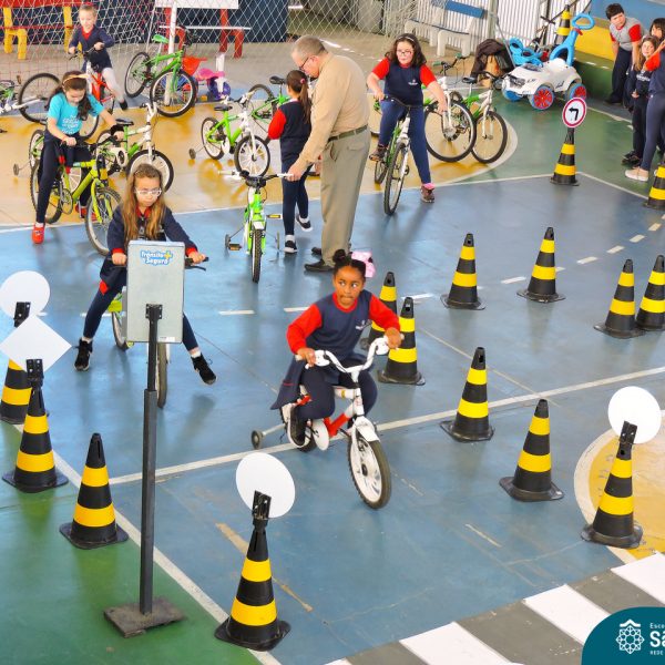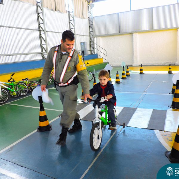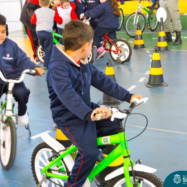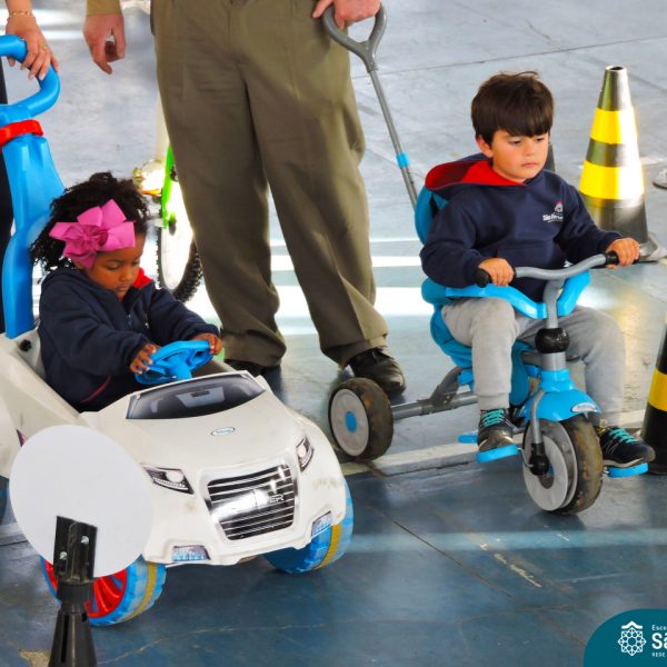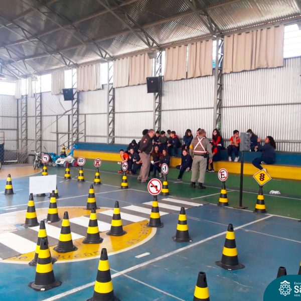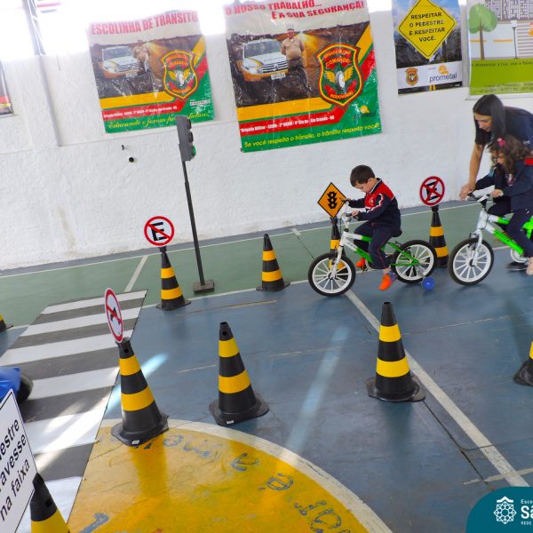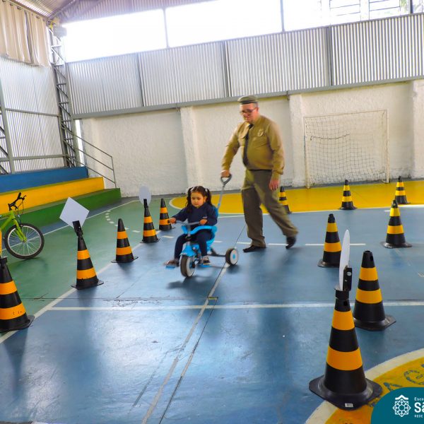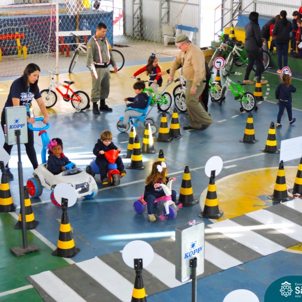 Os alunos da Educação Infantil até o 6º Ano, participaram de um circuito que simula o trânsito, que foi montado na quadra da Escola. Esse é o projeto “Escolinha de Trânsito”, do 2º BRBM.