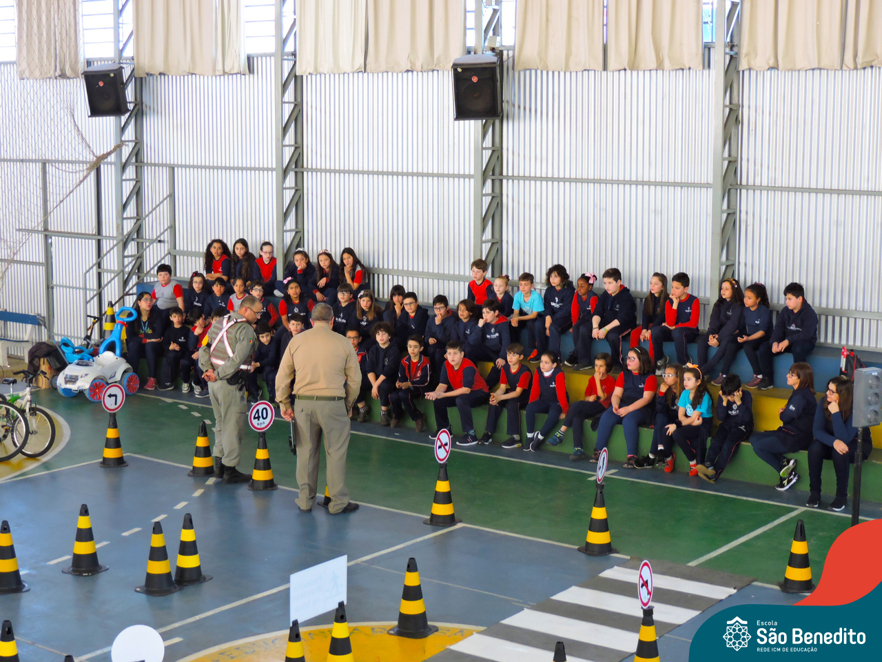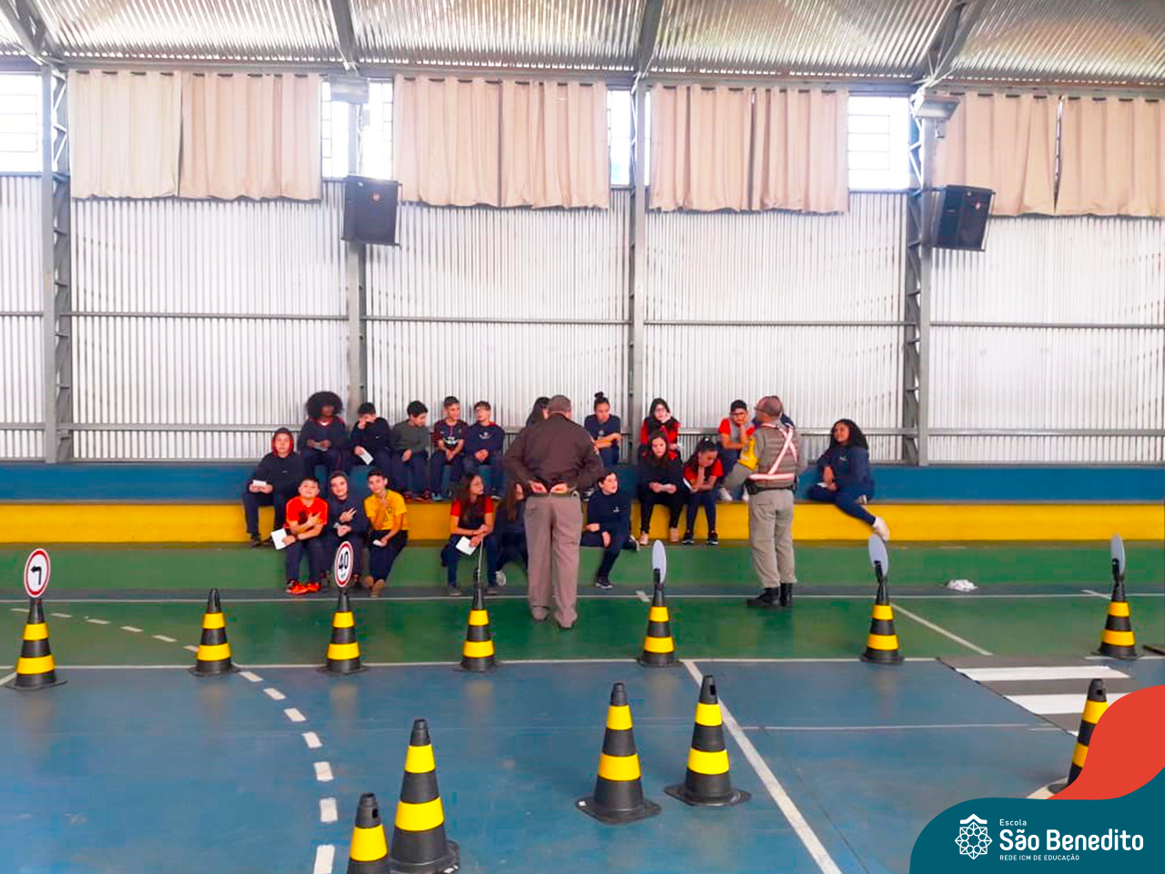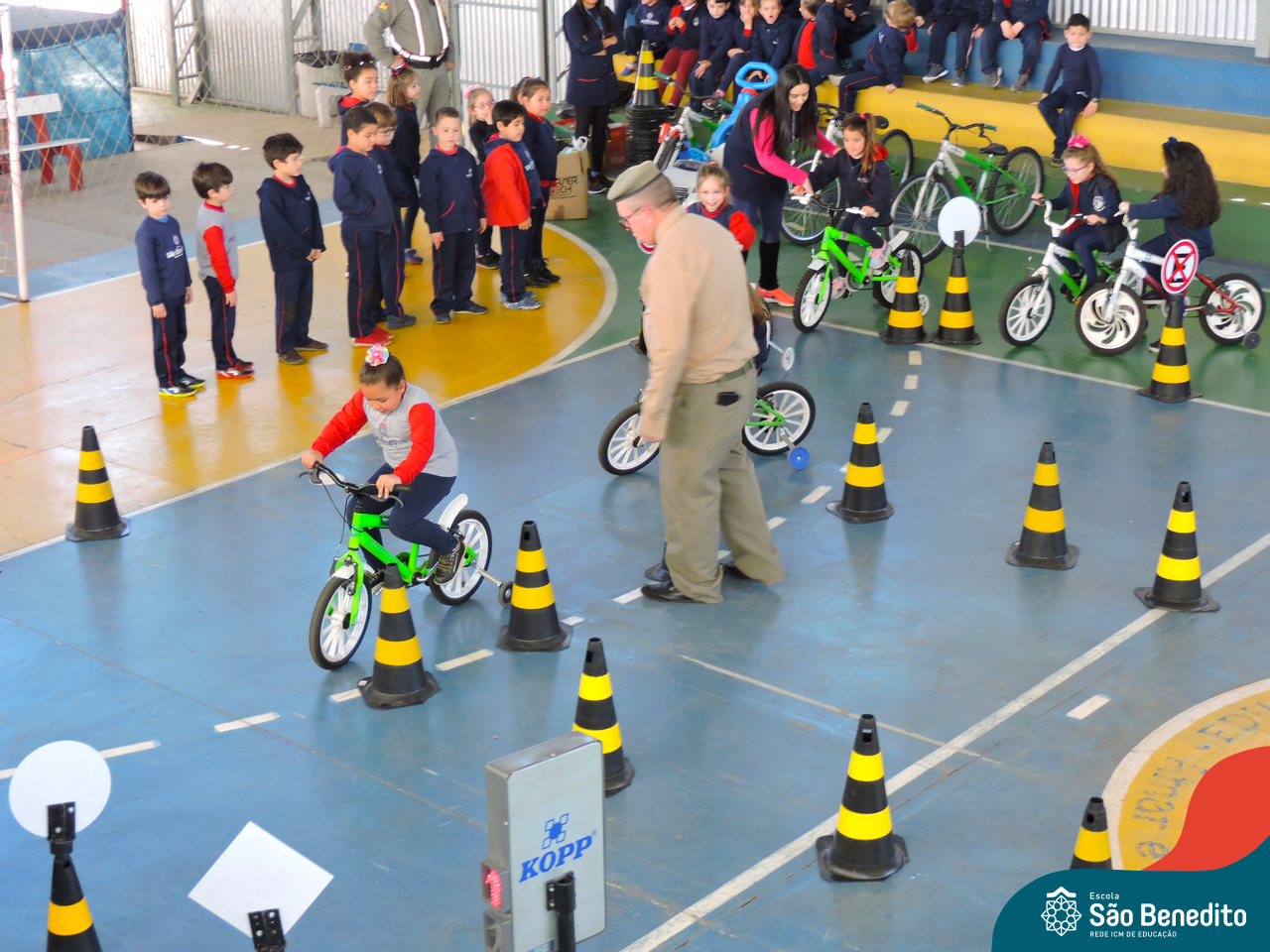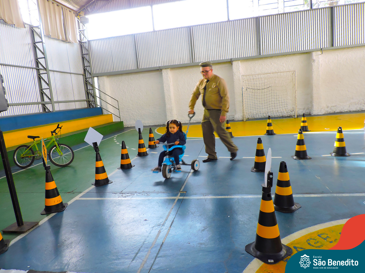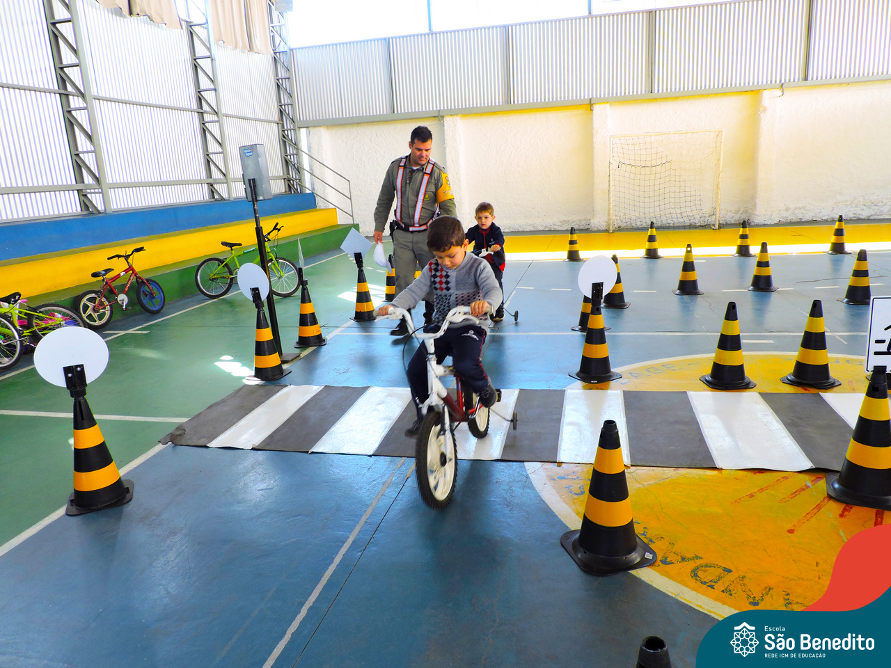 Os alunos da Educação Infantil até o 6º Ano, participaram de um circuito que simula o trânsito, que foi montado na quadra da Escola. Esse é o projeto “Escolinha de Trânsito”, do 2º BRBM.