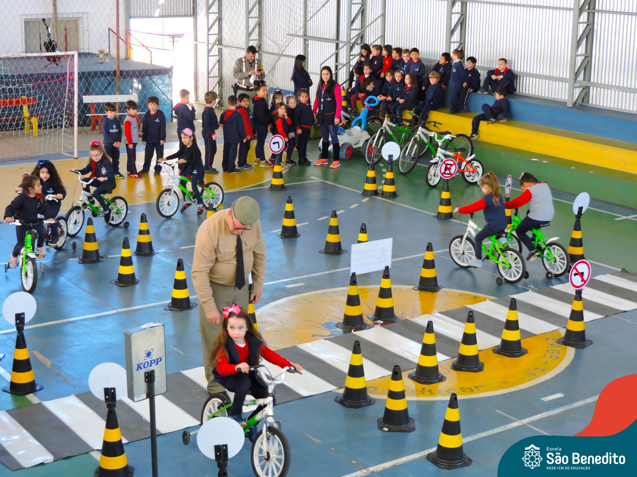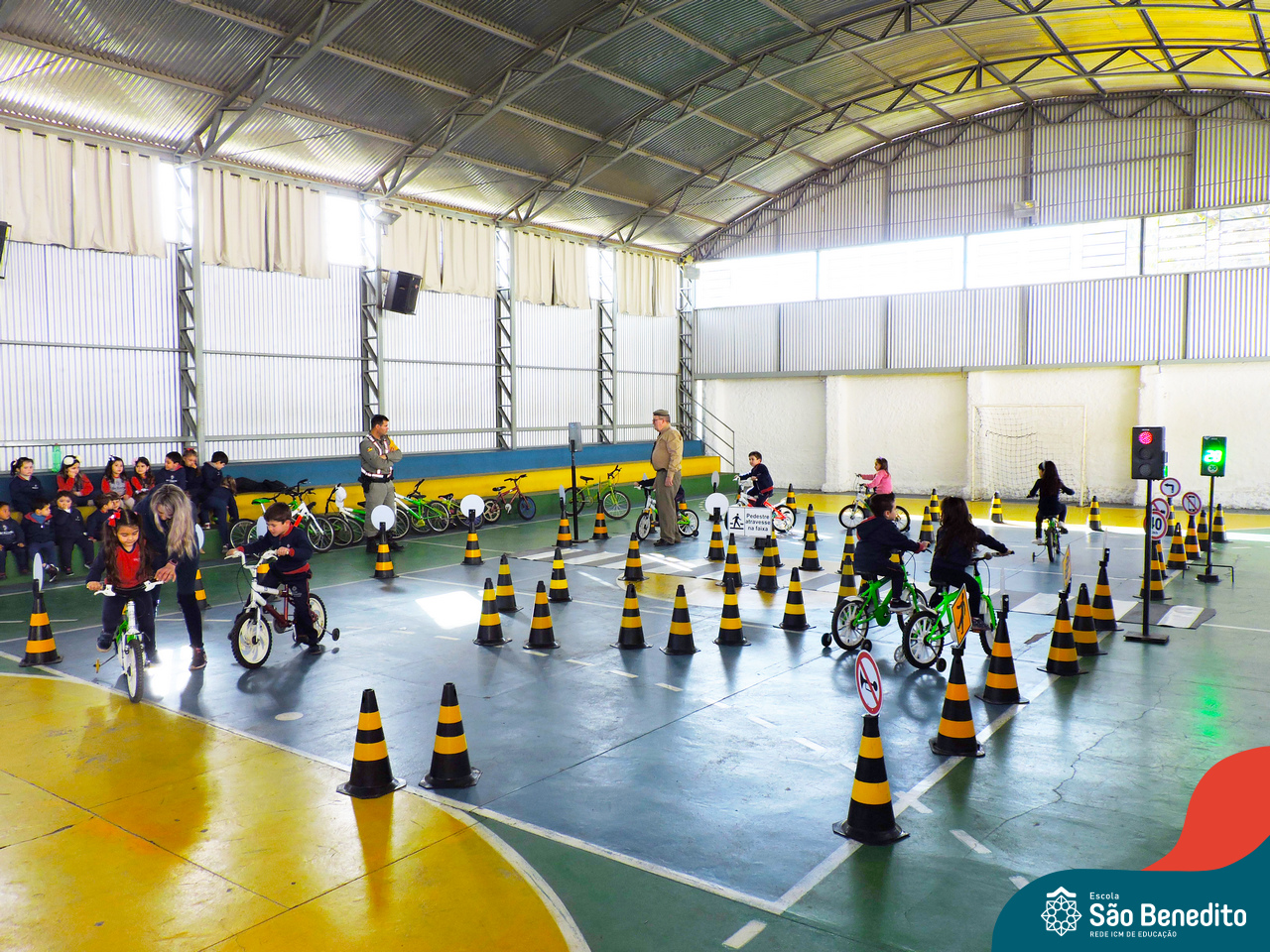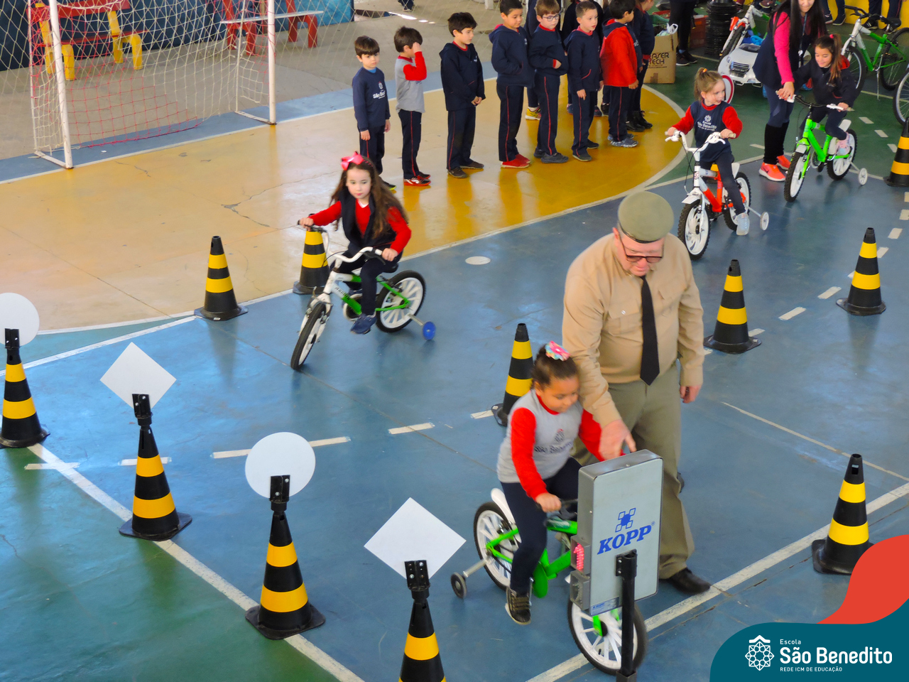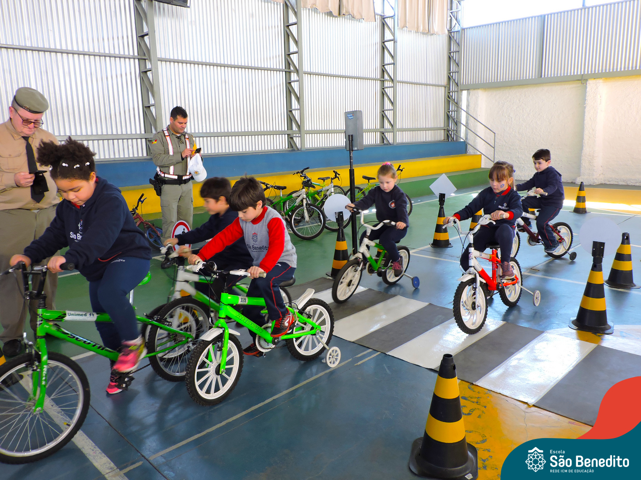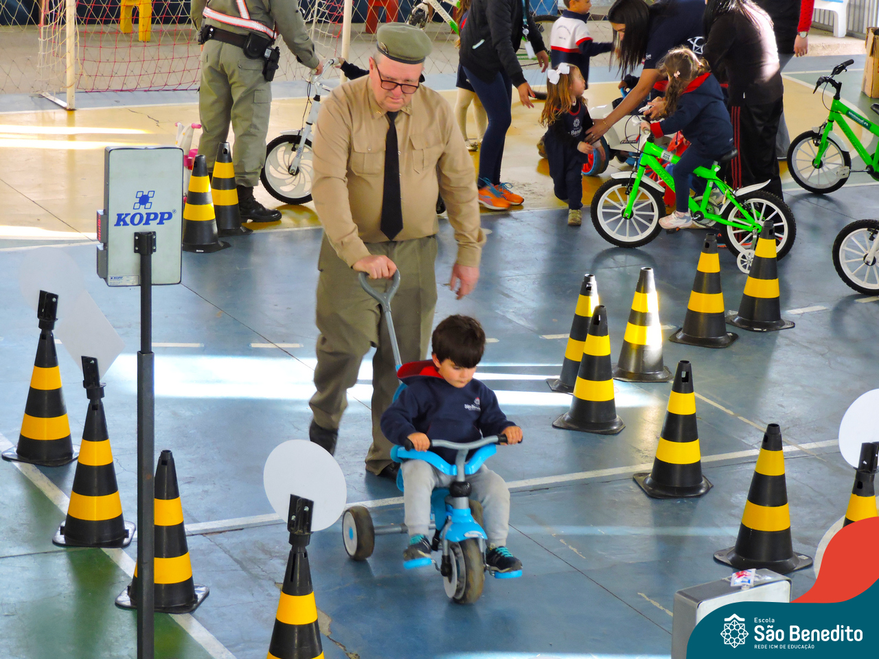 Os alunos da Educação Infantil até o 6º Ano, participaram de um circuito que simula o trânsito, que foi montado na quadra da Escola. Esse é o projeto “Escolinha de Trânsito”, do 2º BRBM.