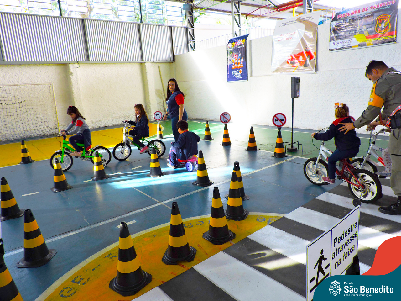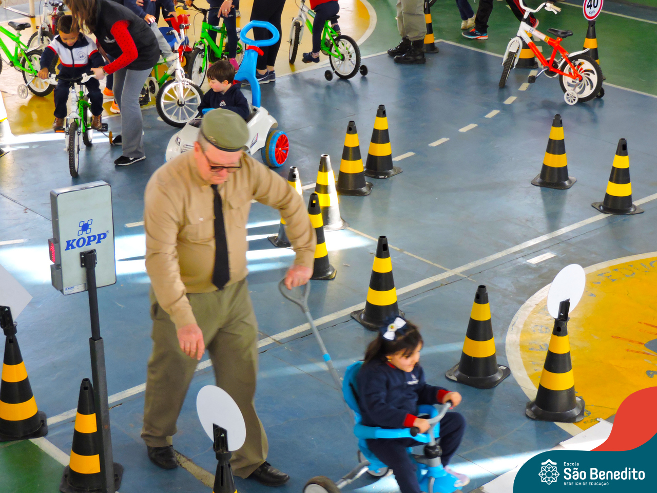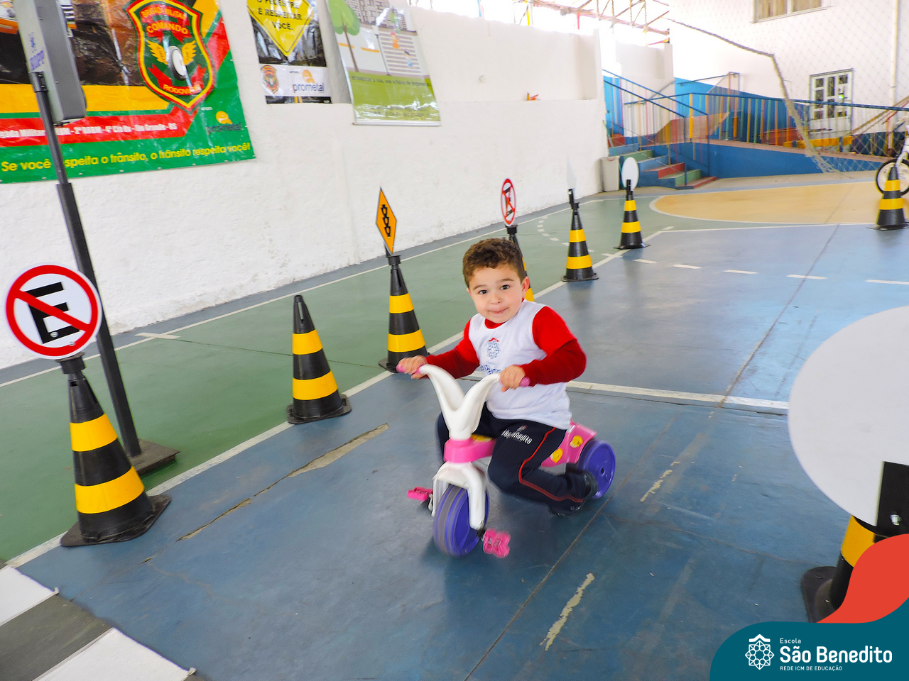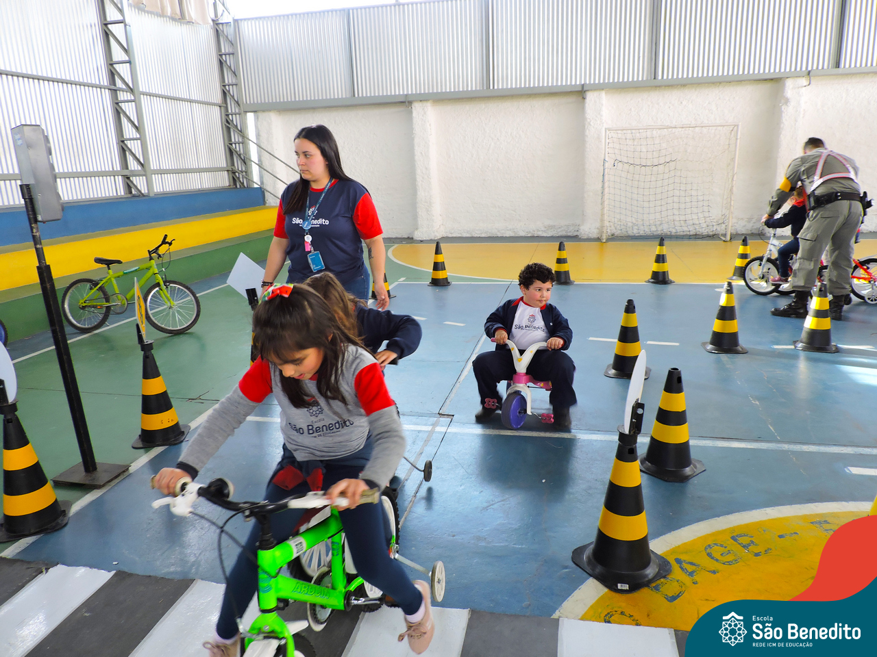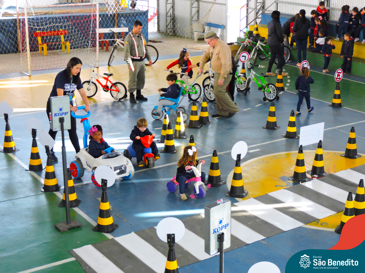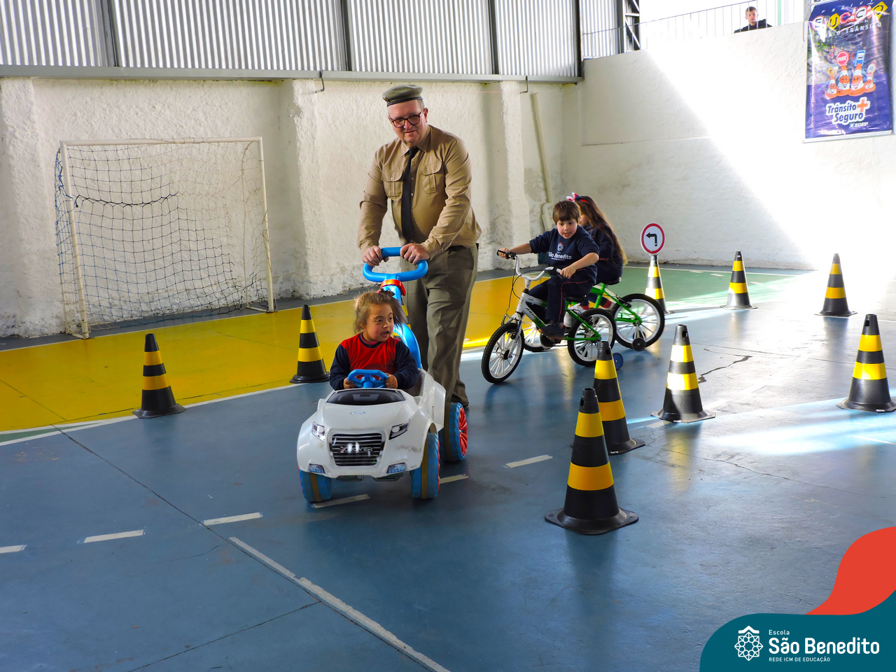 Os alunos da Educação Infantil até o 6º Ano, participaram de um circuito que simula o trânsito, que foi montado na quadra da Escola. Esse é o projeto “Escolinha de Trânsito”, do 2º BRBM.
