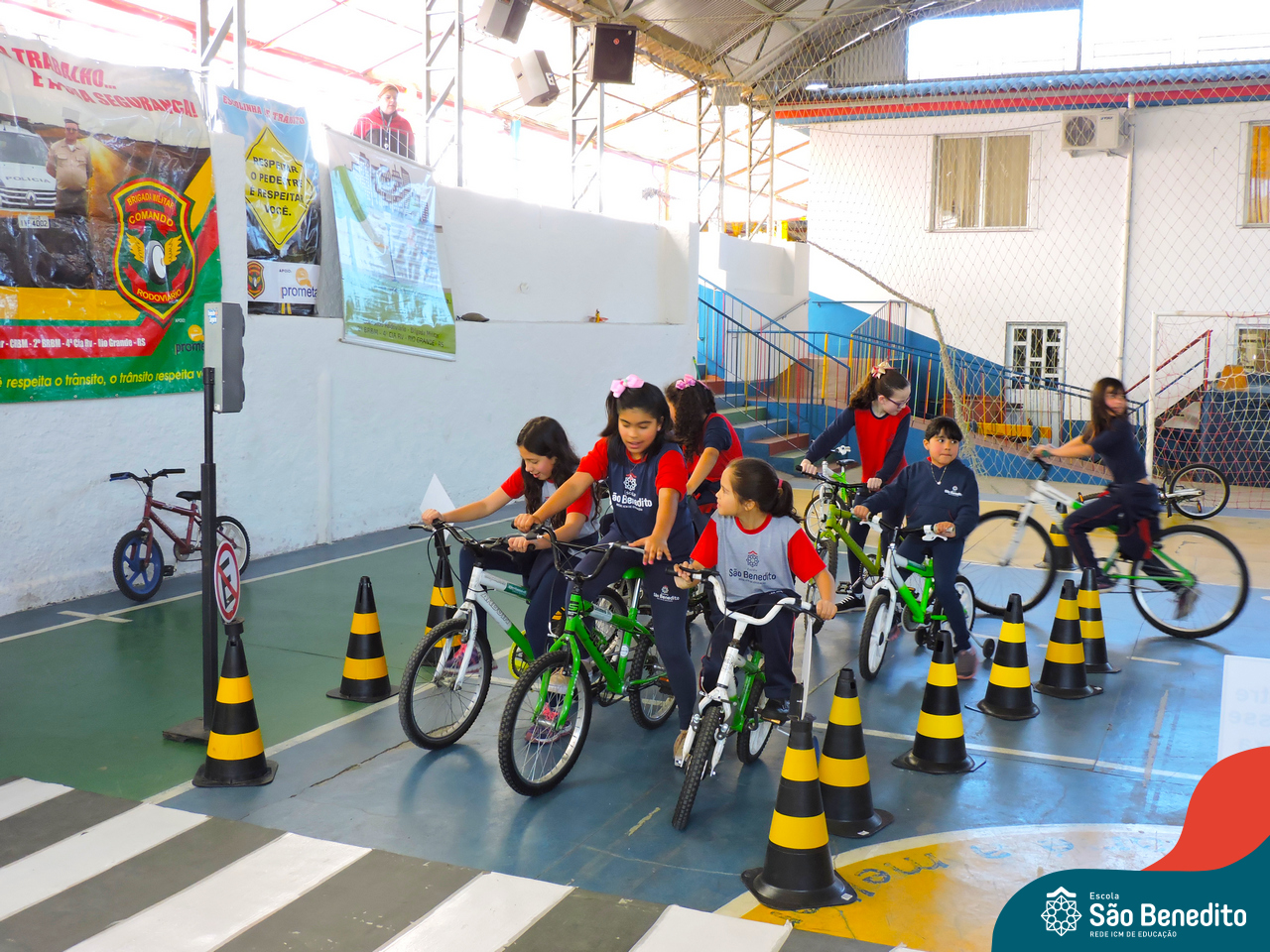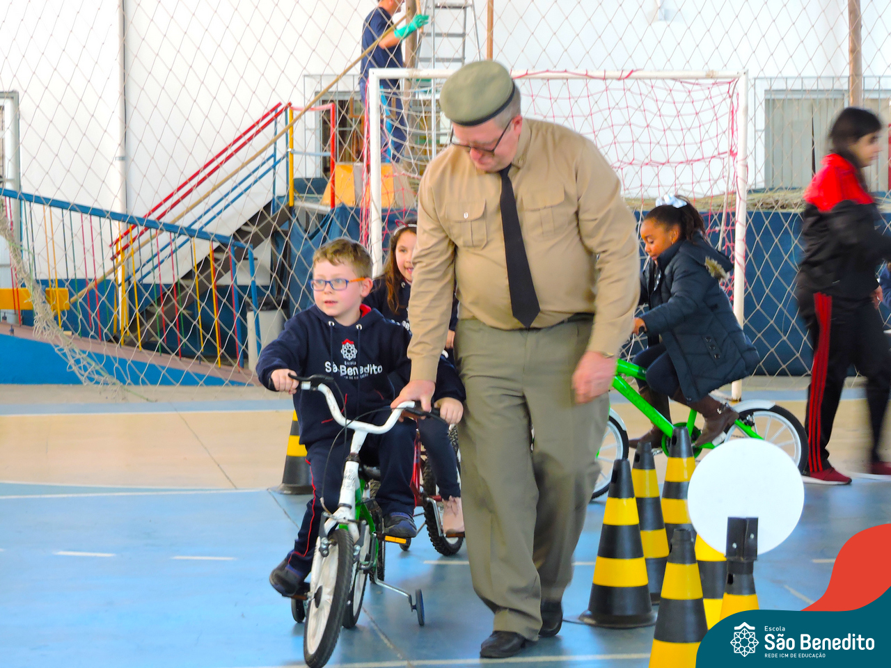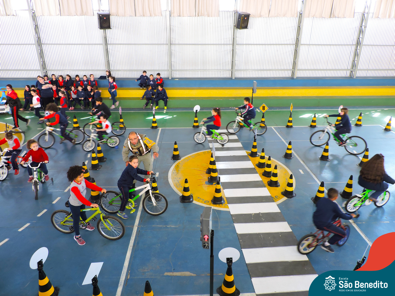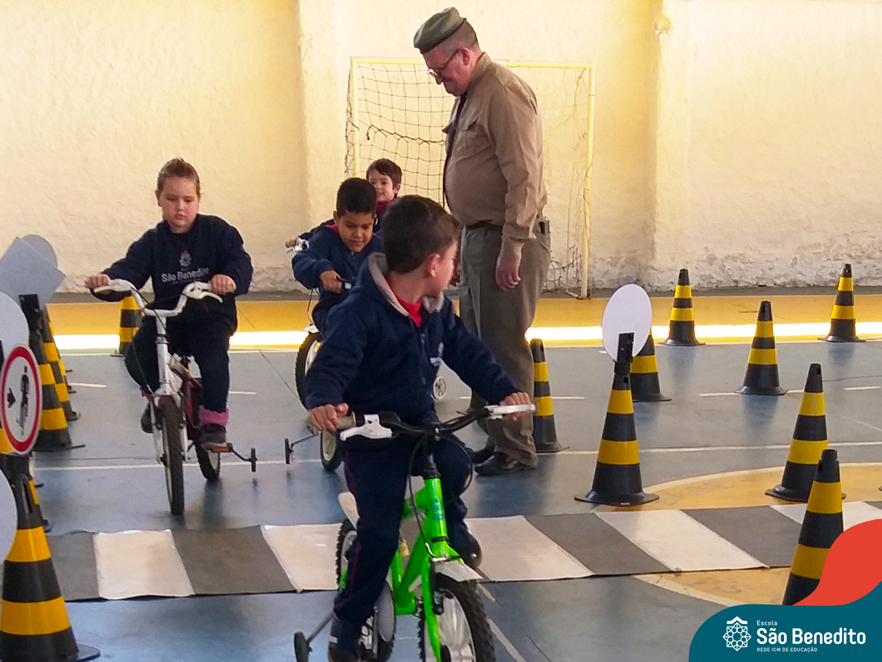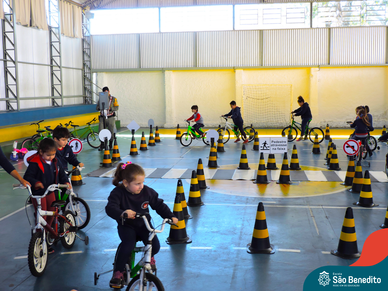 Os alunos da Educação Infantil até o 6º Ano, participaram de um circuito que simula o trânsito, que foi montado na quadra da Escola. Esse é o projeto “Escolinha de Trânsito”, do 2º BRBM.