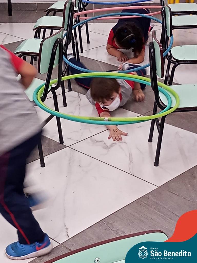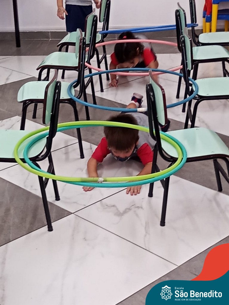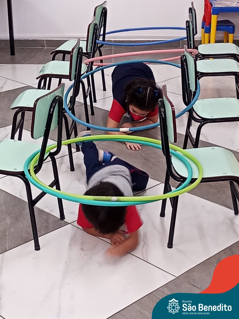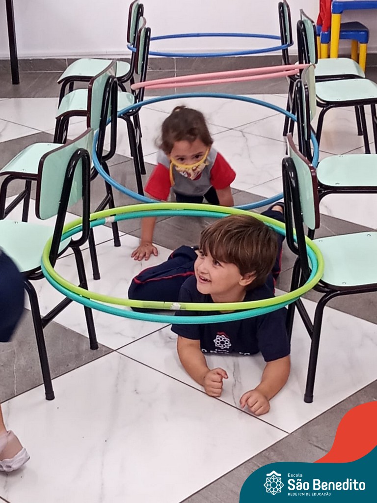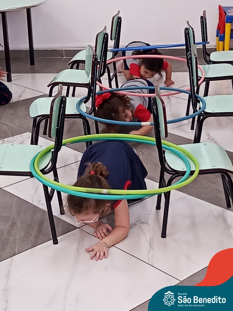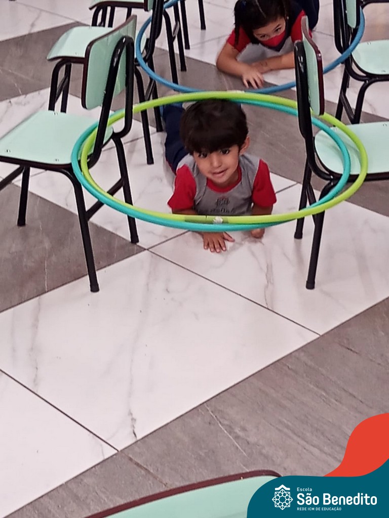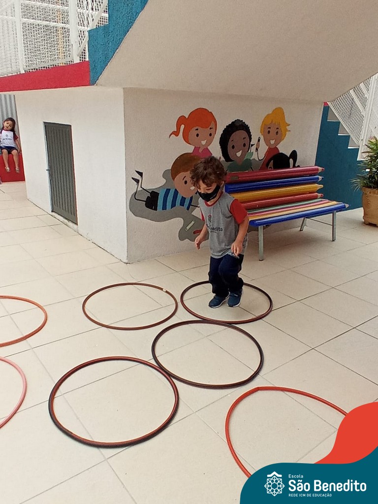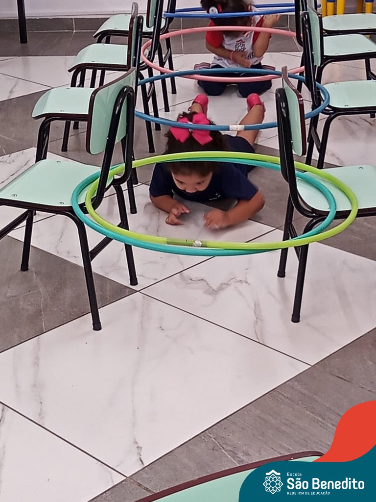 Circuito feito com bambolês. Atividades dirigidas com músicas e brincadeiras com legos.