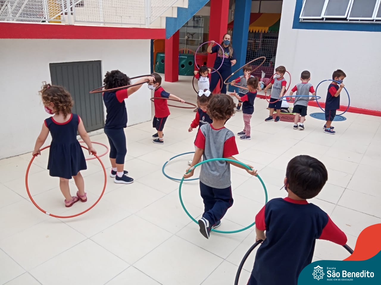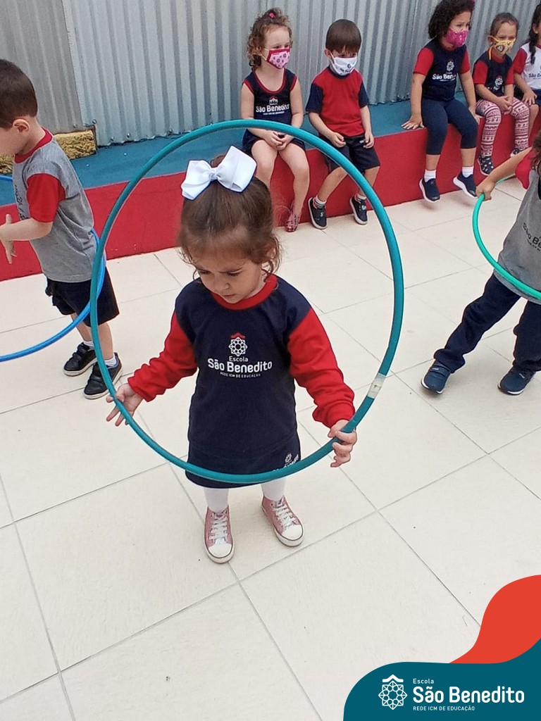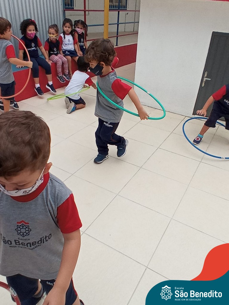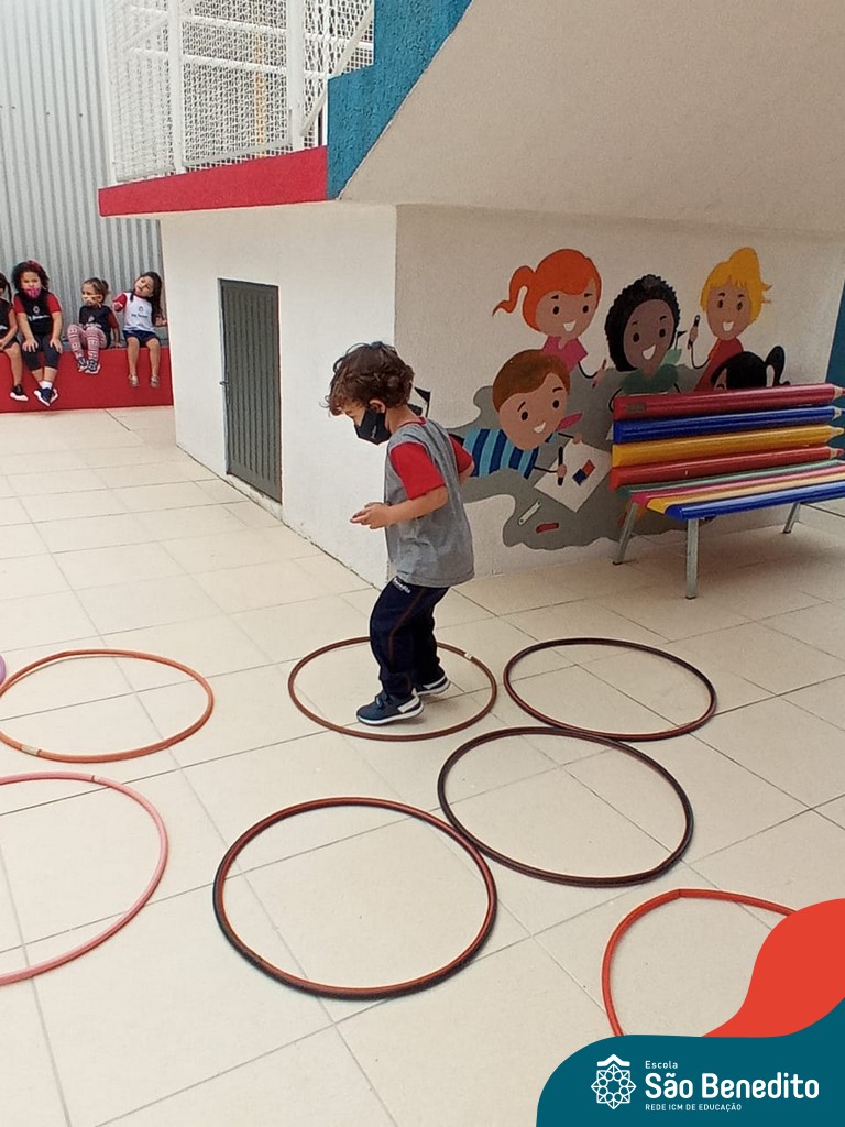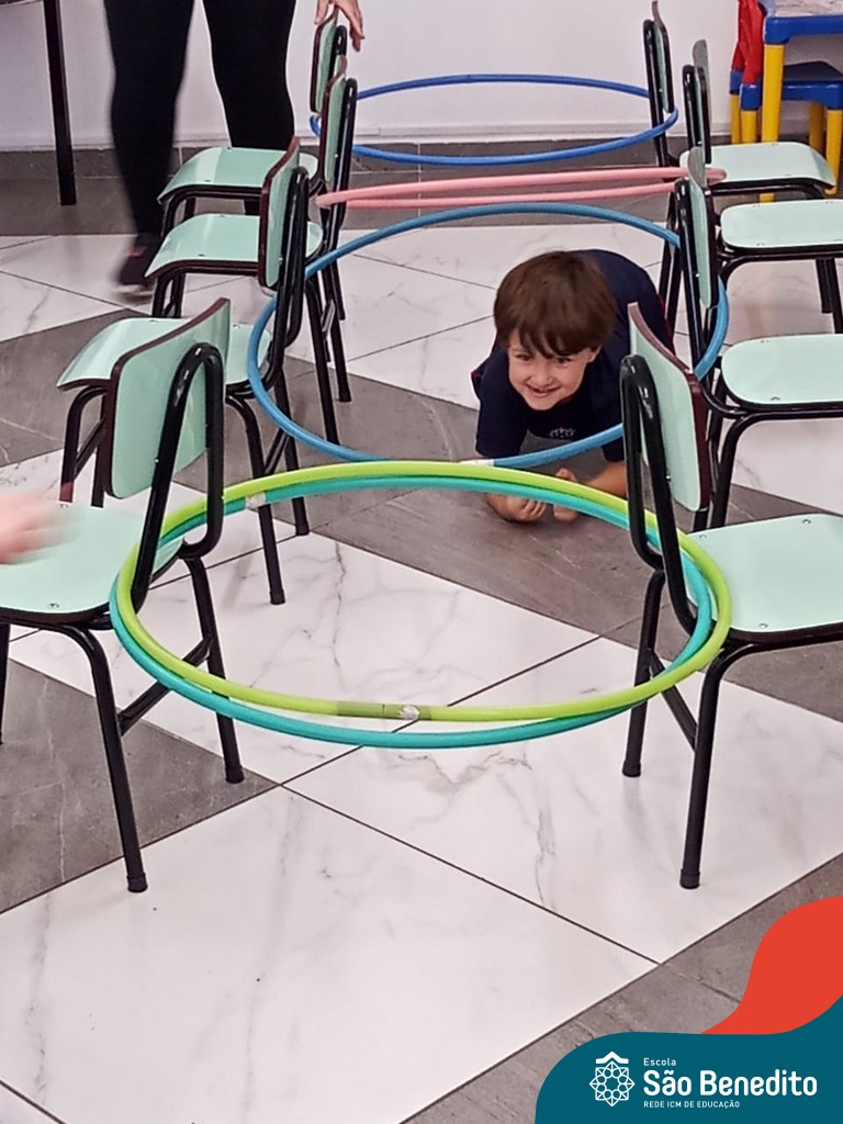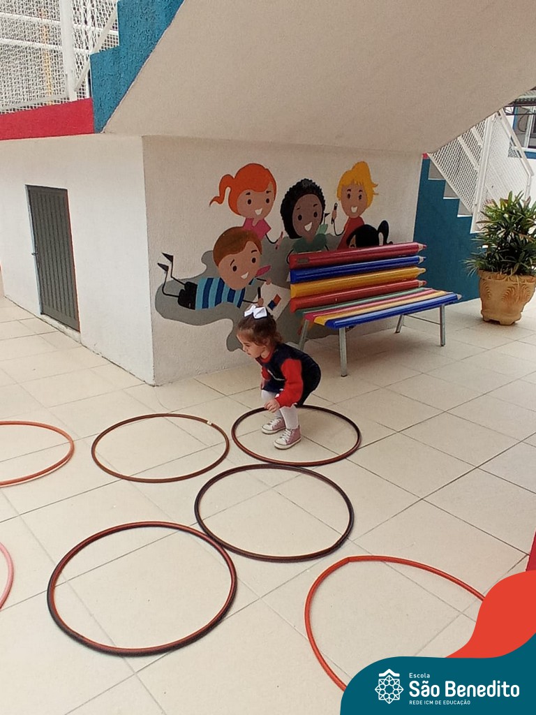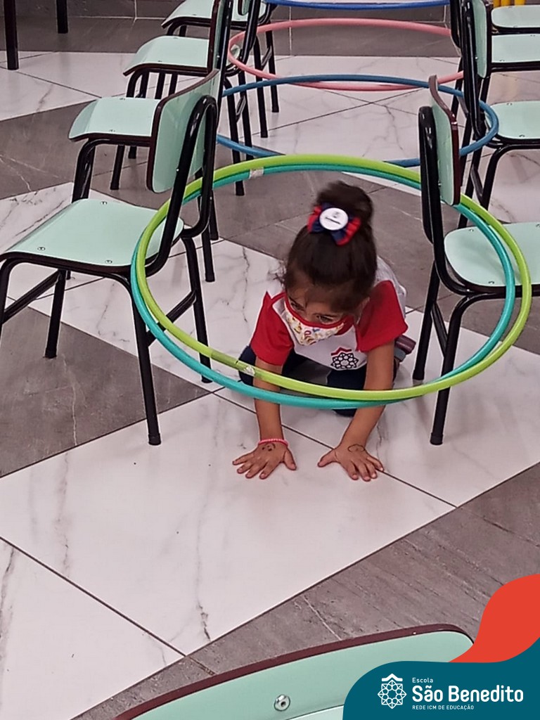 Circuito feito com bambolês. Atividades dirigidas com músicas e brincadeiras com legos.