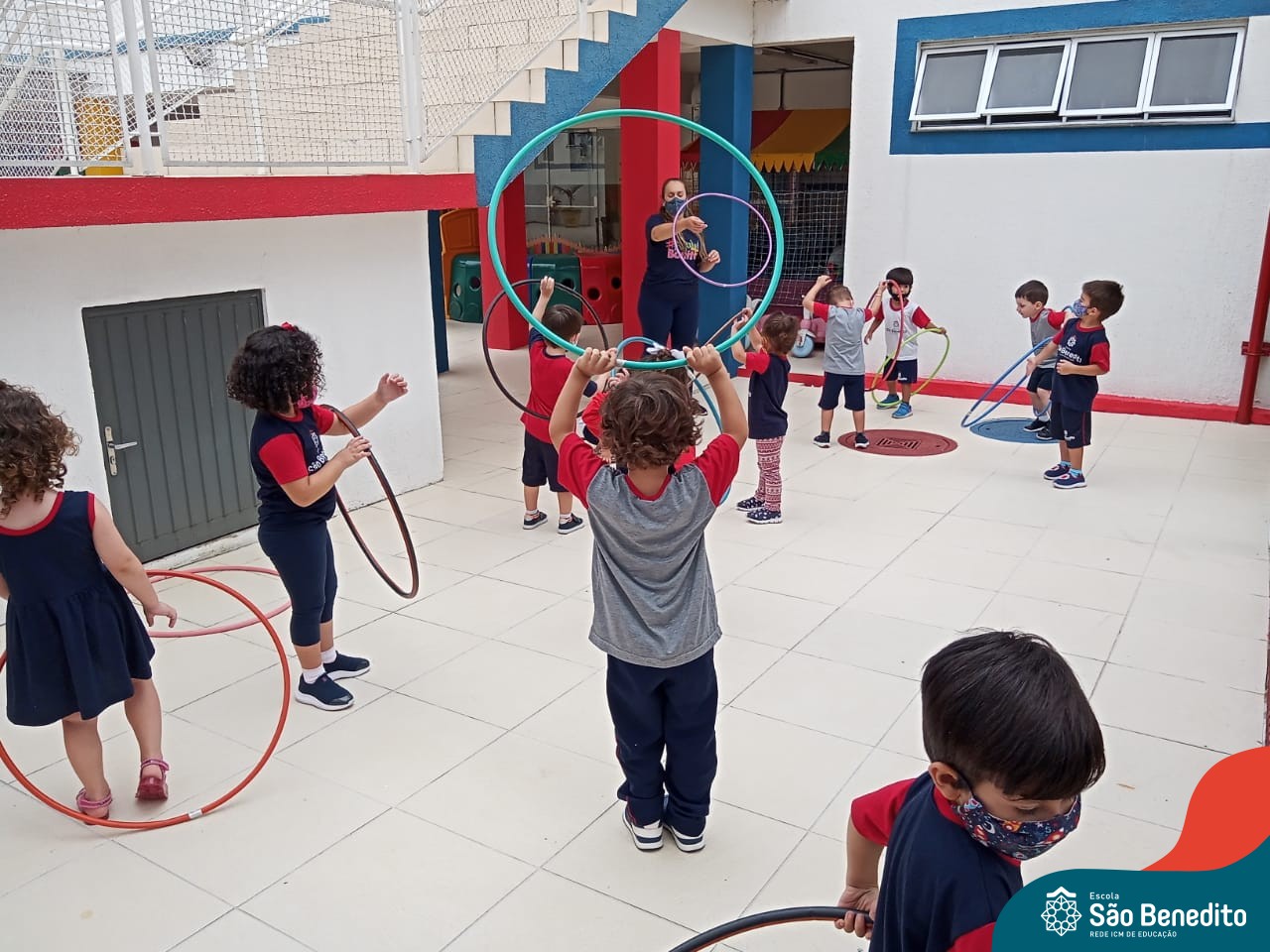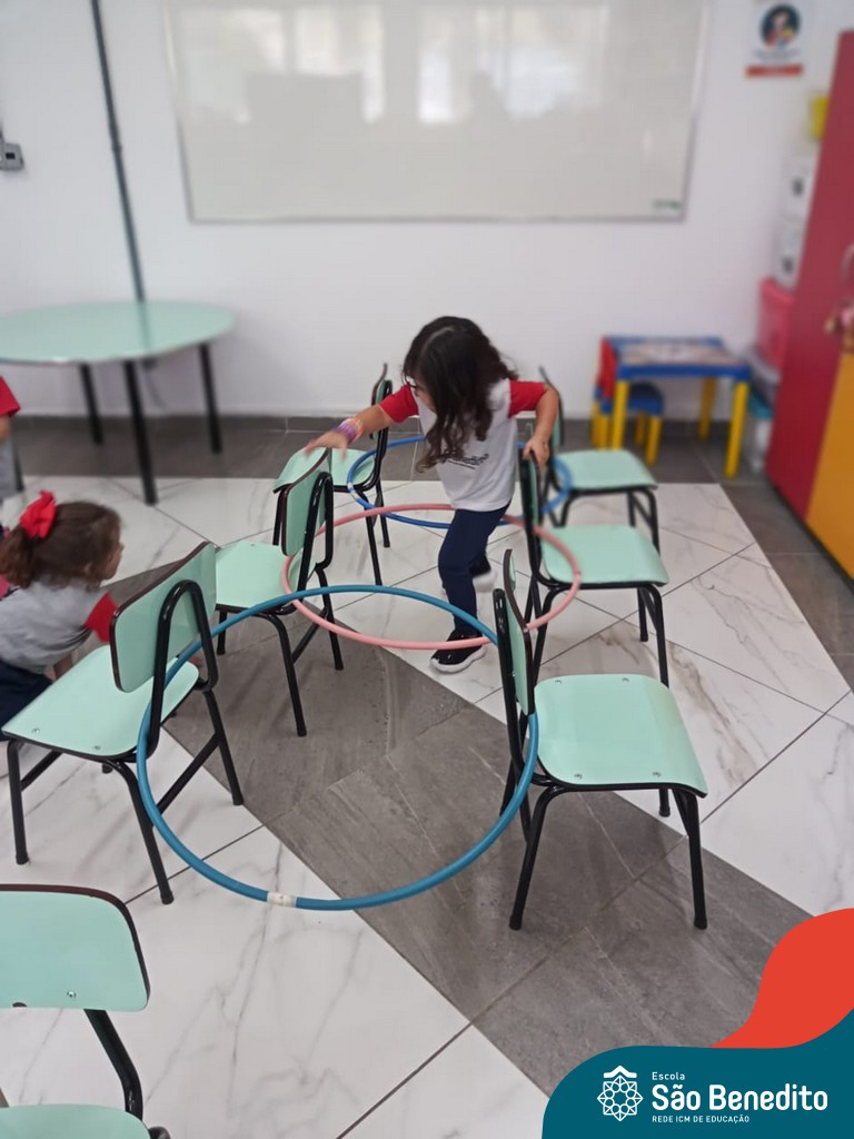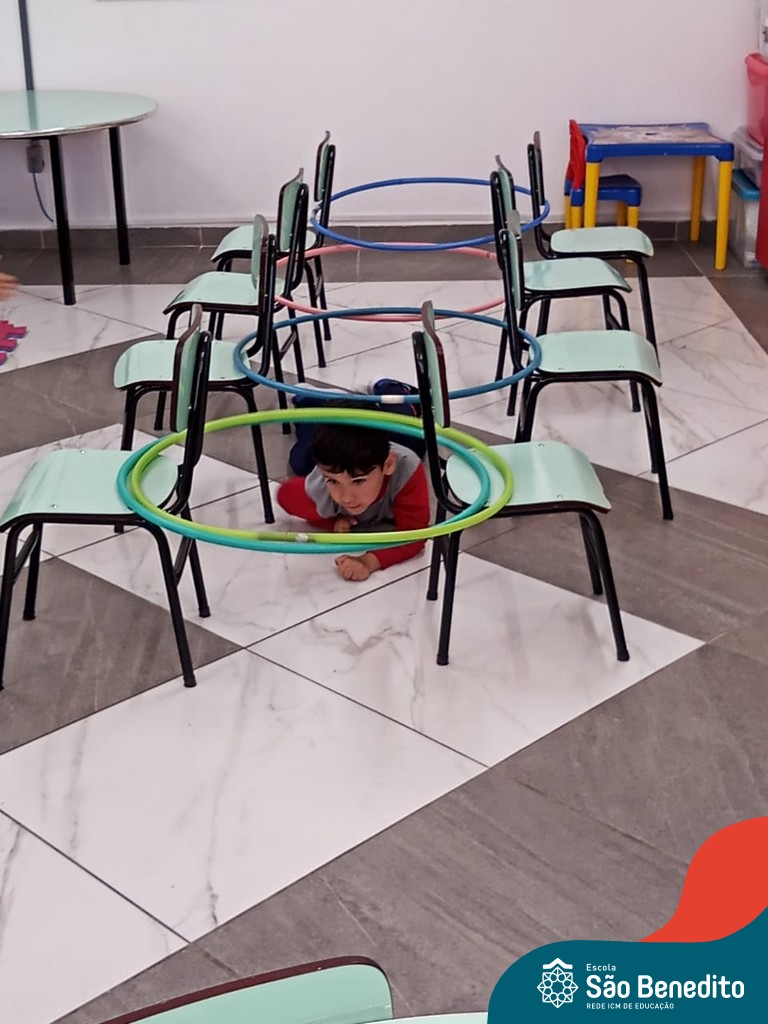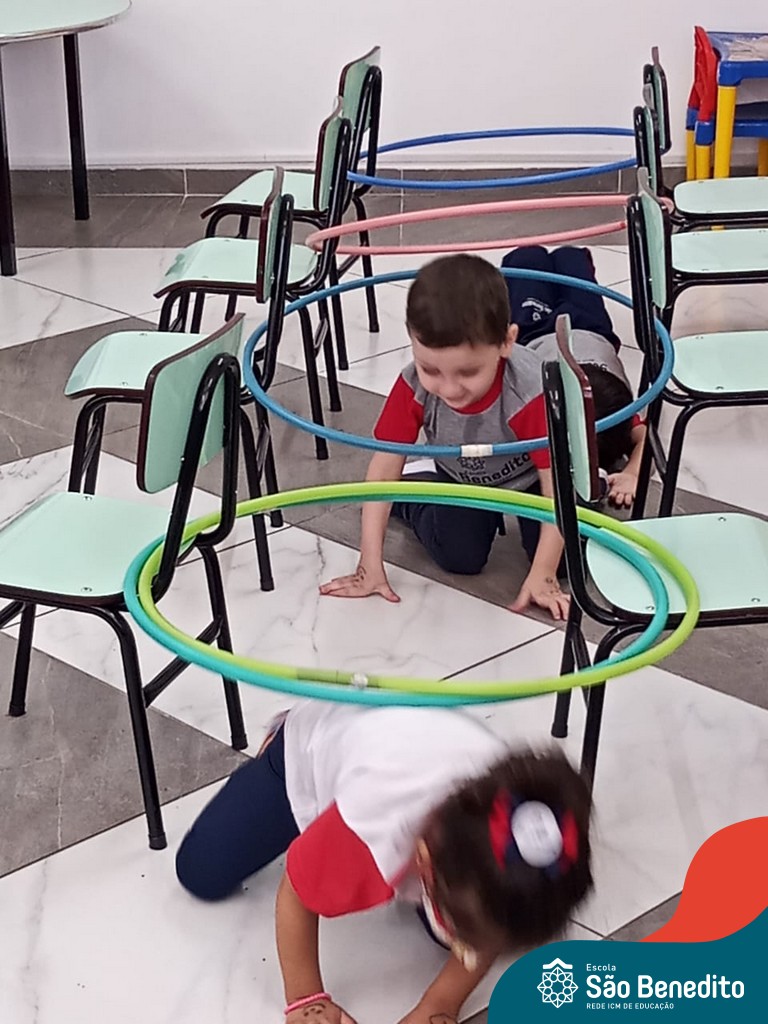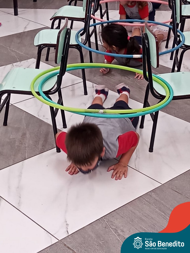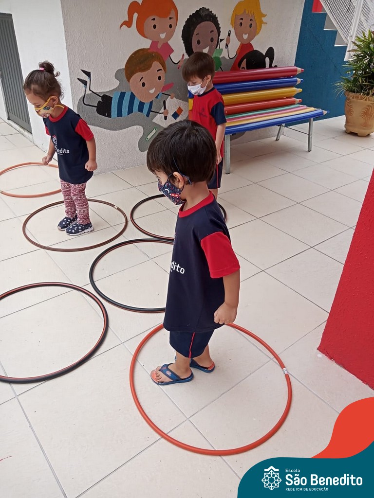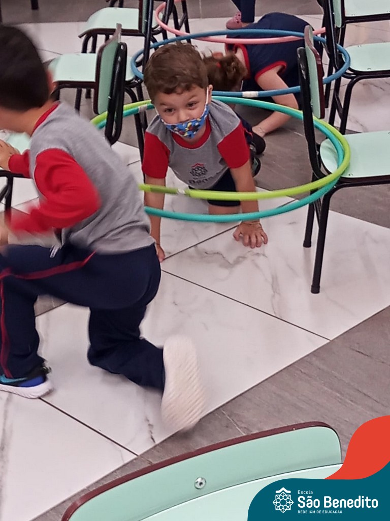 Circuito feito com bambolês. Atividades dirigidas com músicas e brincadeiras com legos.