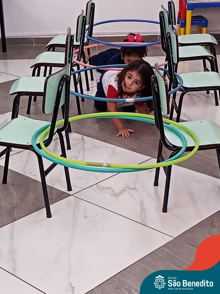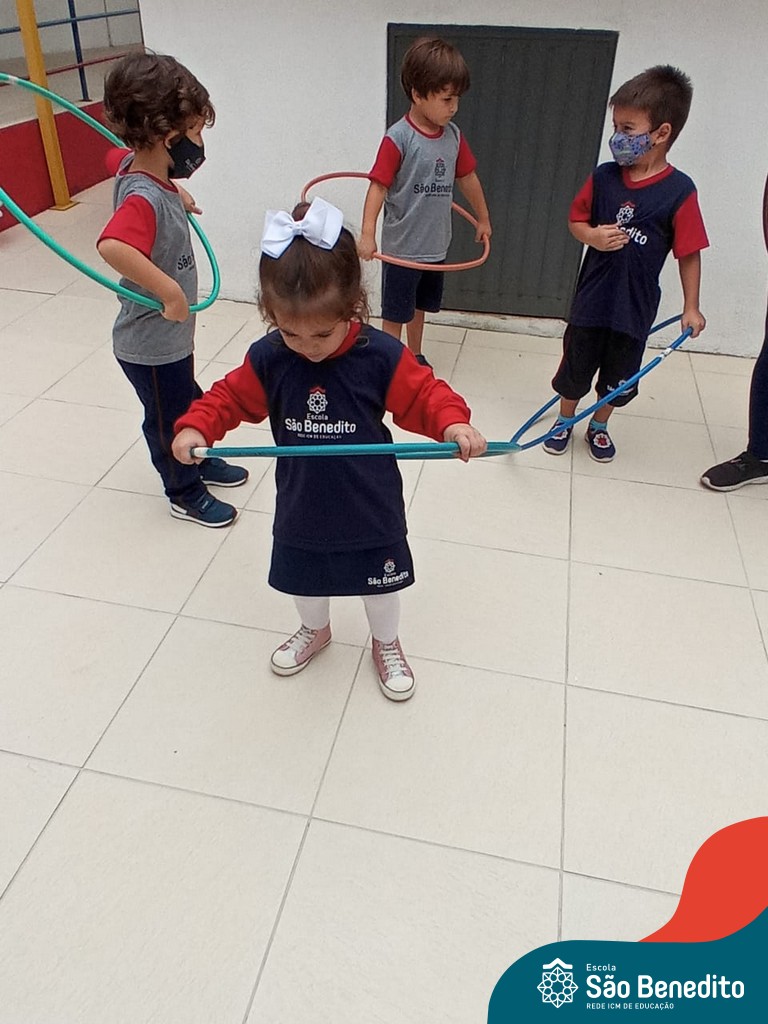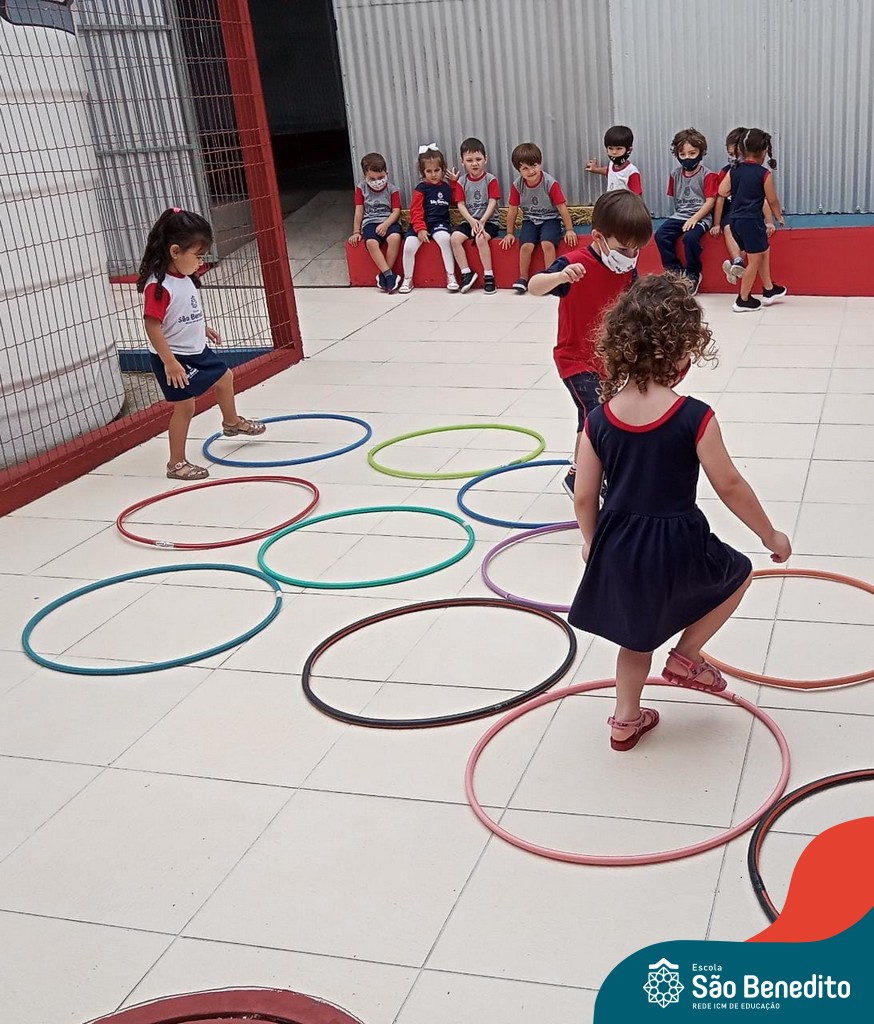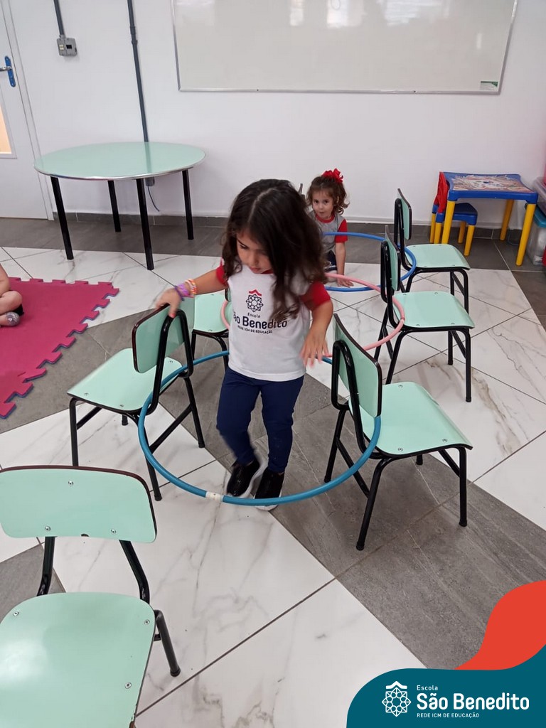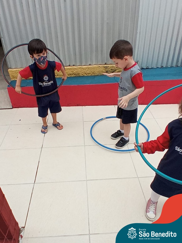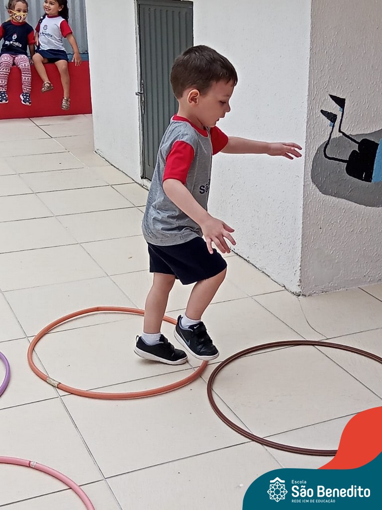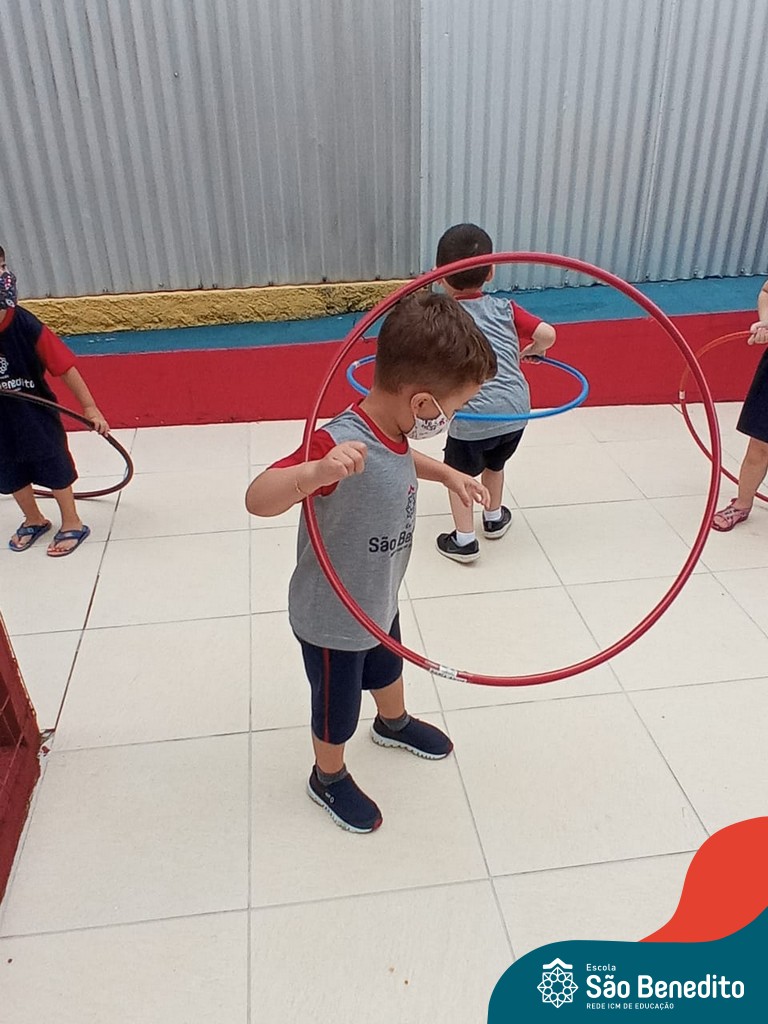 Circuito feito com bambolês. Atividades dirigidas com músicas e brincadeiras com legos.