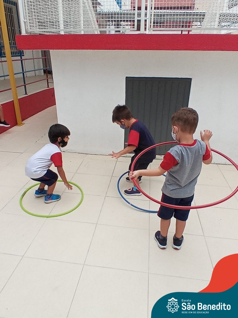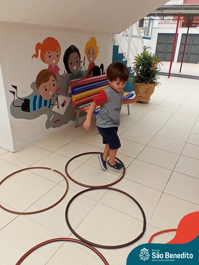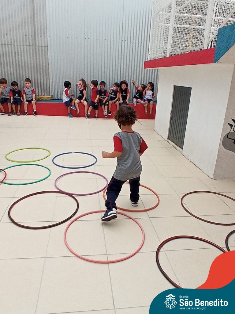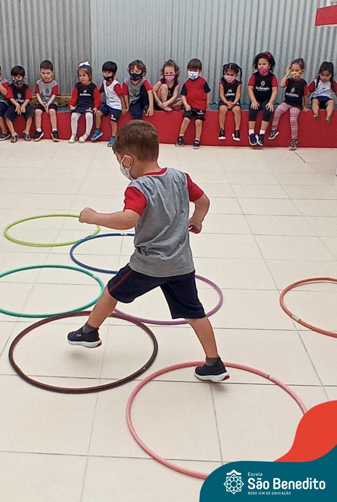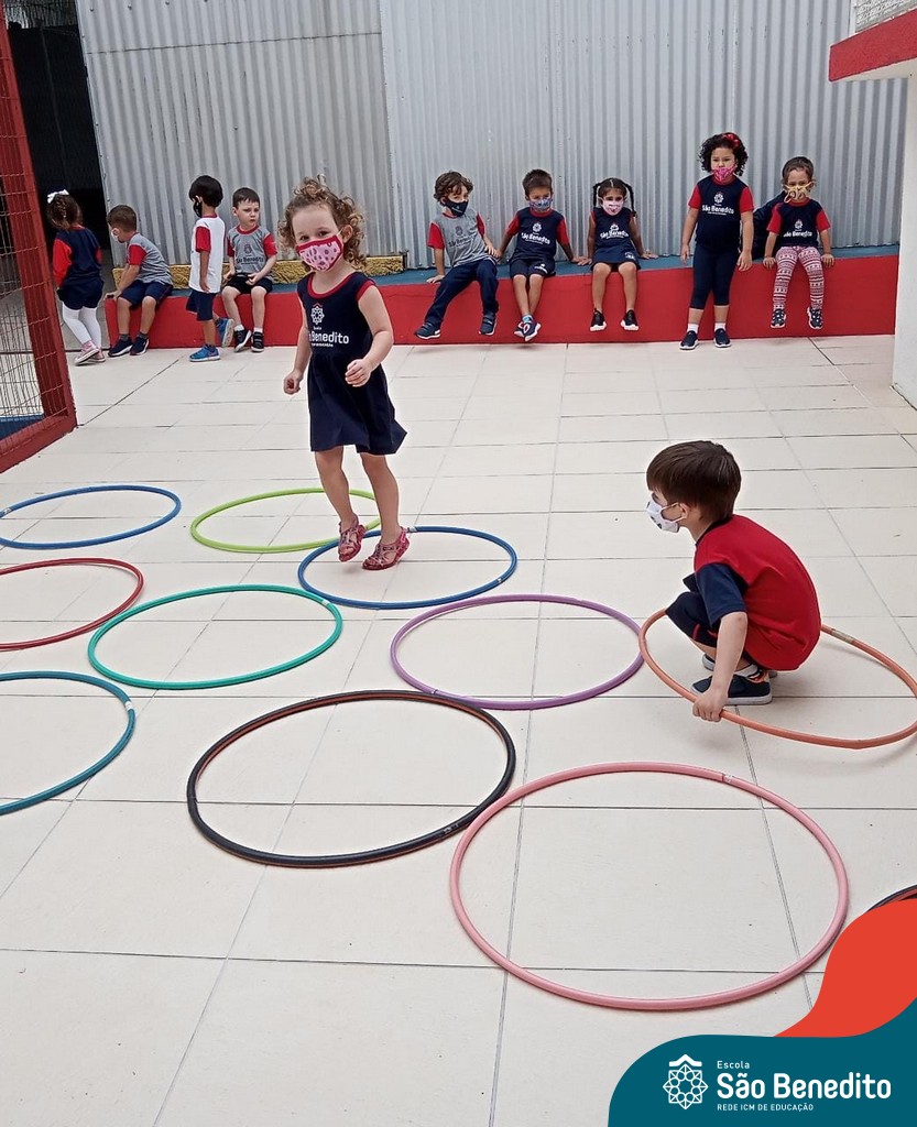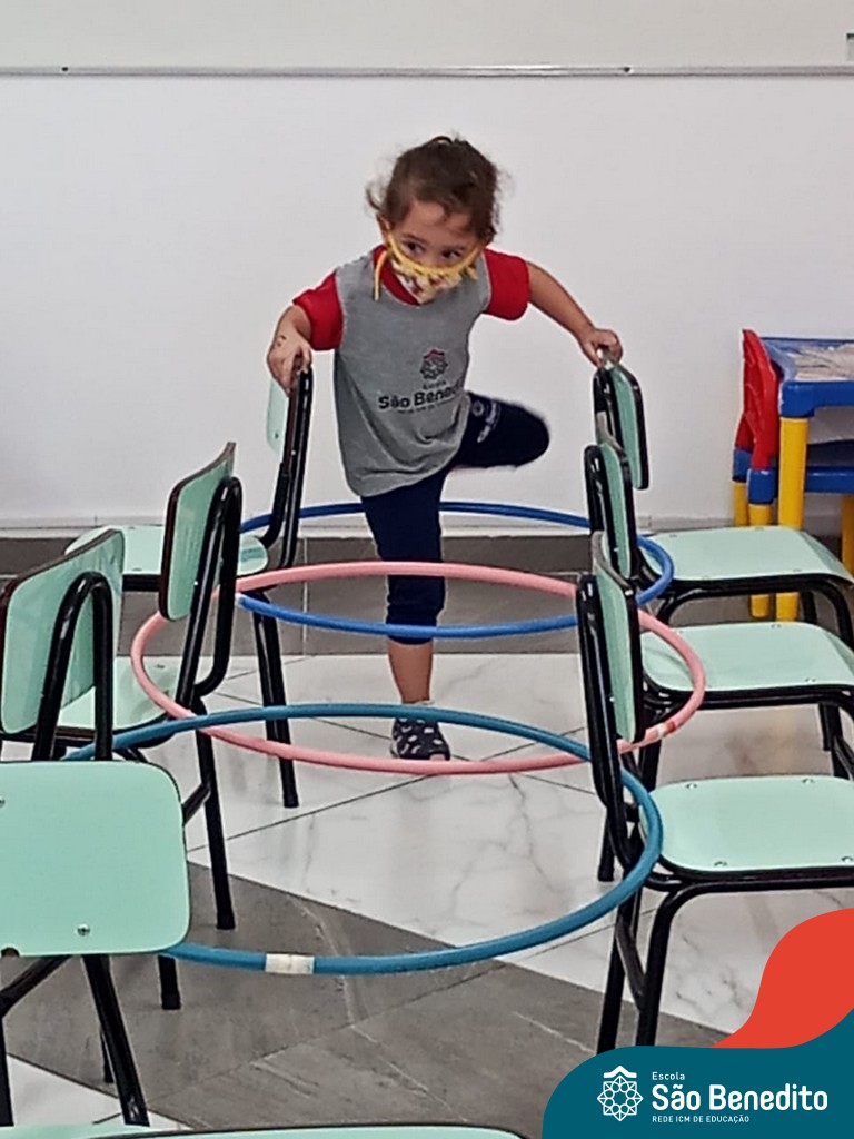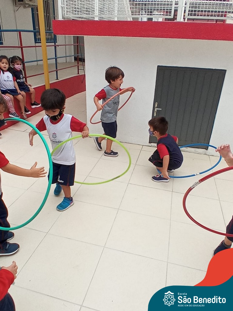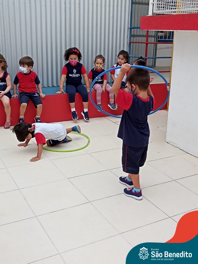 Circuito feito com bambolês. Atividades dirigidas com músicas e brincadeiras com legos.