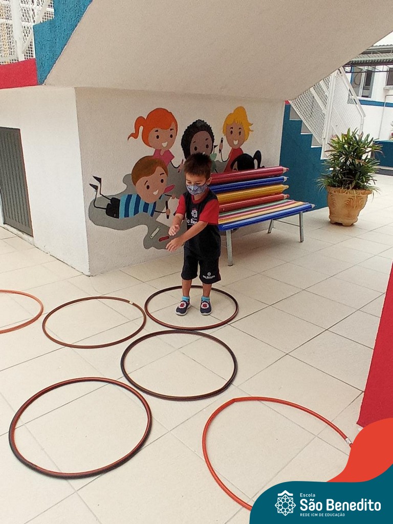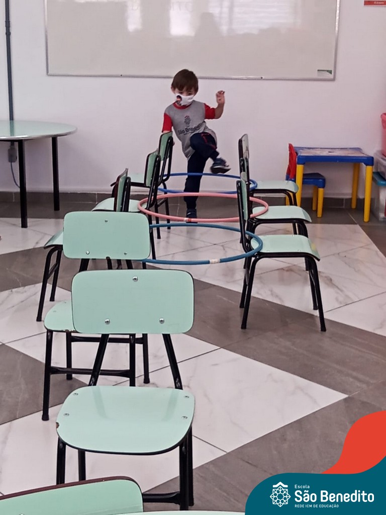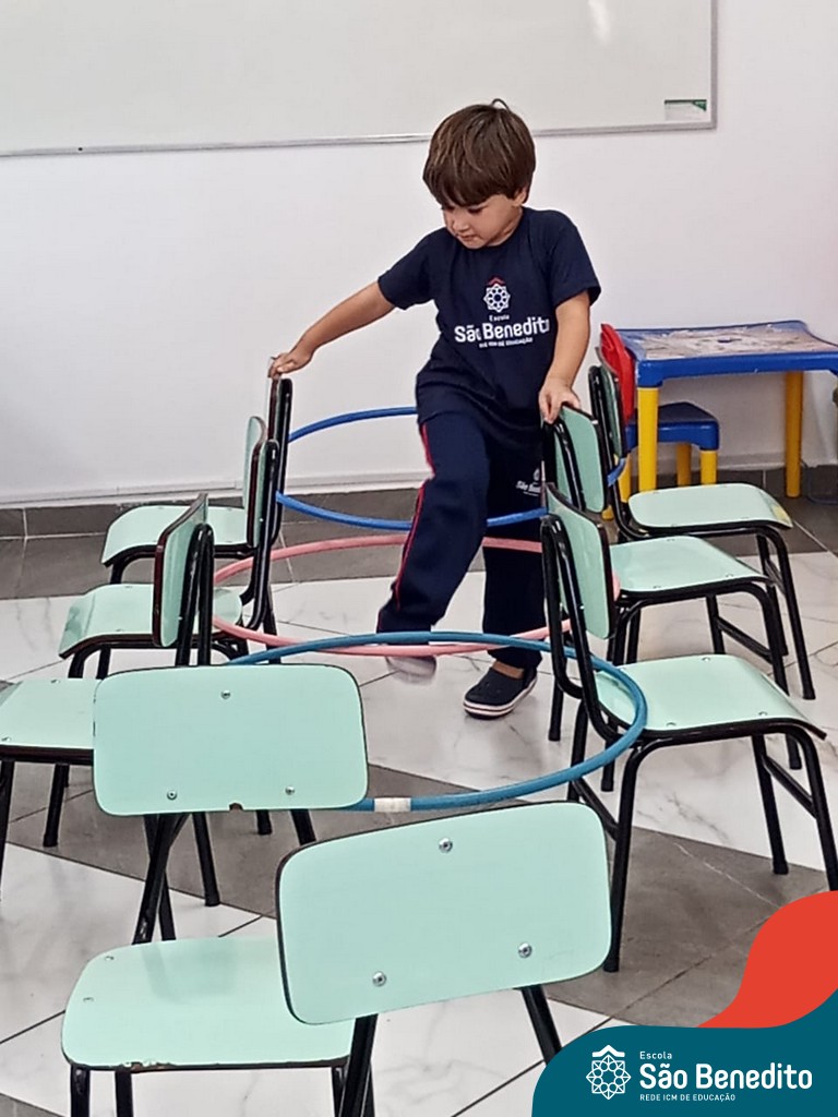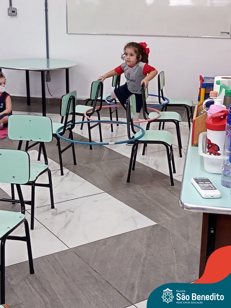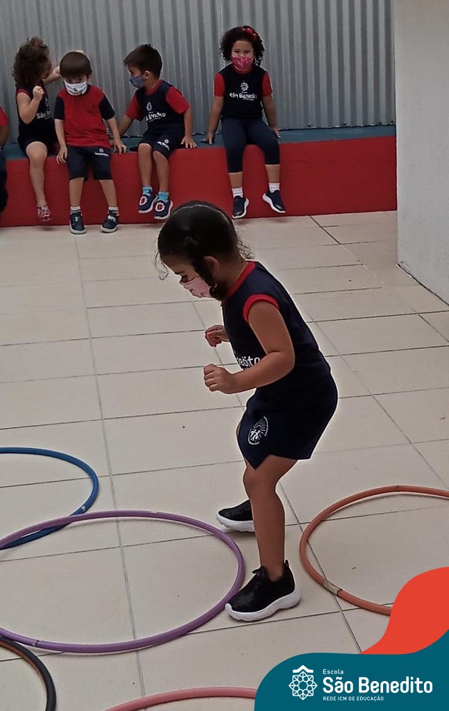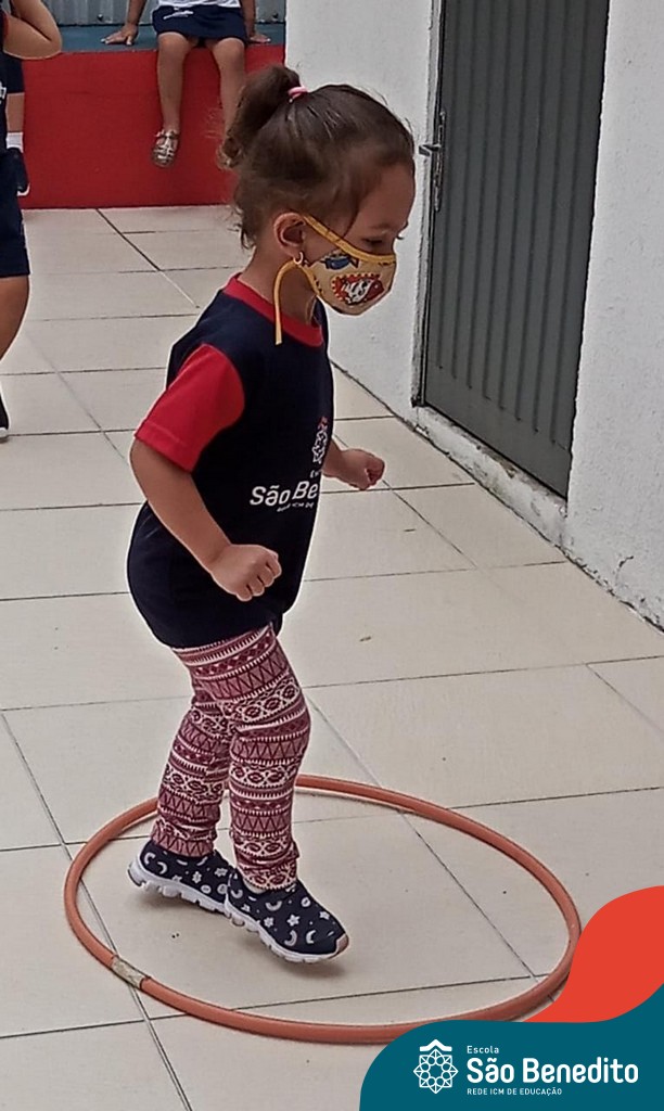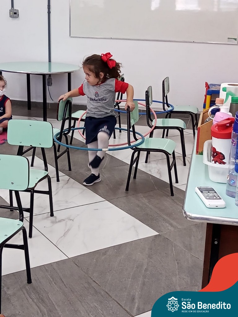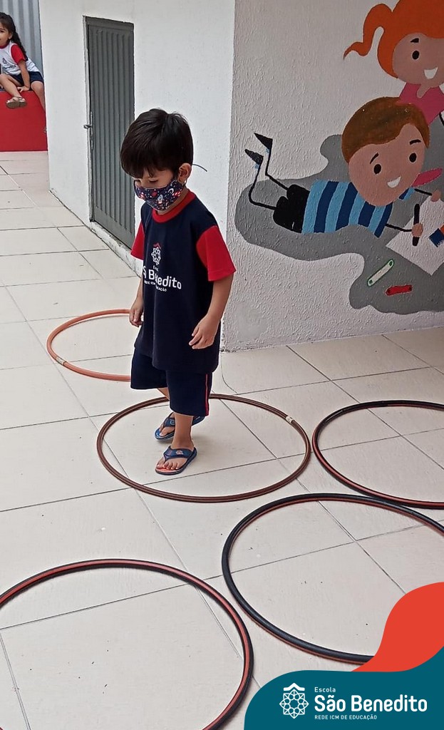 Circuito feito com bambolês. Atividades dirigidas com músicas e brincadeiras com legos.