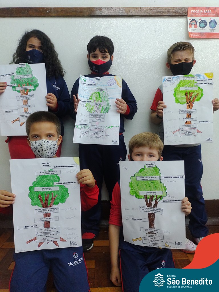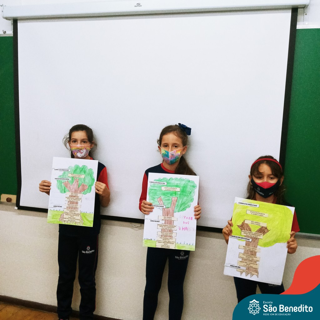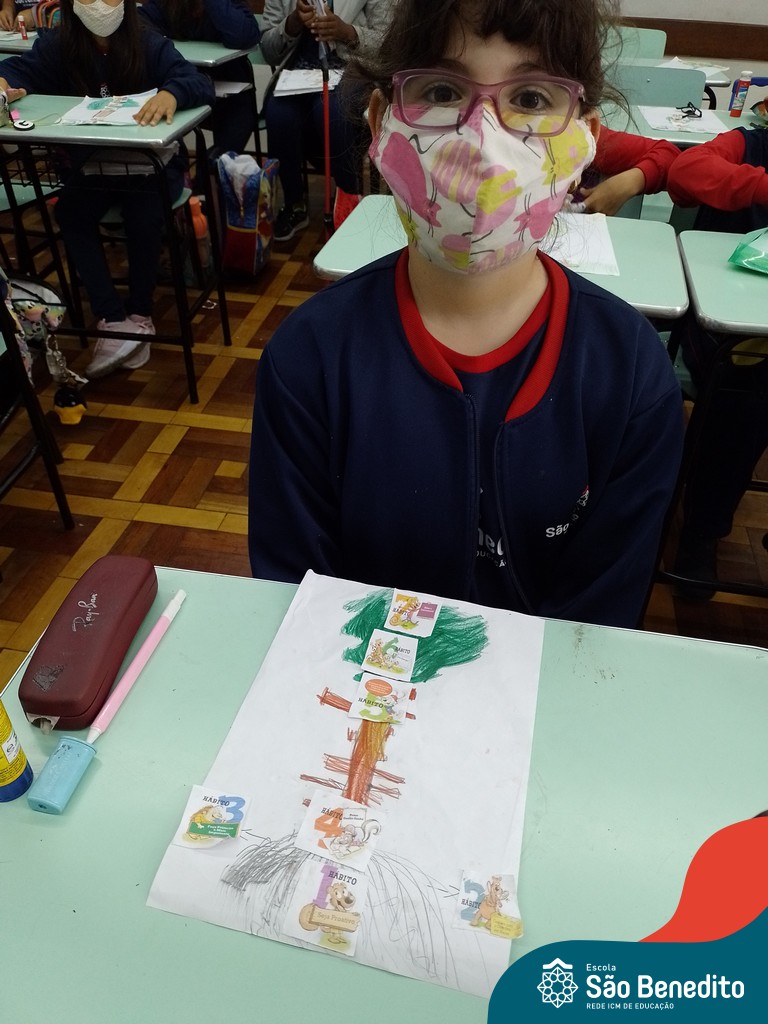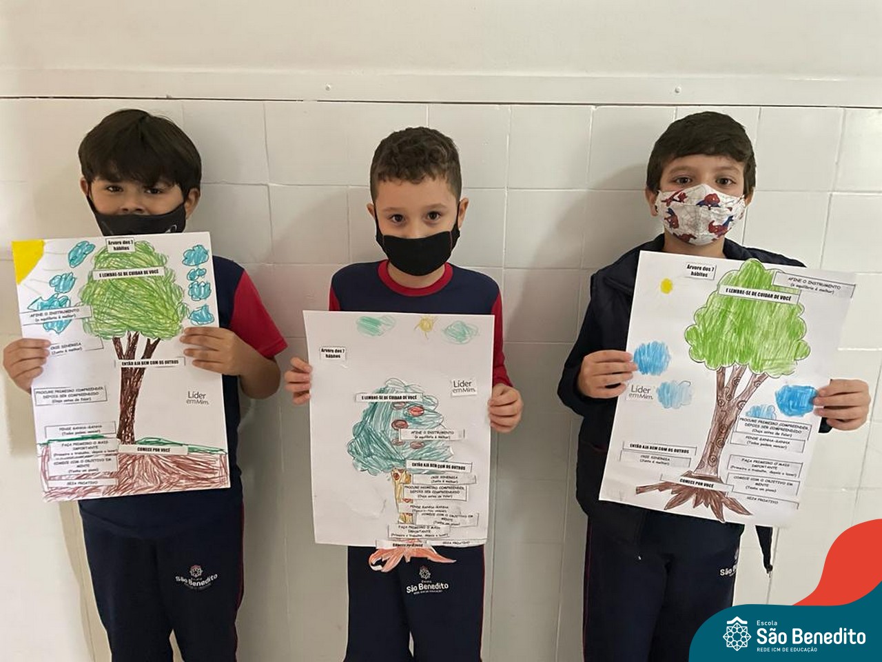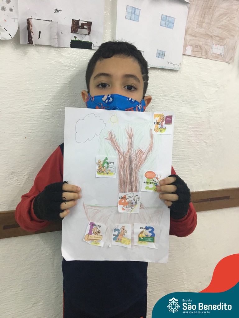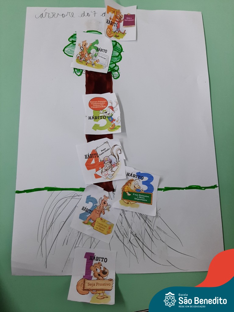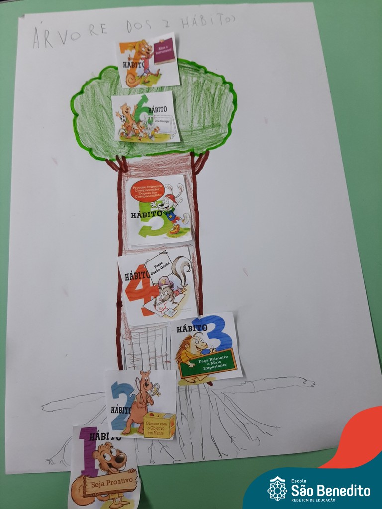 Os estudantes do 1º ao 5º Ano construíram a Árvore dos 7 hábitos da criança feliz, que oportuniza a construção de uma boa comunicação, criando uma linguagem comum e envolvendo os colegas, professores e família.