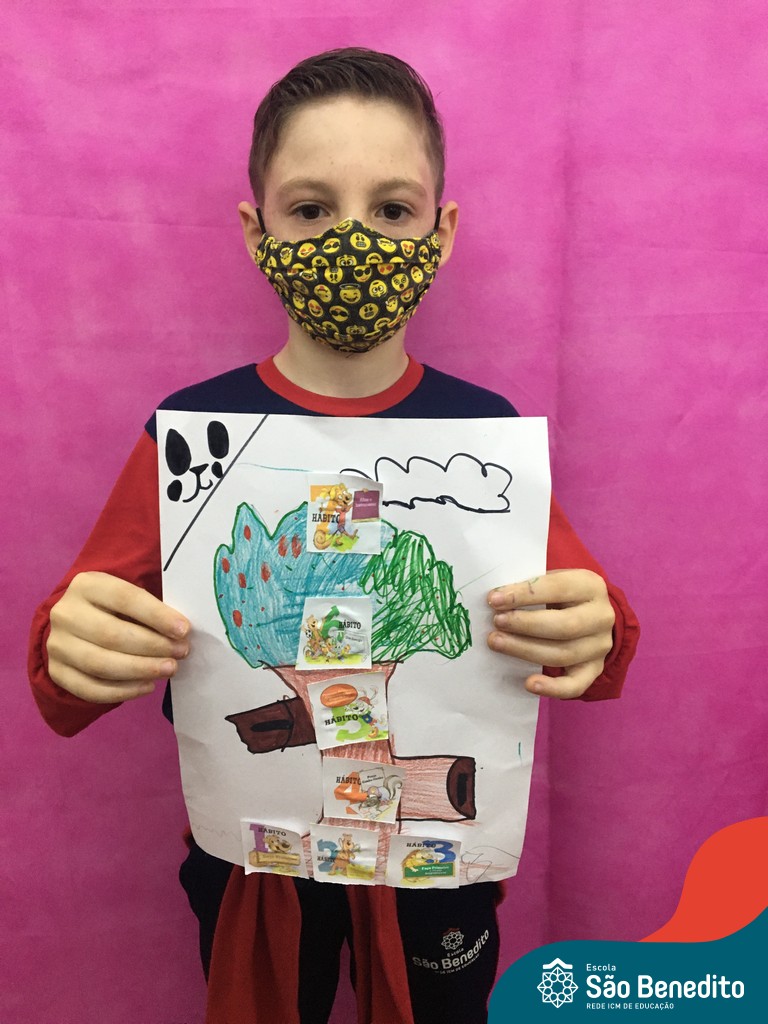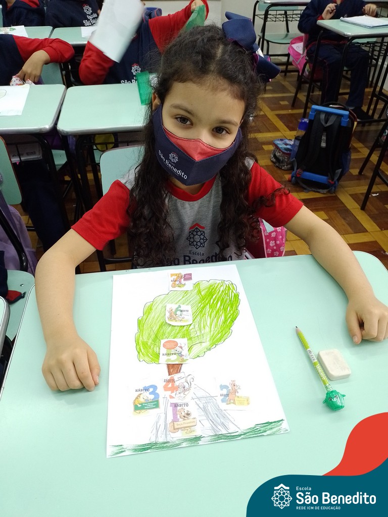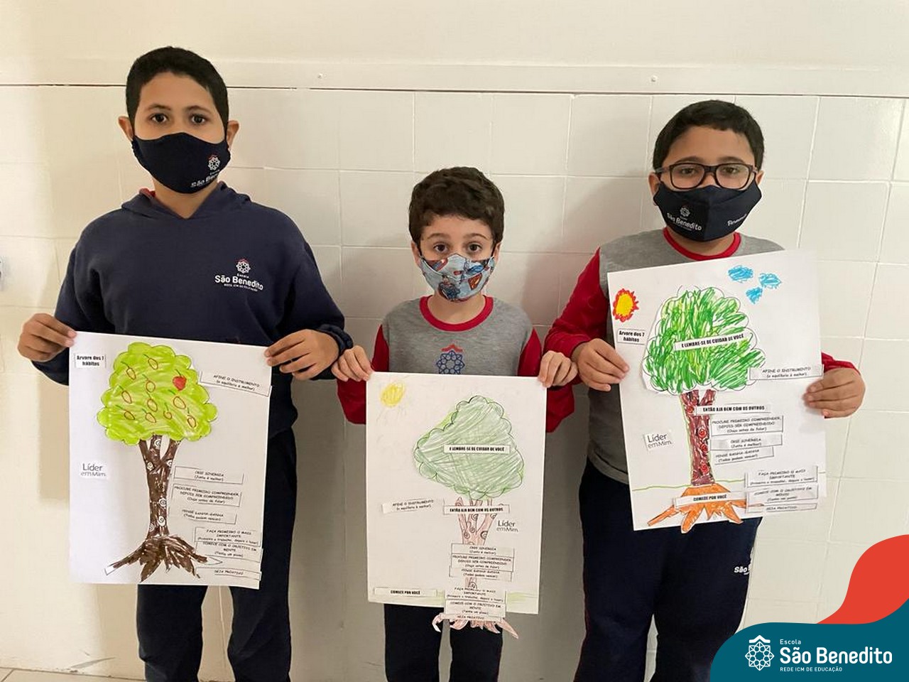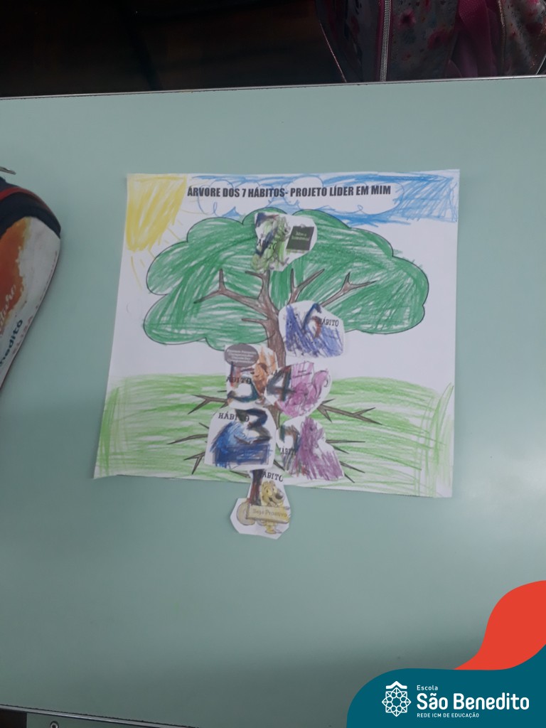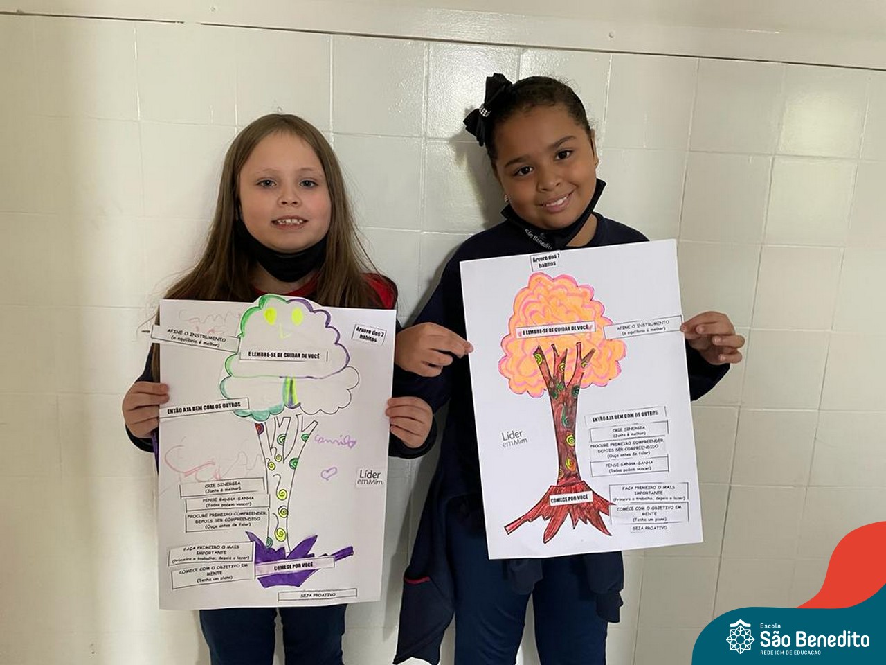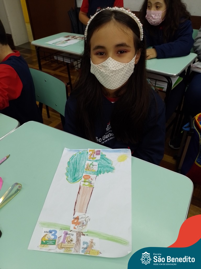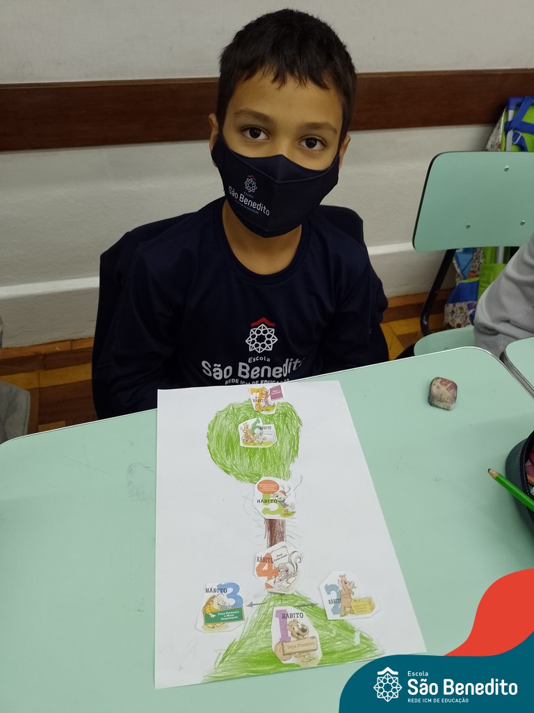 Os estudantes do 1º ao 5º Ano construíram a Árvore dos 7 hábitos da criança feliz, que oportuniza a construção de uma boa comunicação, criando uma linguagem comum e envolvendo os colegas, professores e família.