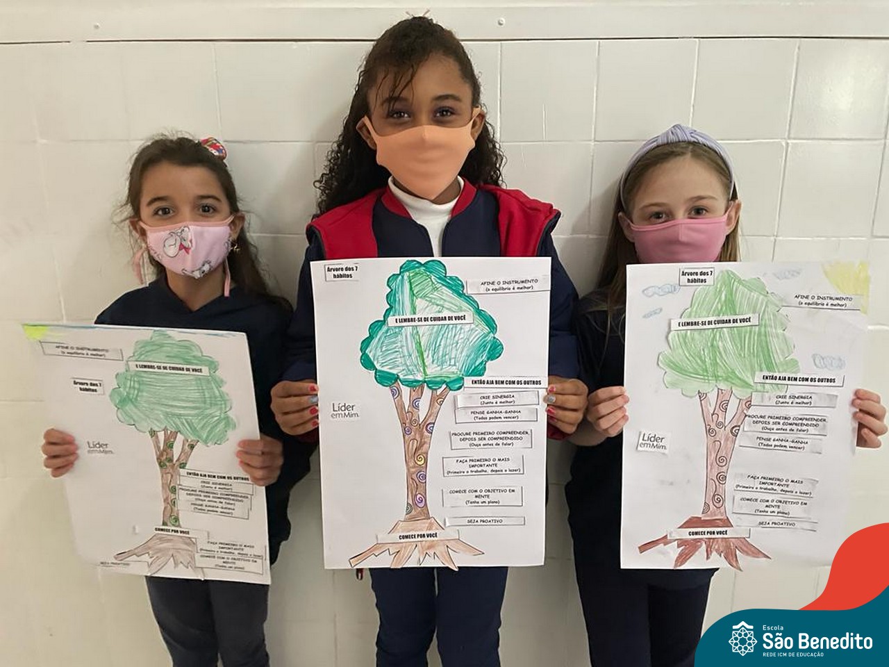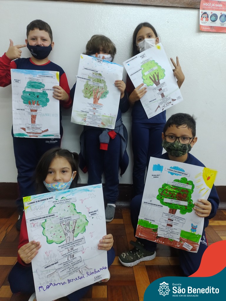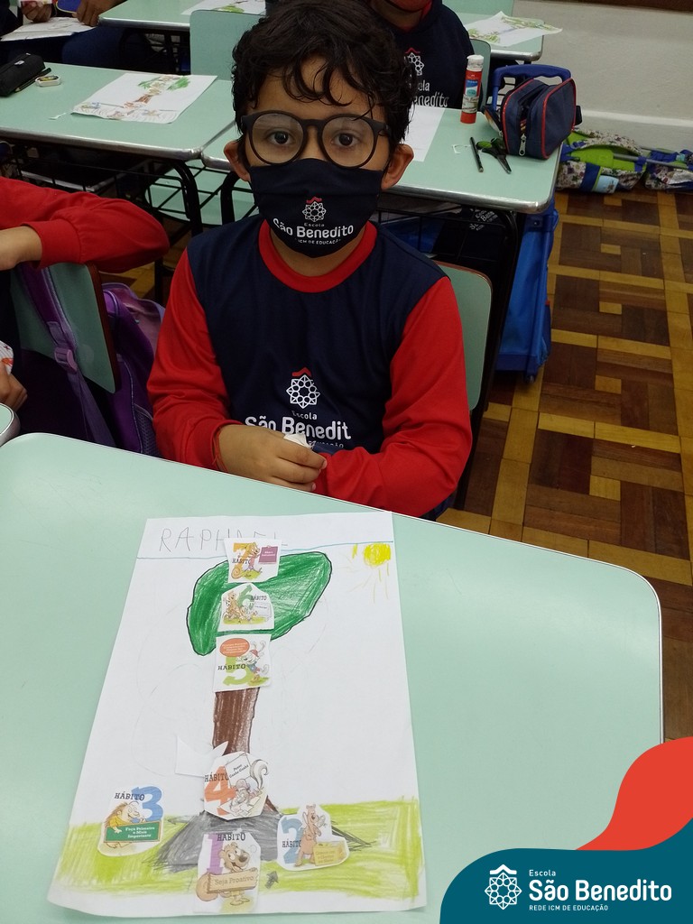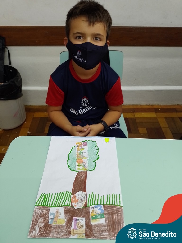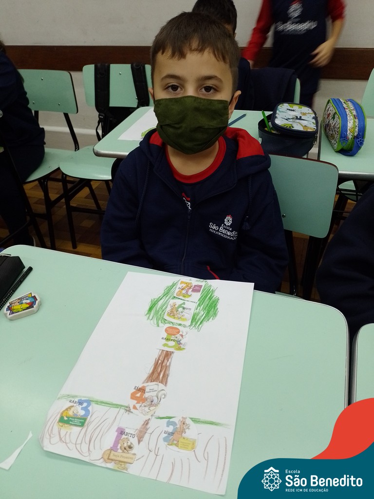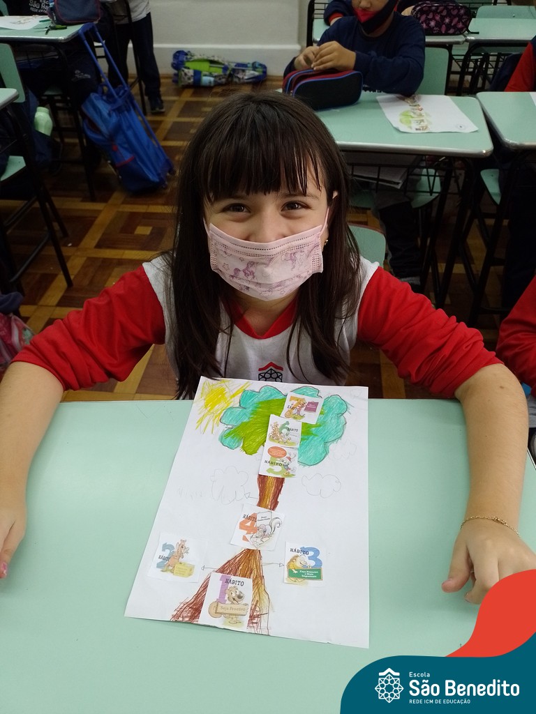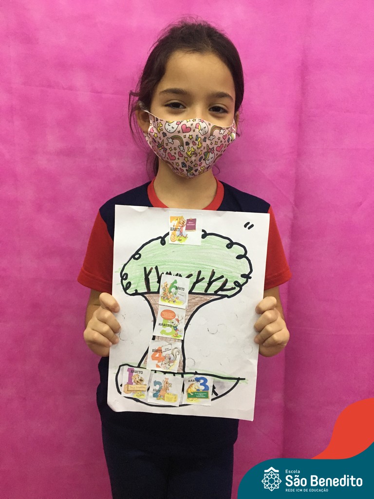 Os estudantes do 1º ao 5º Ano construíram a Árvore dos 7 hábitos da criança feliz, que oportuniza a construção de uma boa comunicação, criando uma linguagem comum e envolvendo os colegas, professores e família.