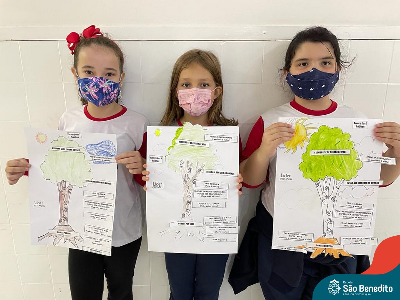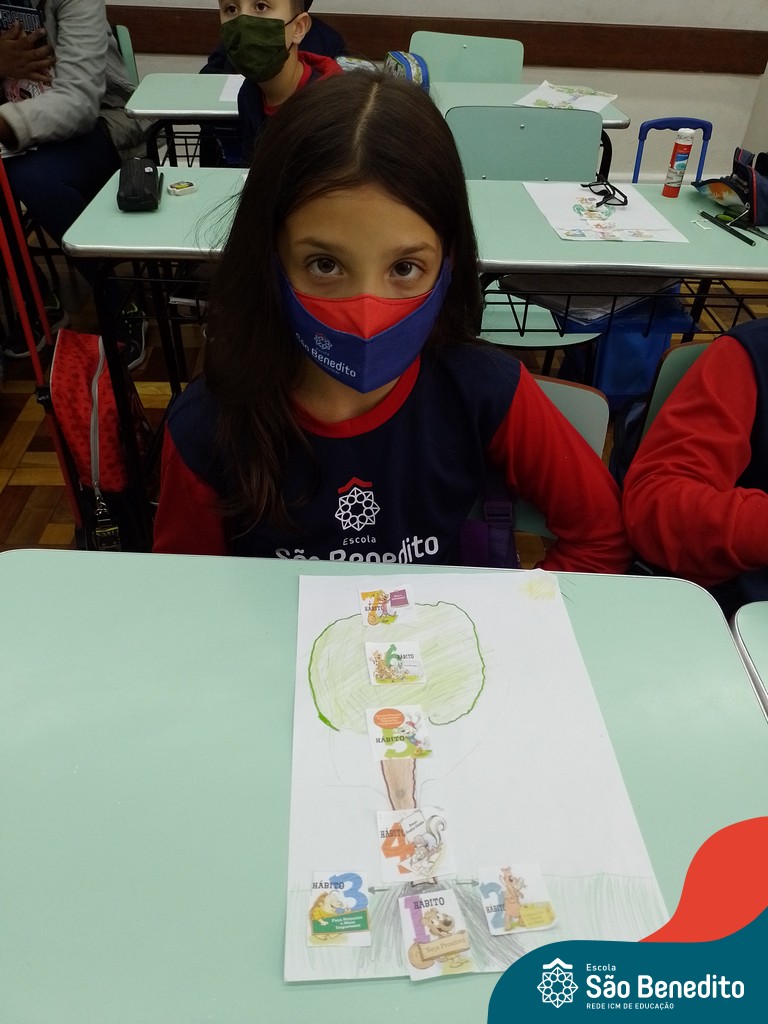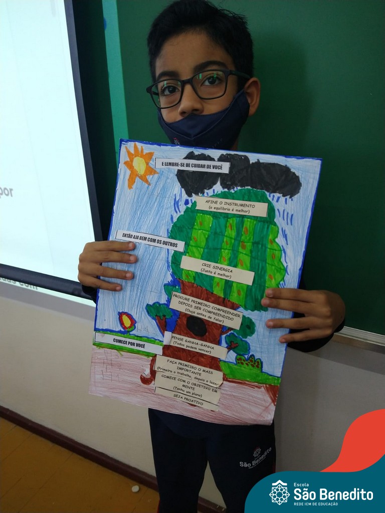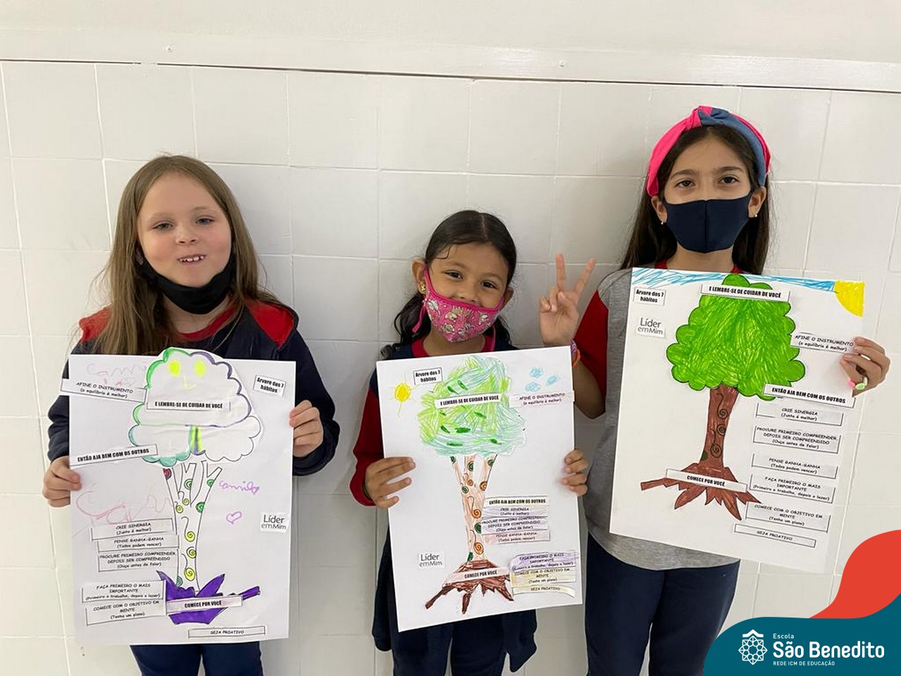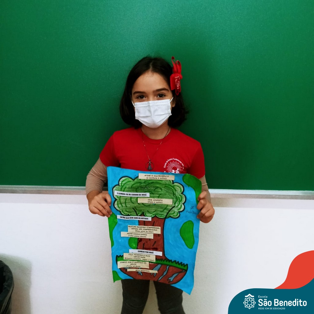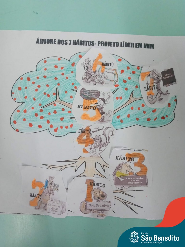 Os estudantes do 1º ao 5º Ano construíram a Árvore dos 7 hábitos da criança feliz, que oportuniza a construção de uma boa comunicação, criando uma linguagem comum e envolvendo os colegas, professores e família.