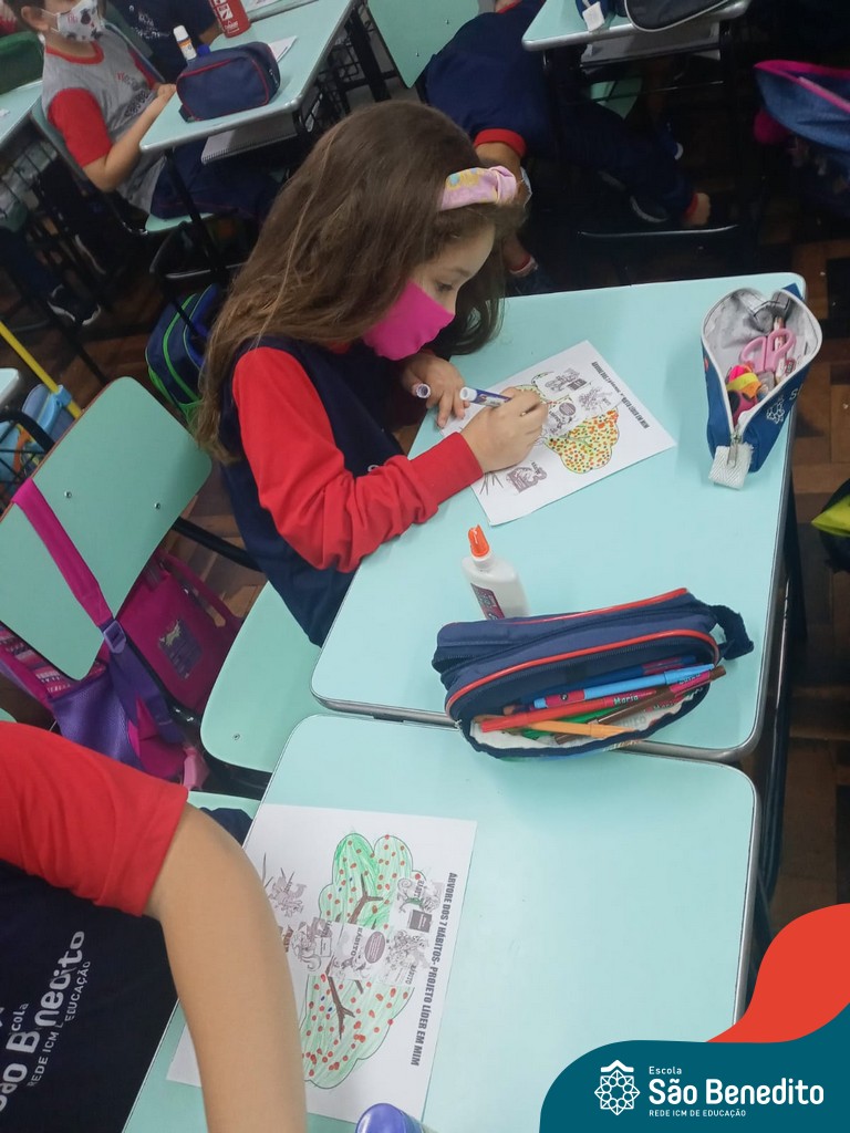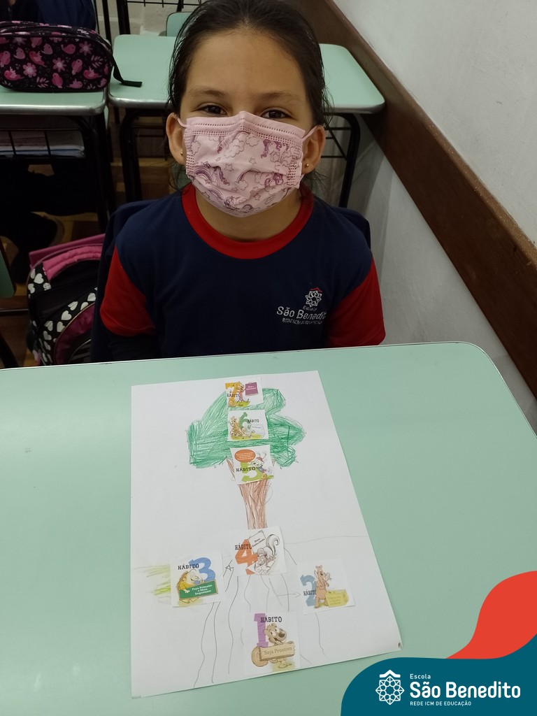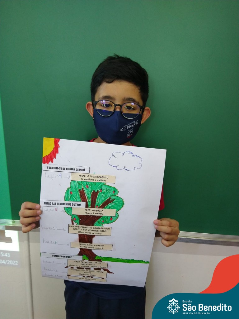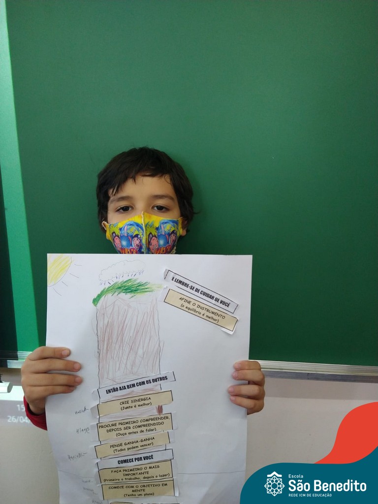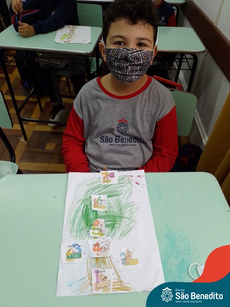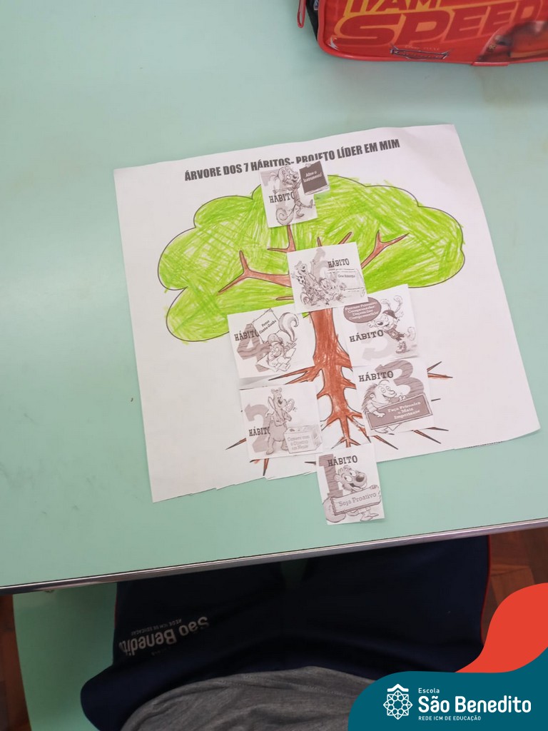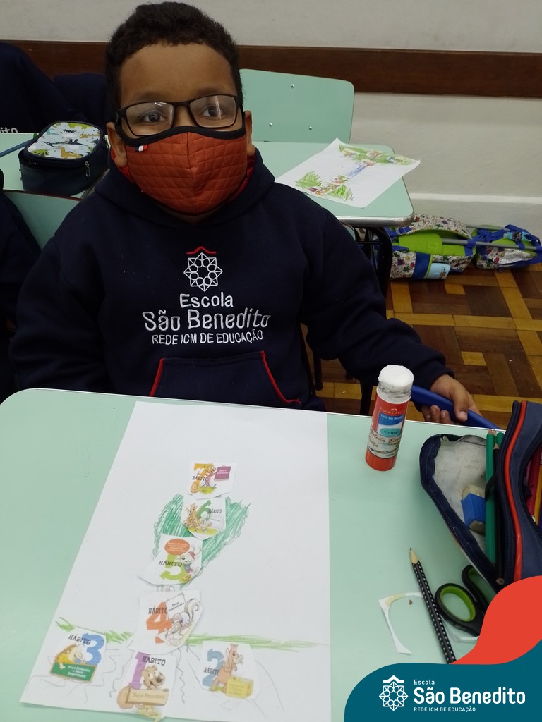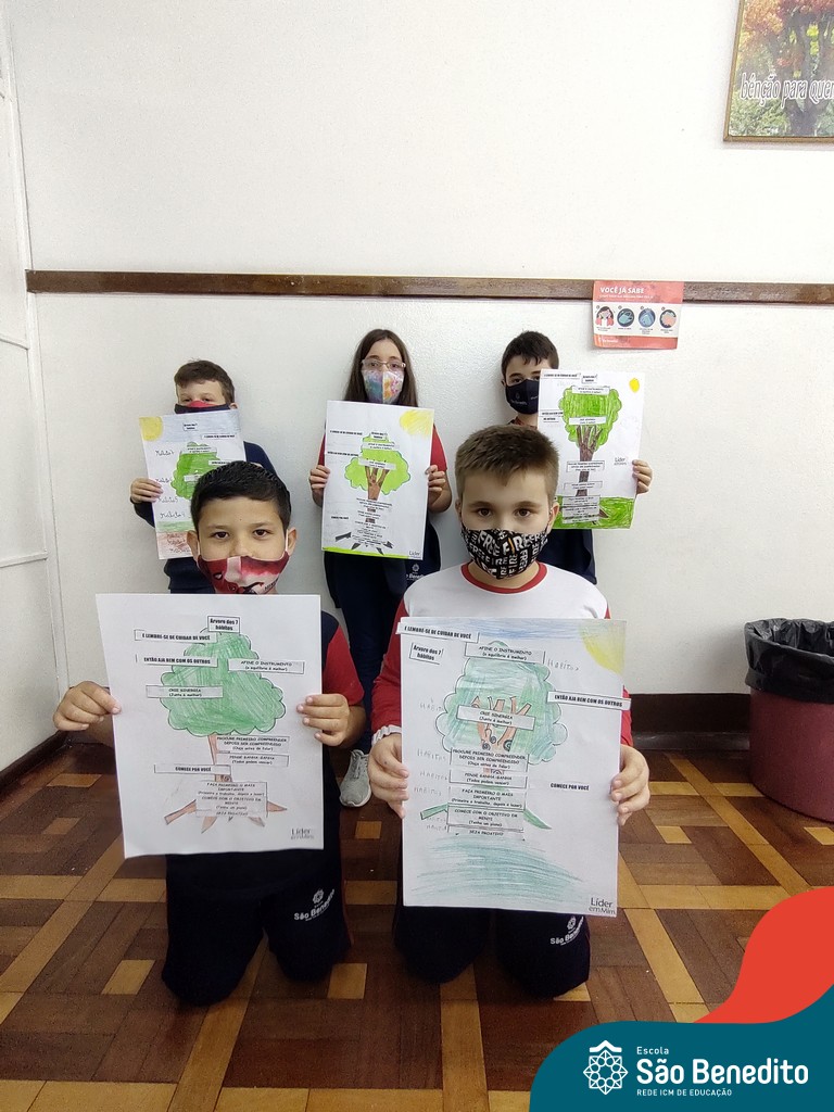Os estudantes do 1º ao 5º Ano construíram a Árvore dos 7 hábitos da criança feliz, que oportuniza a construção de uma boa comunicação, criando uma linguagem comum e envolvendo os colegas, professores e família.