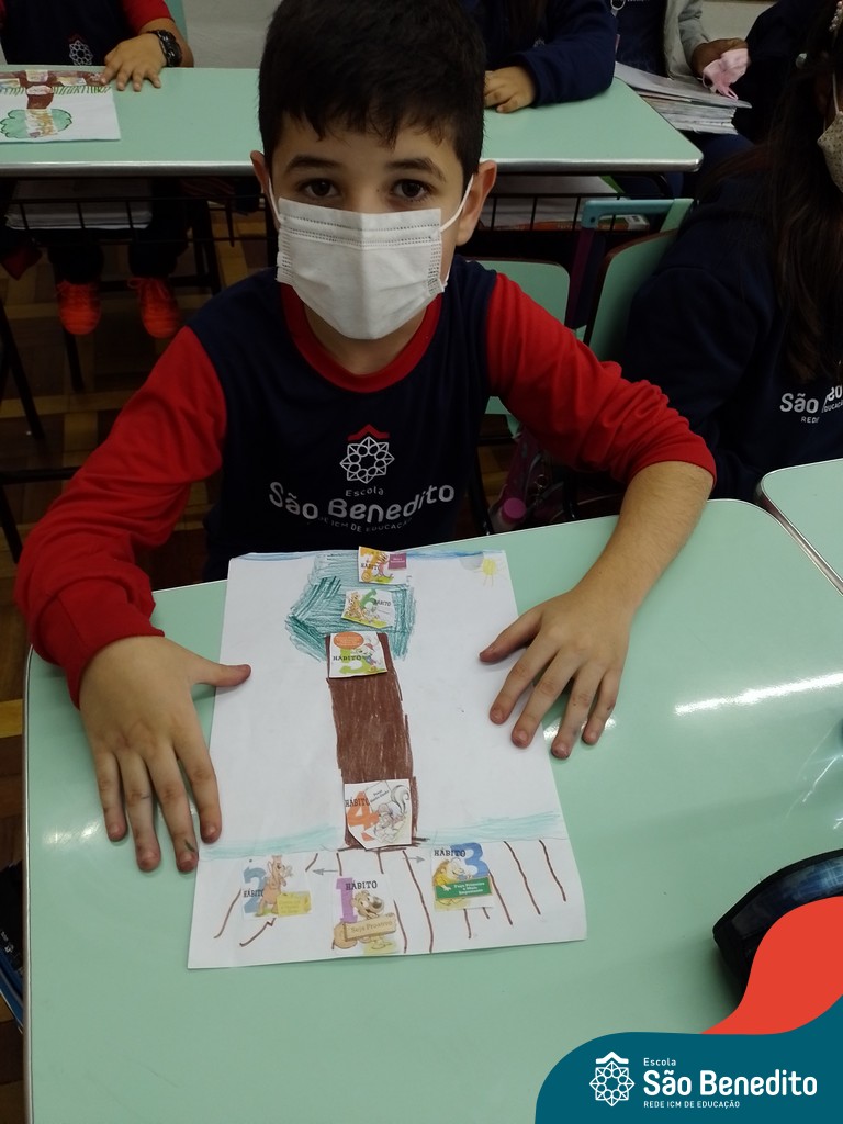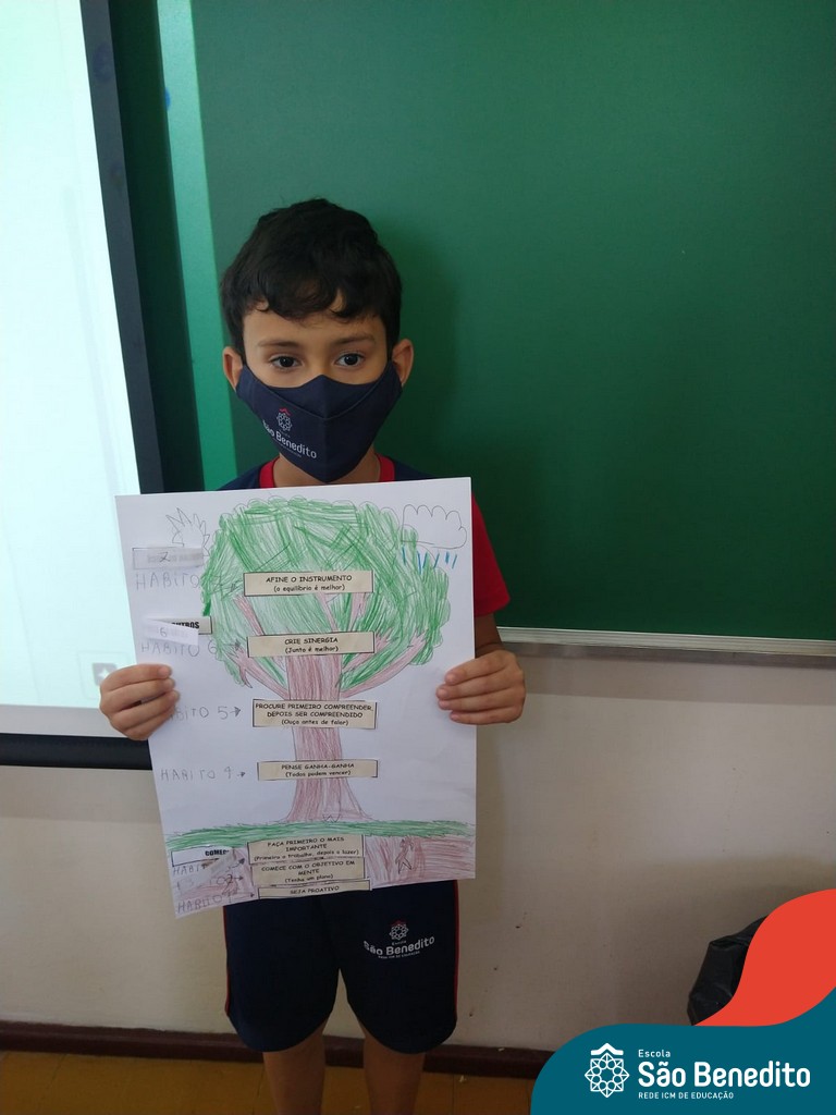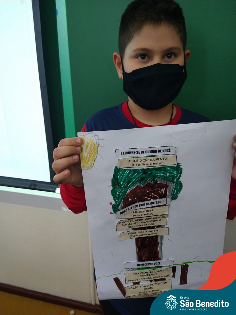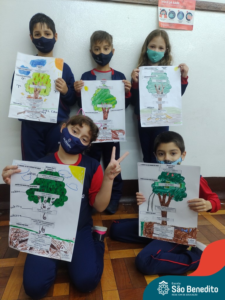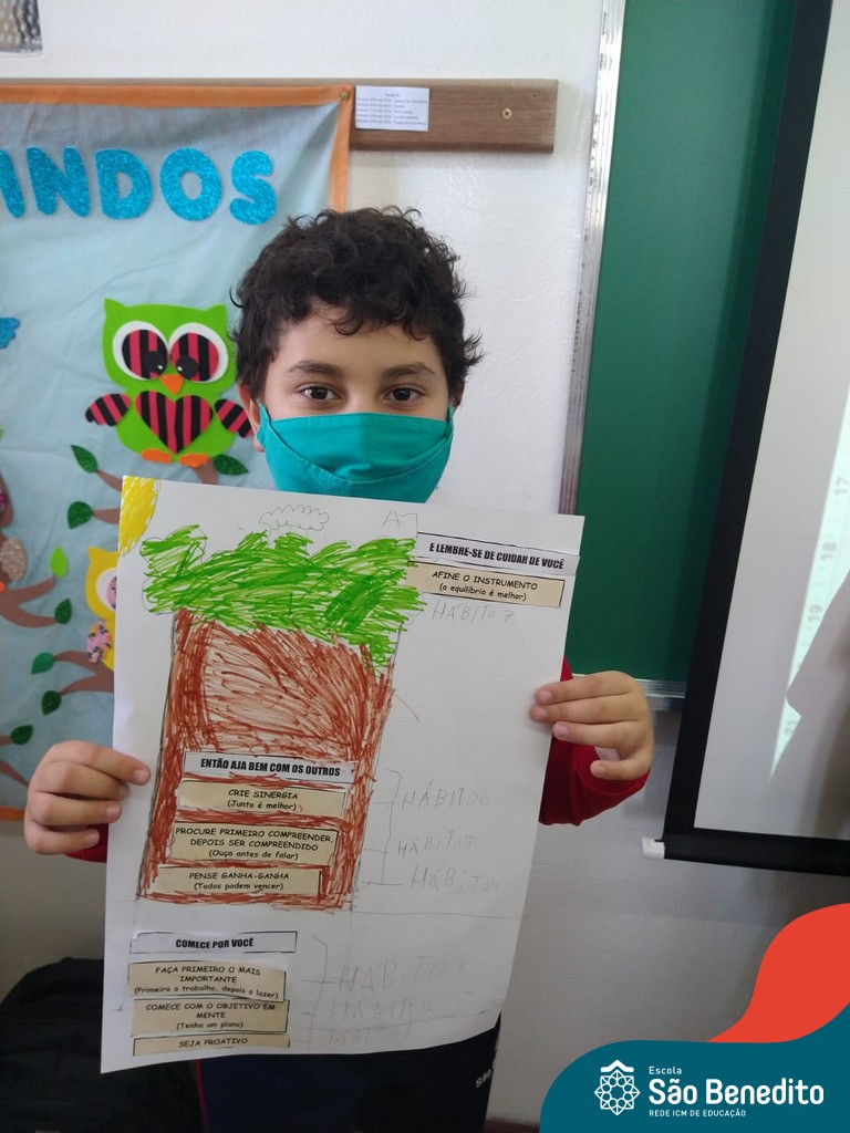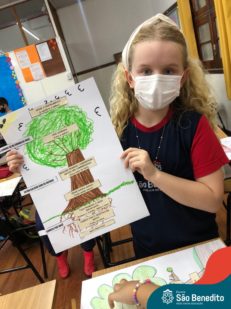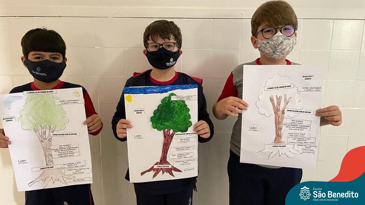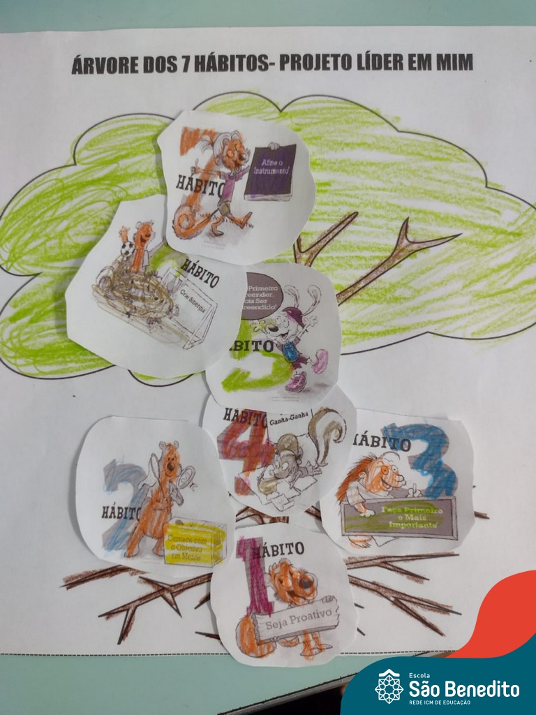 Os estudantes do 1º ao 5º Ano construíram a Árvore dos 7 hábitos da criança feliz, que oportuniza a construção de uma boa comunicação, criando uma linguagem comum e envolvendo os colegas, professores e família.