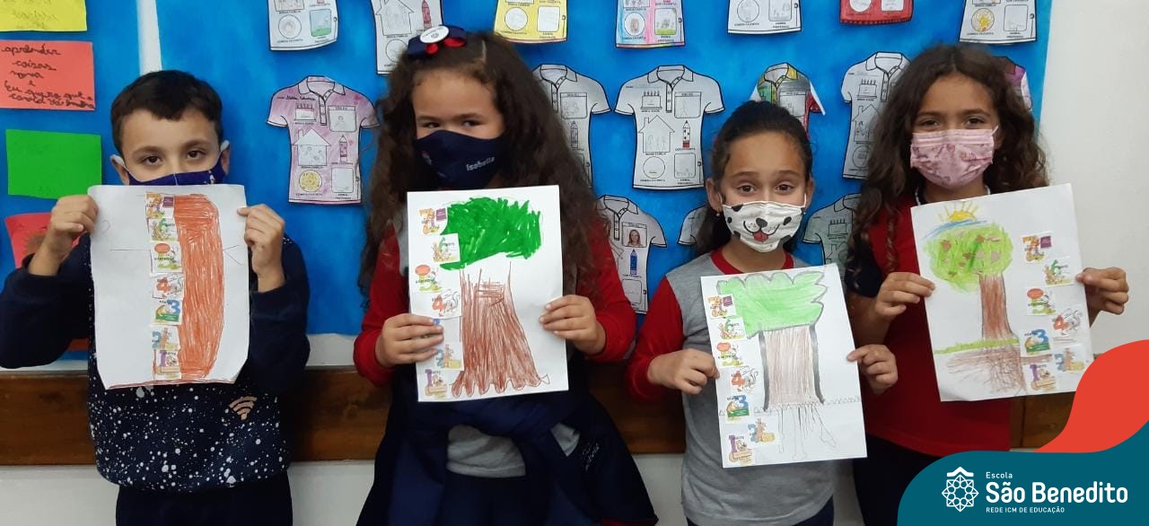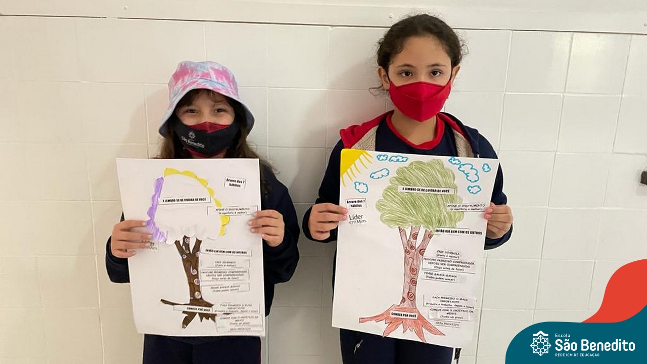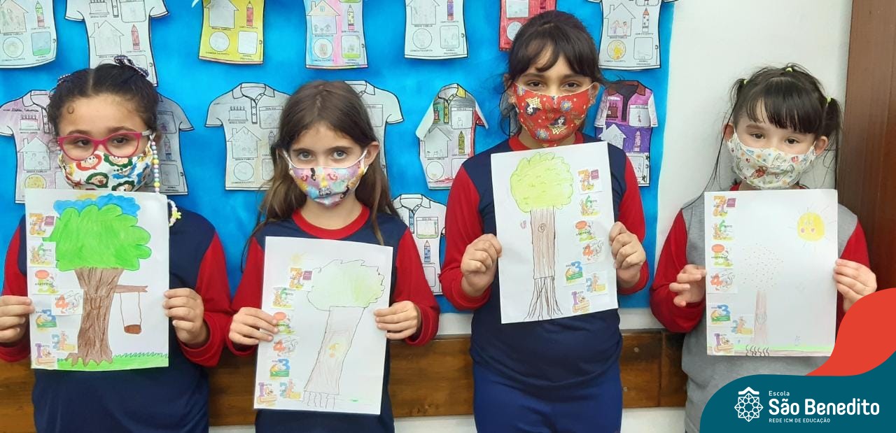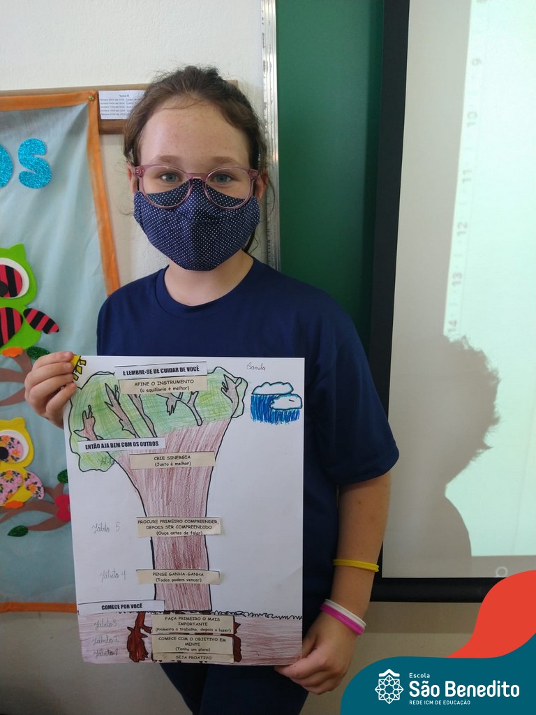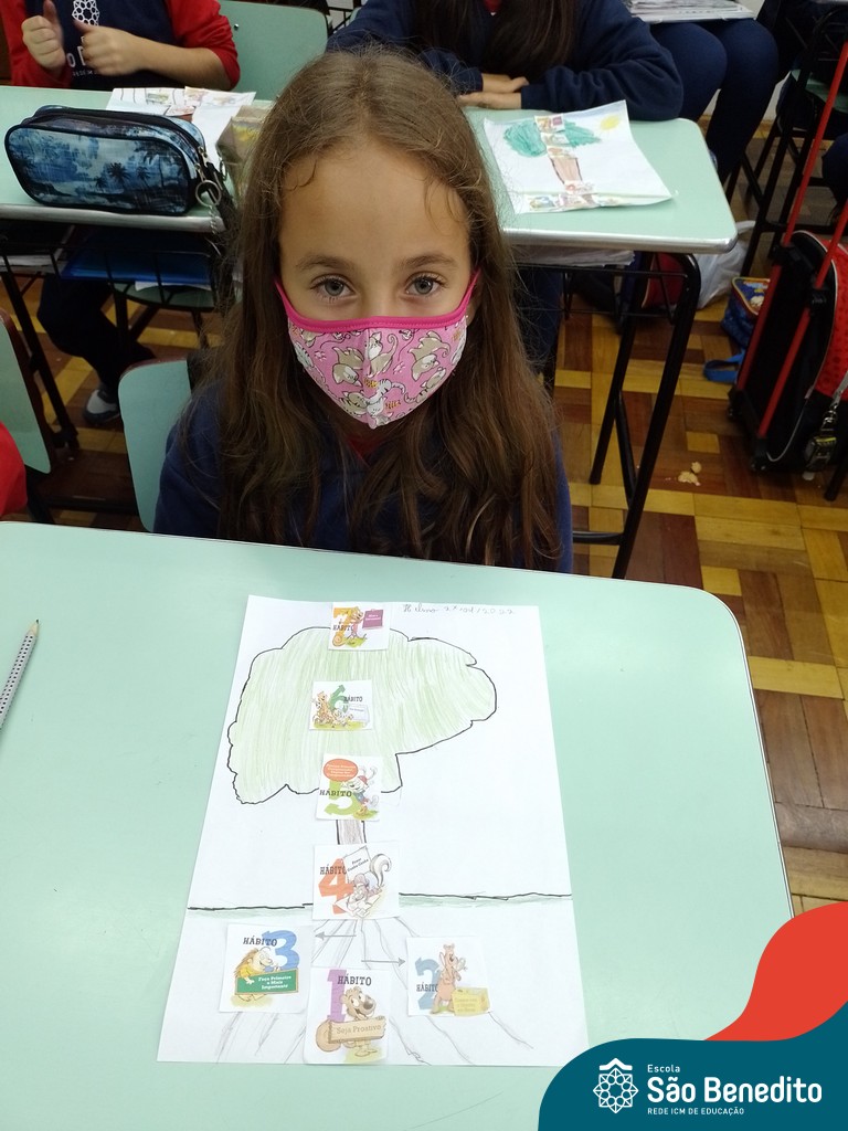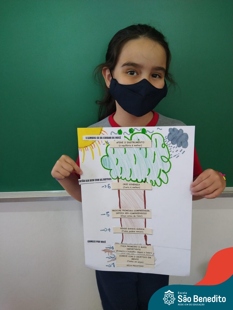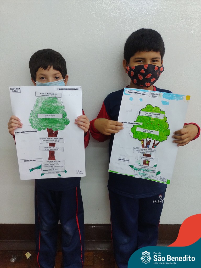 Os estudantes do 1º ao 5º Ano construíram a Árvore dos 7 hábitos da criança feliz, que oportuniza a construção de uma boa comunicação, criando uma linguagem comum e envolvendo os colegas, professores e família.