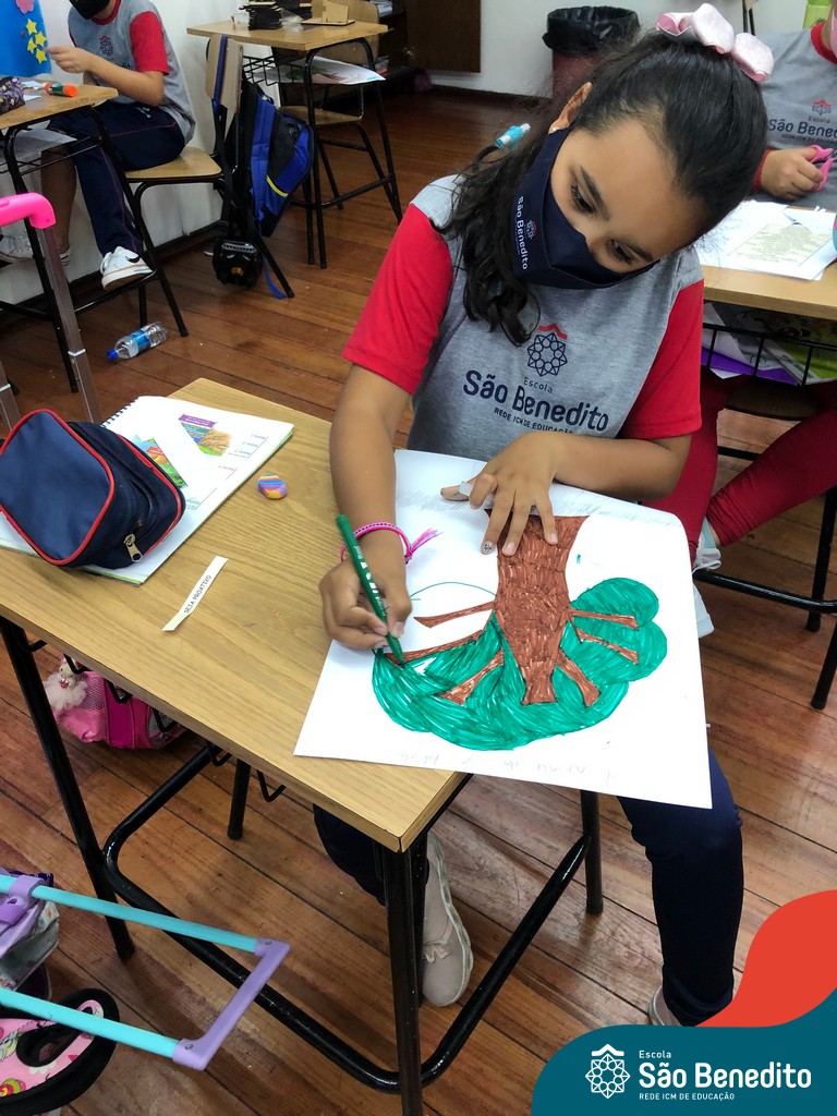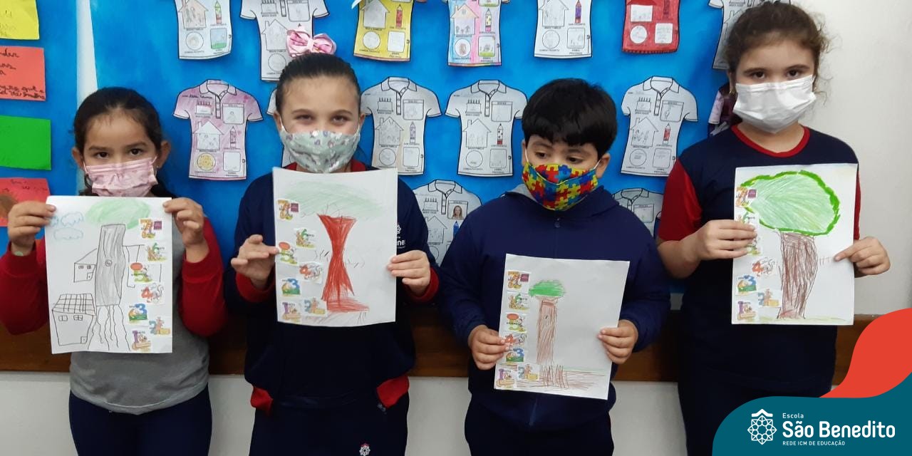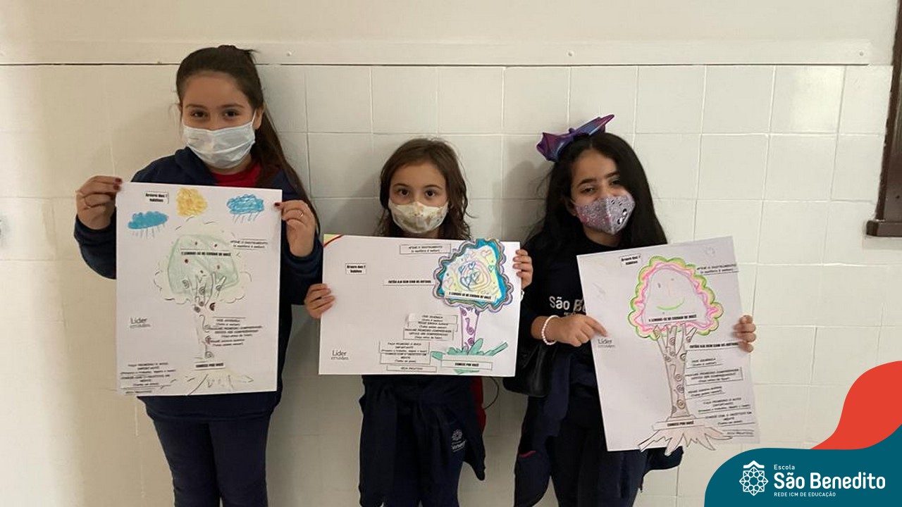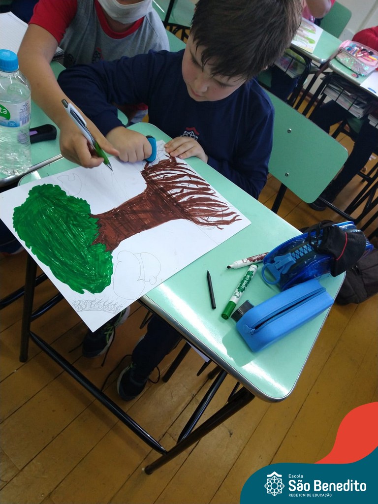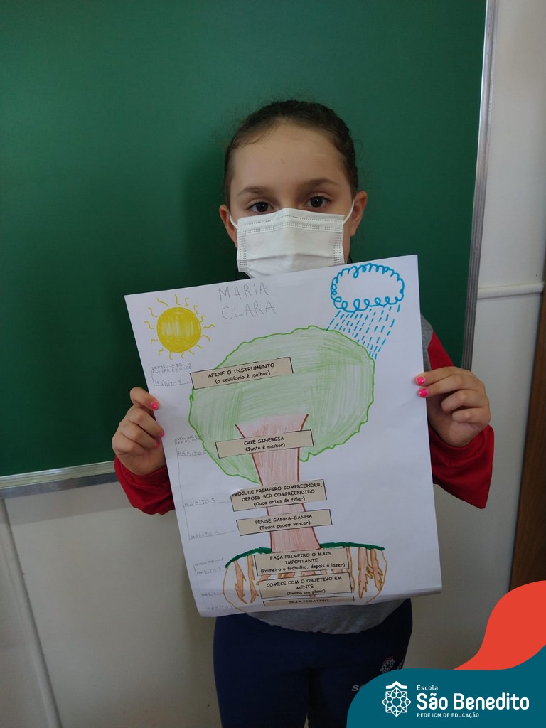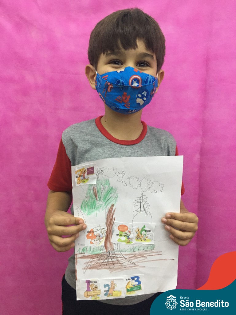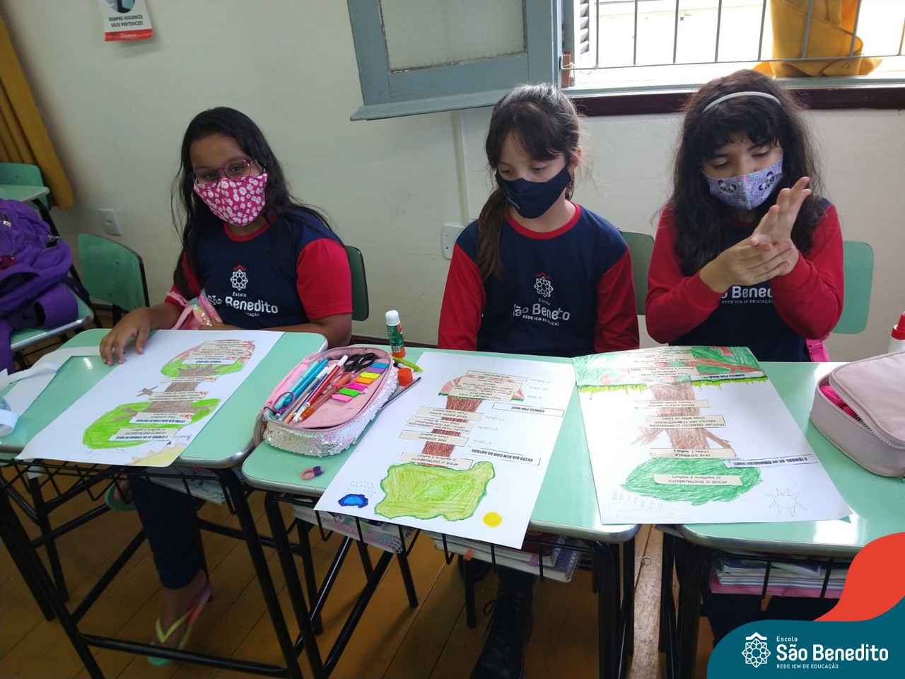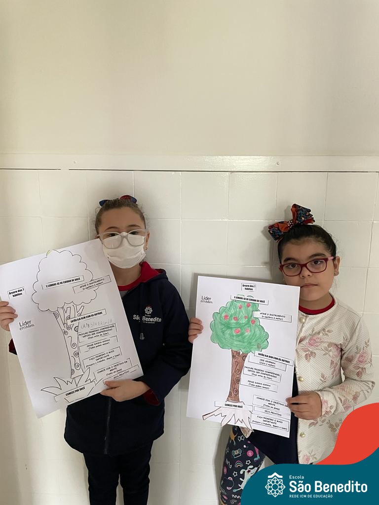 Os estudantes do 1º ao 5º Ano construíram a Árvore dos 7 hábitos da criança feliz, que oportuniza a construção de uma boa comunicação, criando uma linguagem comum e envolvendo os colegas, professores e família.